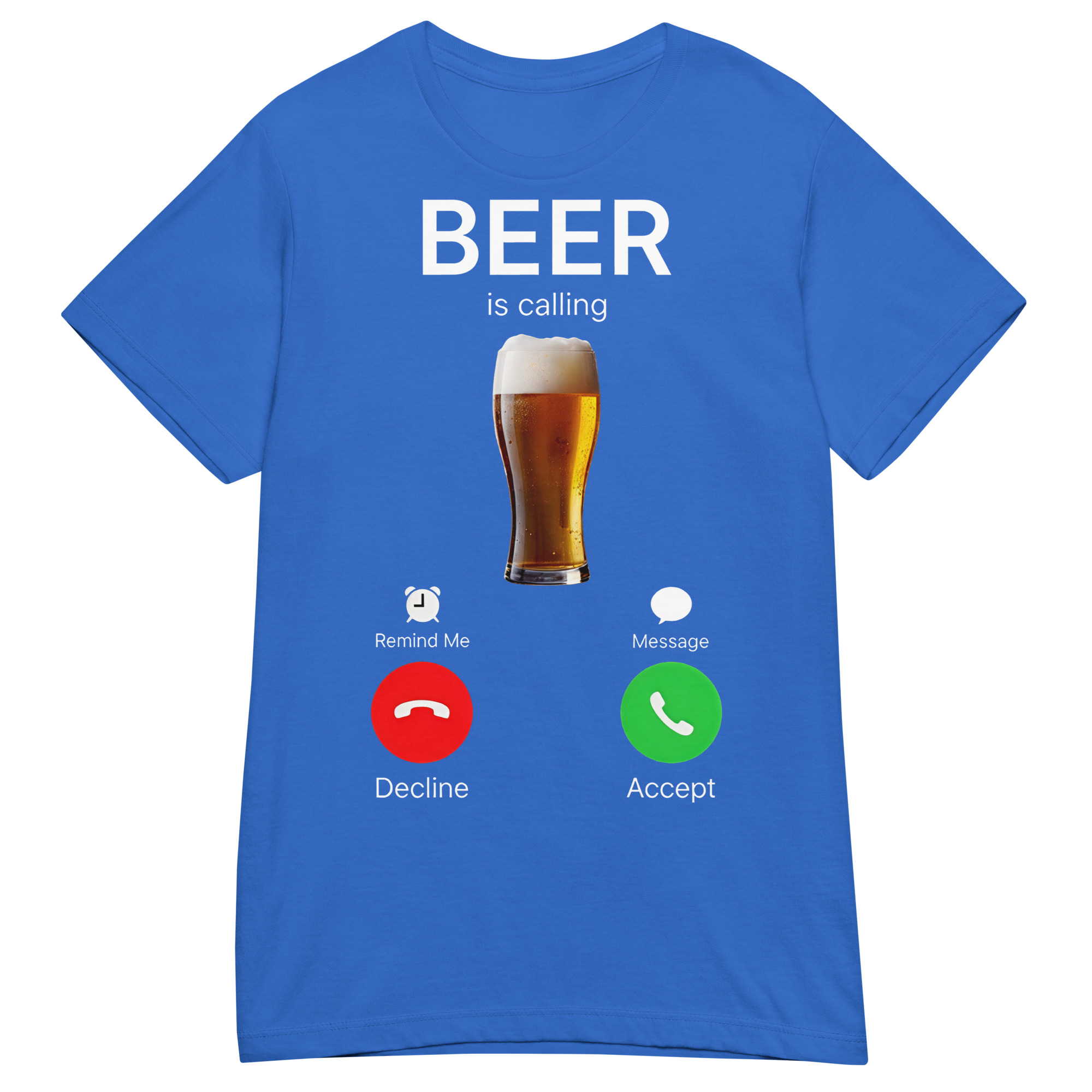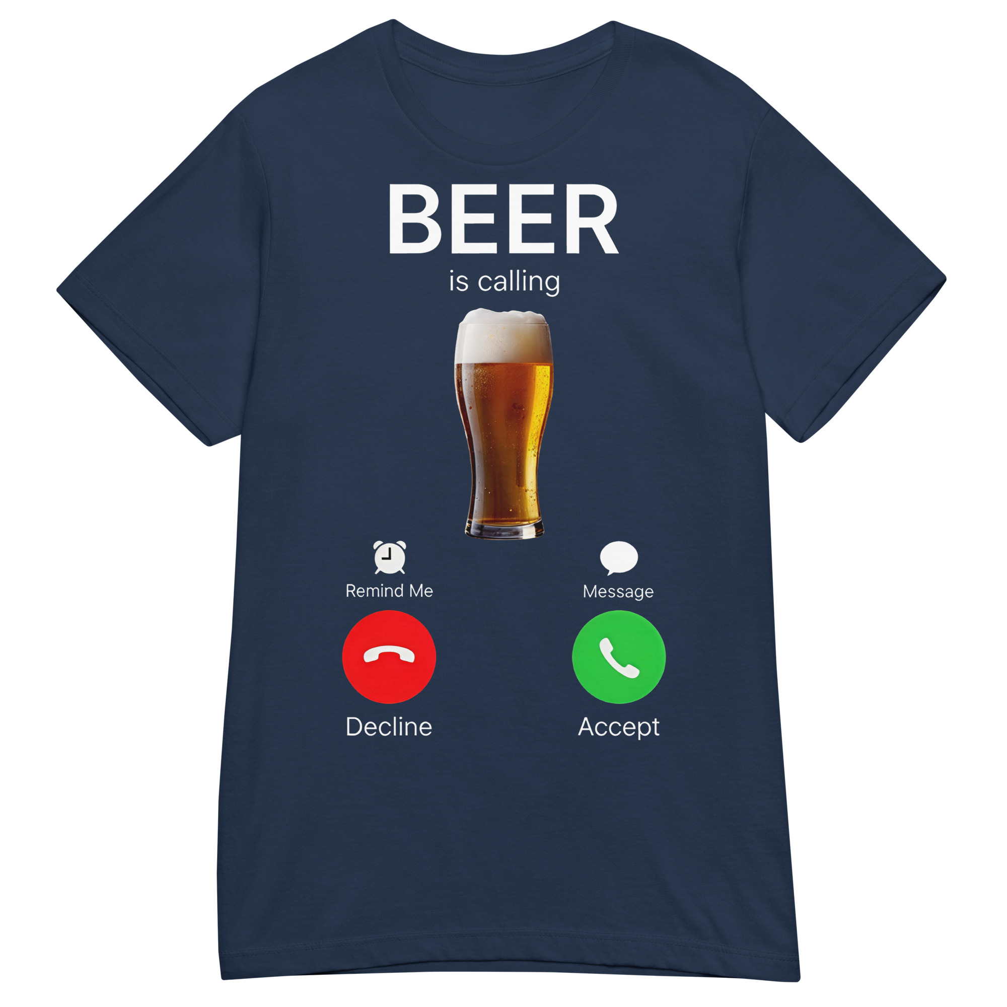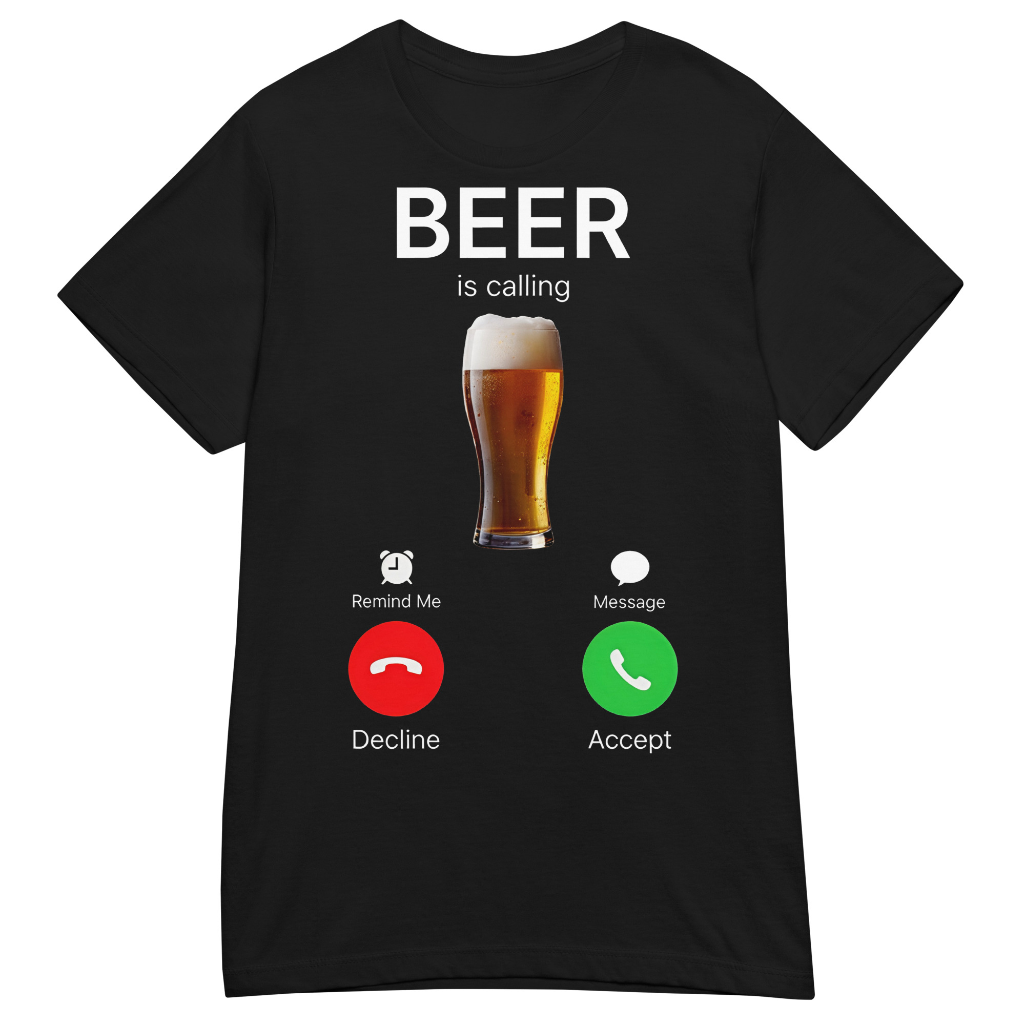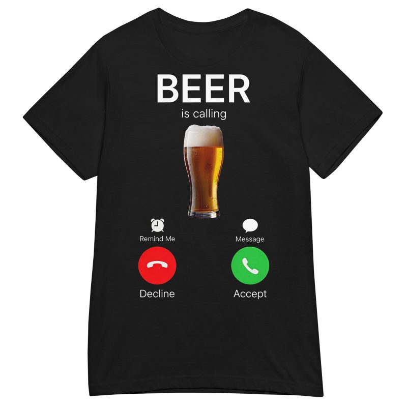 Semi-fitted t-shirt dekorerad med en stor öl och texten ’Beer is calling’ som tryck på framsidan. Passar perfekt till kvinnor som älskar öl. Välj mellan tre olika färger.