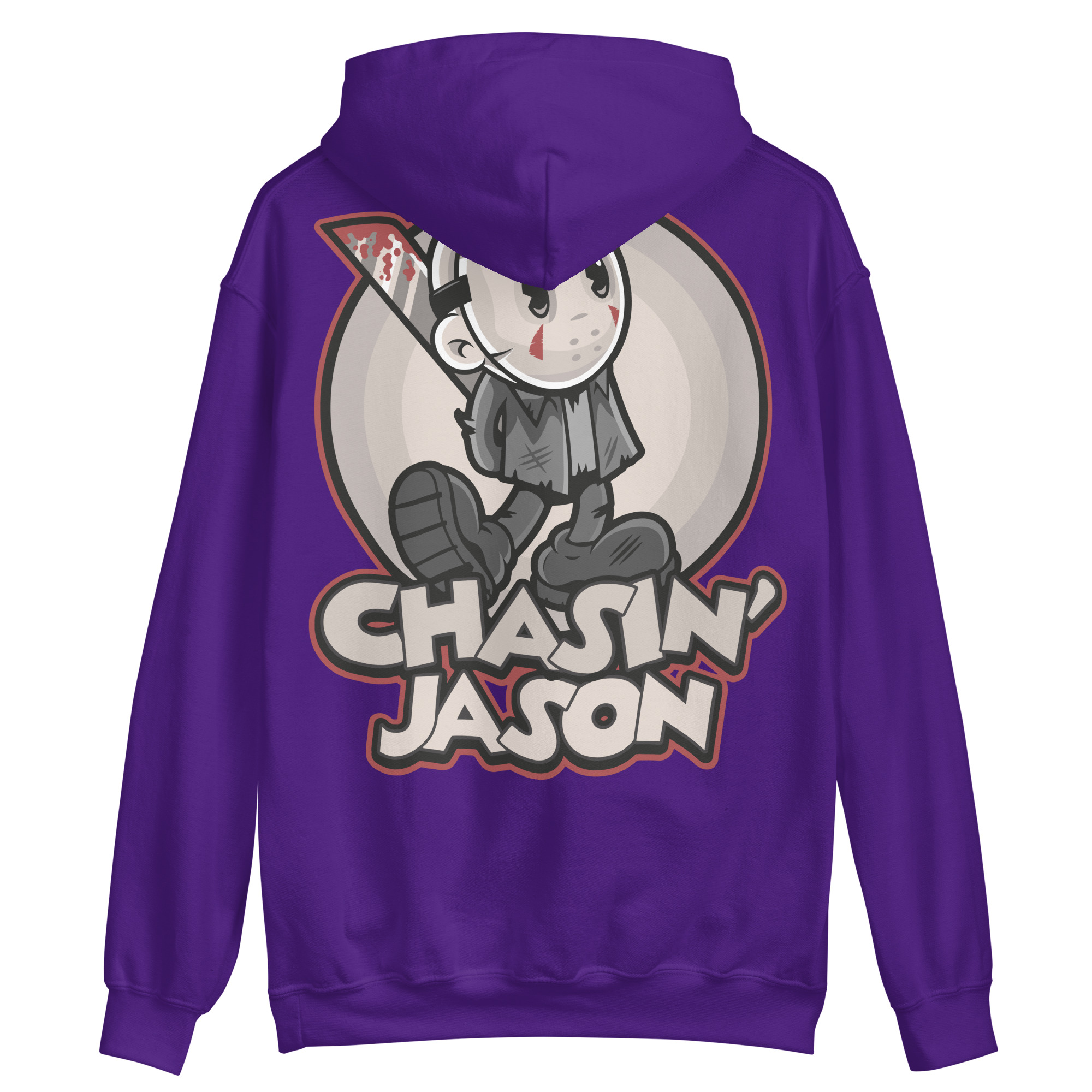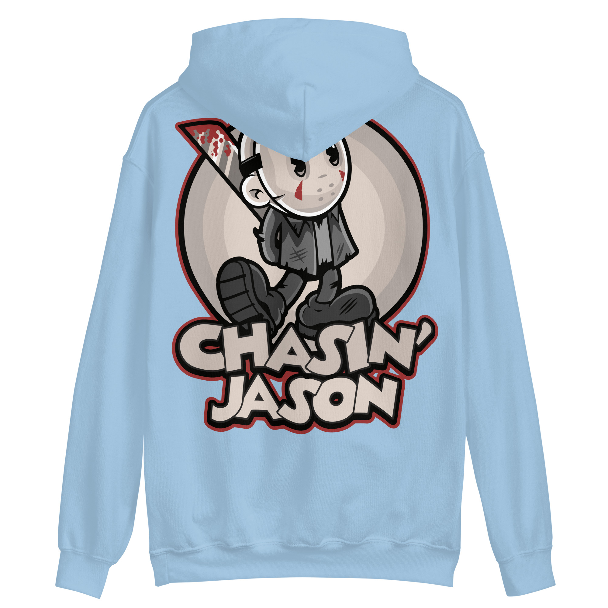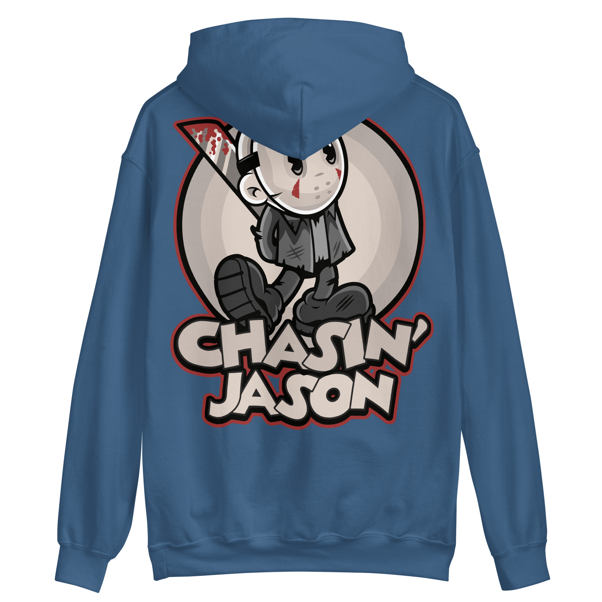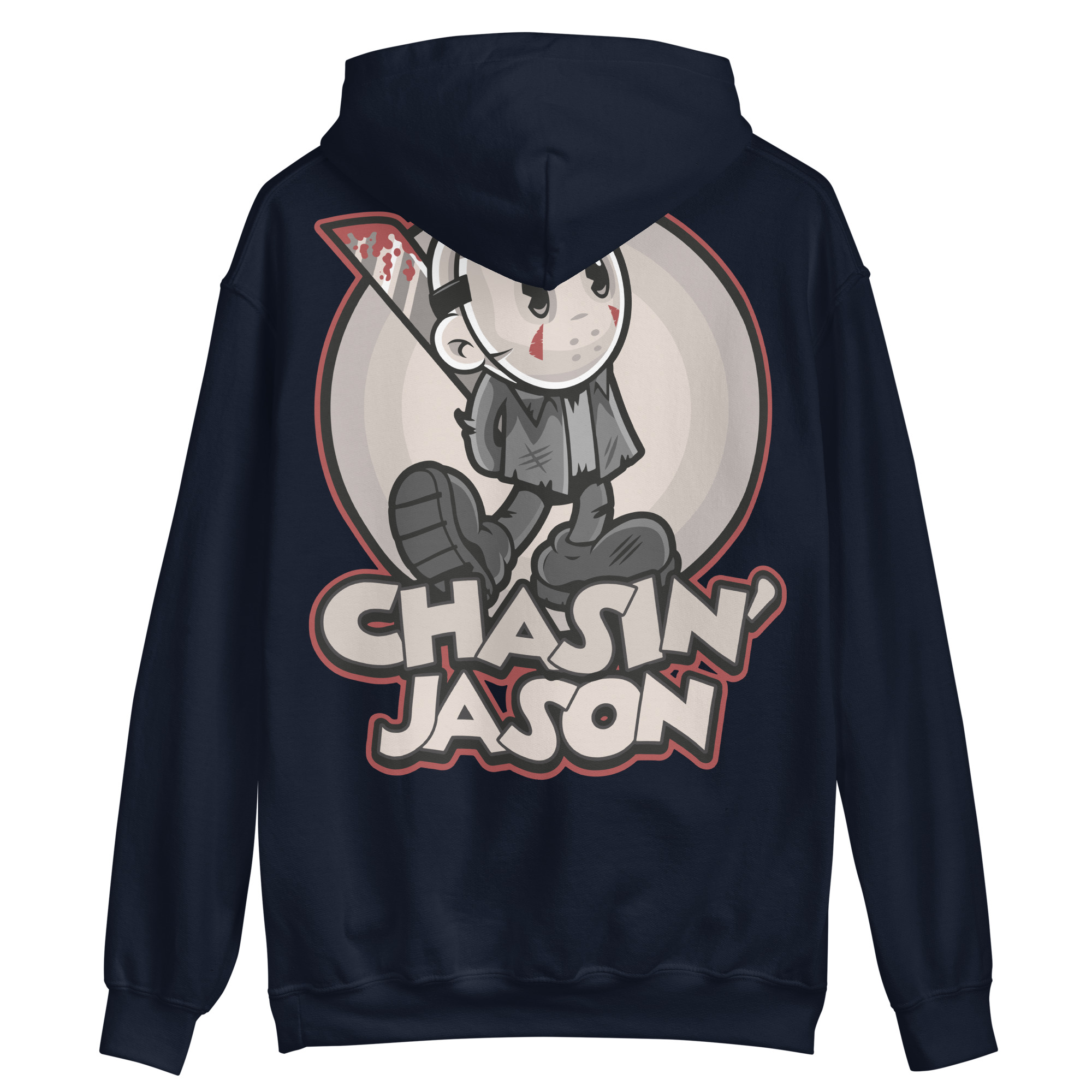 Snygg hoodie dekorerad med ett retroinspirerat tryck med Jason och texten ’Chasin’ Jason’ på framsidan. Hoodien passar både kvinnor och män som älskar skräckfilmer. Välj mellan 16 olika färger.