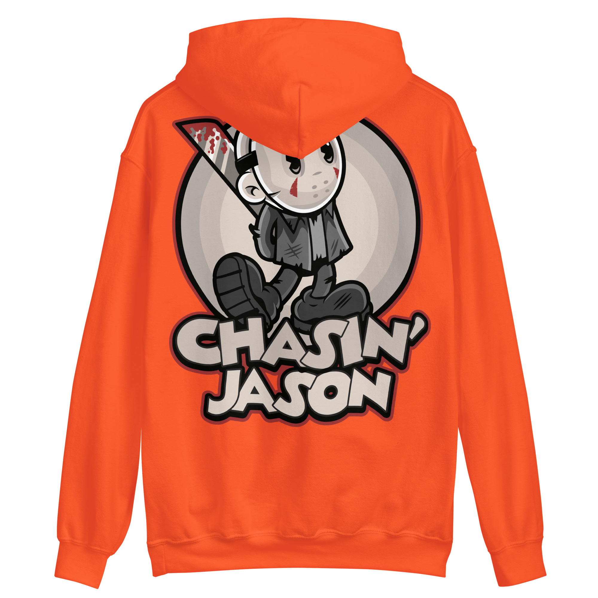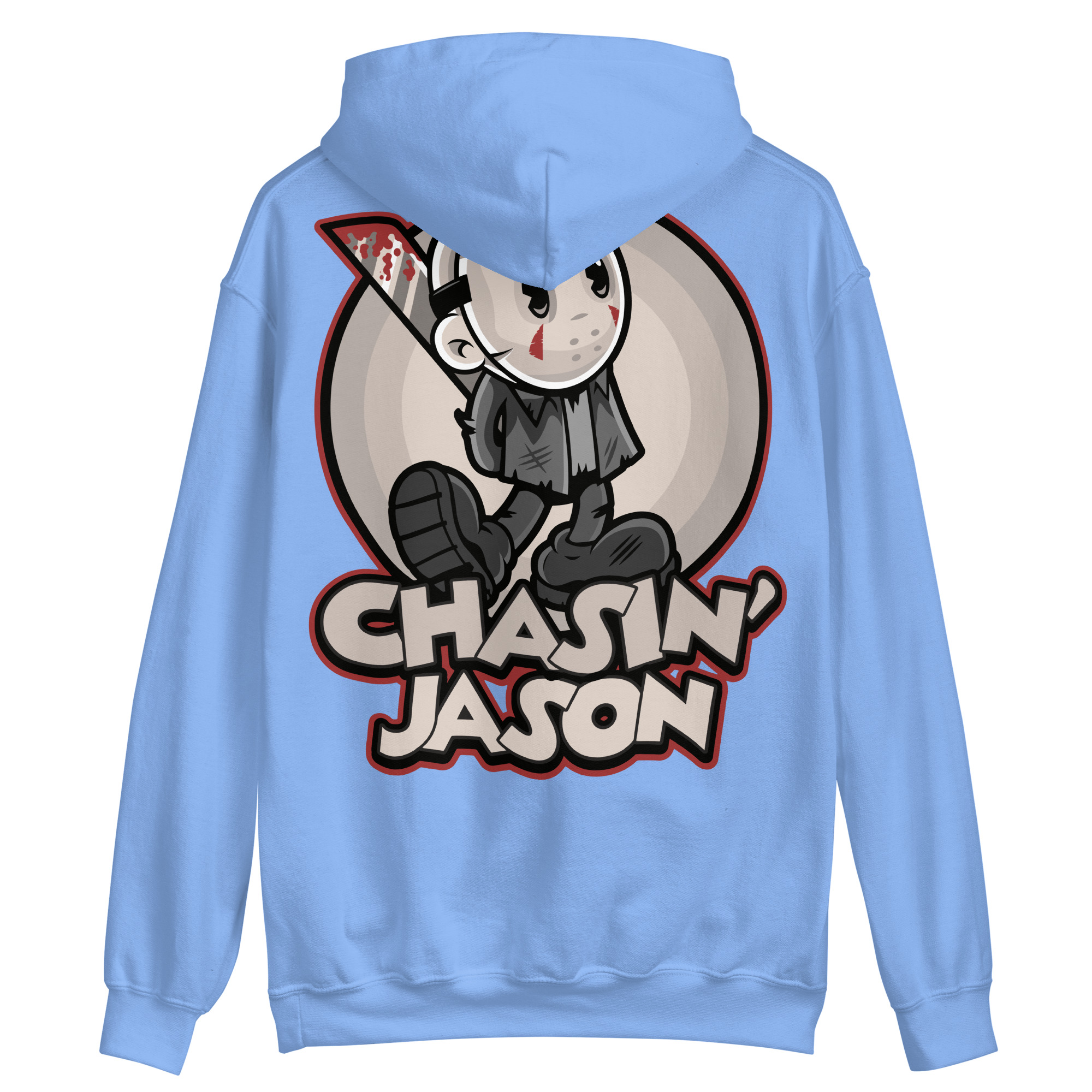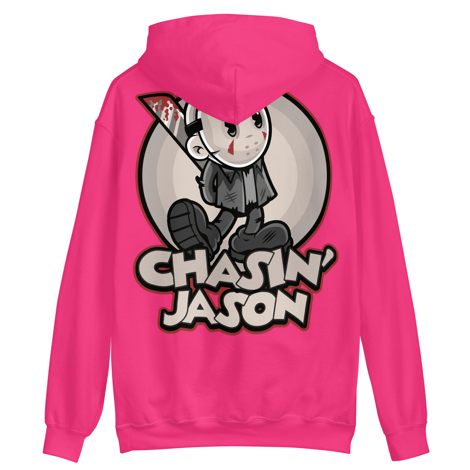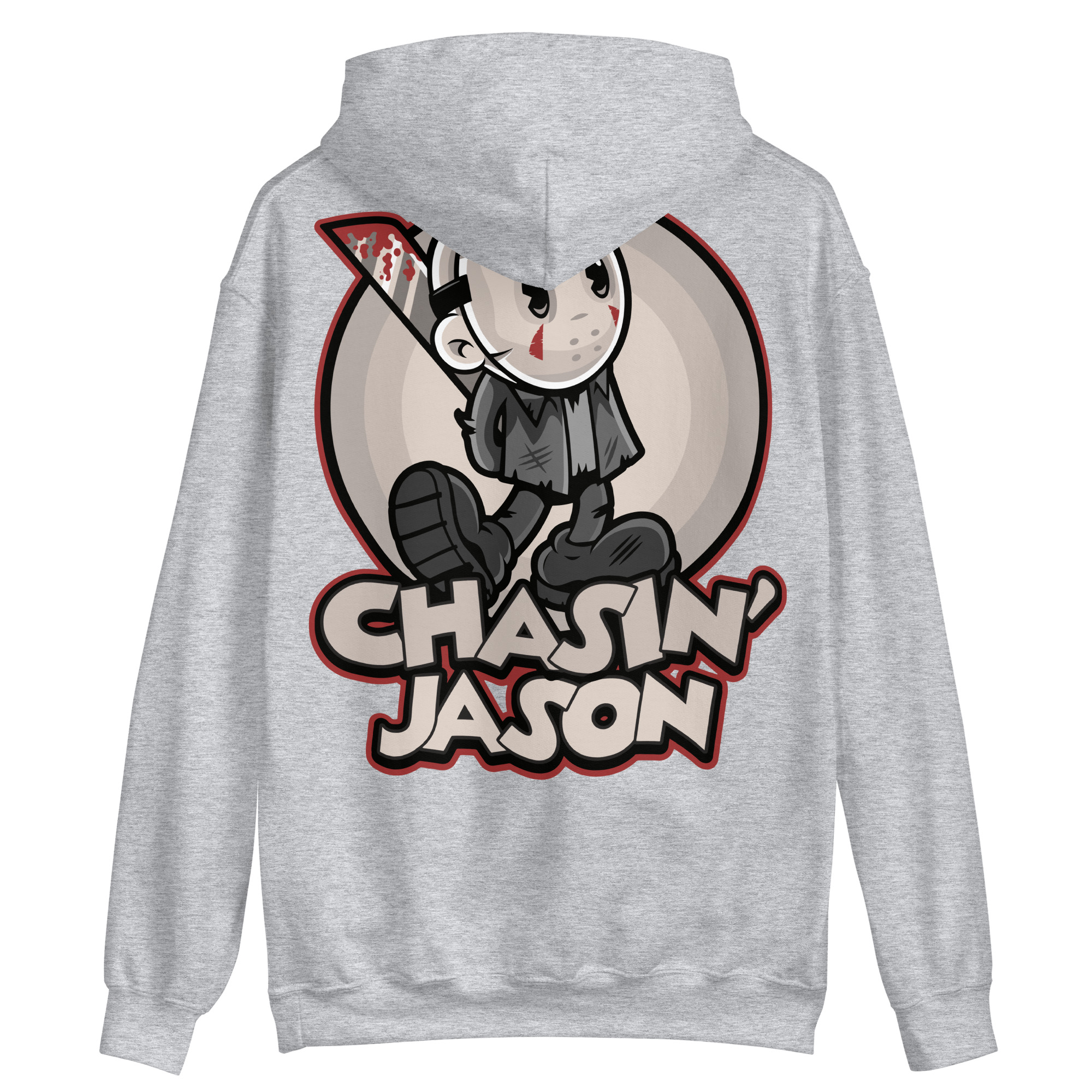 Snygg hoodie dekorerad med ett retroinspirerat tryck med Jason och texten ’Chasin’ Jason’ på framsidan. Hoodien passar både kvinnor och män som älskar skräckfilmer. Välj mellan 16 olika färger.