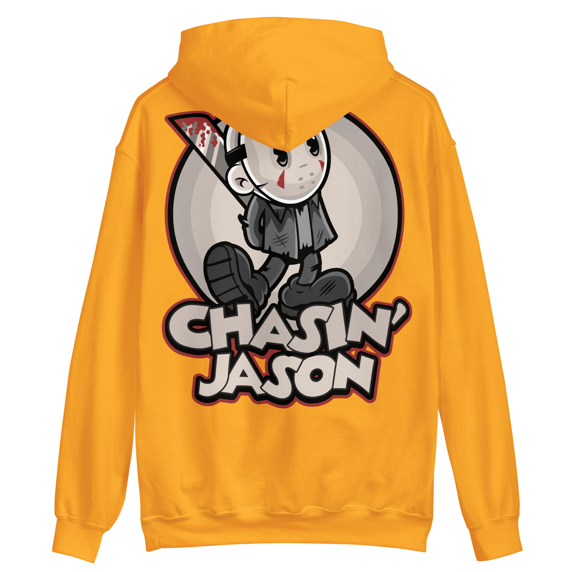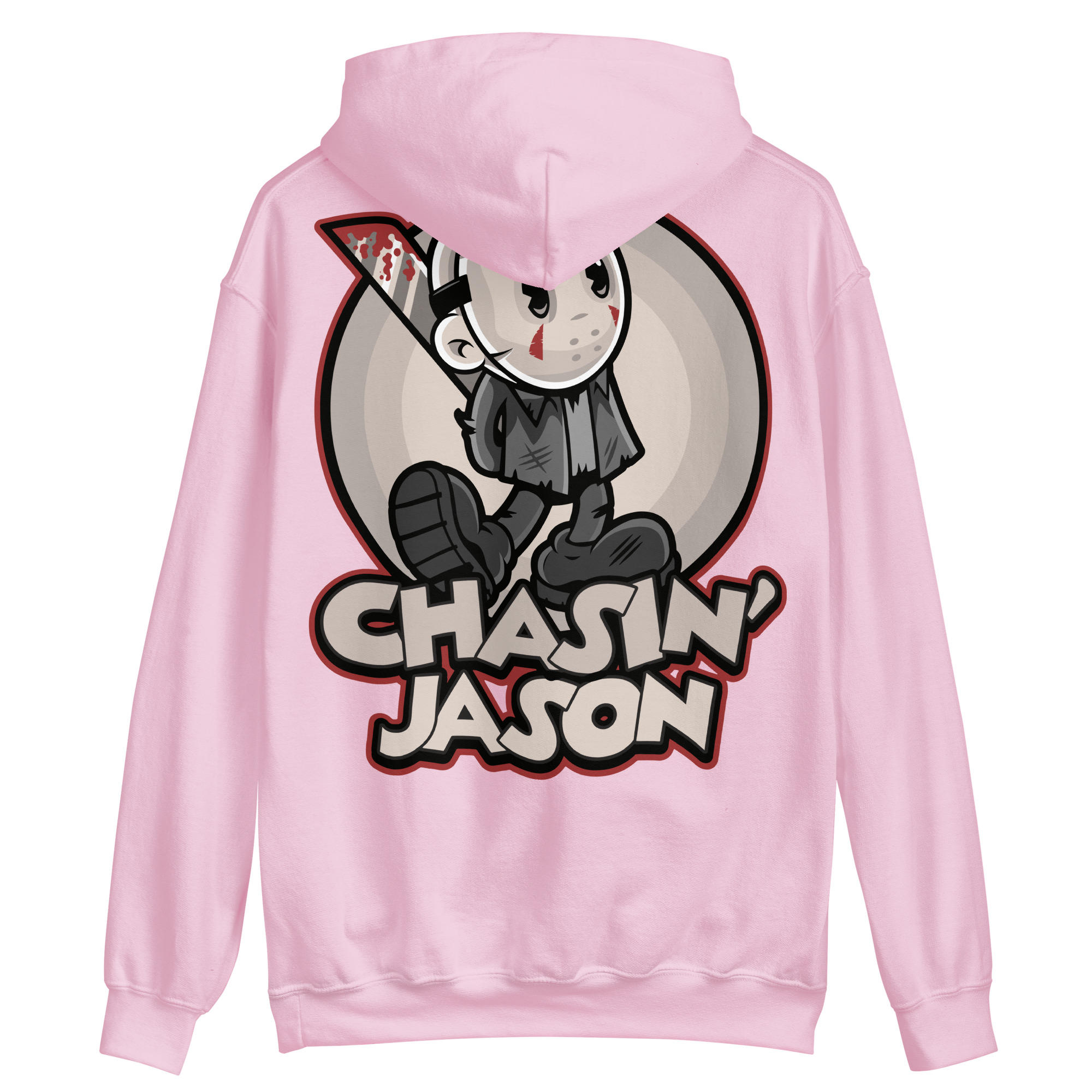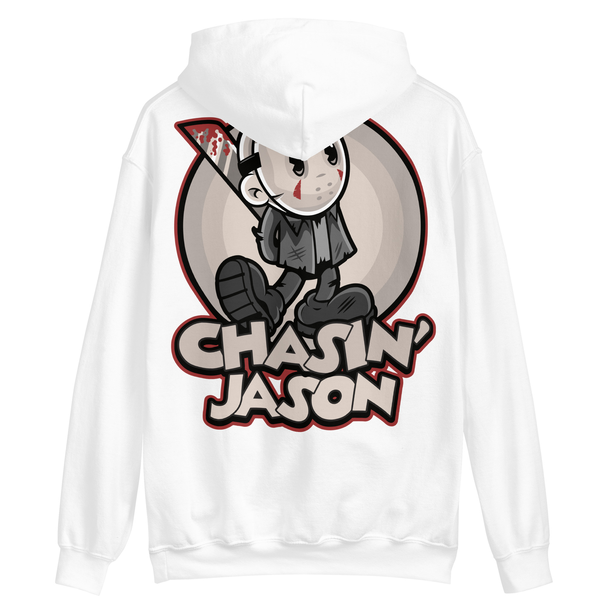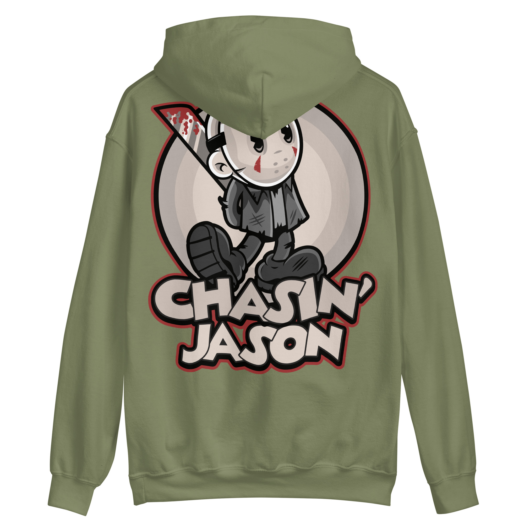 Snygg hoodie dekorerad med ett retroinspirerat tryck med Jason och texten ’Chasin’ Jason’ på framsidan. Hoodien passar både kvinnor och män som älskar skräckfilmer. Välj mellan 16 olika färger.