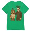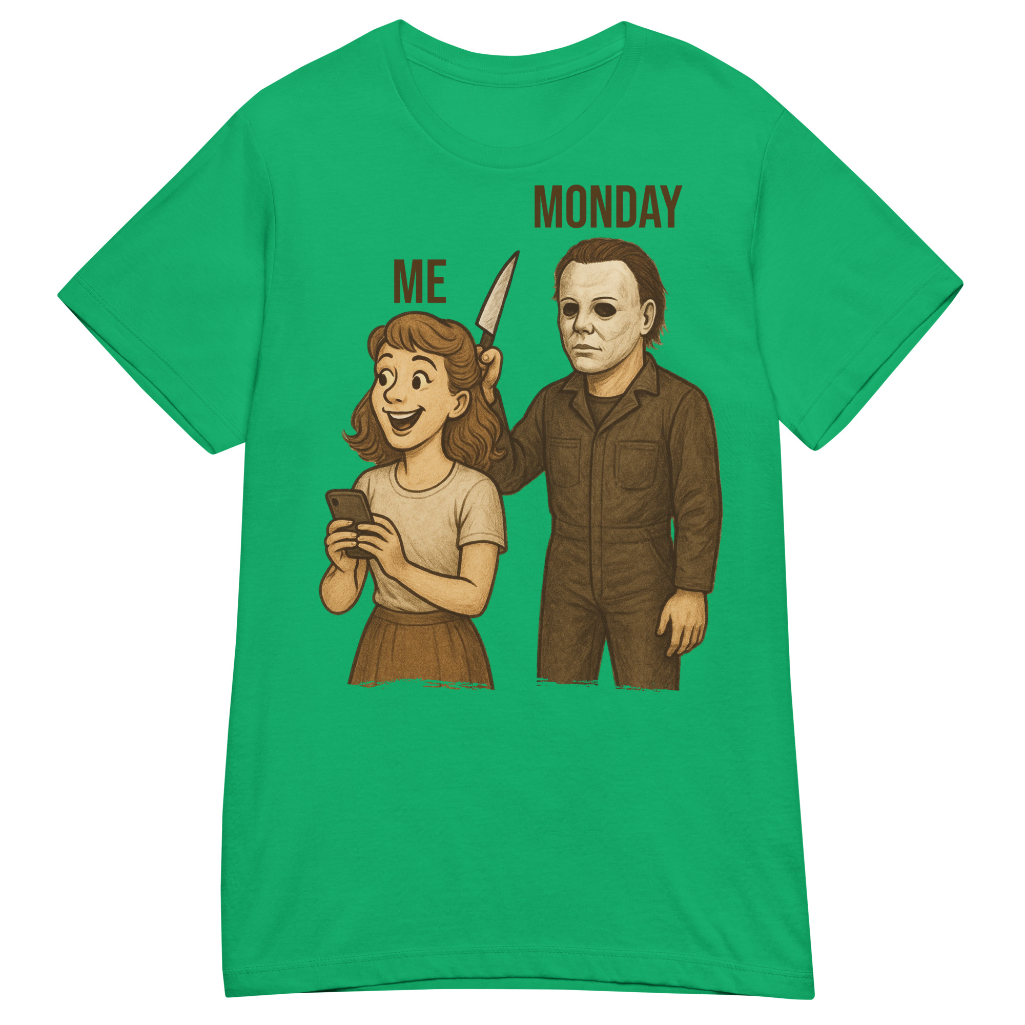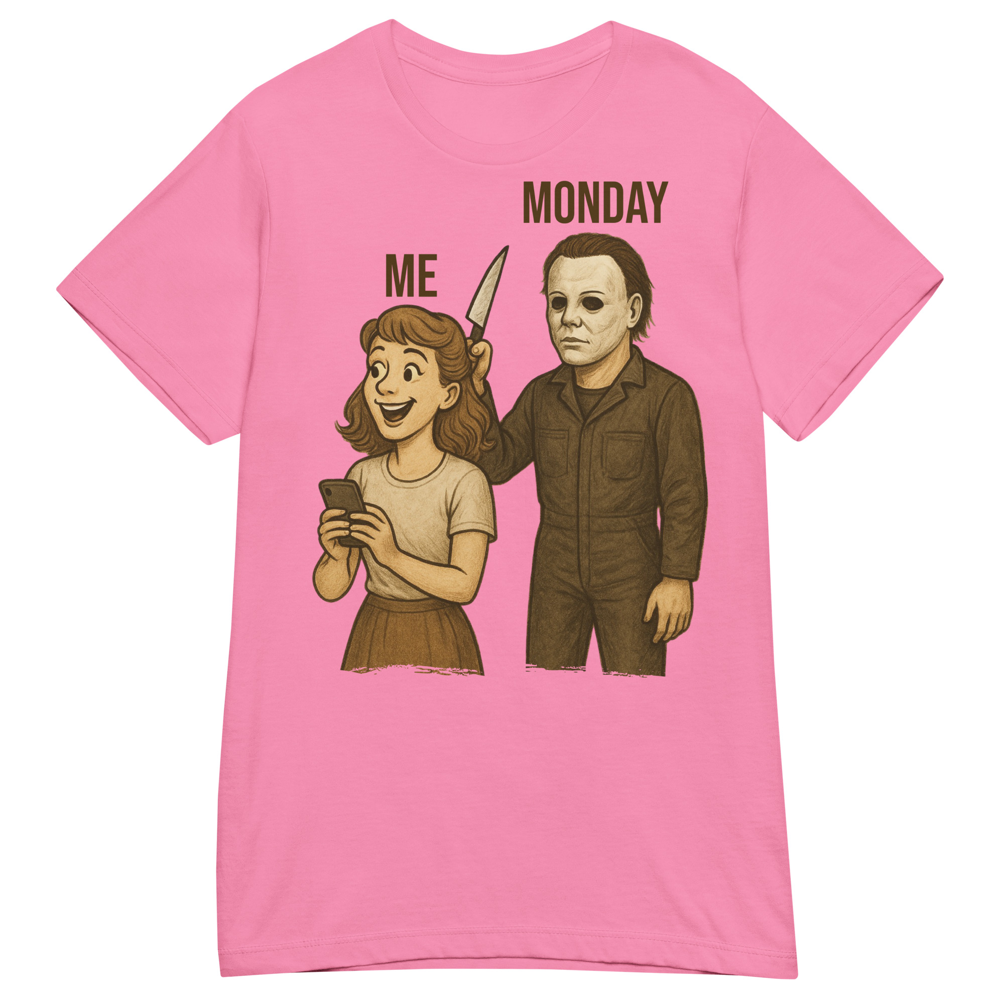 Semi-fitted t-shirt dekorerad med en välkänd mördare som attackerar en kvinna som dekoration på framsidan. Passar alla kvinnor som hatar måndagar. Du kan välja mellan fem olika färger.