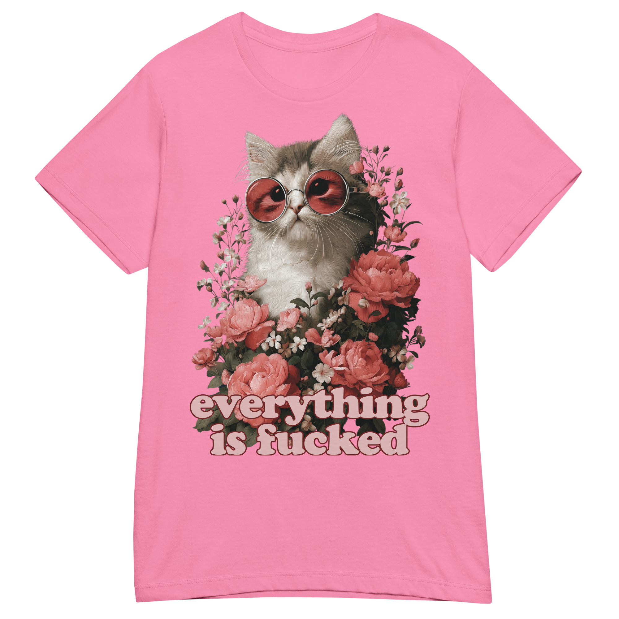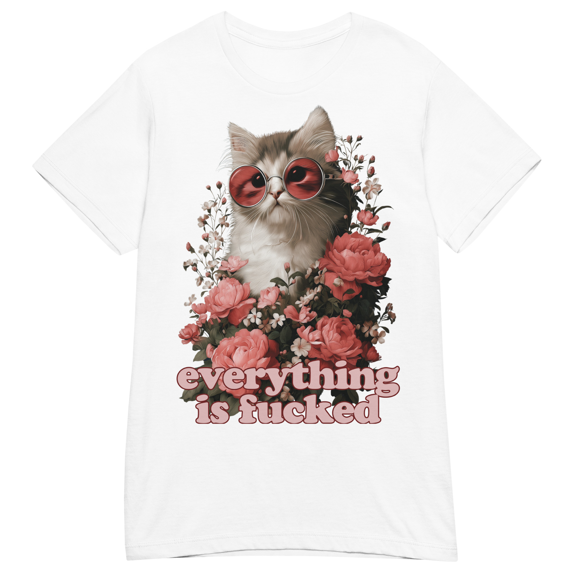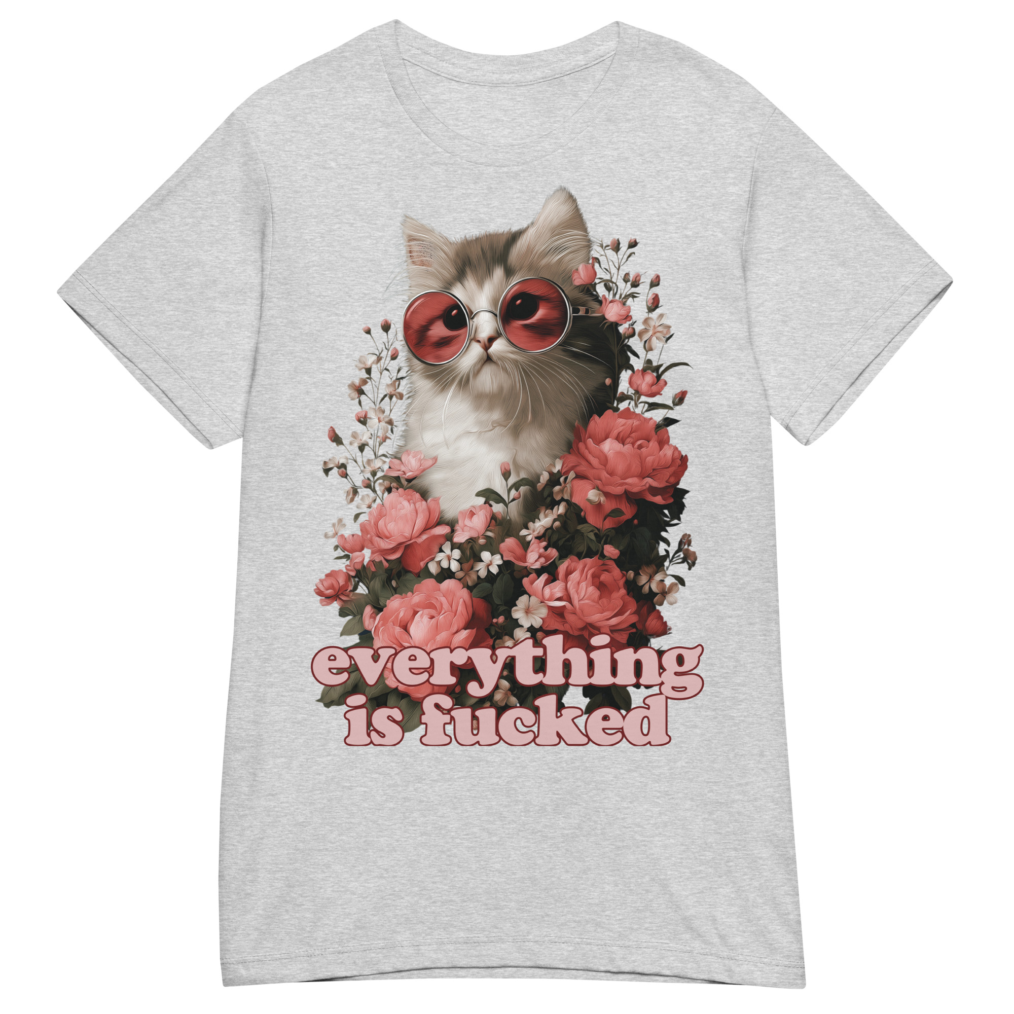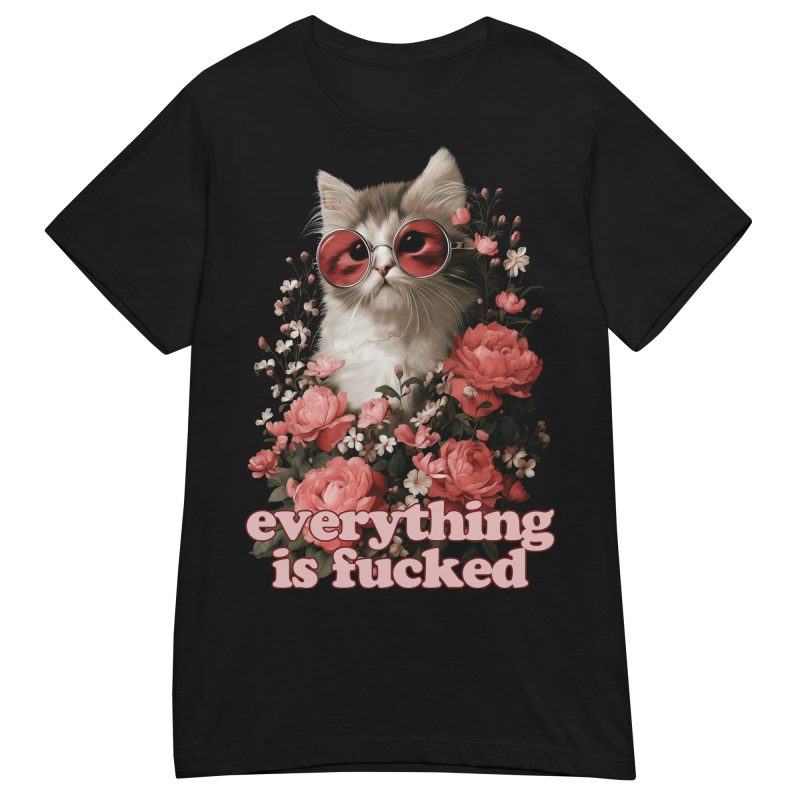 Semi-fitted t-shirt dekorerad med blommor, en katt och texten ’Everything is fucked’ som dekoration på framsidan. Passar alla kvinnor som älskar mörk humor. Du kan välja mellan elva olika färger.