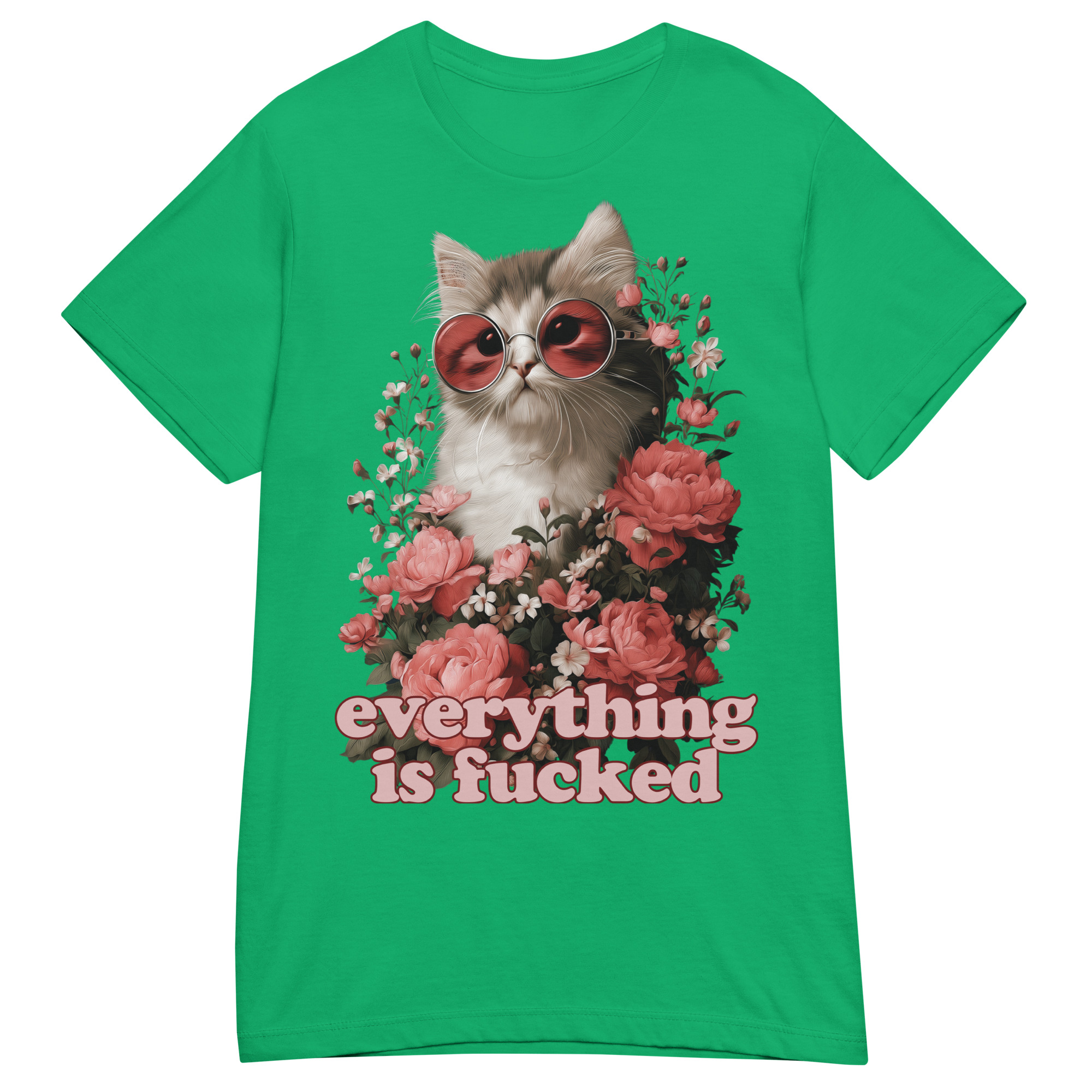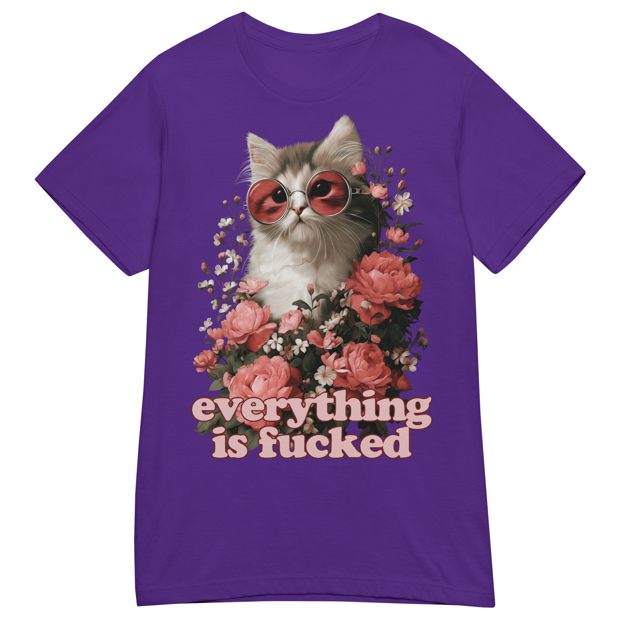 Snygg semi-fitted t-shirt med blommor, en katt och texten ’Everything is fucked’ som tryck på framsidan. Passar alla kvinnor som älskar katter och attityd. Du kan välja mellan elva olika färger.