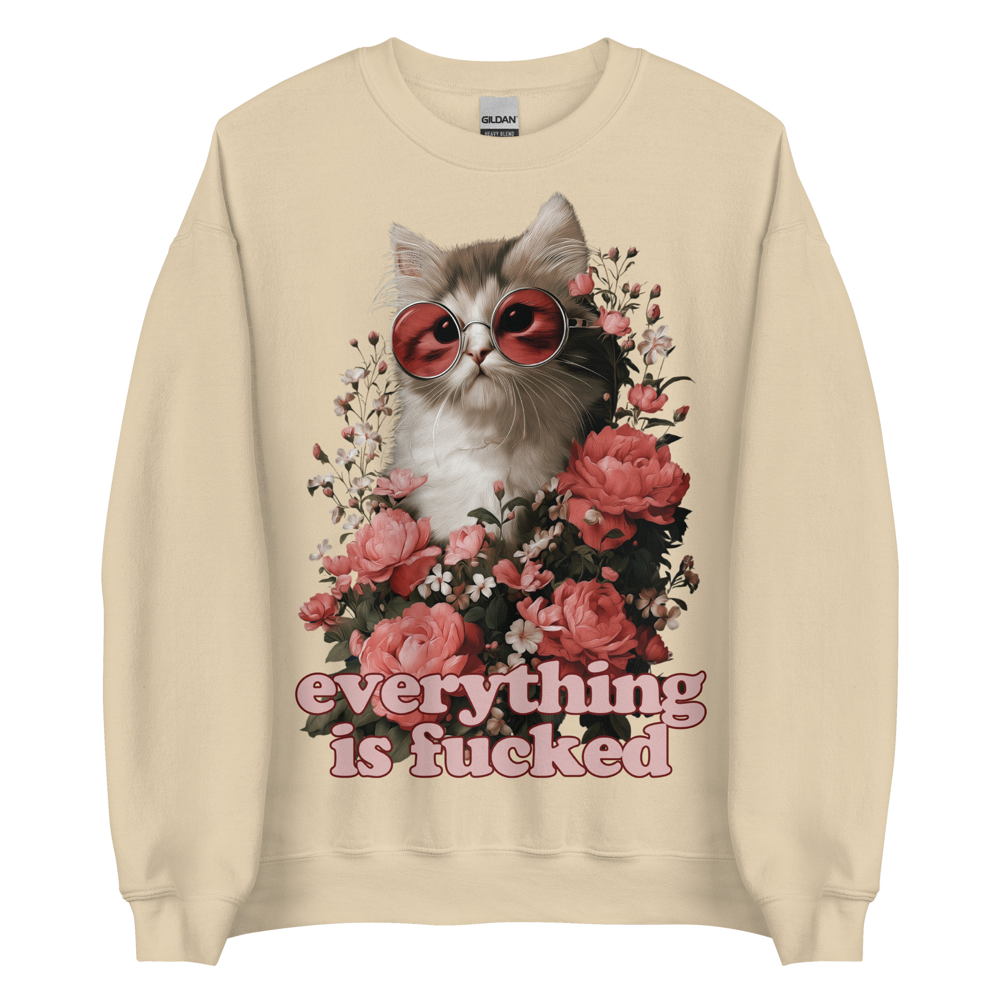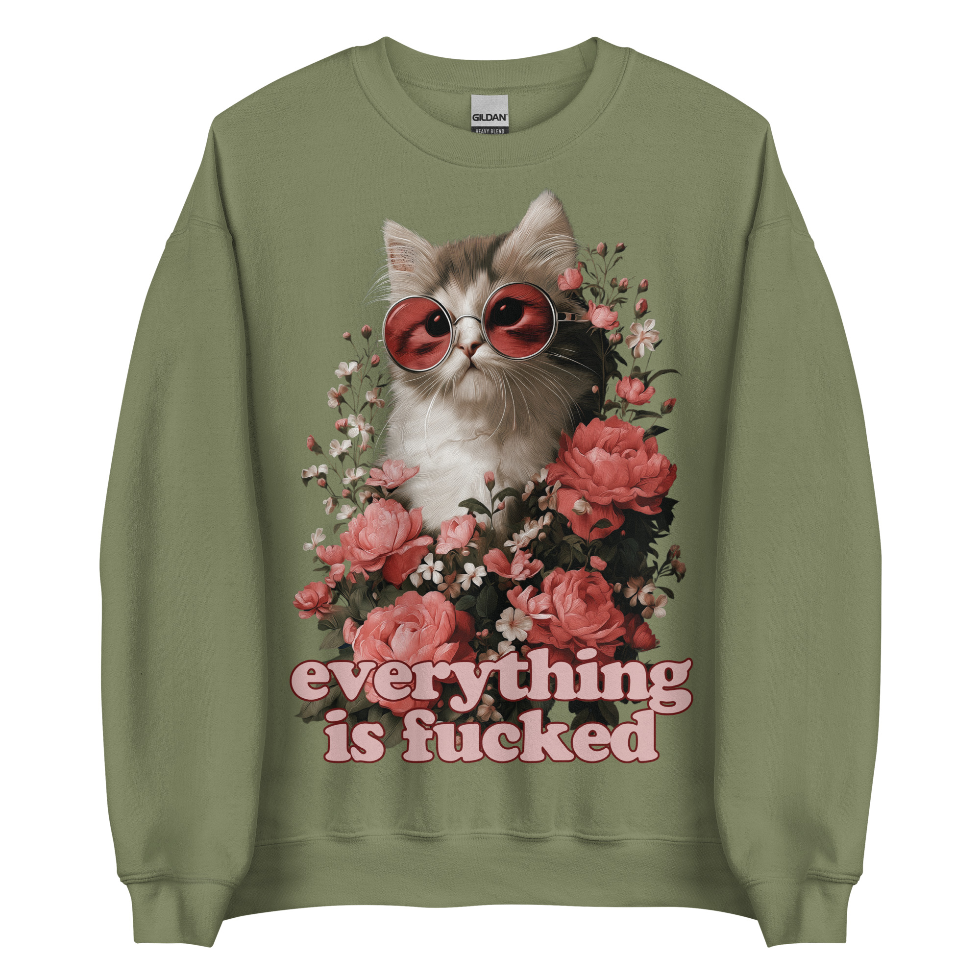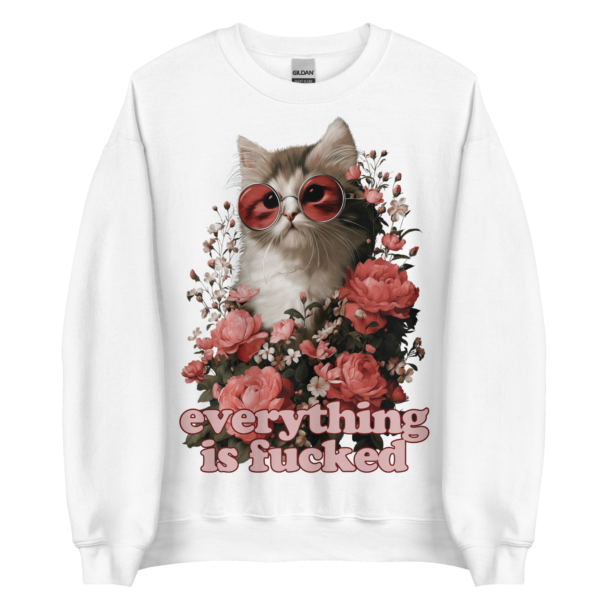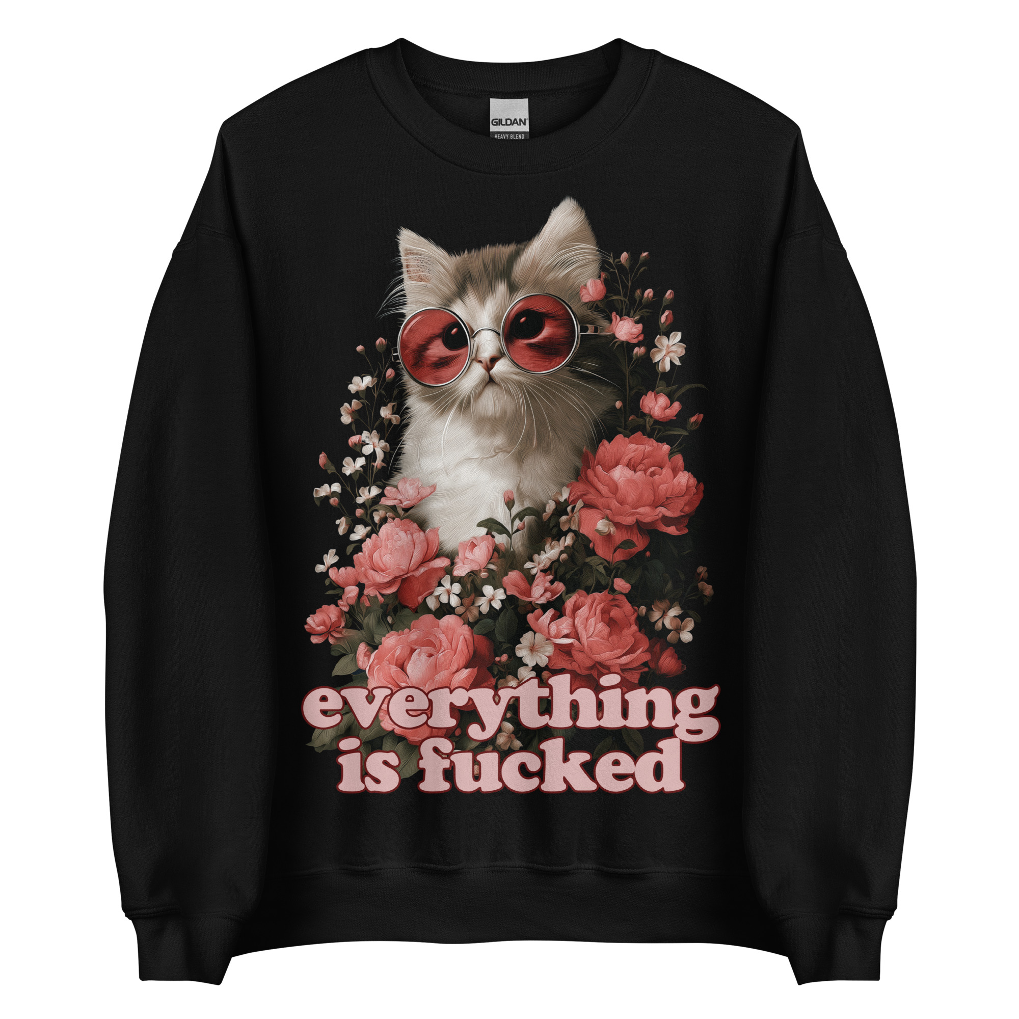 Sweatshirt dekorerad med blommor, en katt och texten ’Everything is fucked’ som motiv på framsidan. Passar både män och kvinnor som älskar katter och humor. Välj mellan elva olika färger.