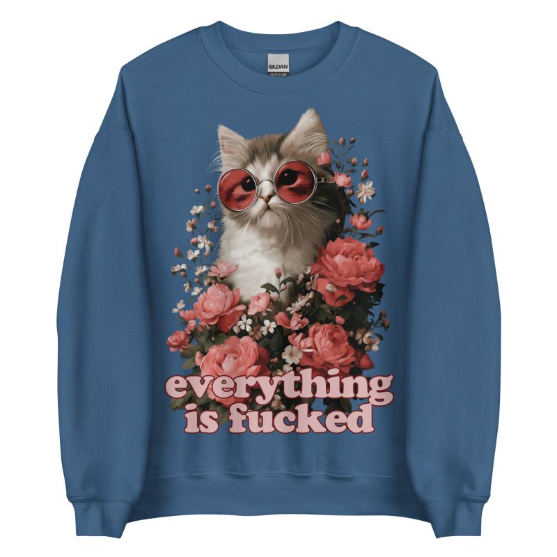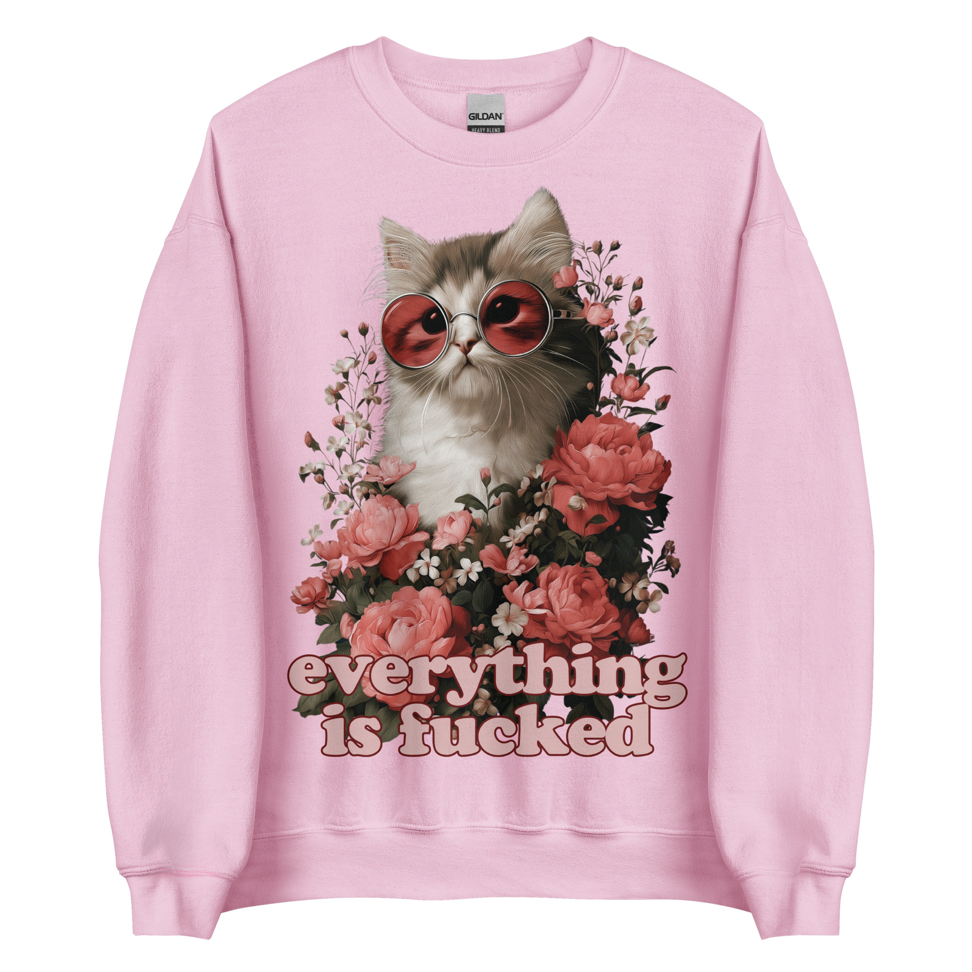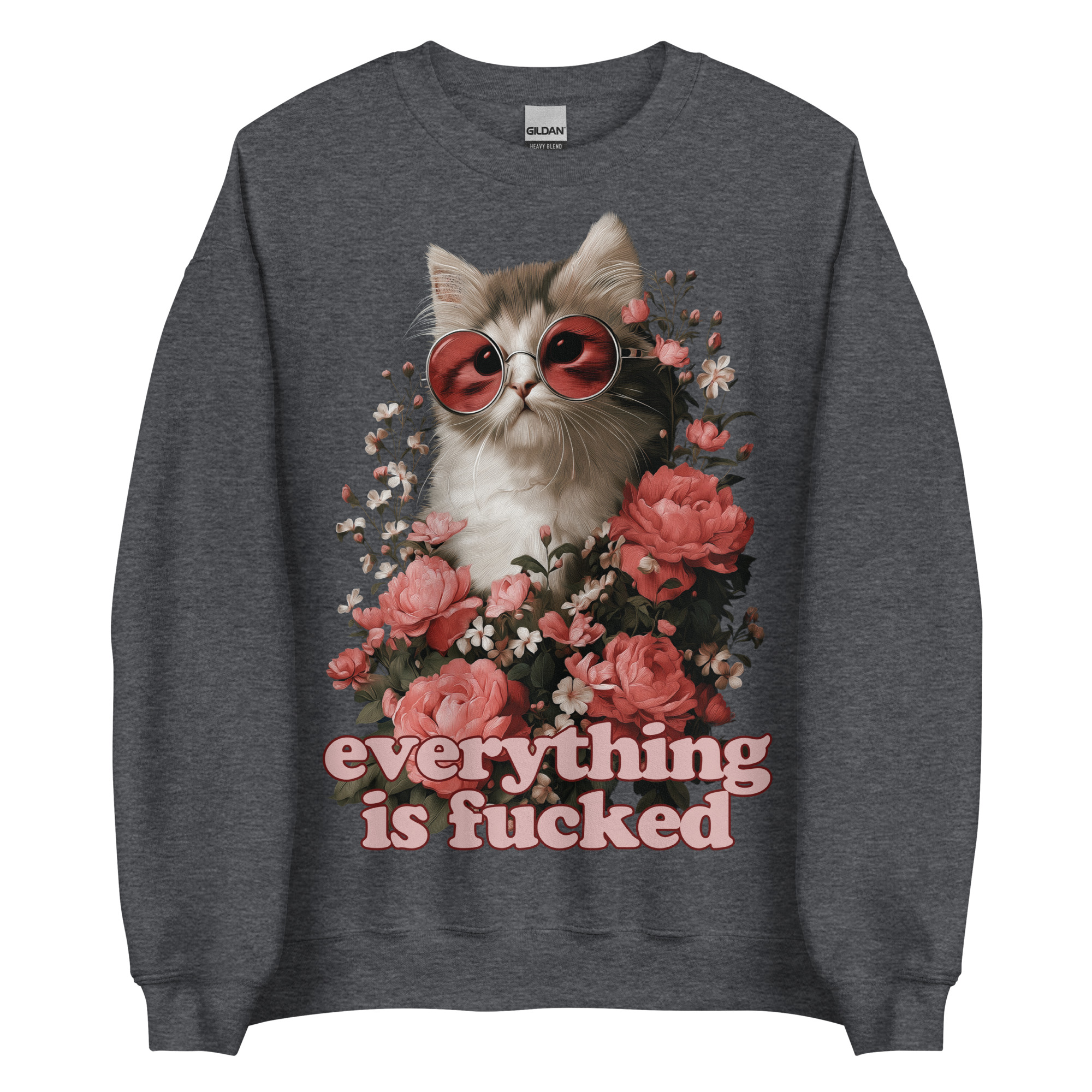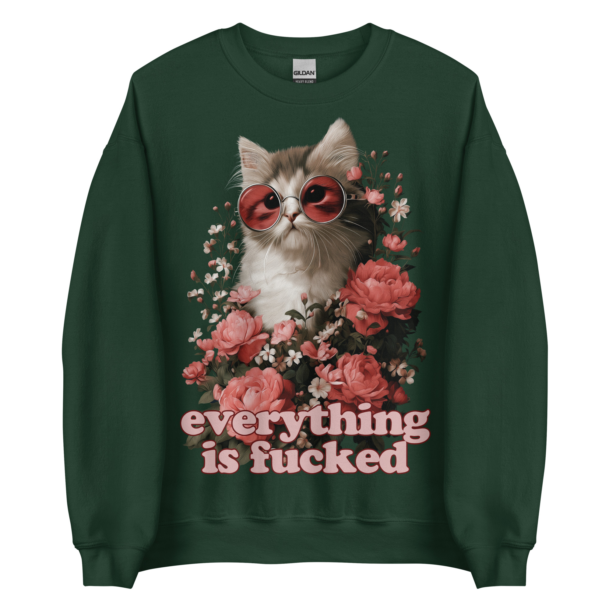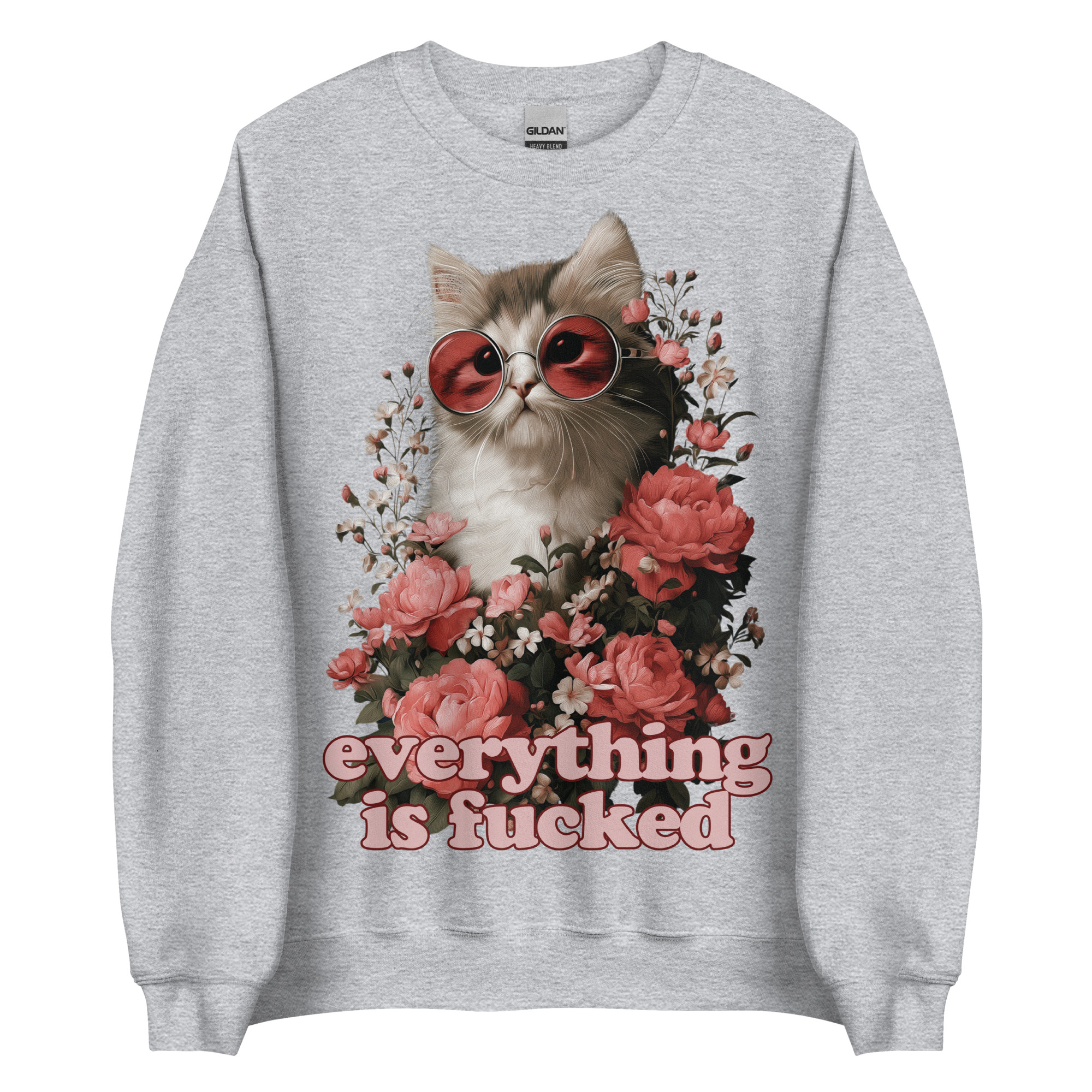 Sweatshirt dekorerad med blommor, en katt och texten ’Everything is fucked’ som motiv på framsidan. Passar både män och kvinnor som älskar katter och humor. Välj mellan elva olika färger.