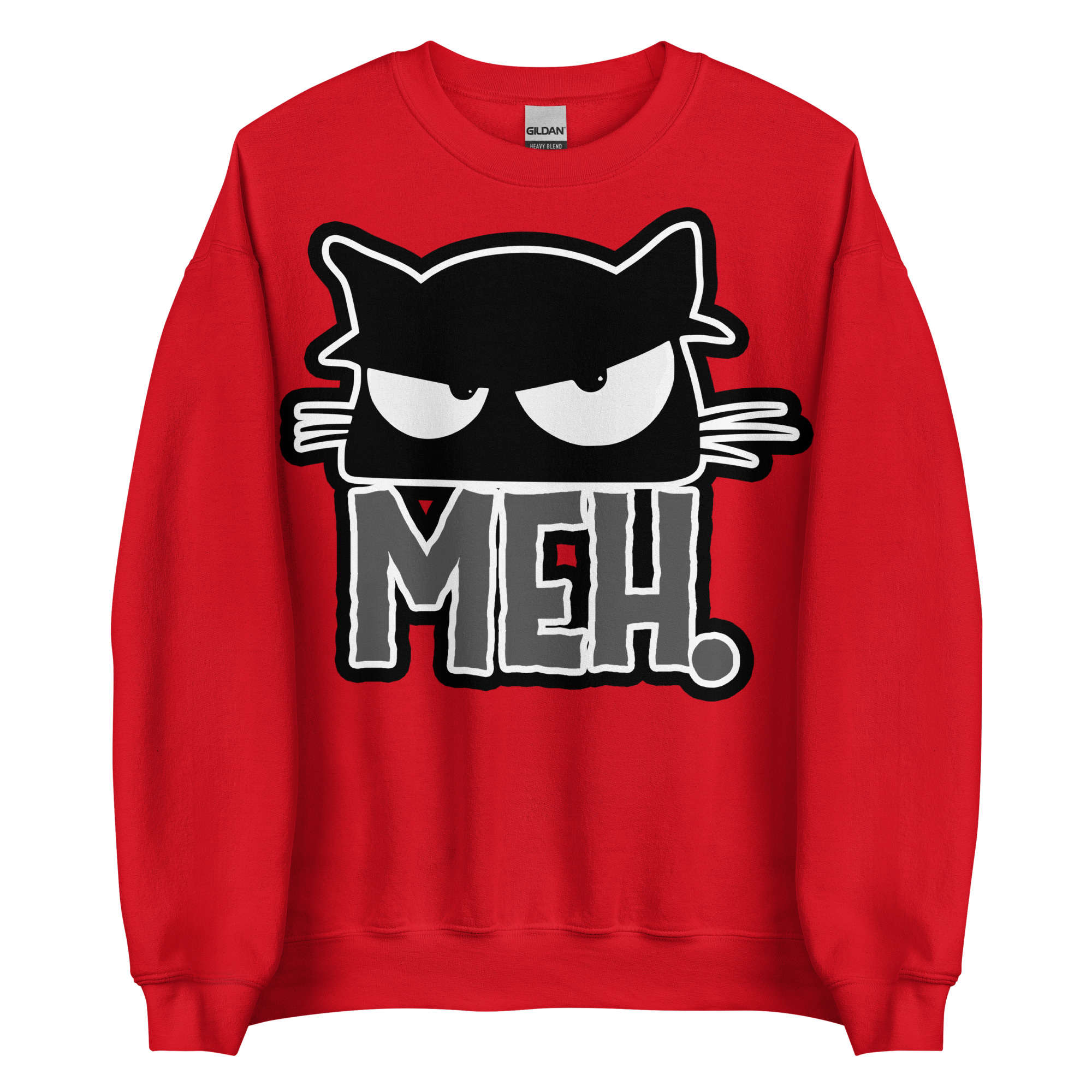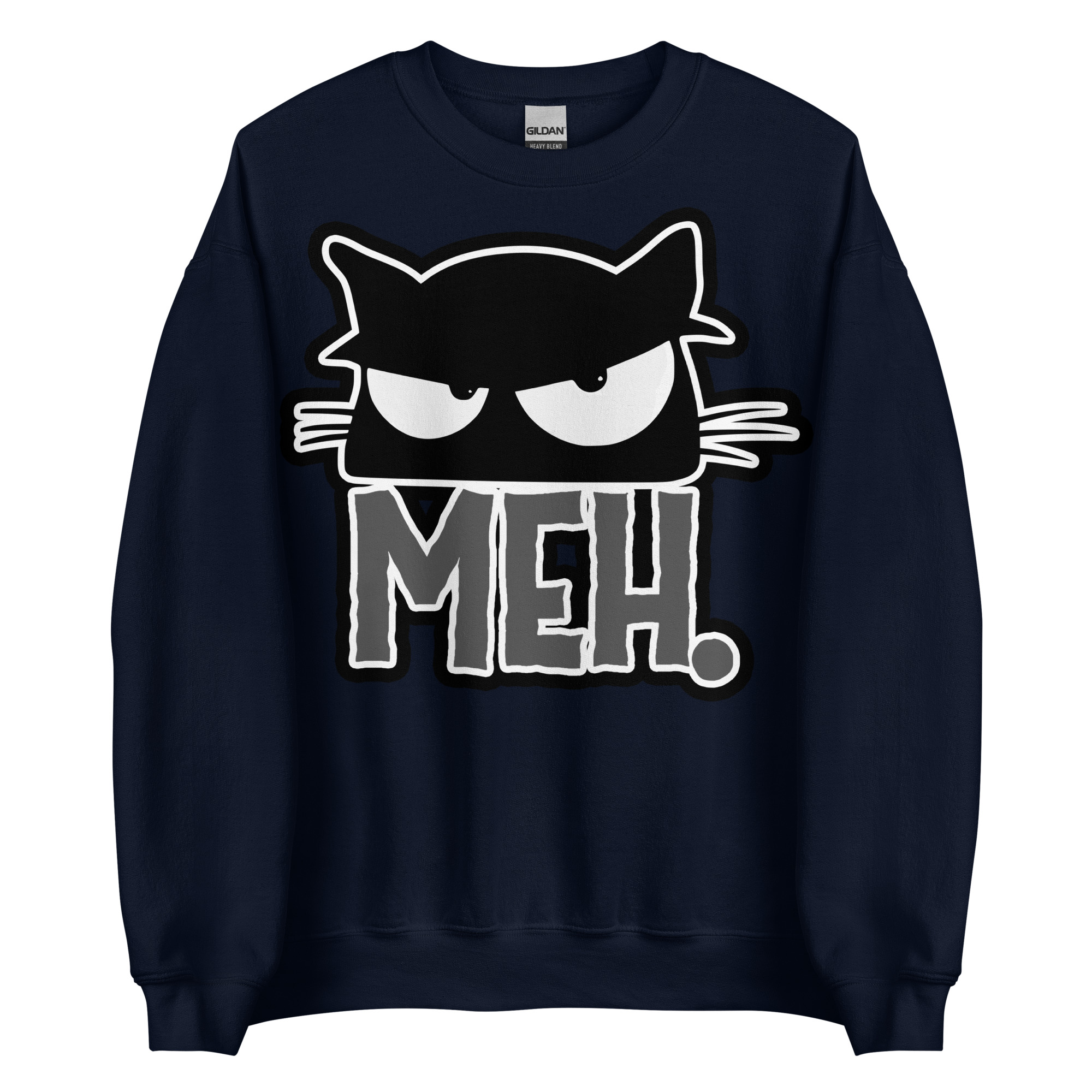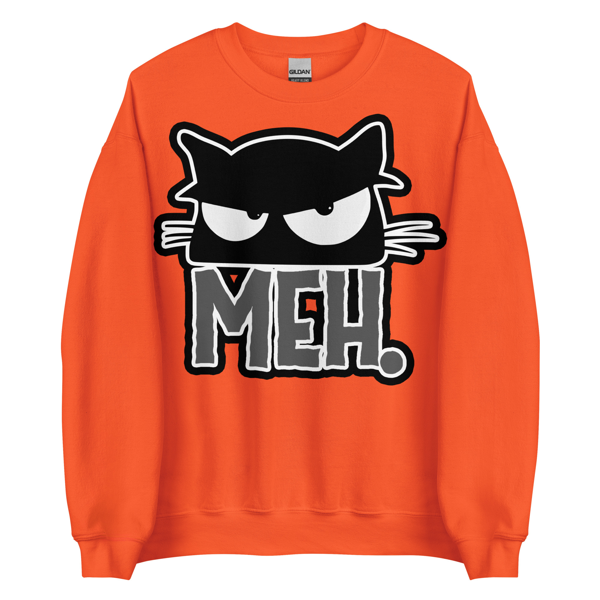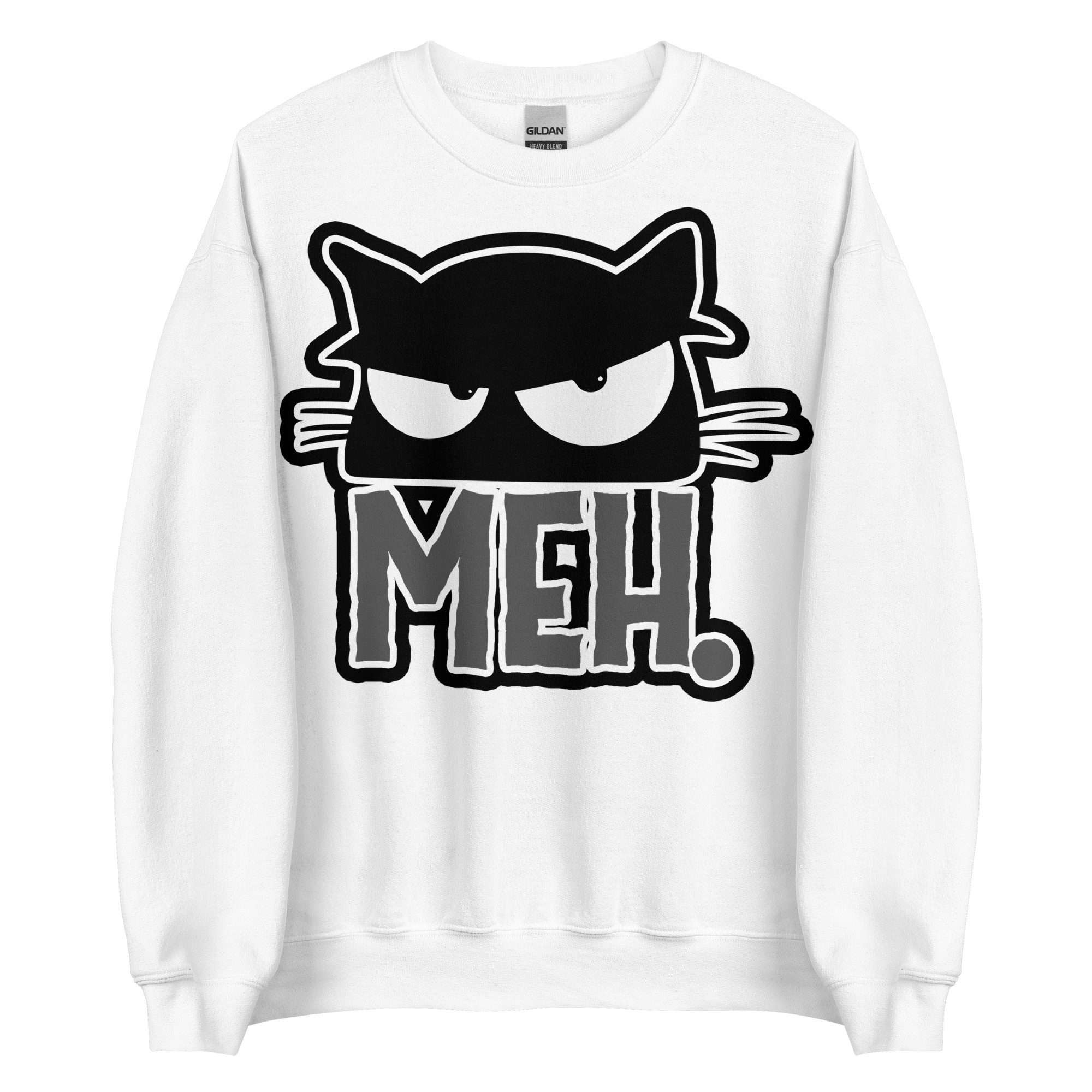 Långärmad tröja i en fin kvalitet med ett stort tryck på framsidan. Trycket består av en irriterad katt med texten ’MEH’. Unisex-modell som passar både kvinnor och män. Välj mellan 13 olika färger.