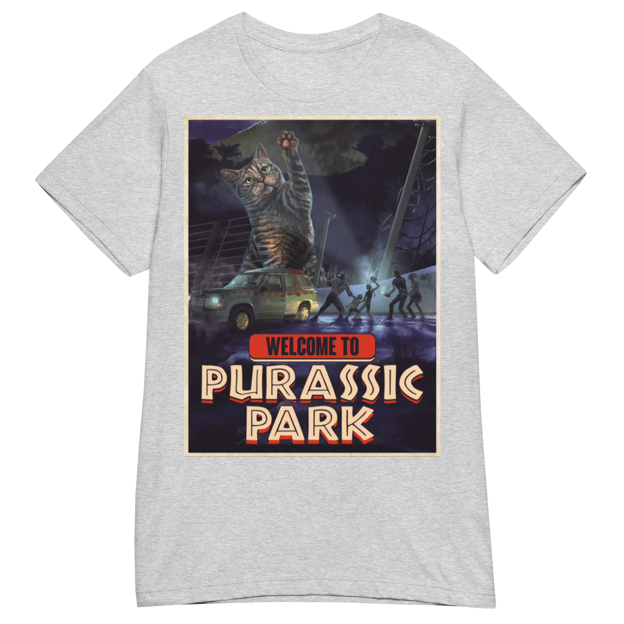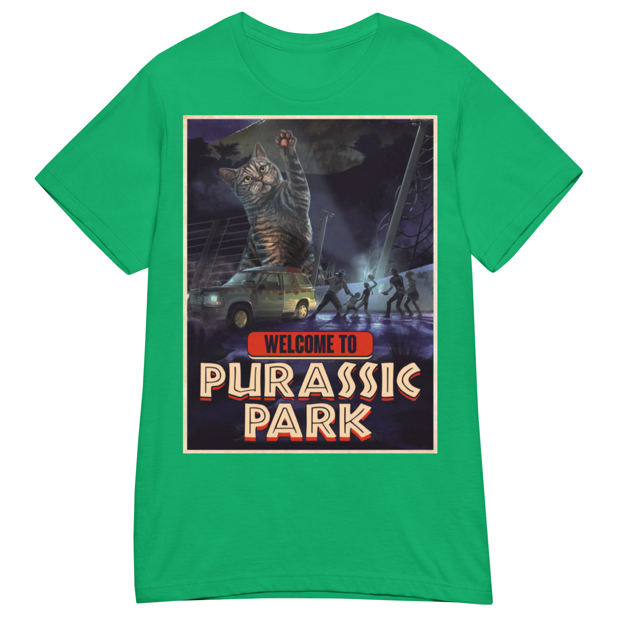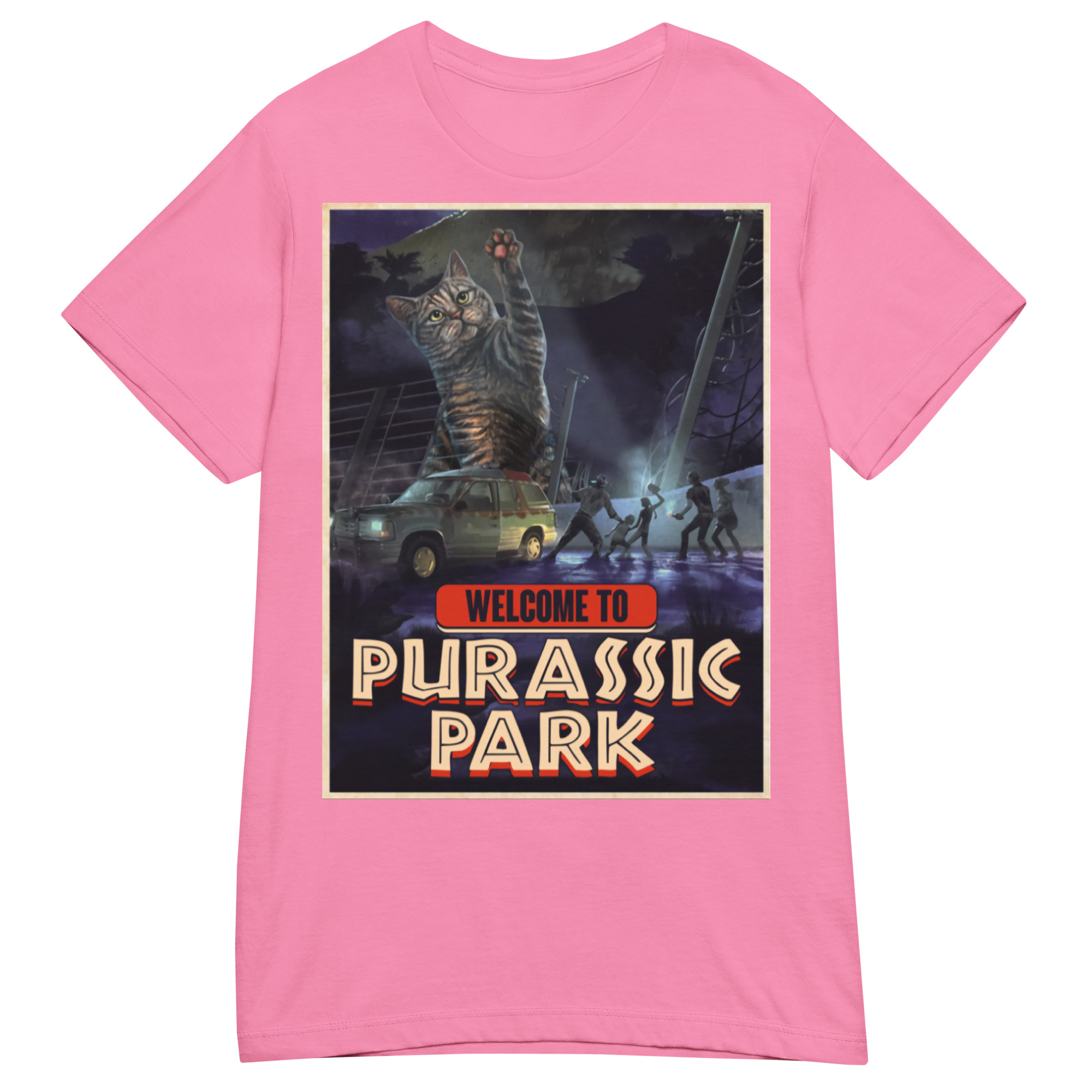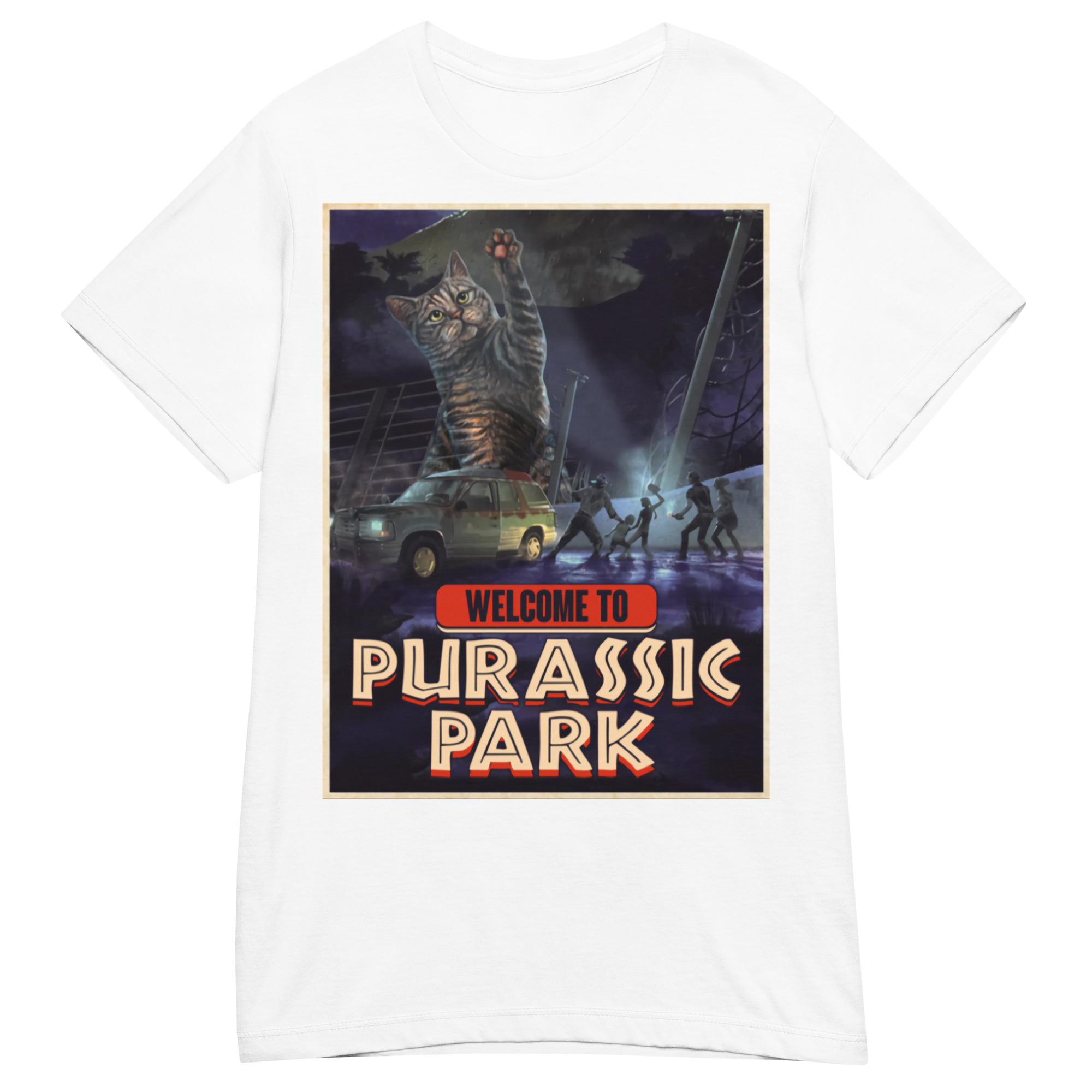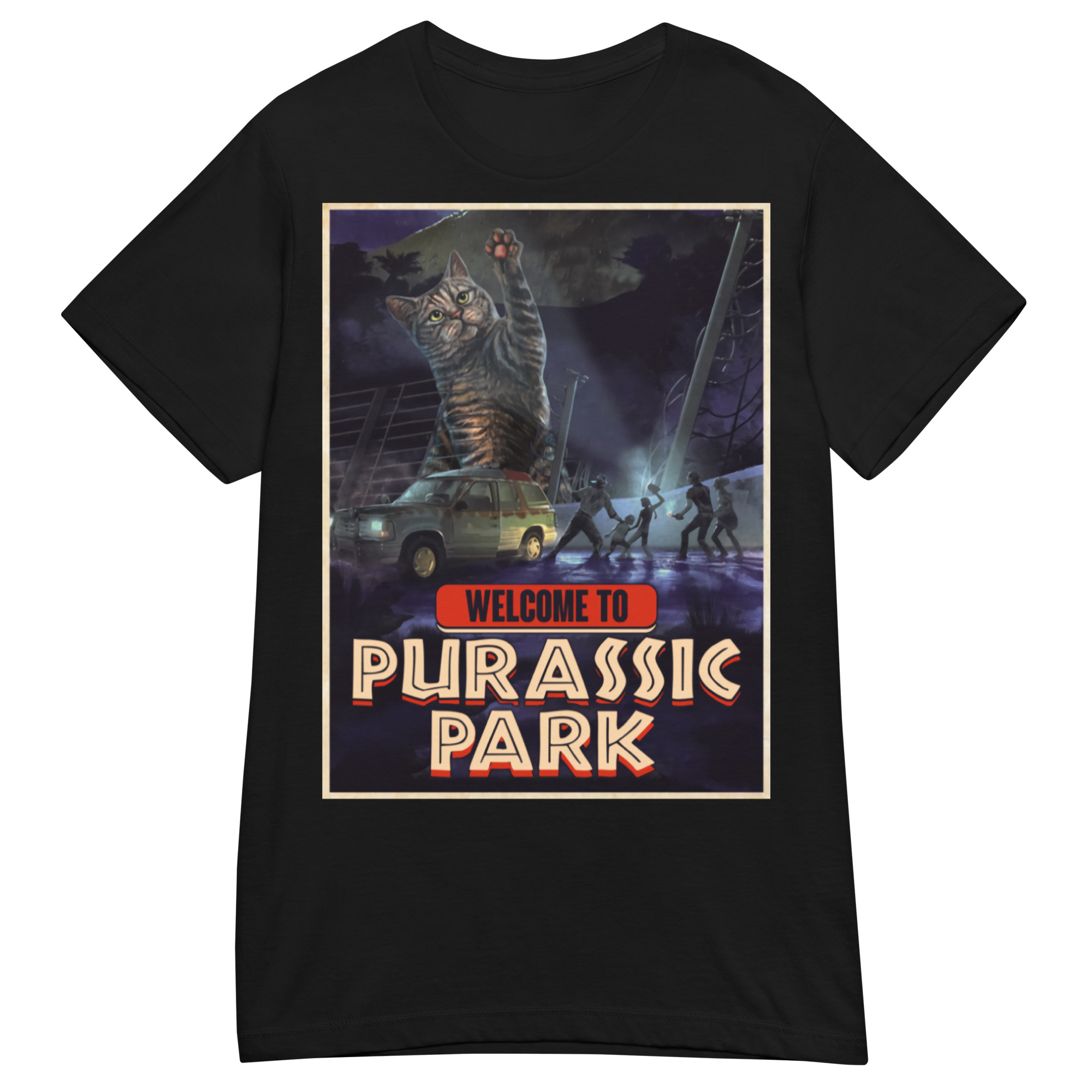 Semi-fitted t-shirt dekorerad med ett stort tryck med en katt och texten ’Welcome to purassic park’ som dekoration på framsidan. Passar alla kvinnor som älskar katter och film. Du kan välja mellan 11 olika färger.