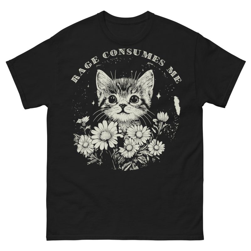 T-shirt dekorerad med ett stort tryck med en söt katt och texten ’Rage consumes me’ som dekoration på framsidan. Passar perfekt till alla arga män och kvinnor. Tröjan är tillverkad i en fin kvalitet i 100% bomull.