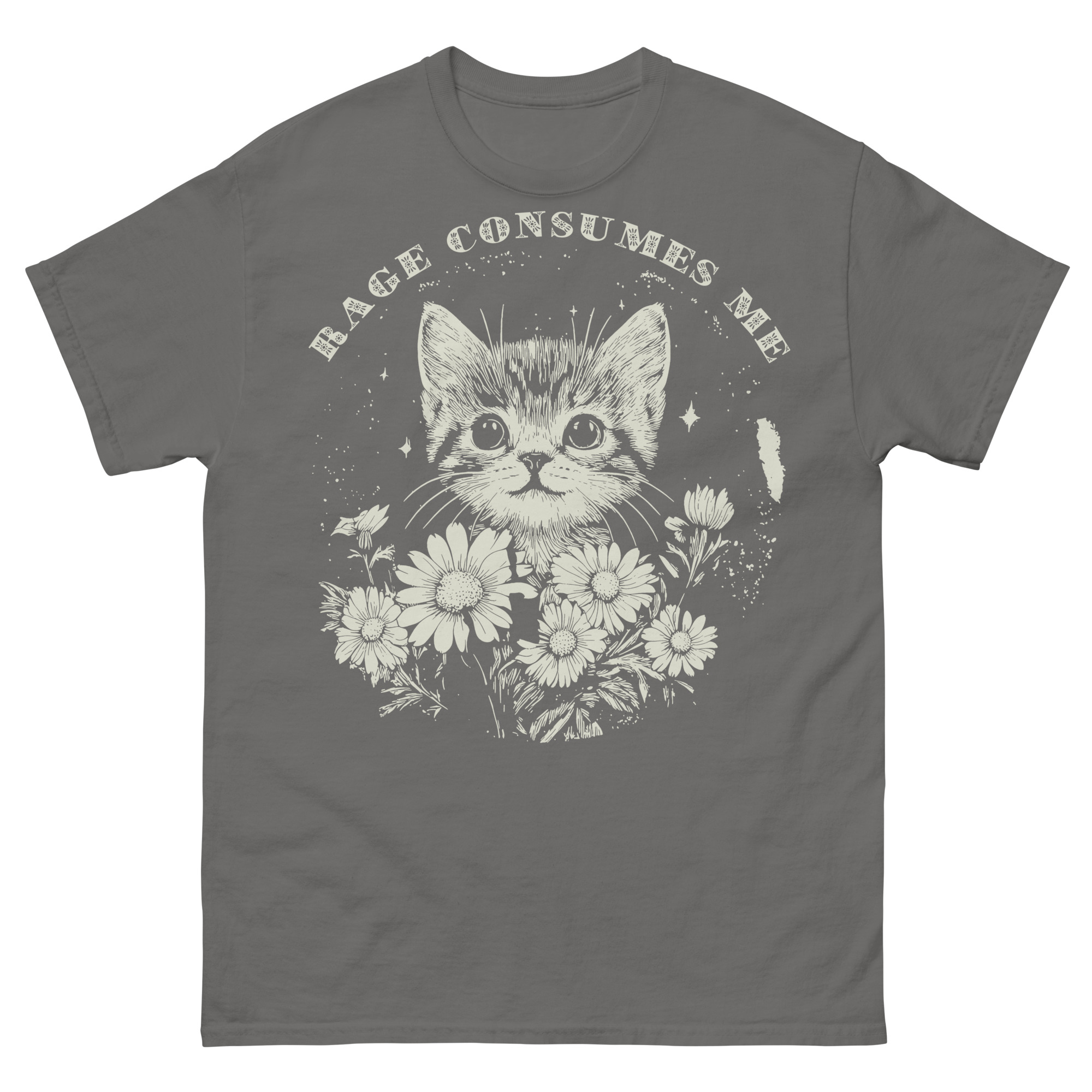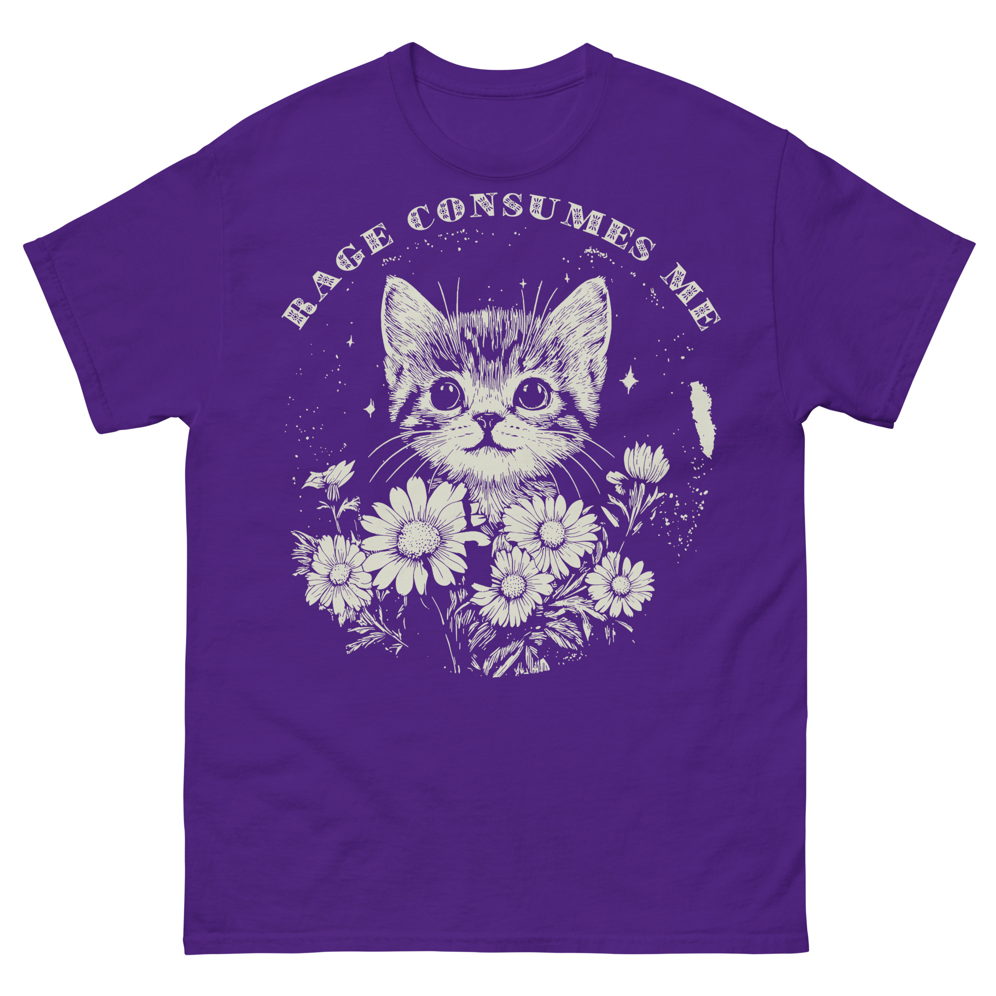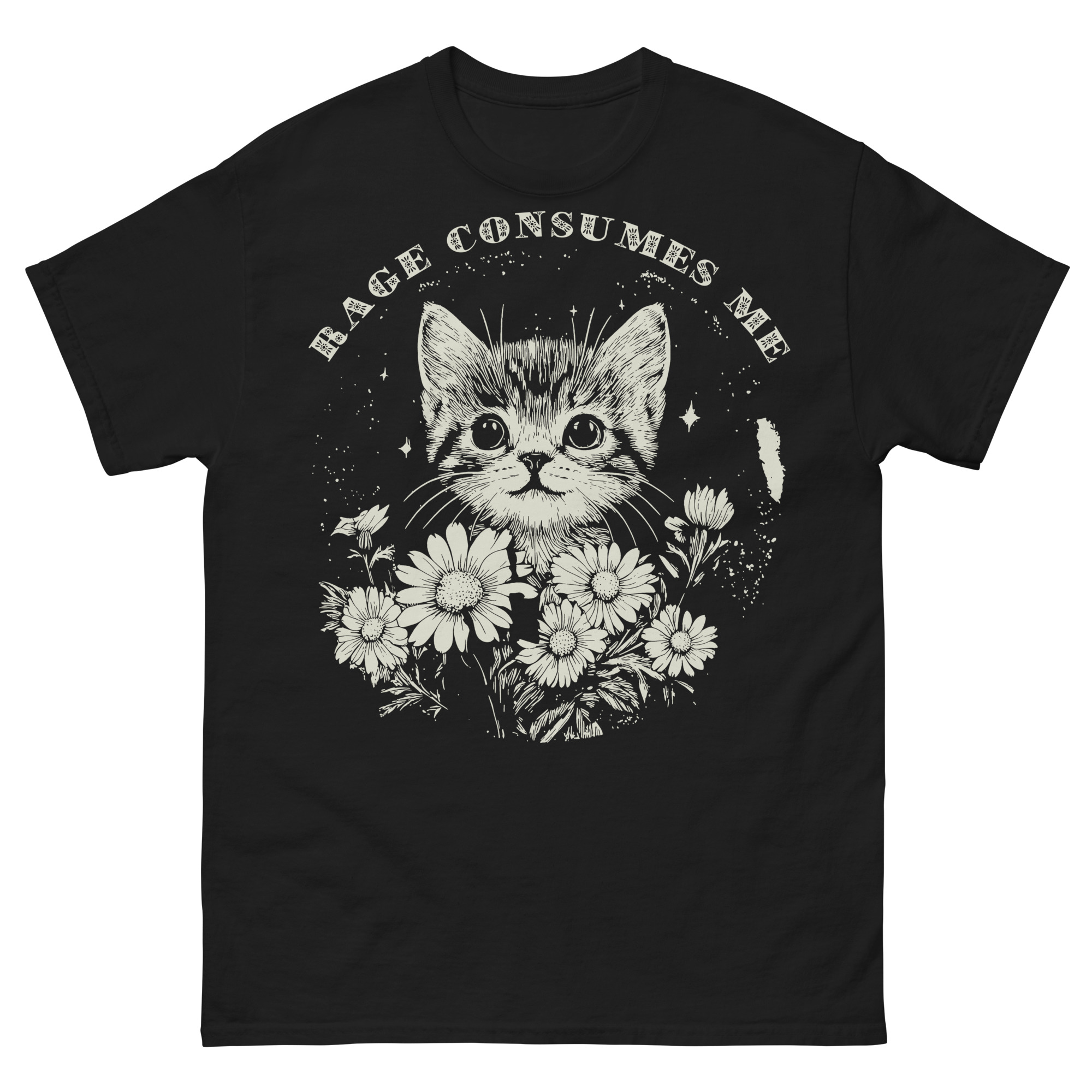 Snygg t-shirt med ett stort tryck med en söt katt och texten ’Rage consumes me’ på framsidan. Tröjan passar alla arga män och kvinnor. Välj mellan sex olika färger.