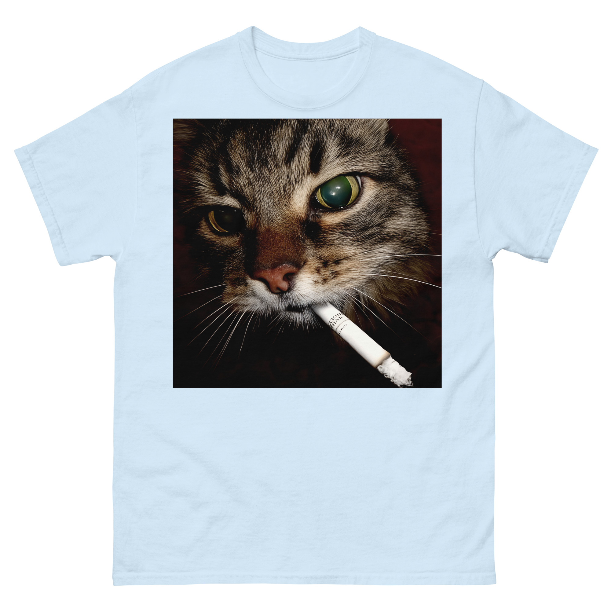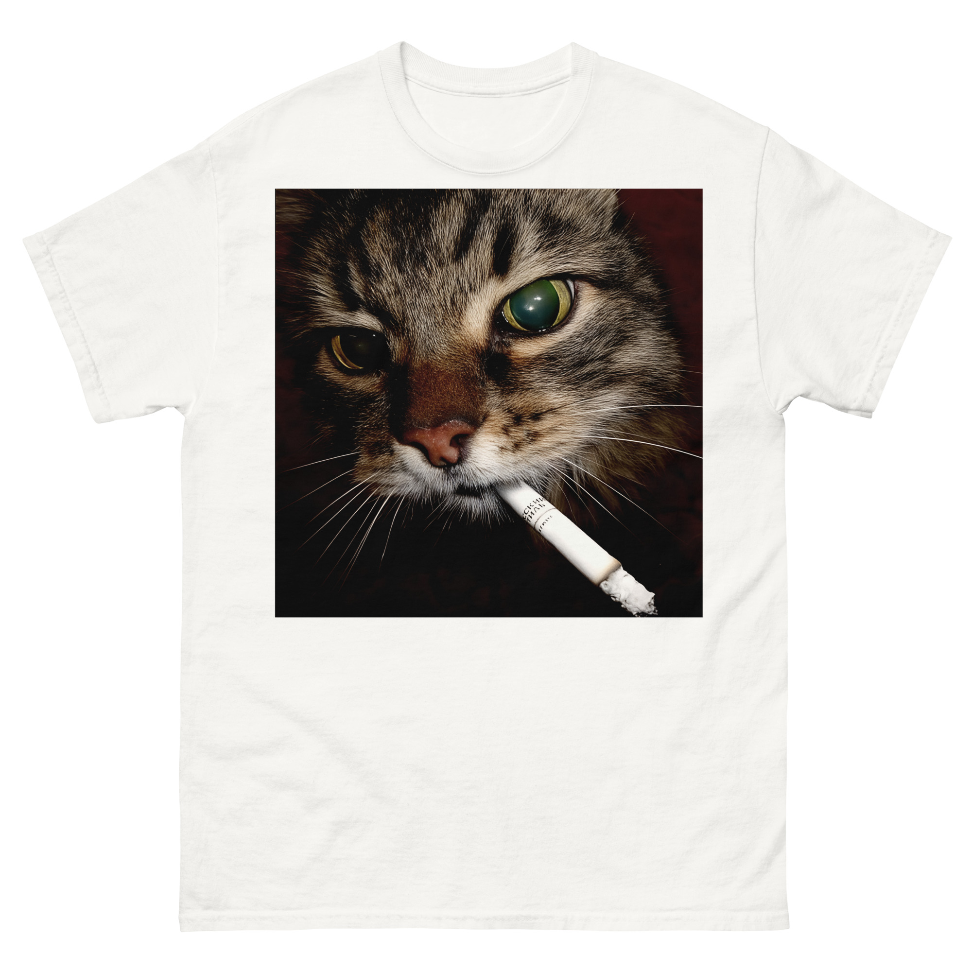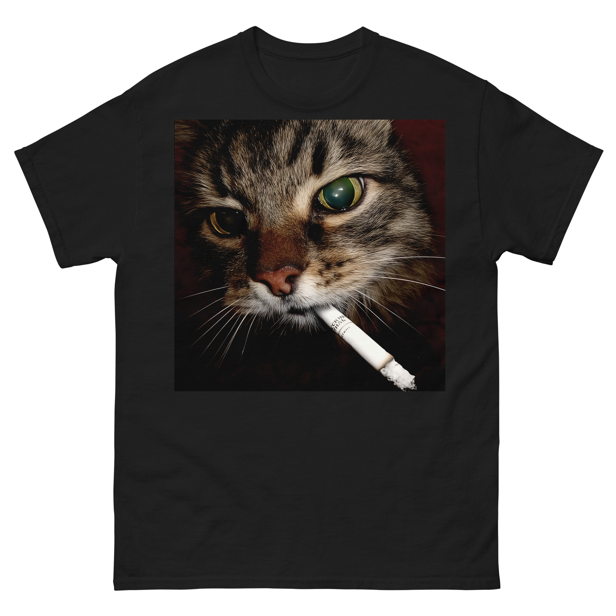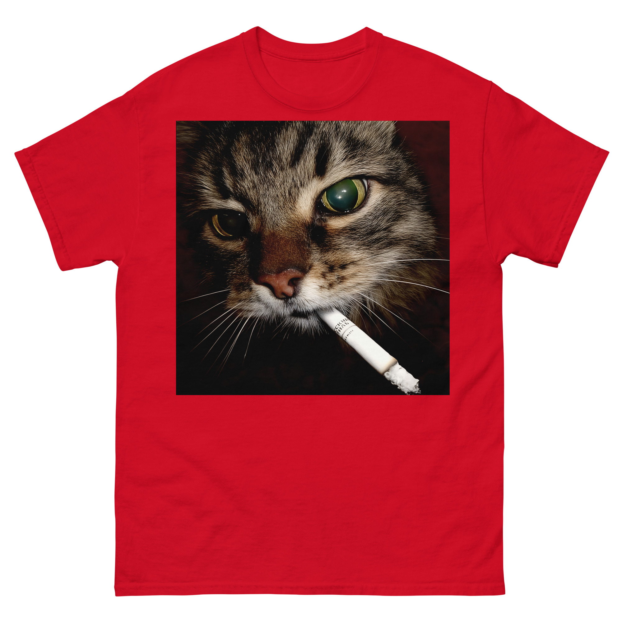 T-shirt dekorerad med en katt som röker en cigarett som dekoration på framsidan. Passar alla som älskar katter och humor. Du kan välja mellan 16 olika färger.