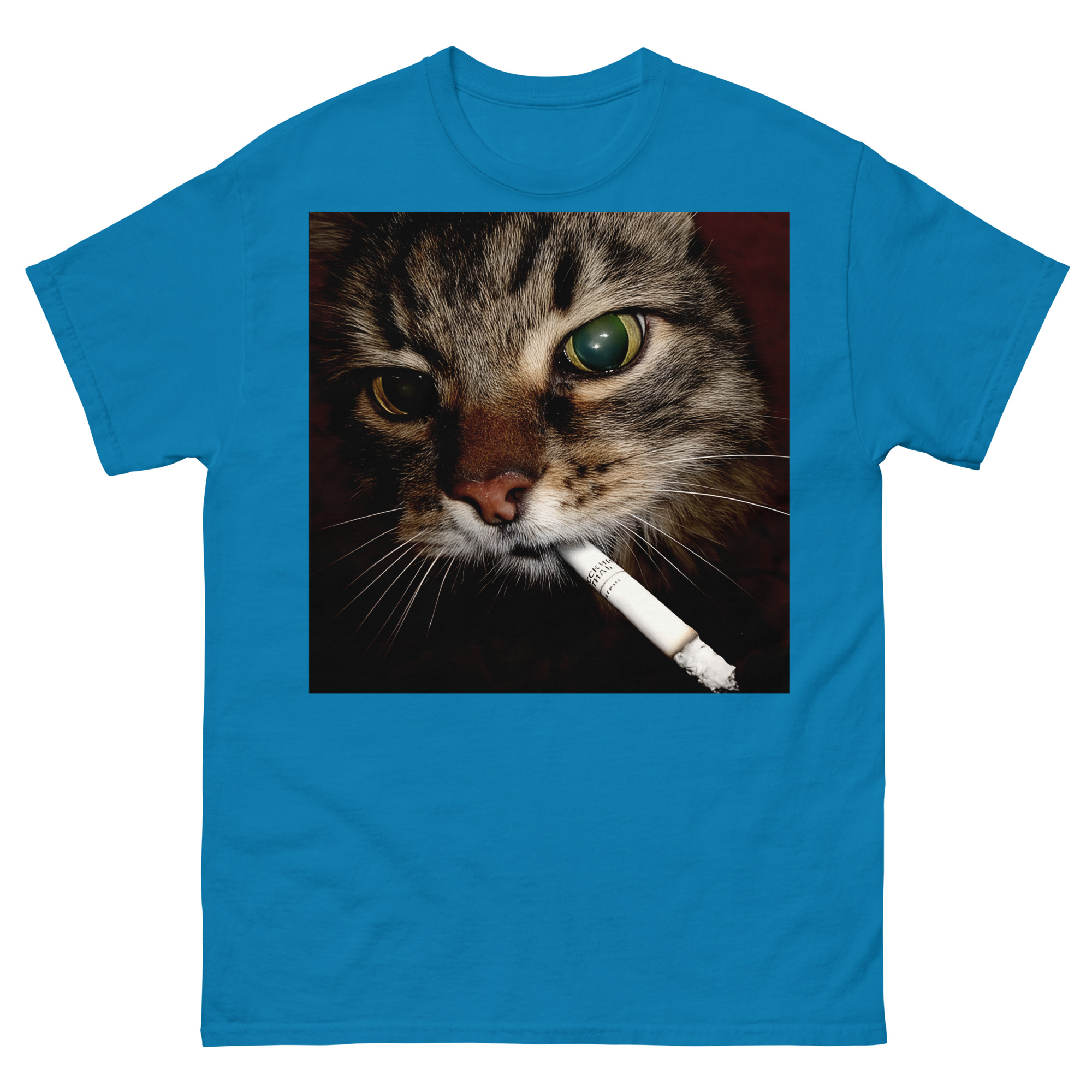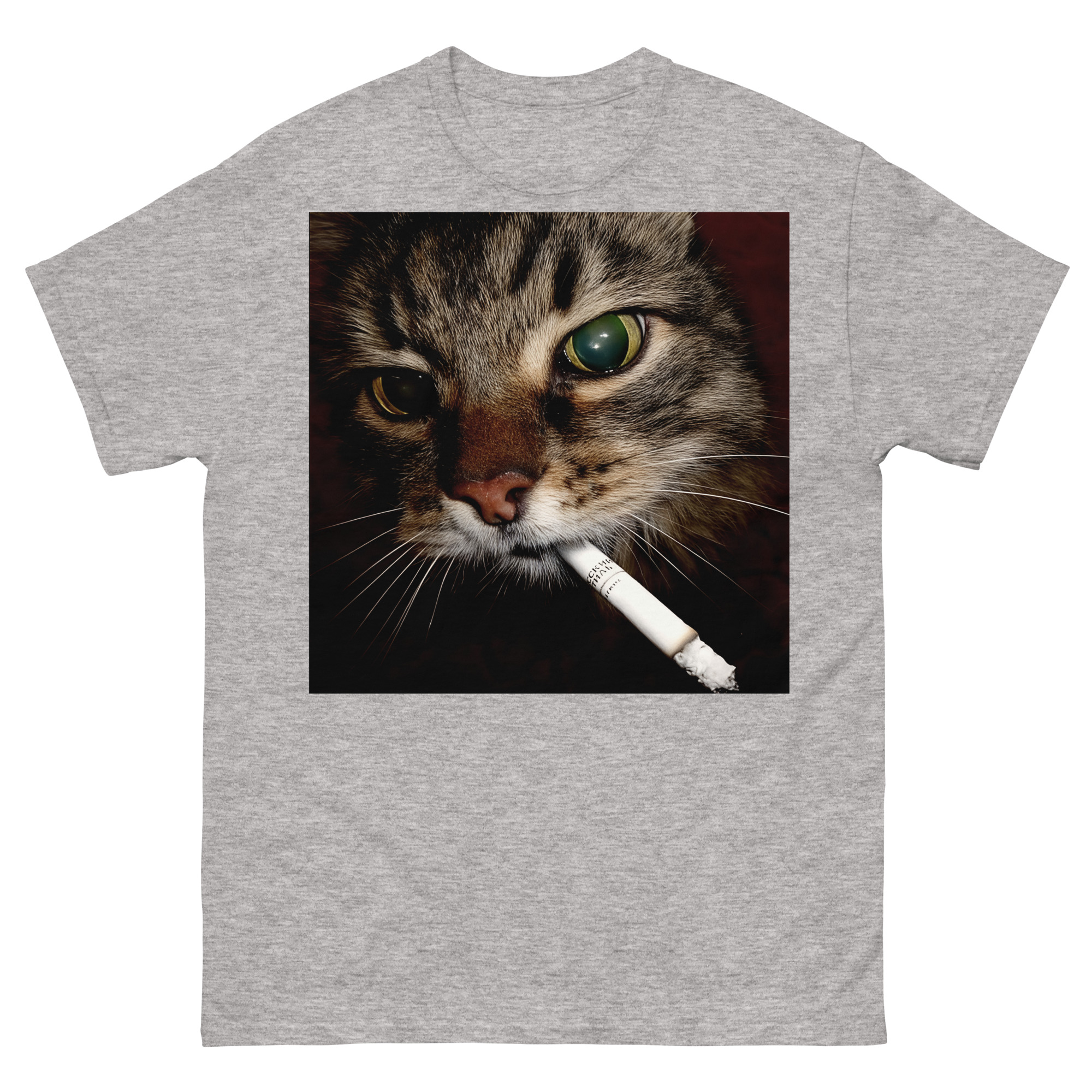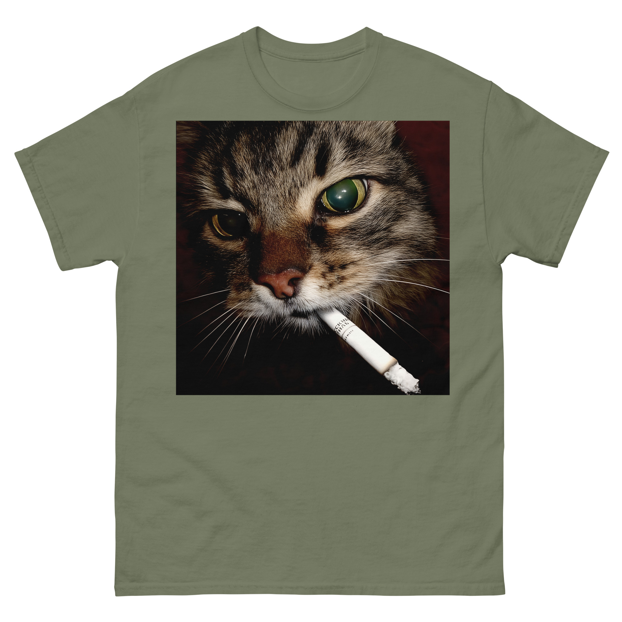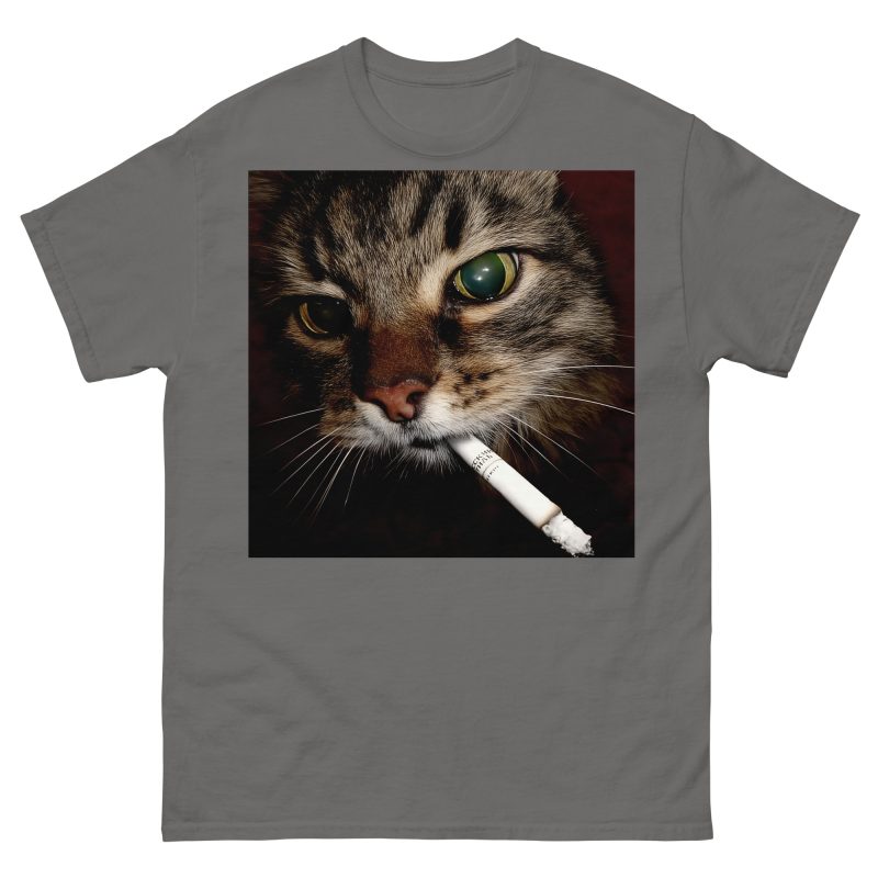 T-shirt dekorerad med en katt som röker en cigarett som dekoration på framsidan. Passar alla som älskar katter och humor. Du kan välja mellan 16 olika färger.