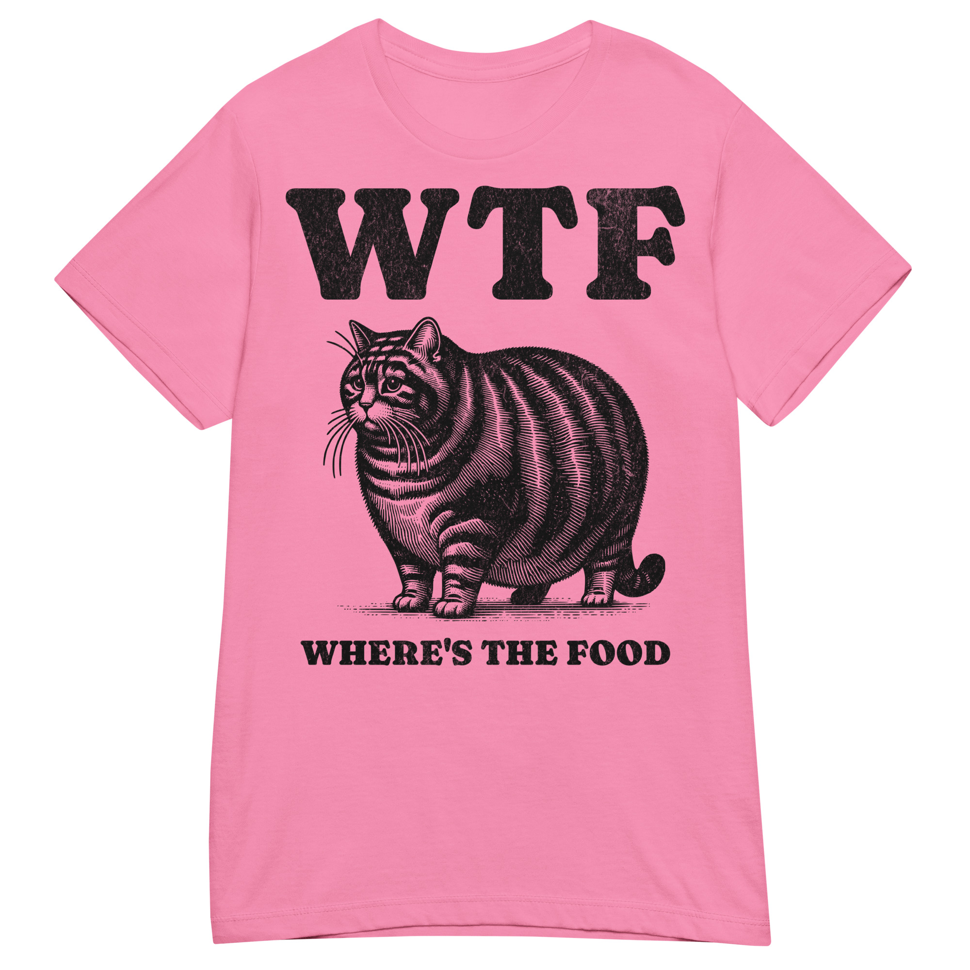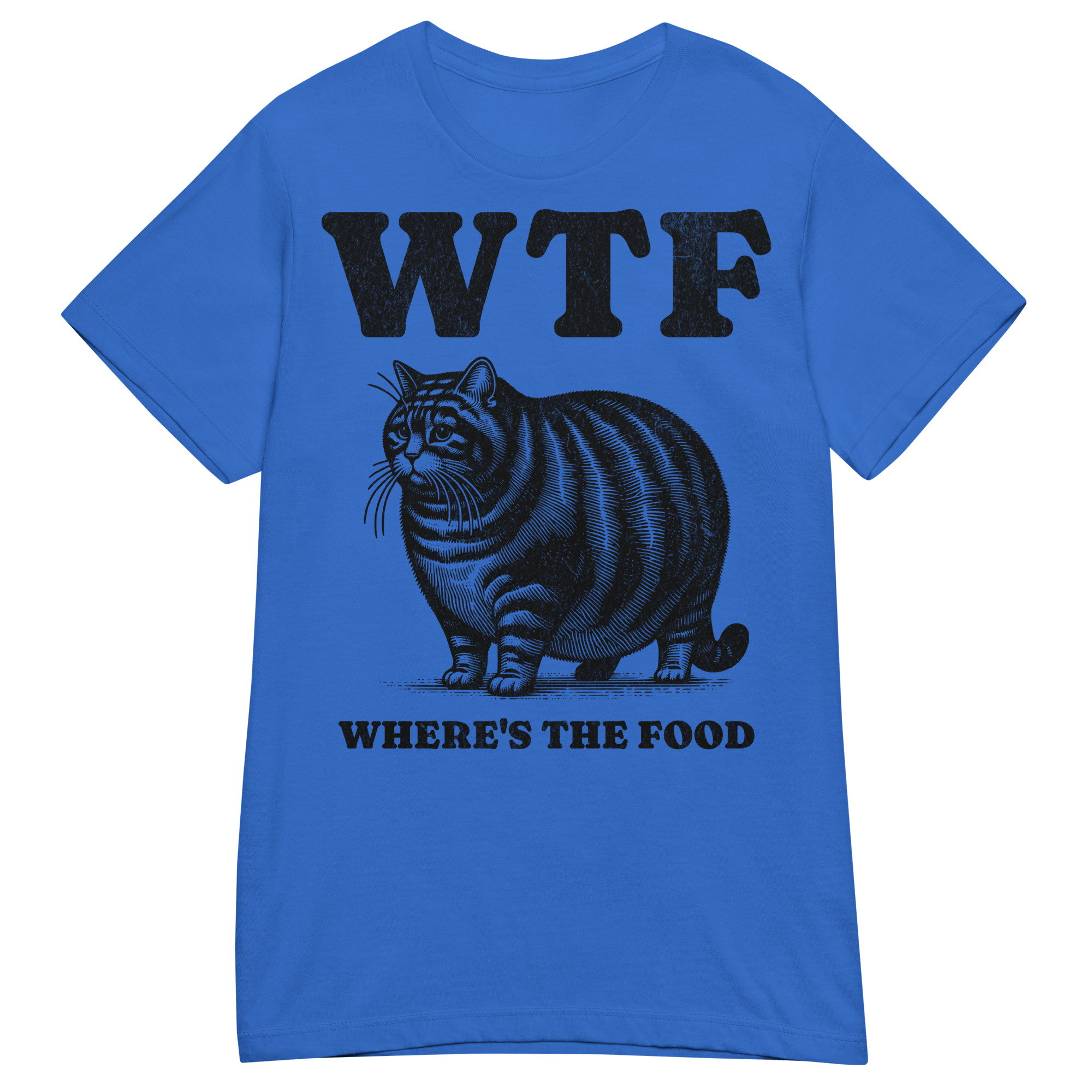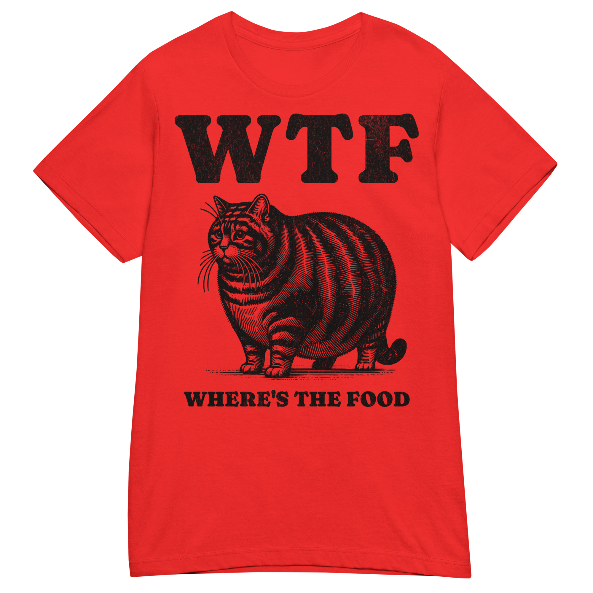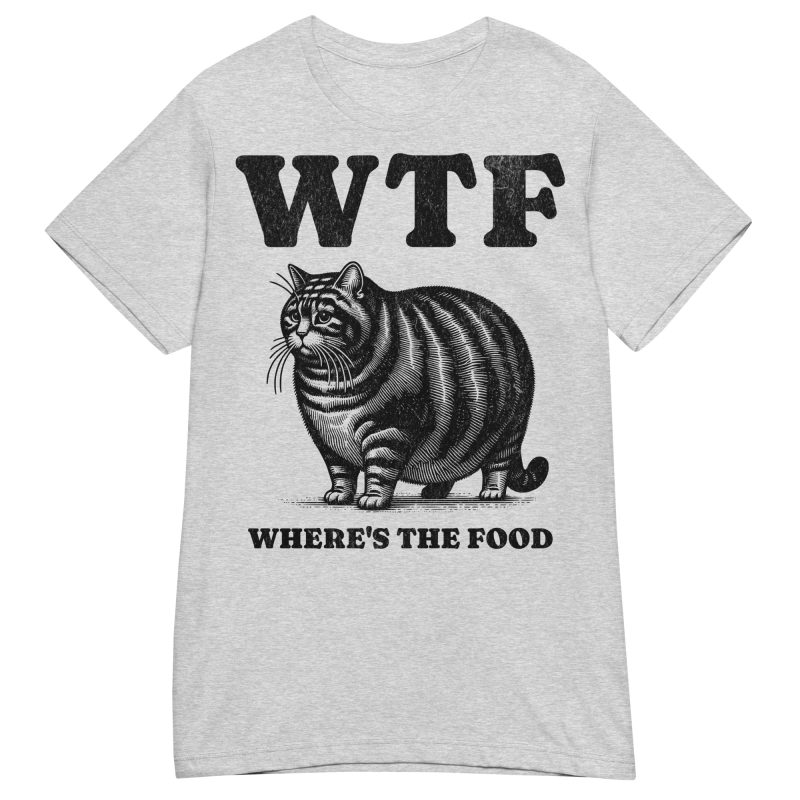 Semi-fitted t-shirt dekorerad med en stor katt och texten ’WTF – Where’s the food’ som tryck på framsidan. Passar perfekt till alla kvinnor som älskar att äta. Välj mellan nio olika färger.