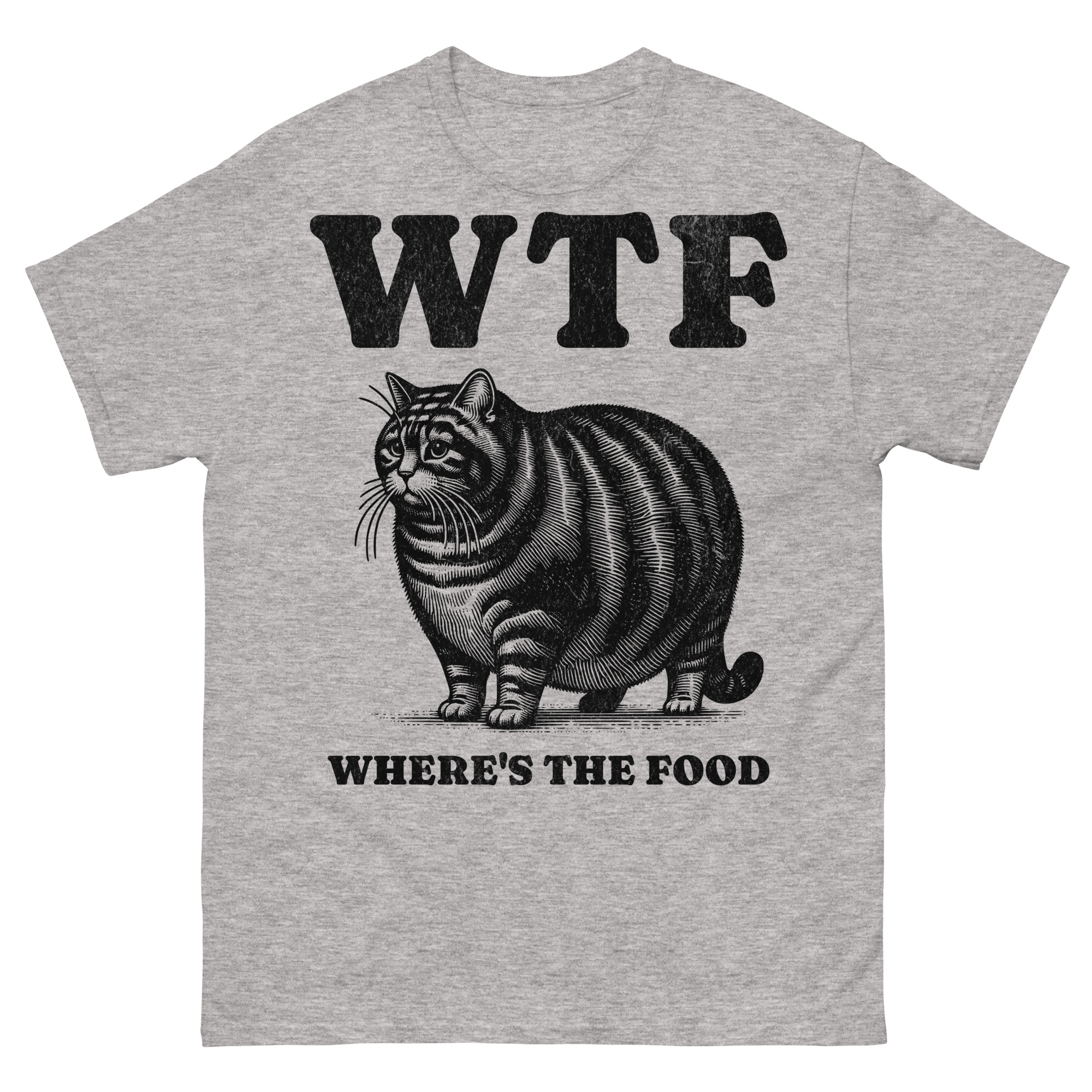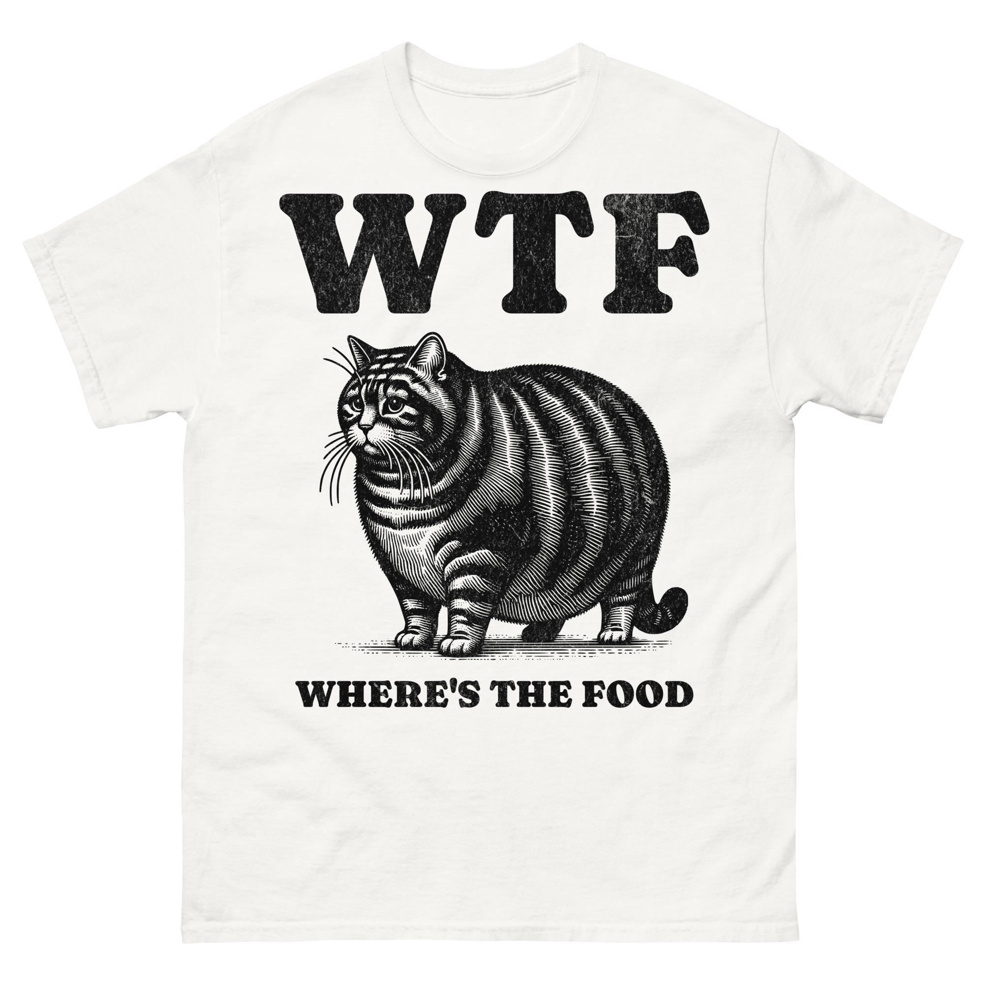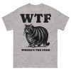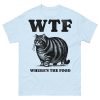 T-shirt dekorerad med en stor katt och texten ’WTF – Where’s the food’ som tryck på framsidan. Passar perfekt till alla oss som älskar att äta. Välj mellan sex olika färger.