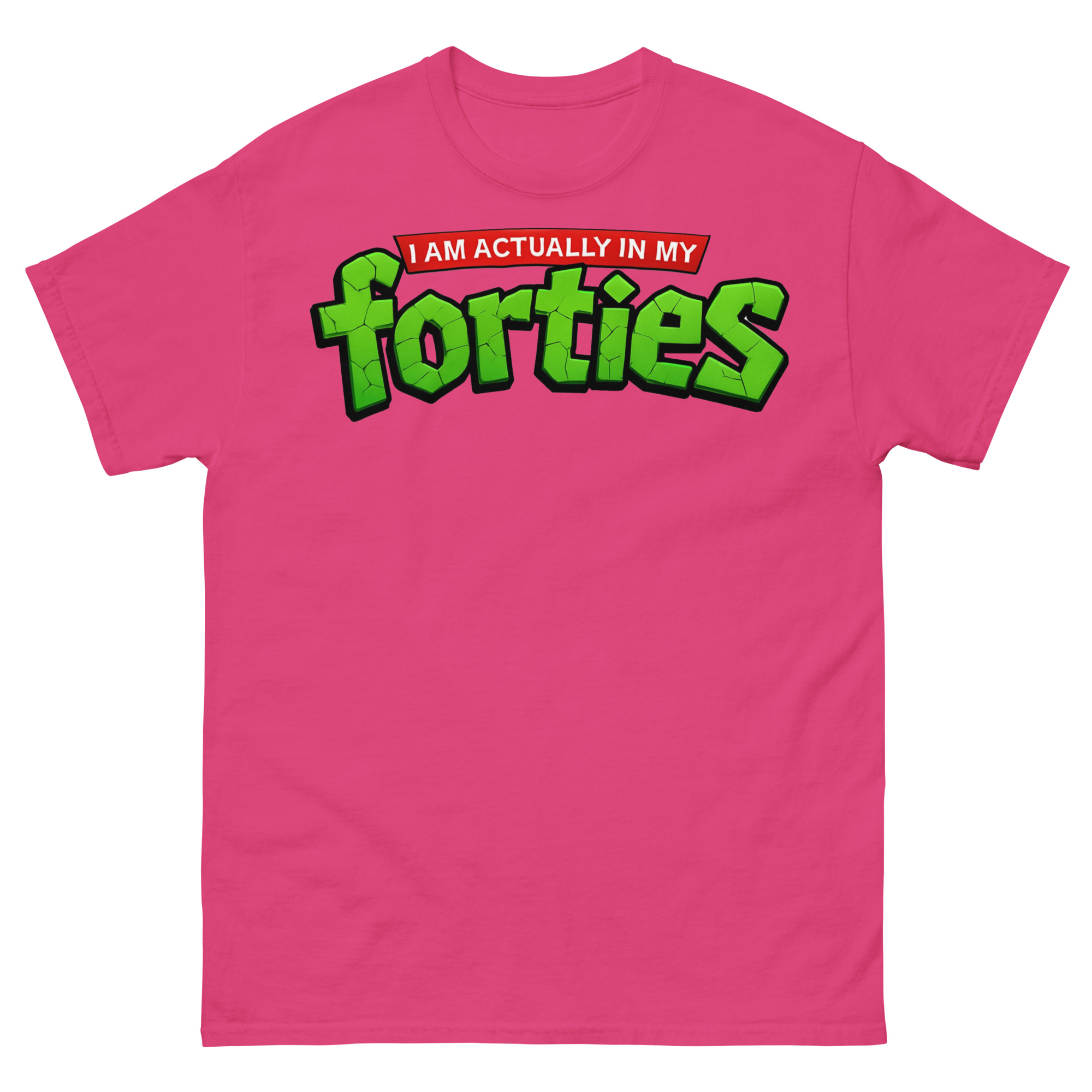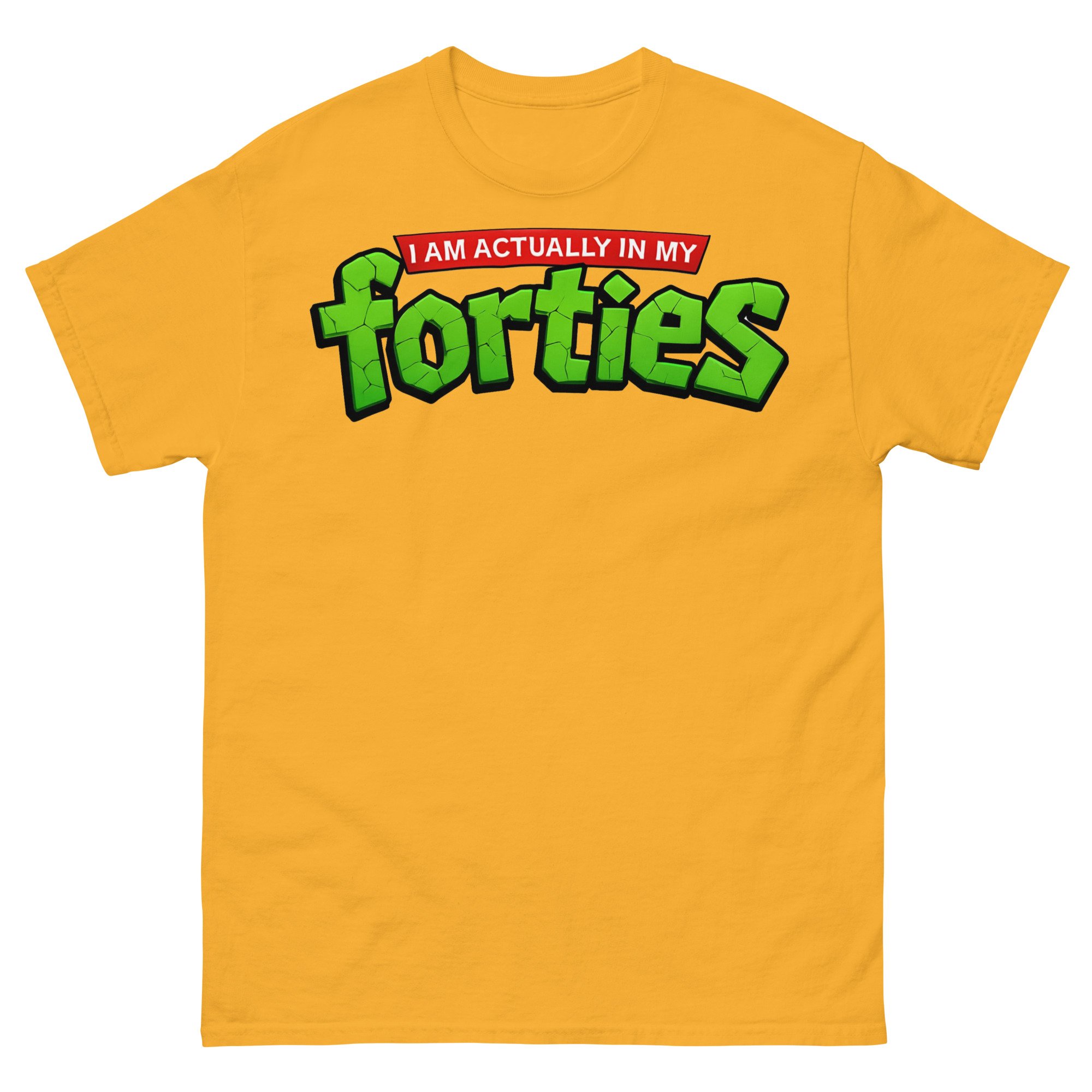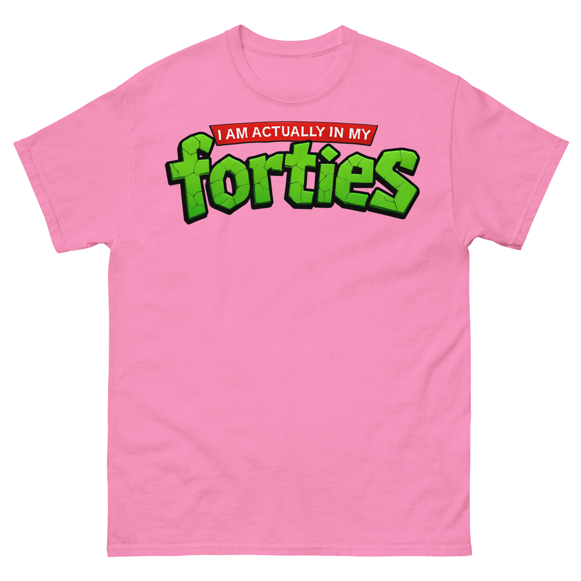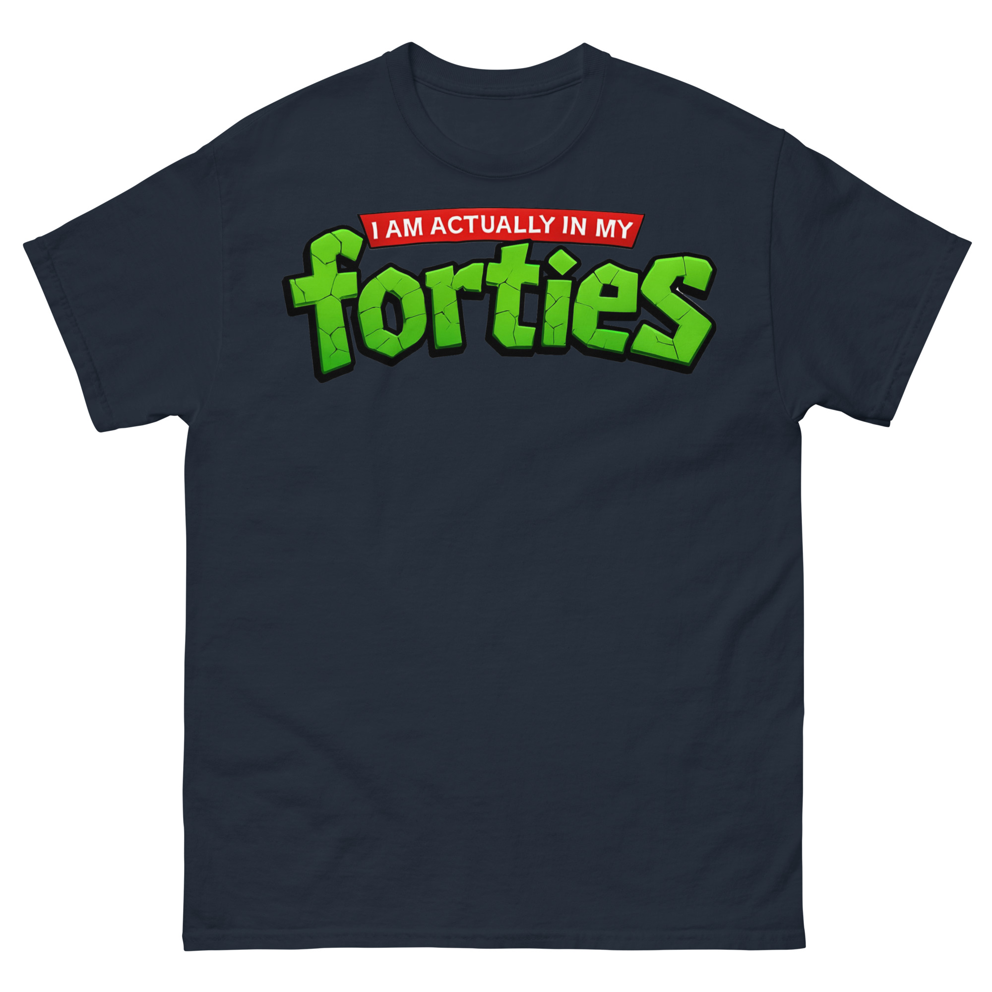 T-shirt dekorerad med ett retroinspirerat tryck med texten ’I am actually in my forties’ som tryck på framsidan. Passar perfekt till både kvinnor och män som passerat 40. Välj mellan 16 olika färger.