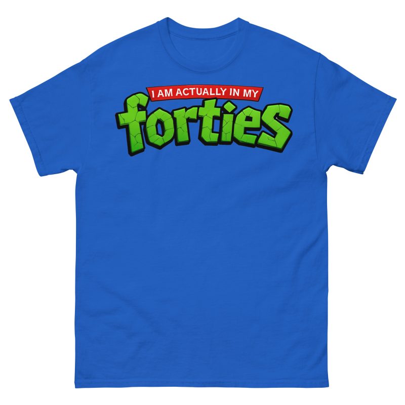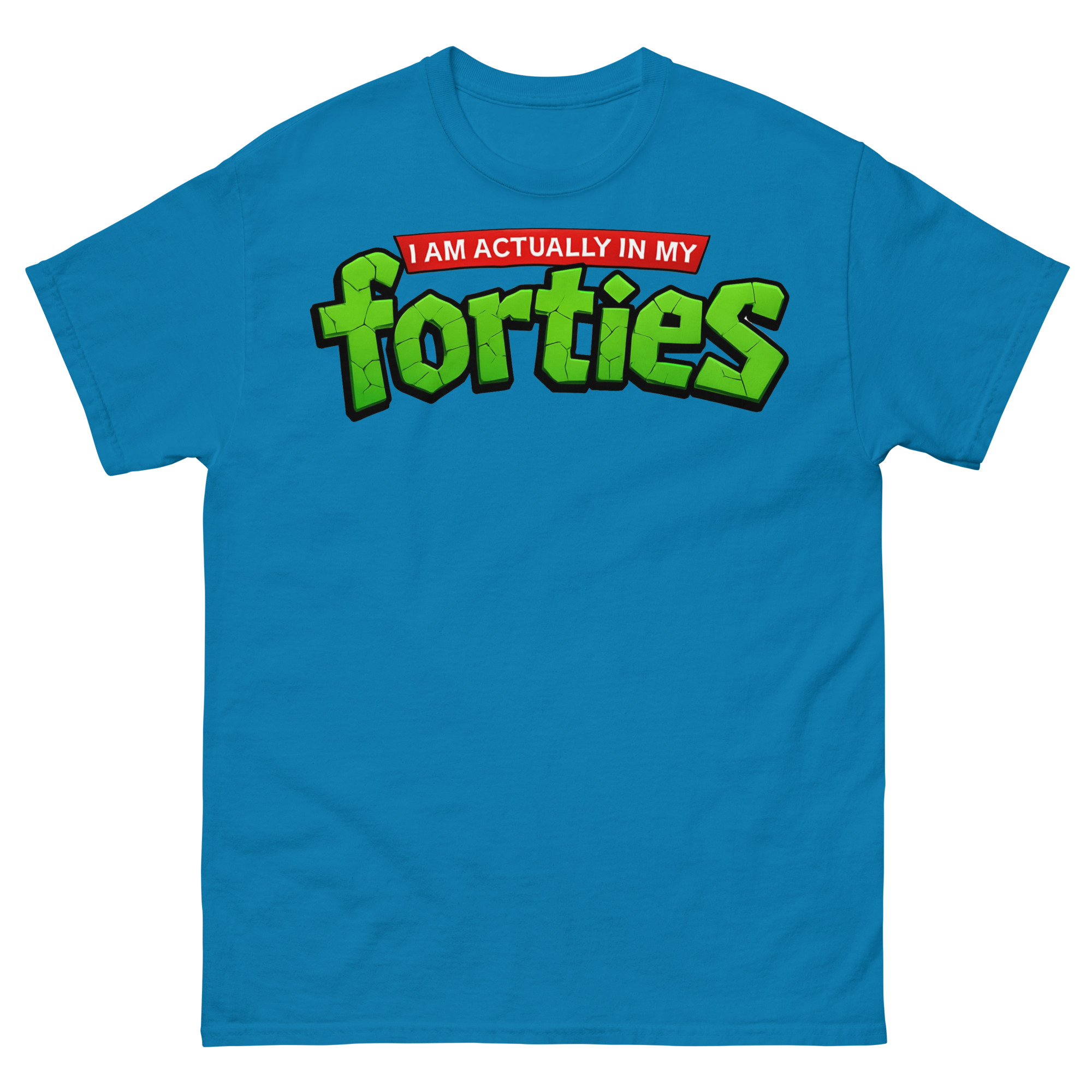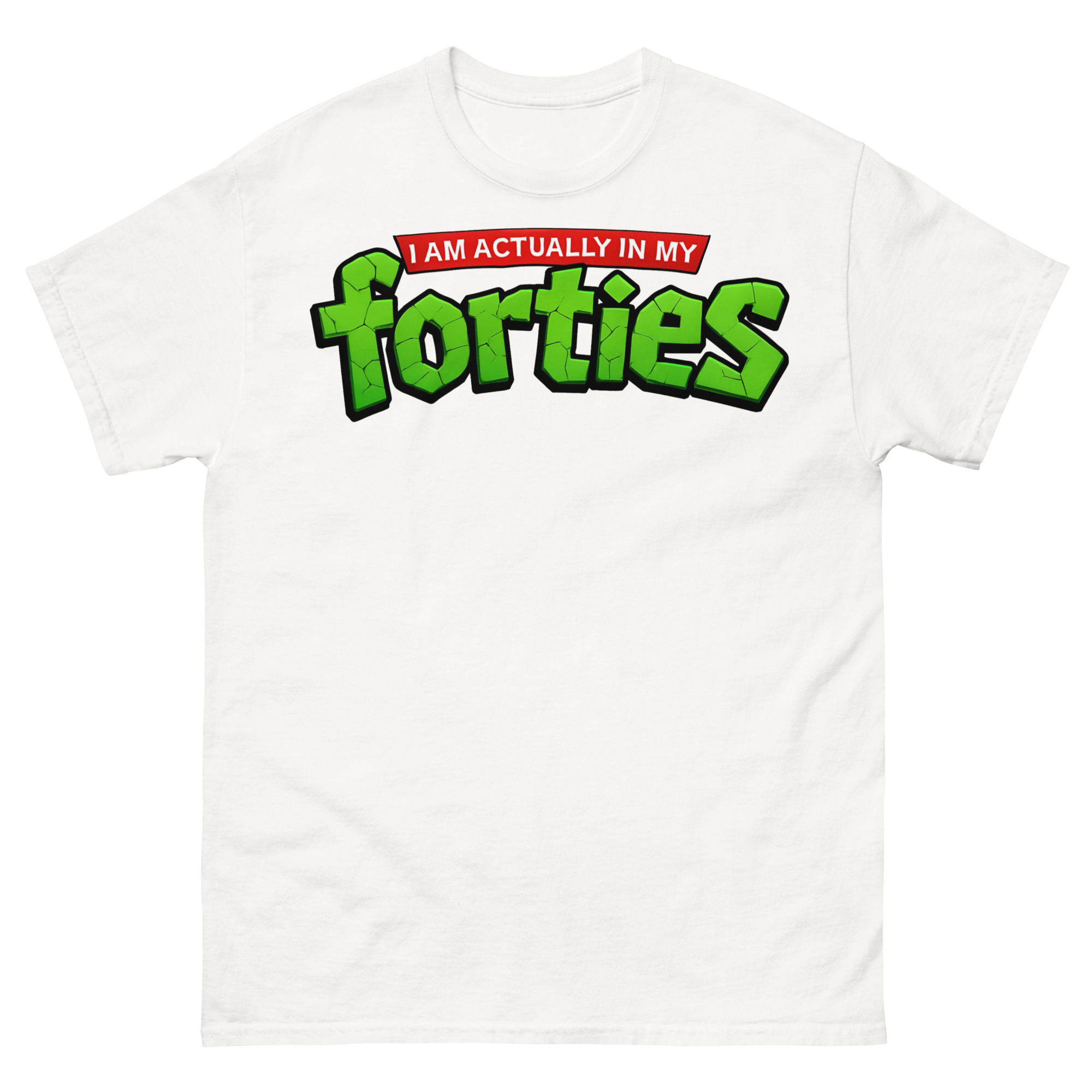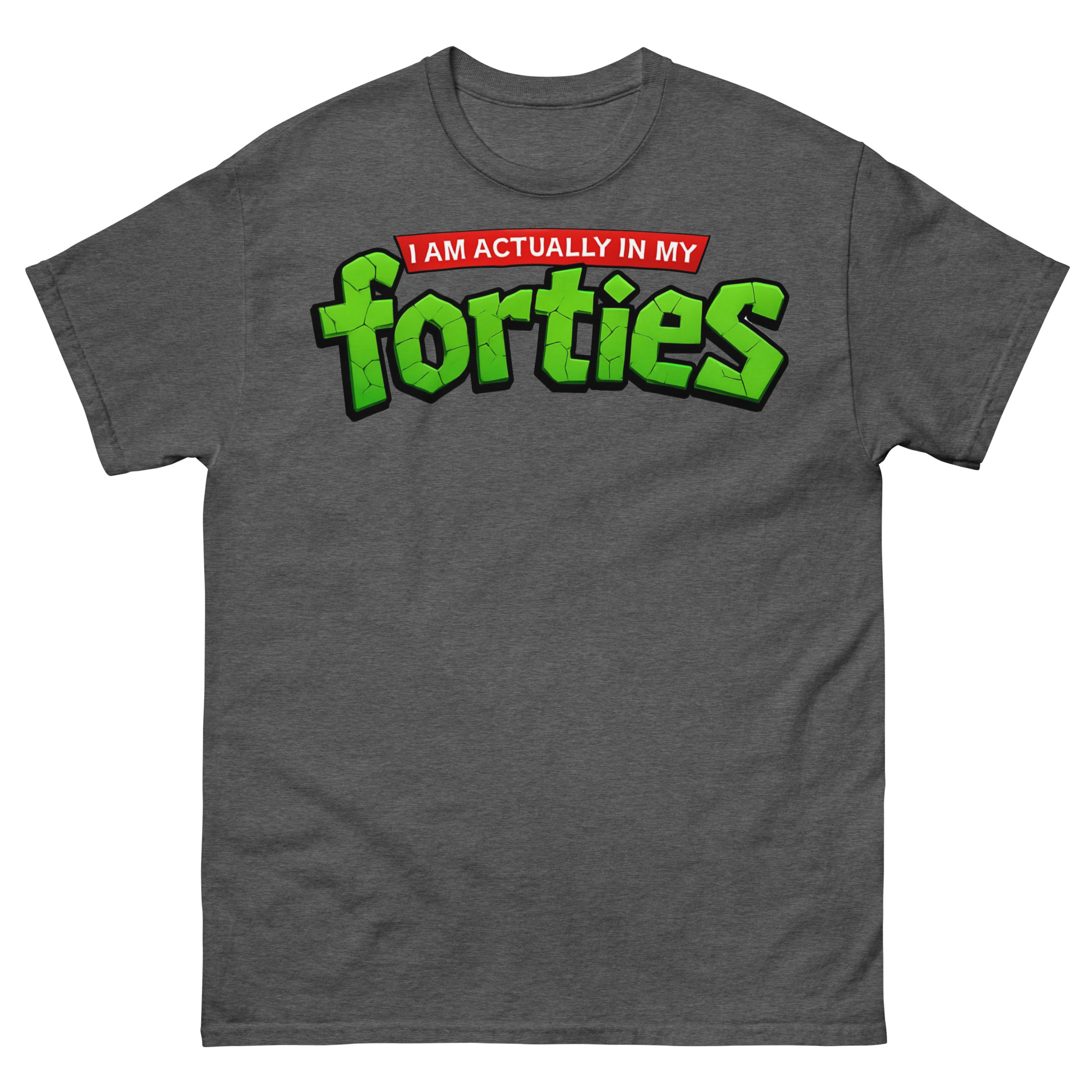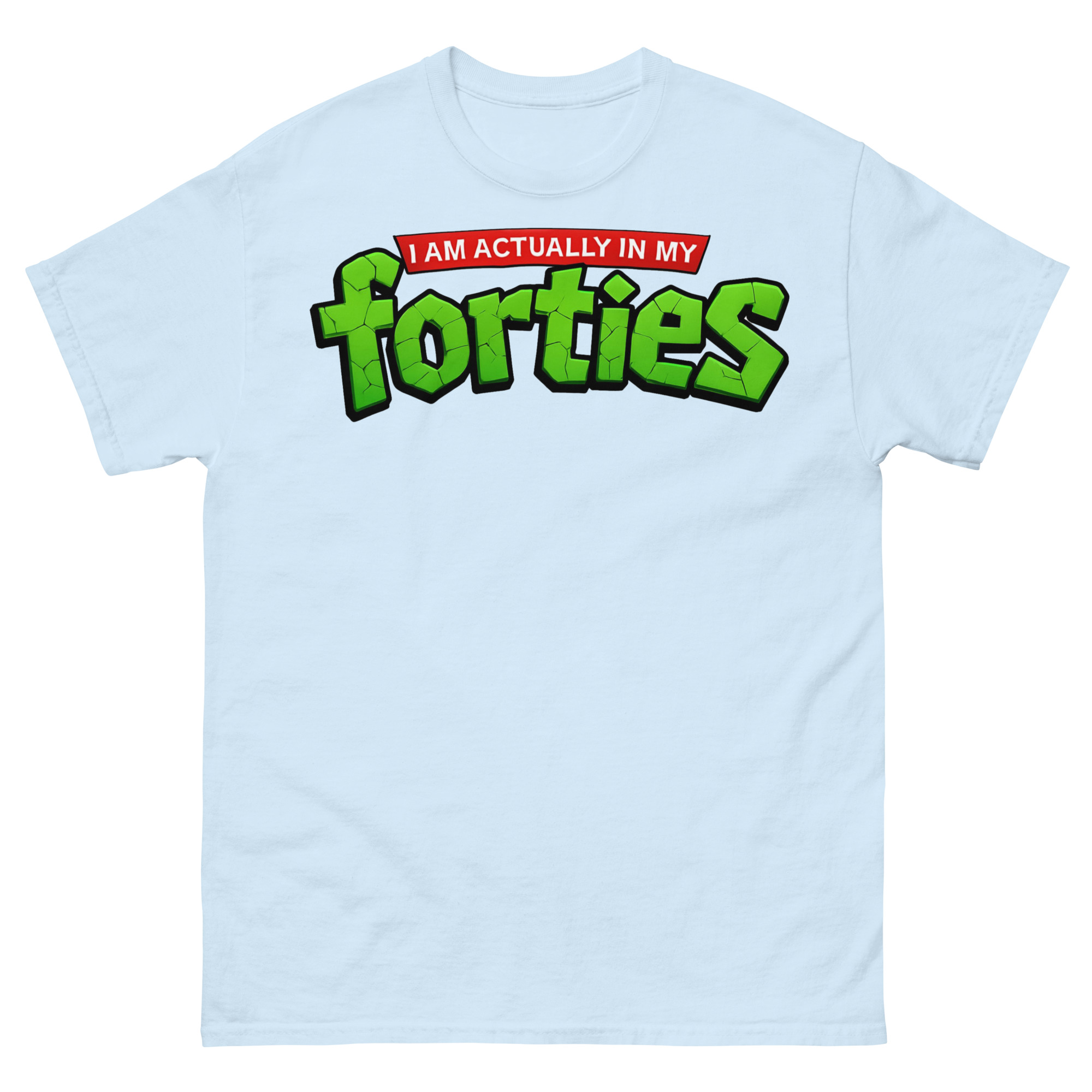 T-shirt dekorerad med ett retroinspirerat tryck med texten ’I am actually in my forties’ som tryck på framsidan. Passar perfekt till både kvinnor och män som passerat 40. Välj mellan 16 olika färger.