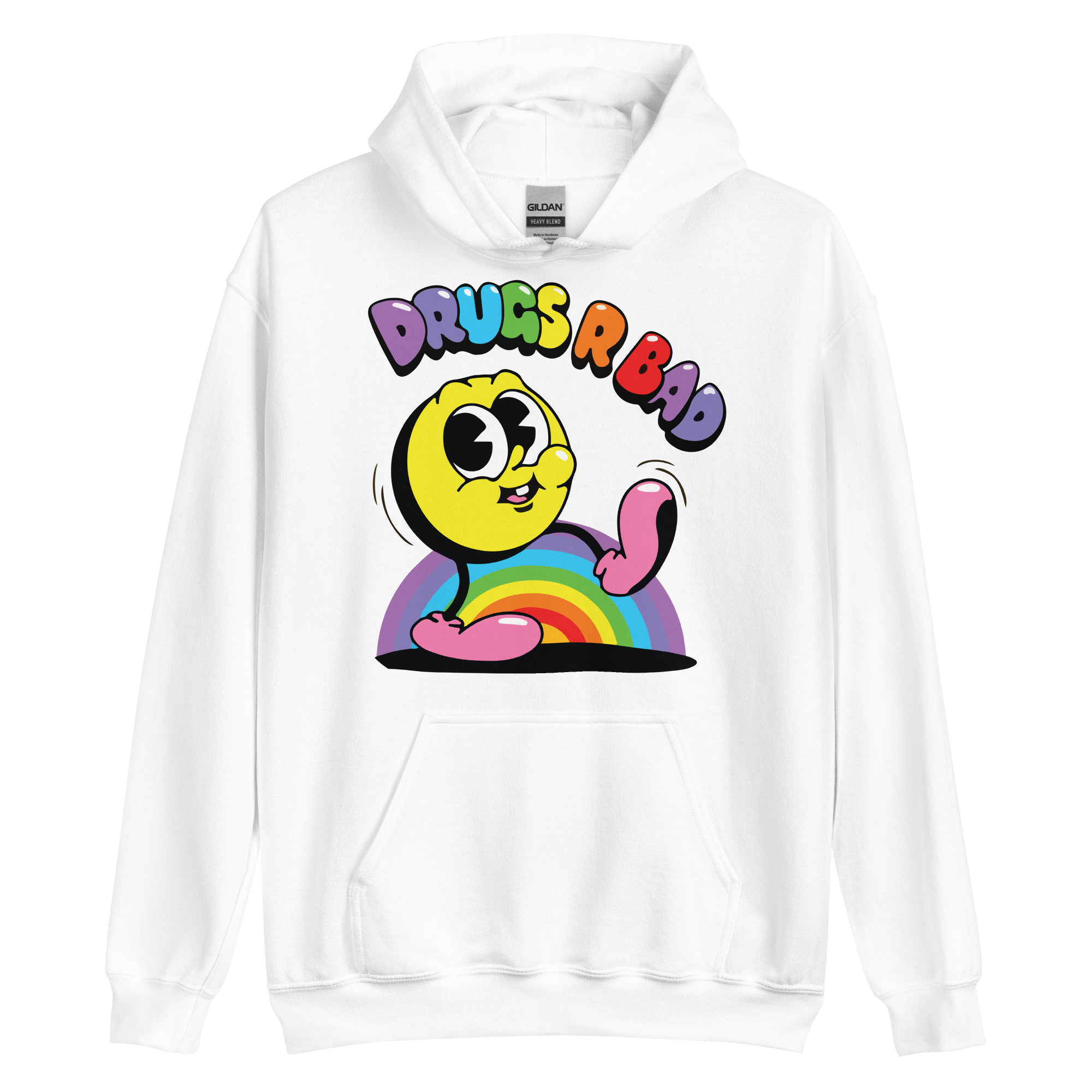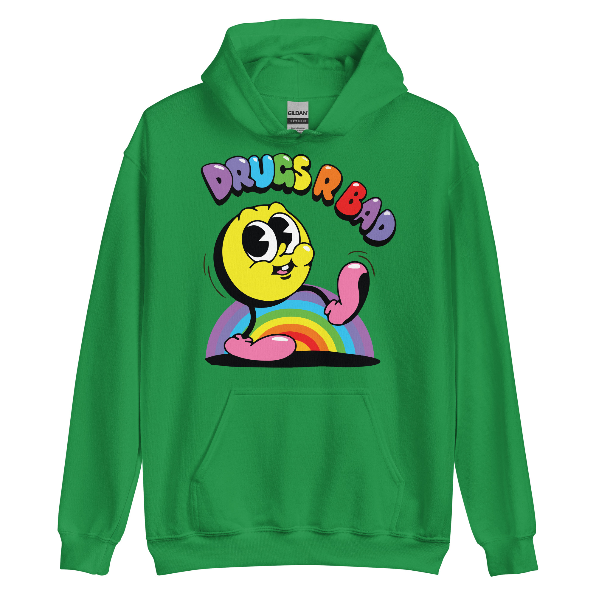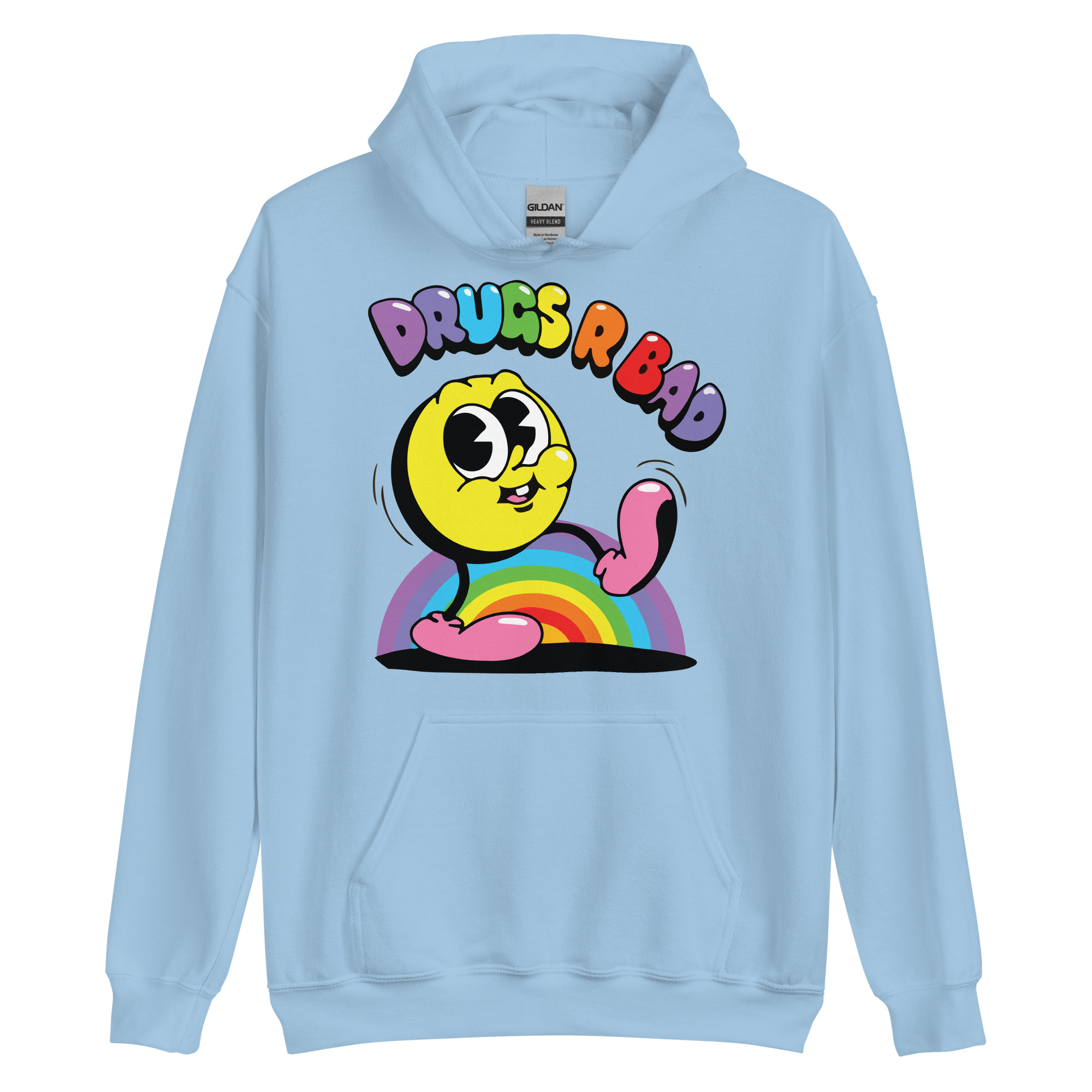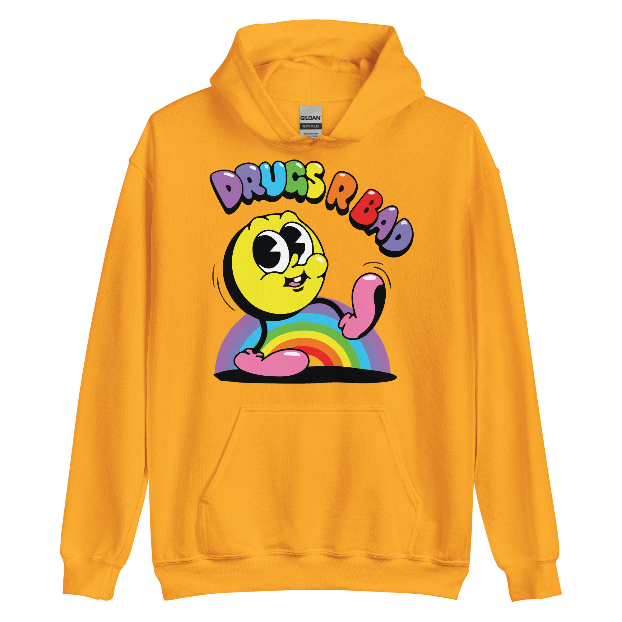 Snygg hoodie med en gul figur och texten ’Drugs r bad’ som tryck på framsidan. Hoodien finns i 14 olika färger och passar män och kvinnor som tycker att droger är en dålig idé.