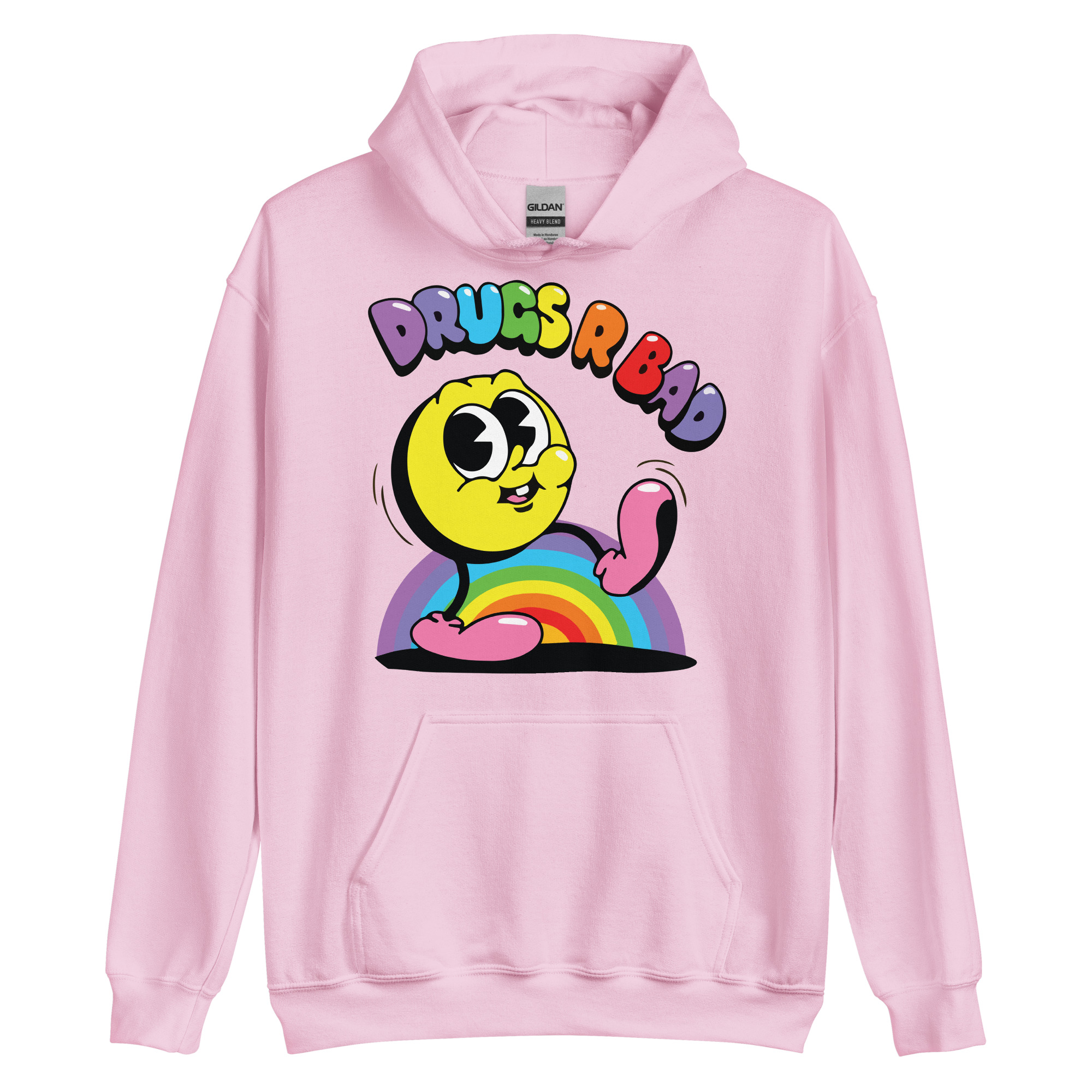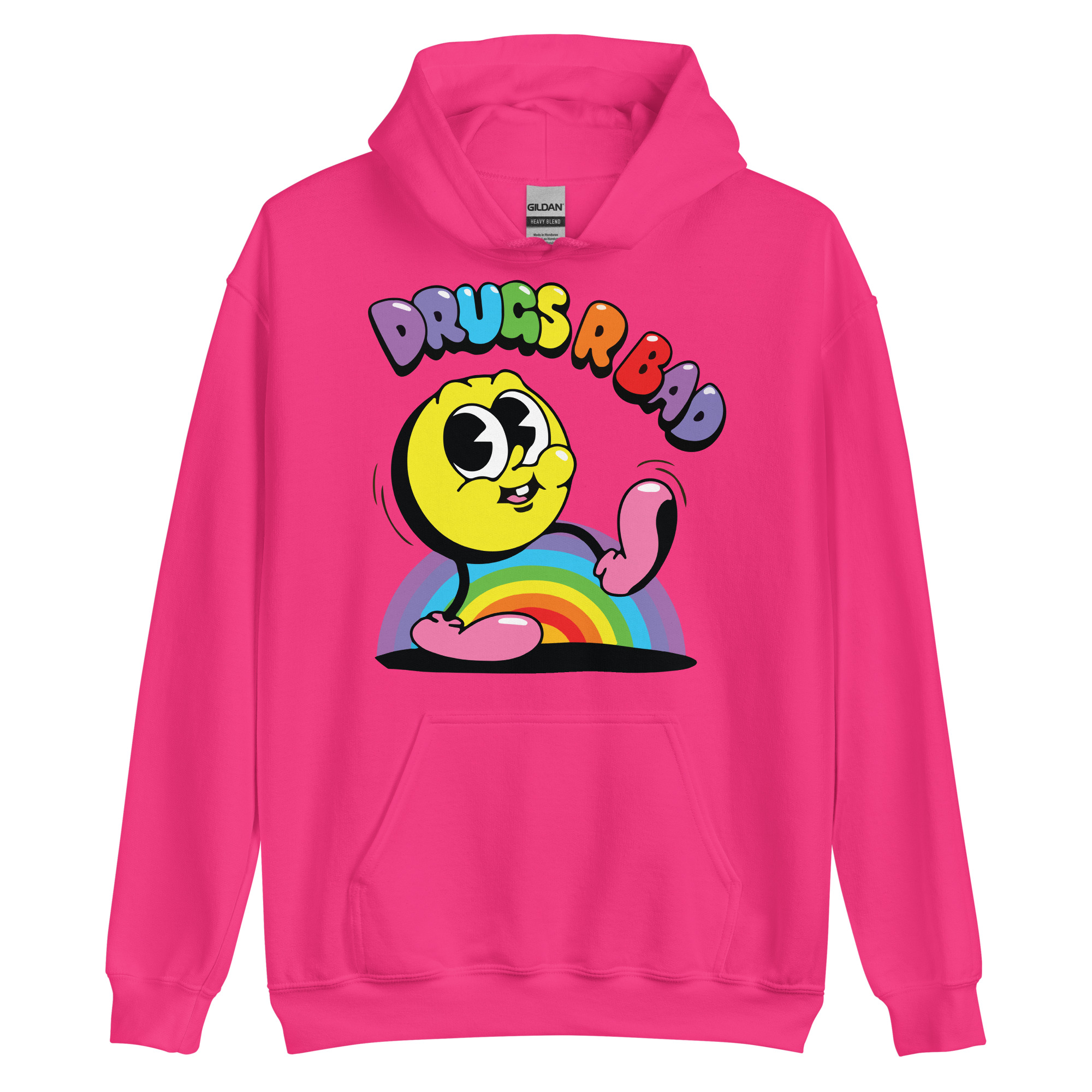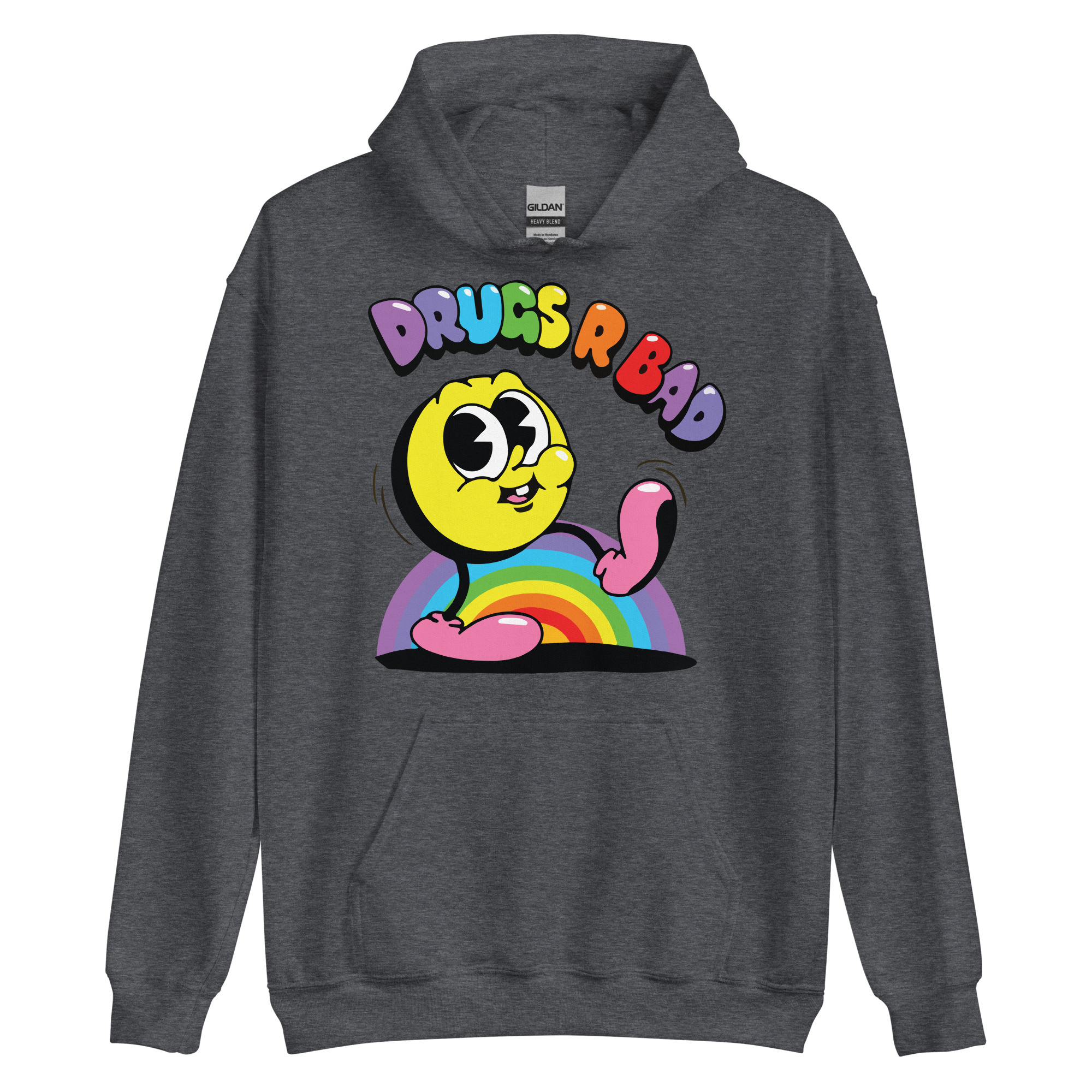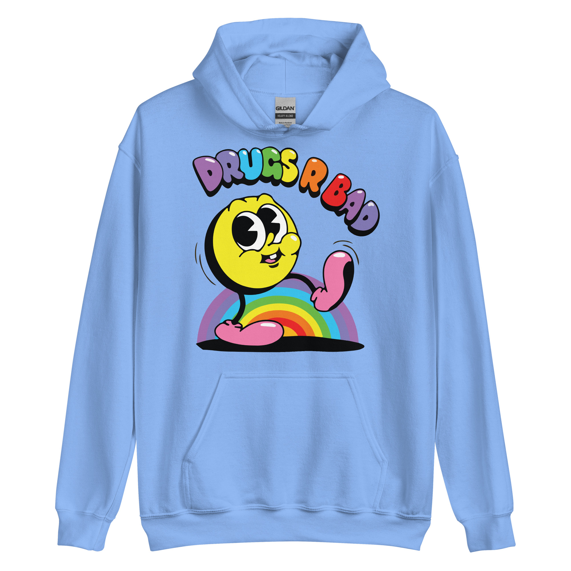 Snygg hoodie med en gul figur och texten ’Drugs r bad’ som tryck på framsidan. Hoodien finns i 14 olika färger och passar män och kvinnor som tycker att droger är en dålig idé.