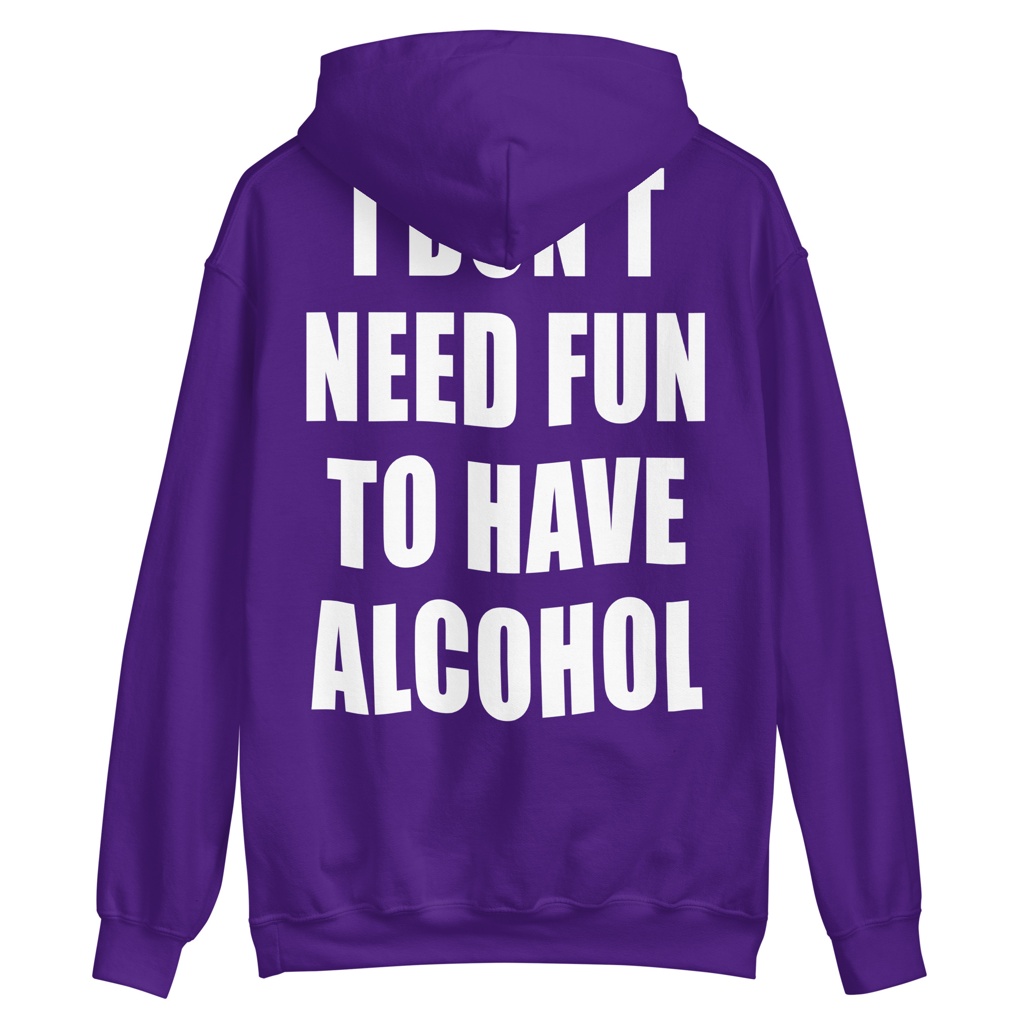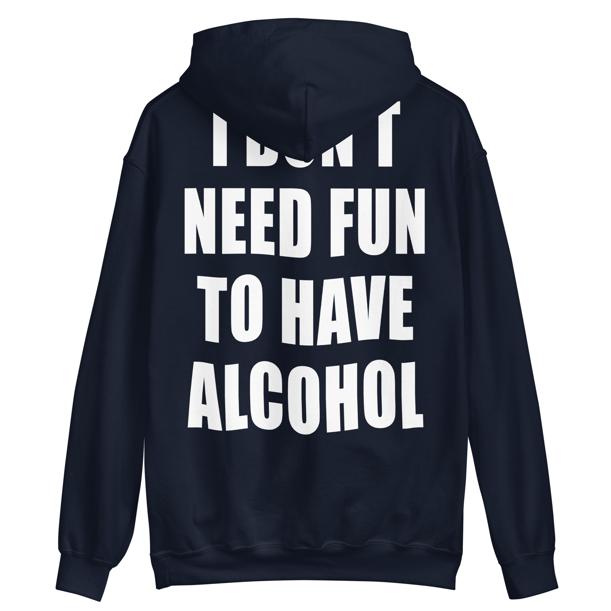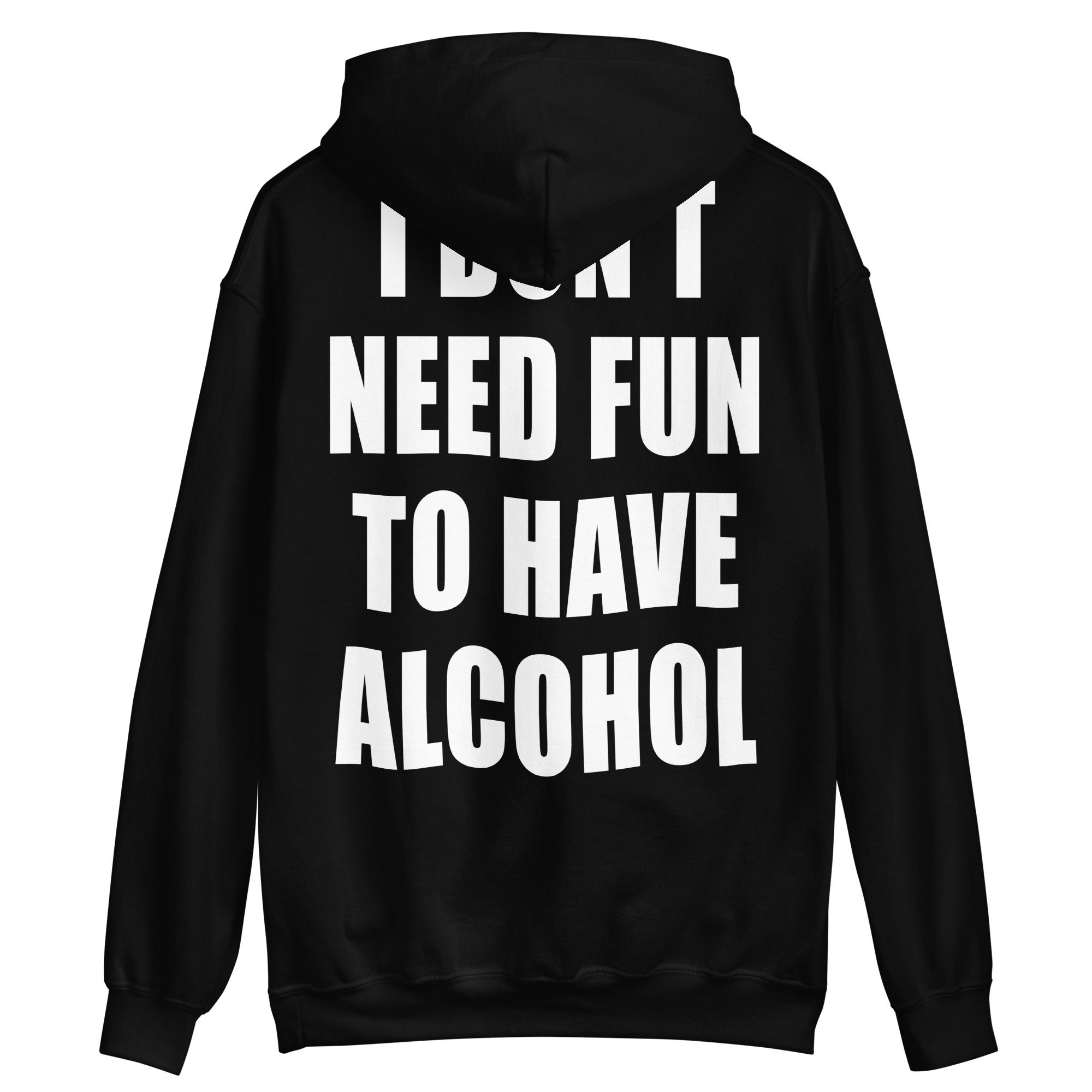 Hoodie dekorerad med texten ’I don’t need fun to have alcohol’ som ryggtryck. Välj mellan fem olika färger. Passar perfekt till både kvinnor och män.