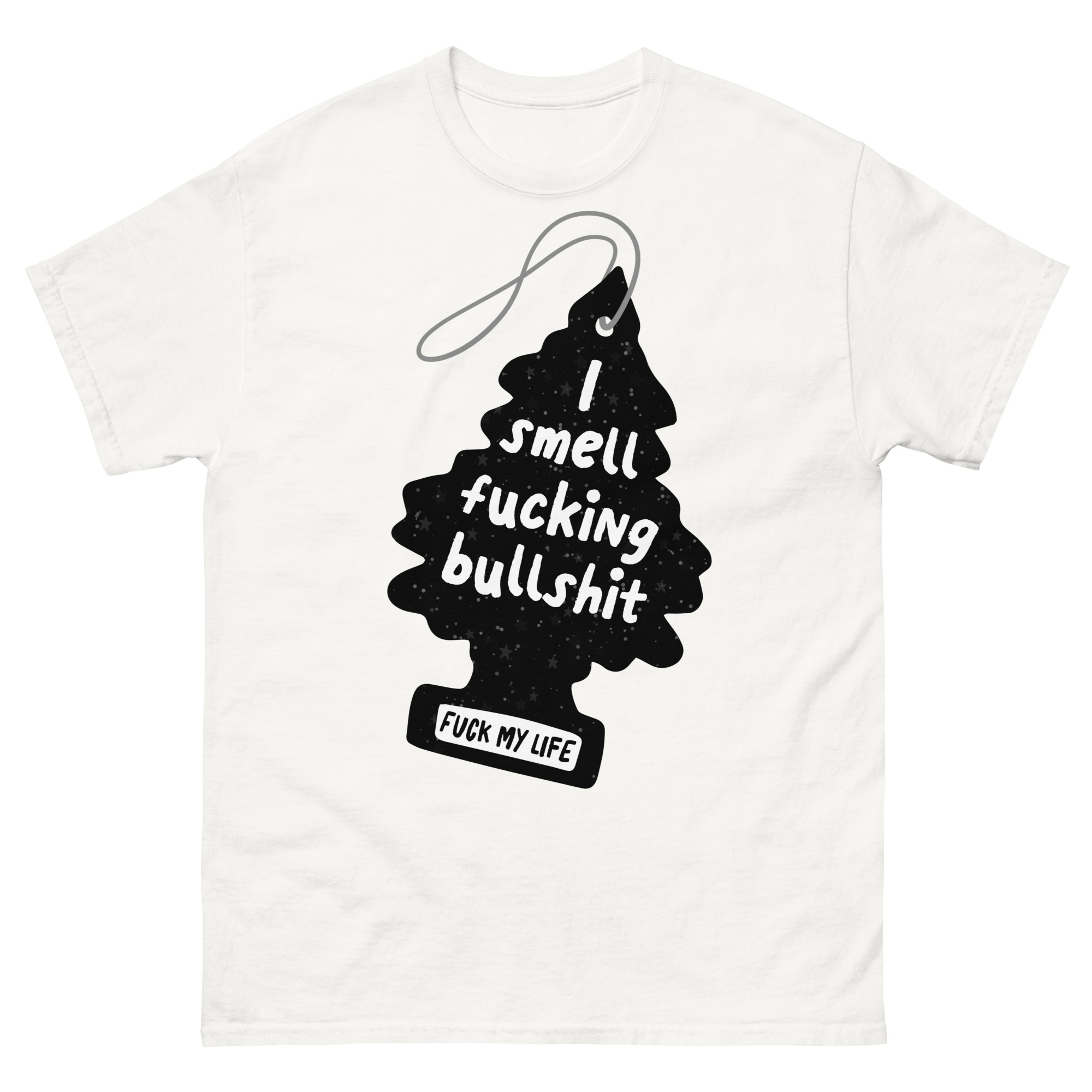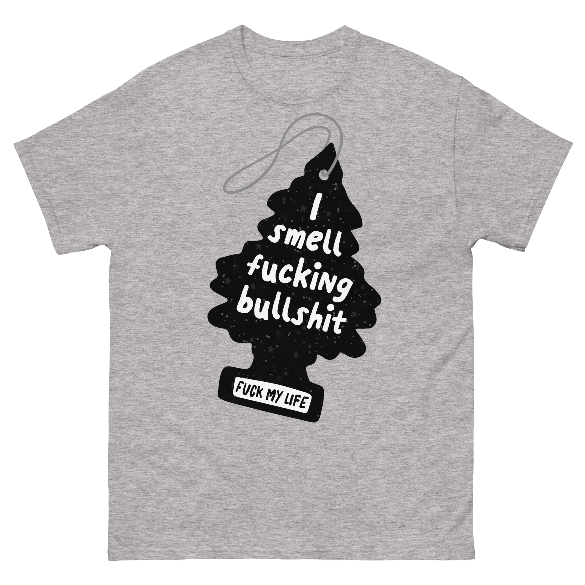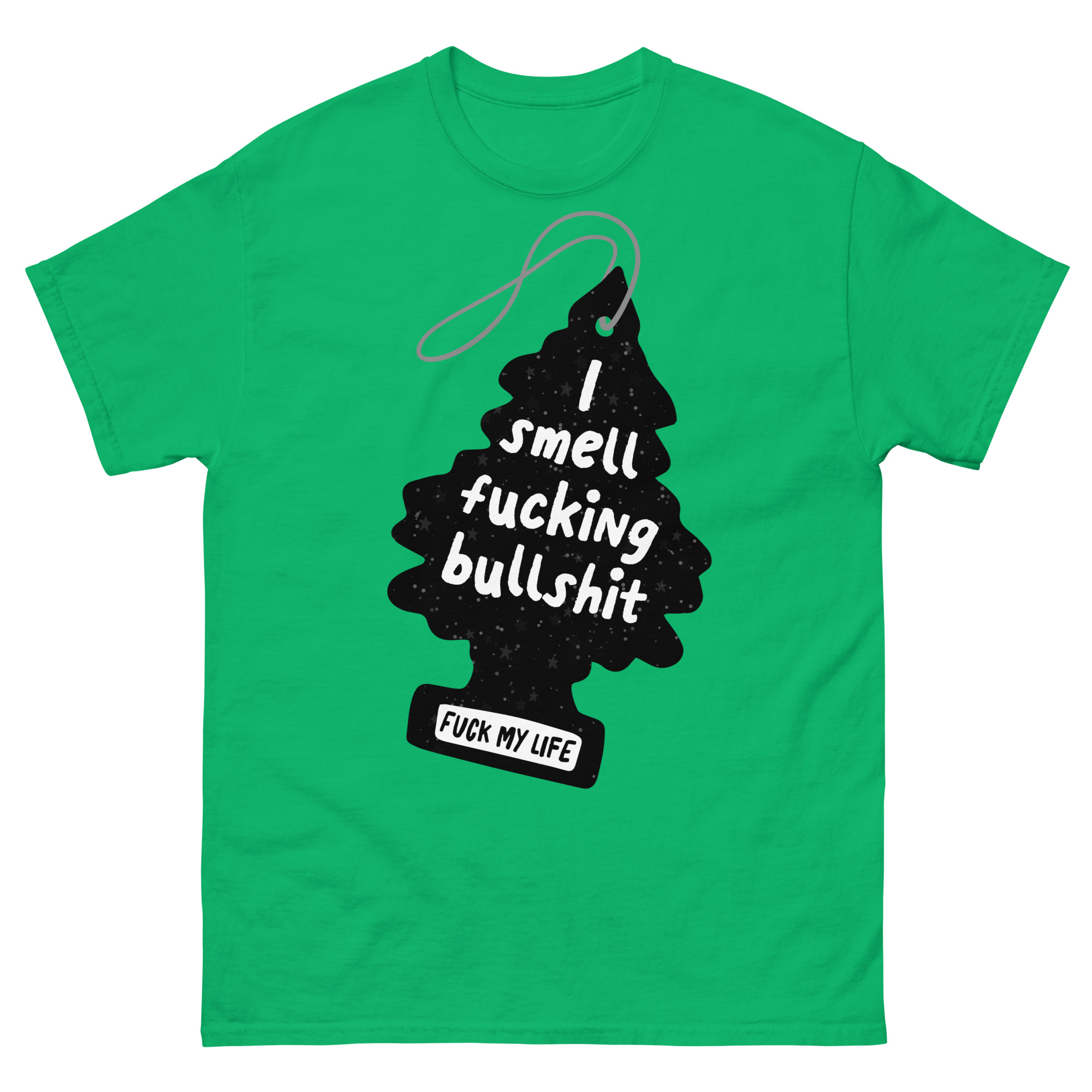 T-shirt dekorerad med en svart doftgran med texten ’I smell fucking bullshit’ som dekoration på framsidan. Passar alla män och kvinnor som älskar humoristiska tryck. Du kan välja mellan 14 olika färger.