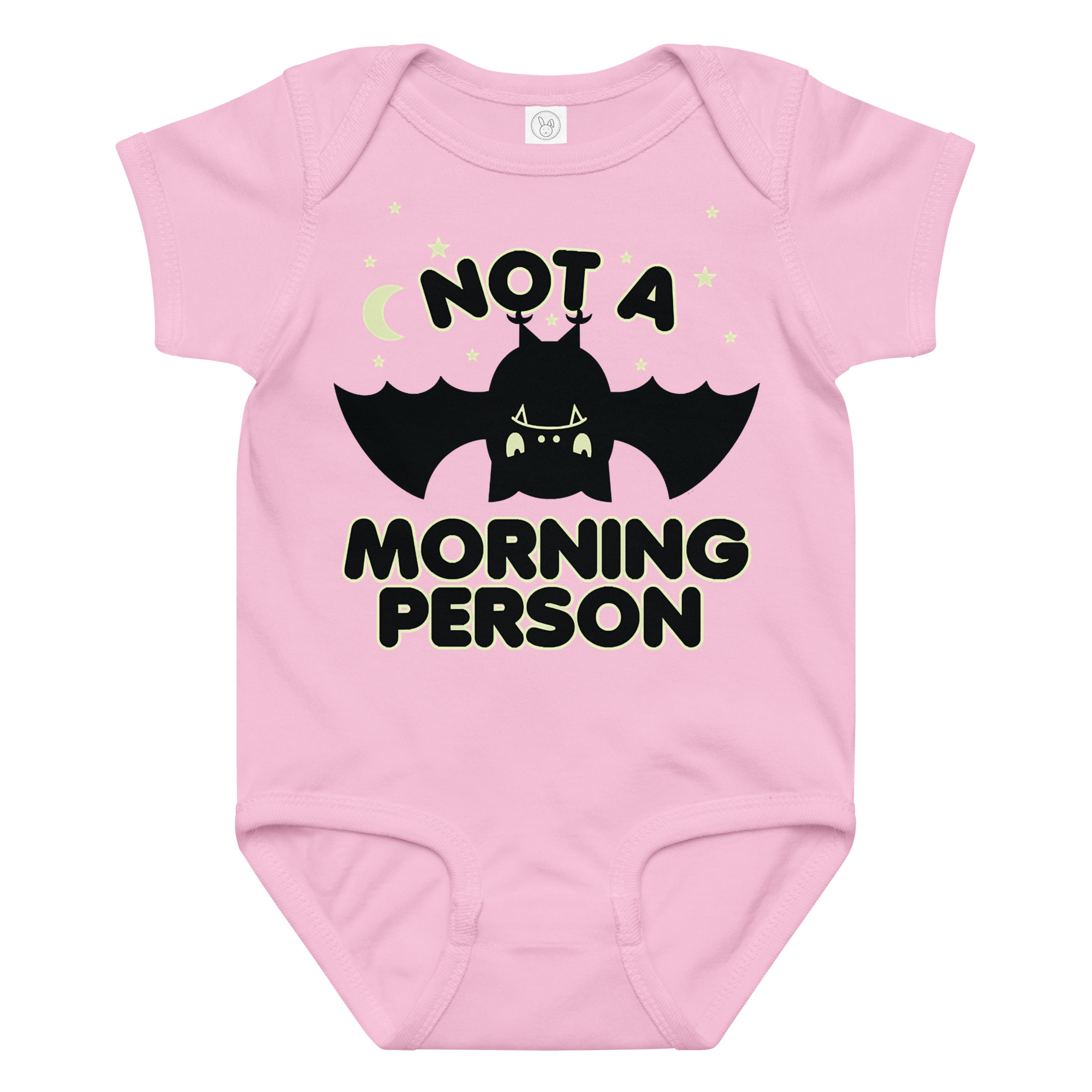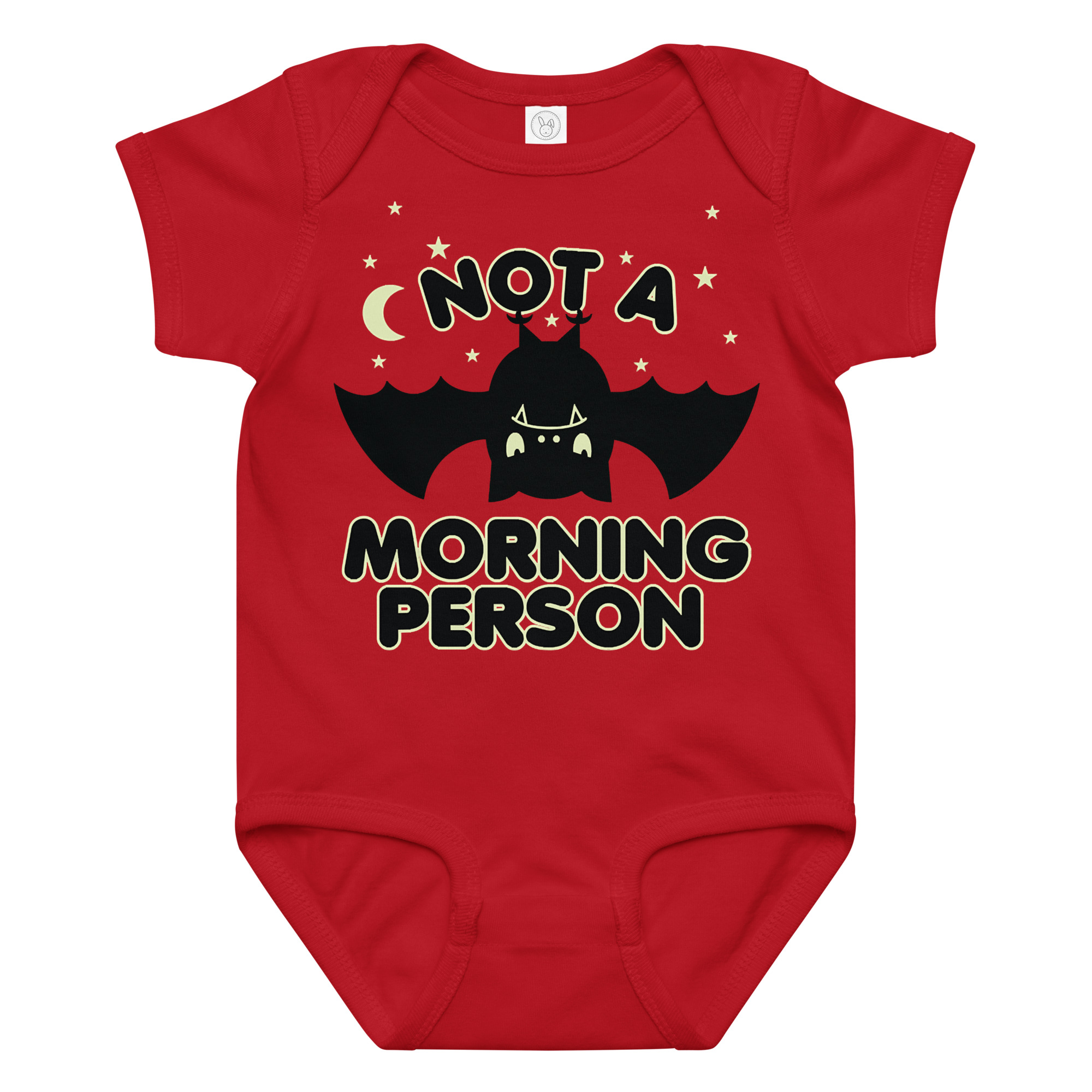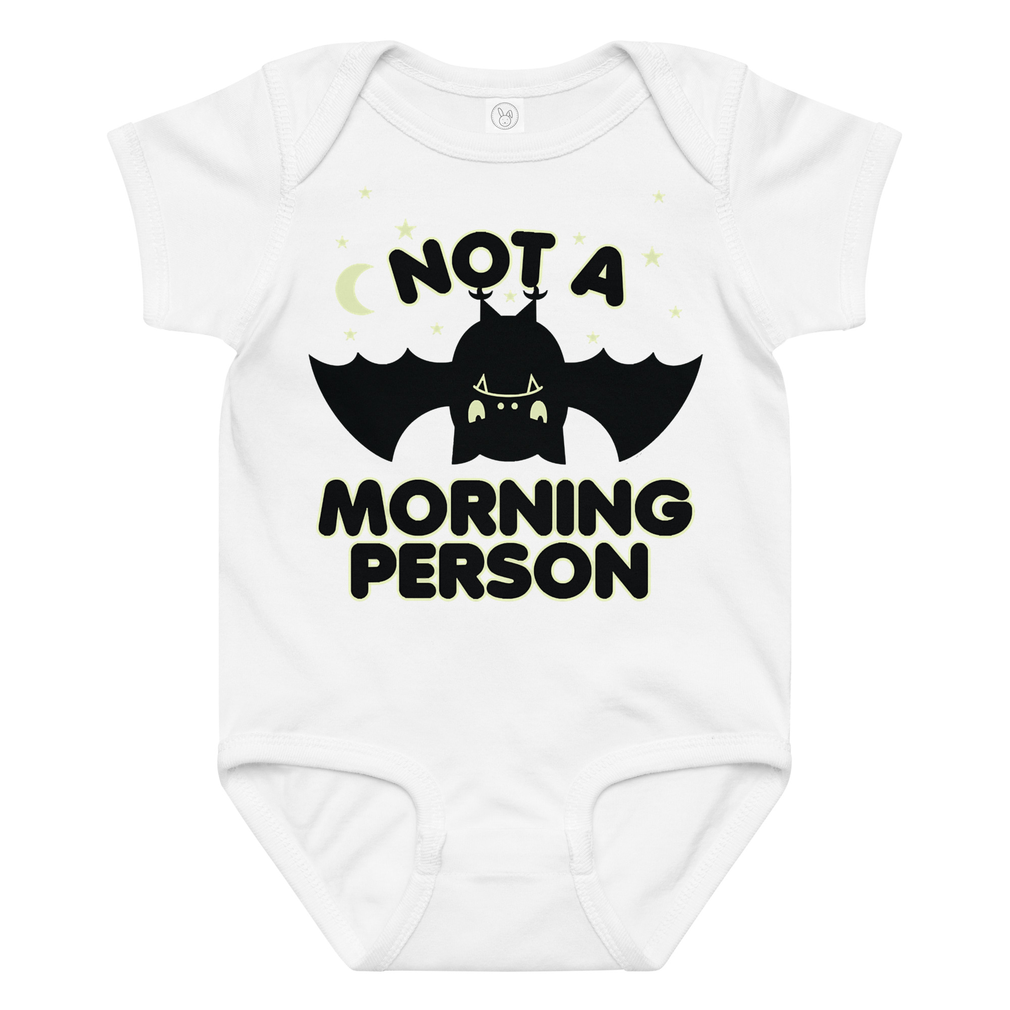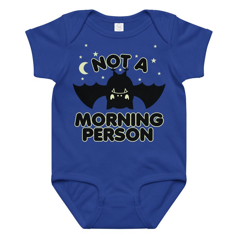 Baby-body med en trött fladdermus och texten ’Not a morning person’ som tryck på framsidan. Tillverkad i ringspunnen och kammad bomull i en riktigt fin kvalitet. Passar alla trötta bebisar.