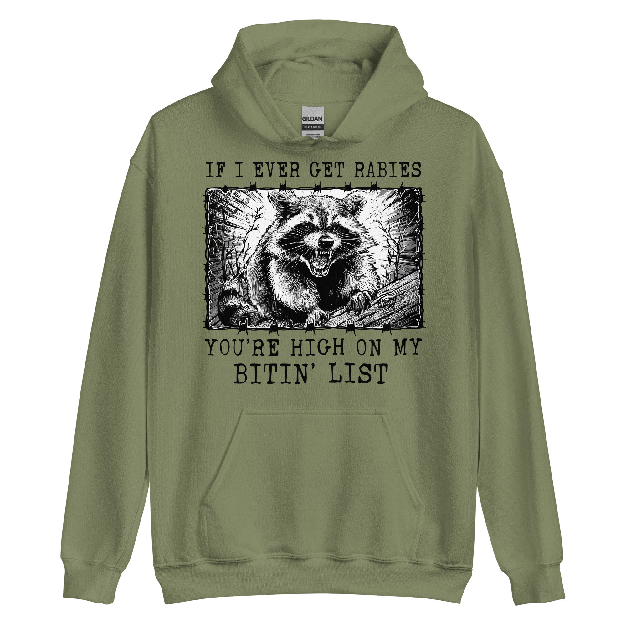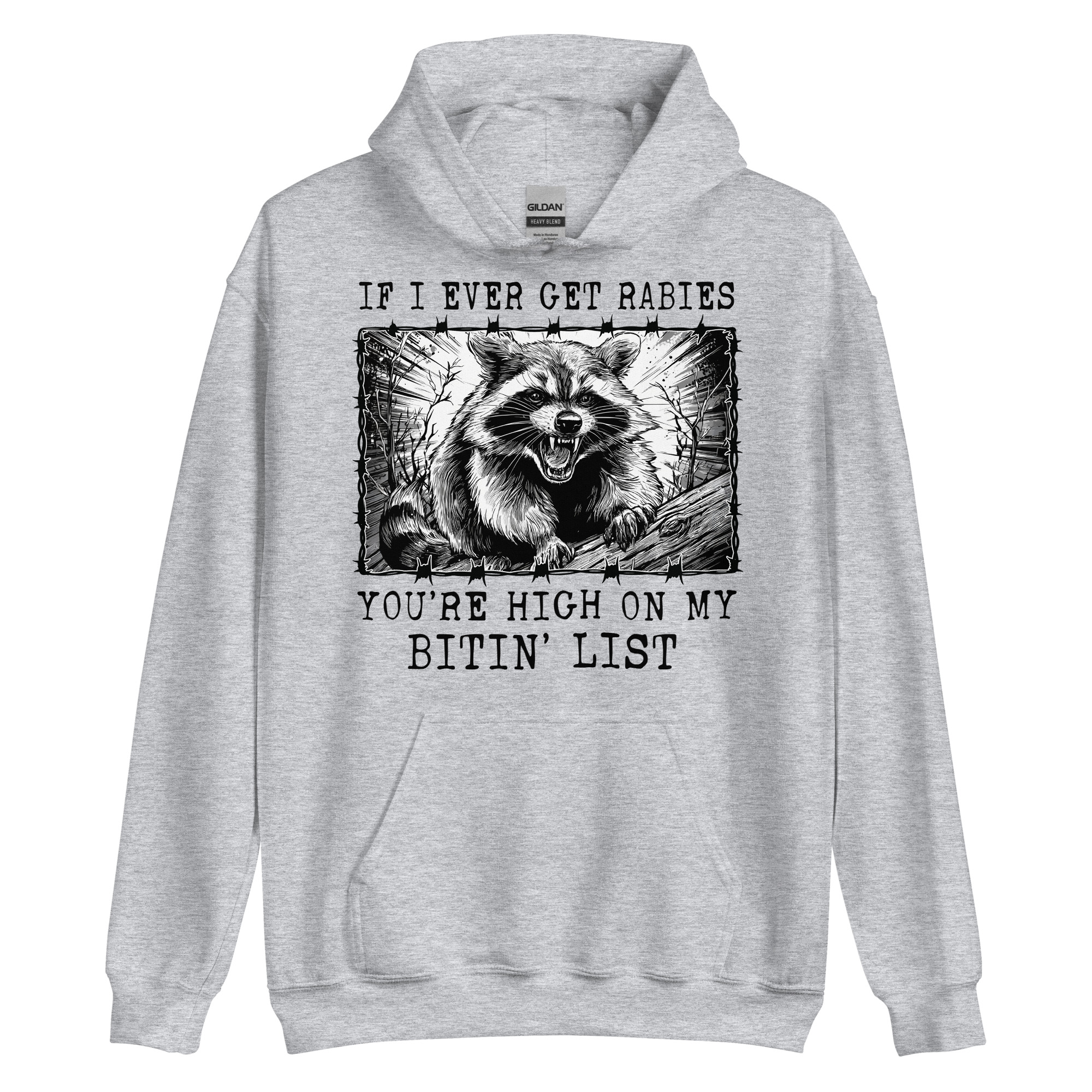 Hoodie dekorerad med en tvättbjörn och texten ’If I ever get rabies you’re high on my bitin’ list’ på framsidan. Tröjan finns i nio olika färger och passar både kvinnor och män perfekt.