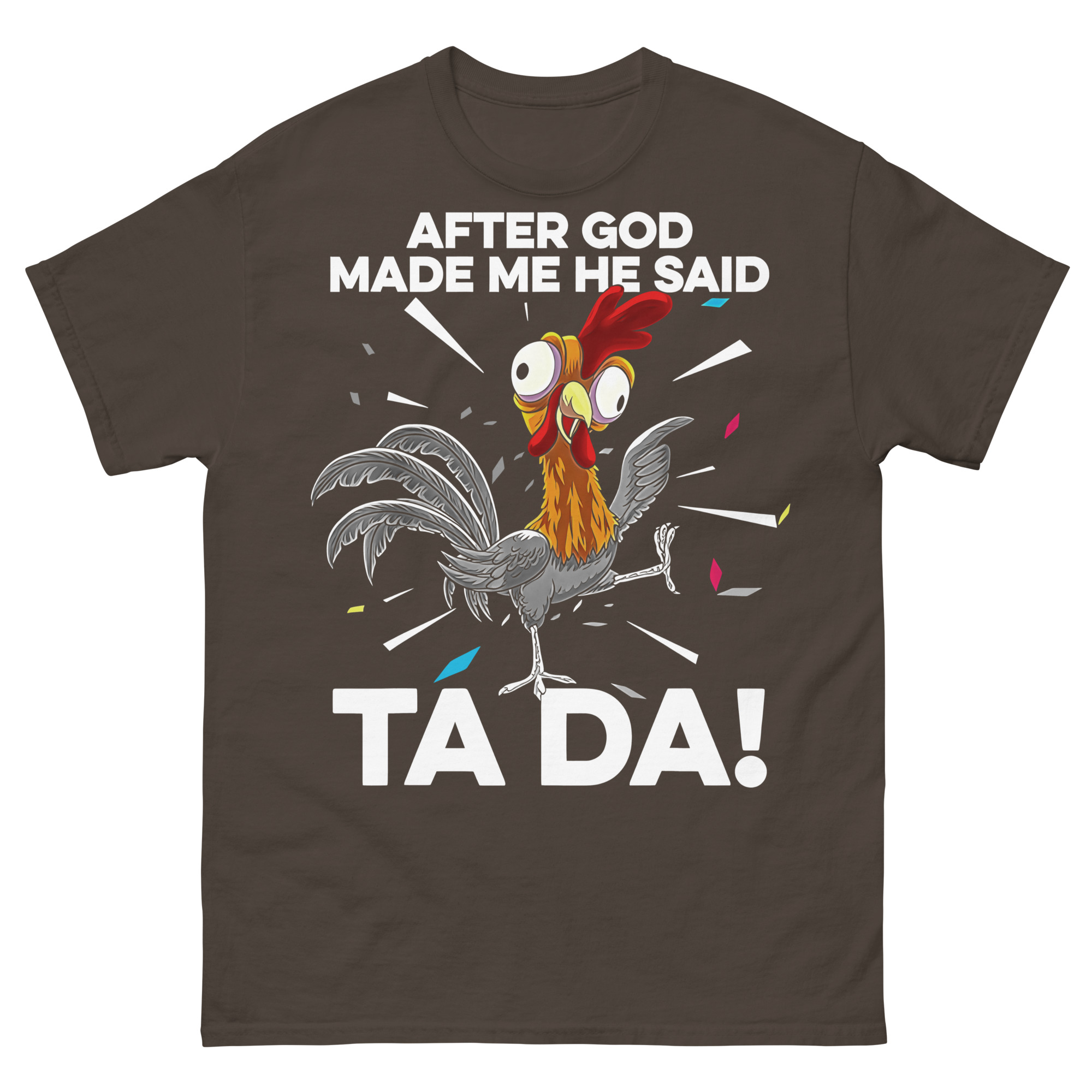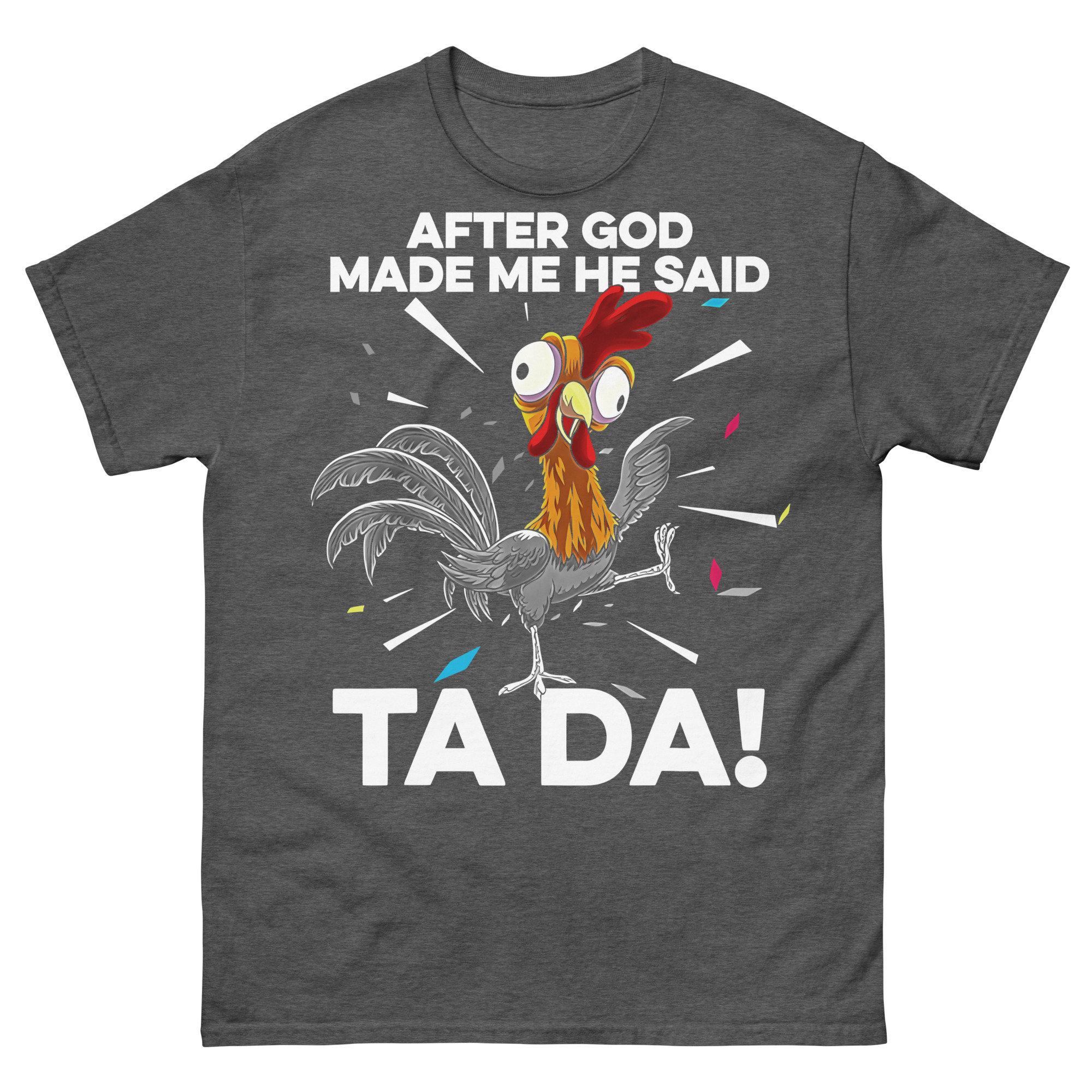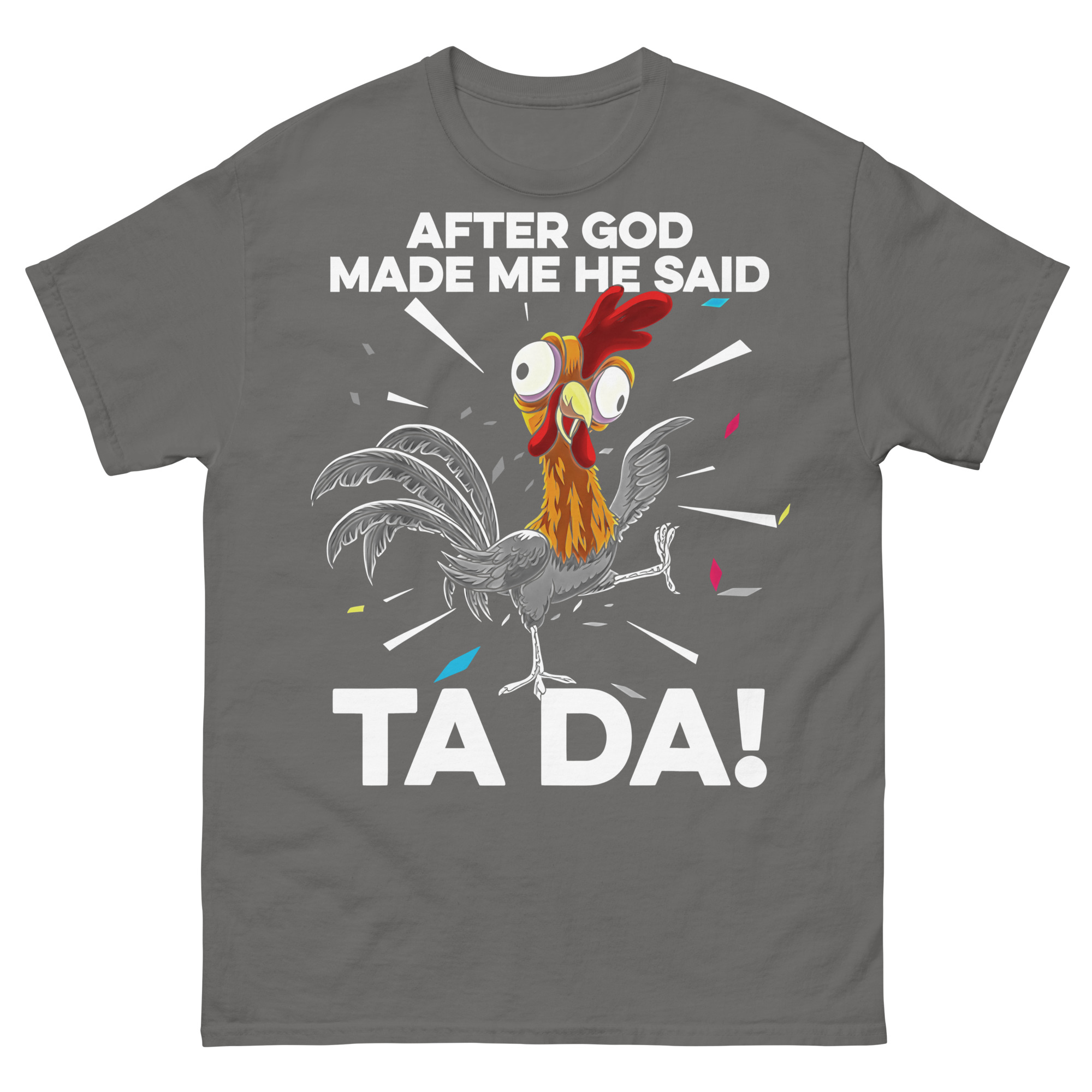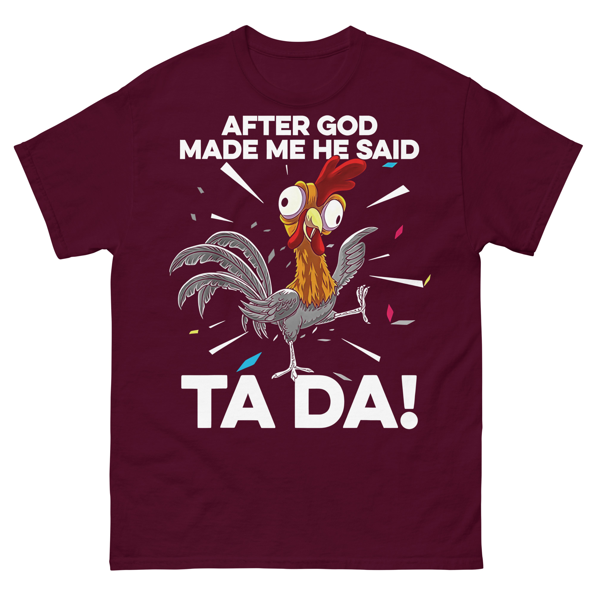 Underbar t-shirt med en sliten tupp och texten ’After God made me he said TA DA!’ som tryck på framsidan. Finns i sju olika färger och passar alla som känner sig perfekt skapade.