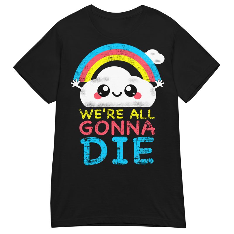 Vi ÄLSKAR övertydliga budskap! Skön semi-fitted t-shirt dekorerad med ett otroligt sött moln, en regnbåge och den oväntade texten ’We’re all gonna die’. Finns i fyra olika snygga färger. Passar alla kvinnor som älskar mörk humor.