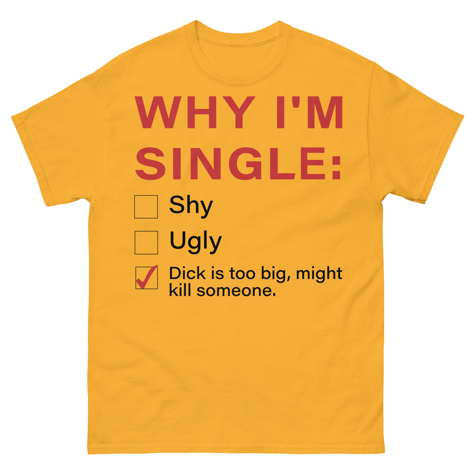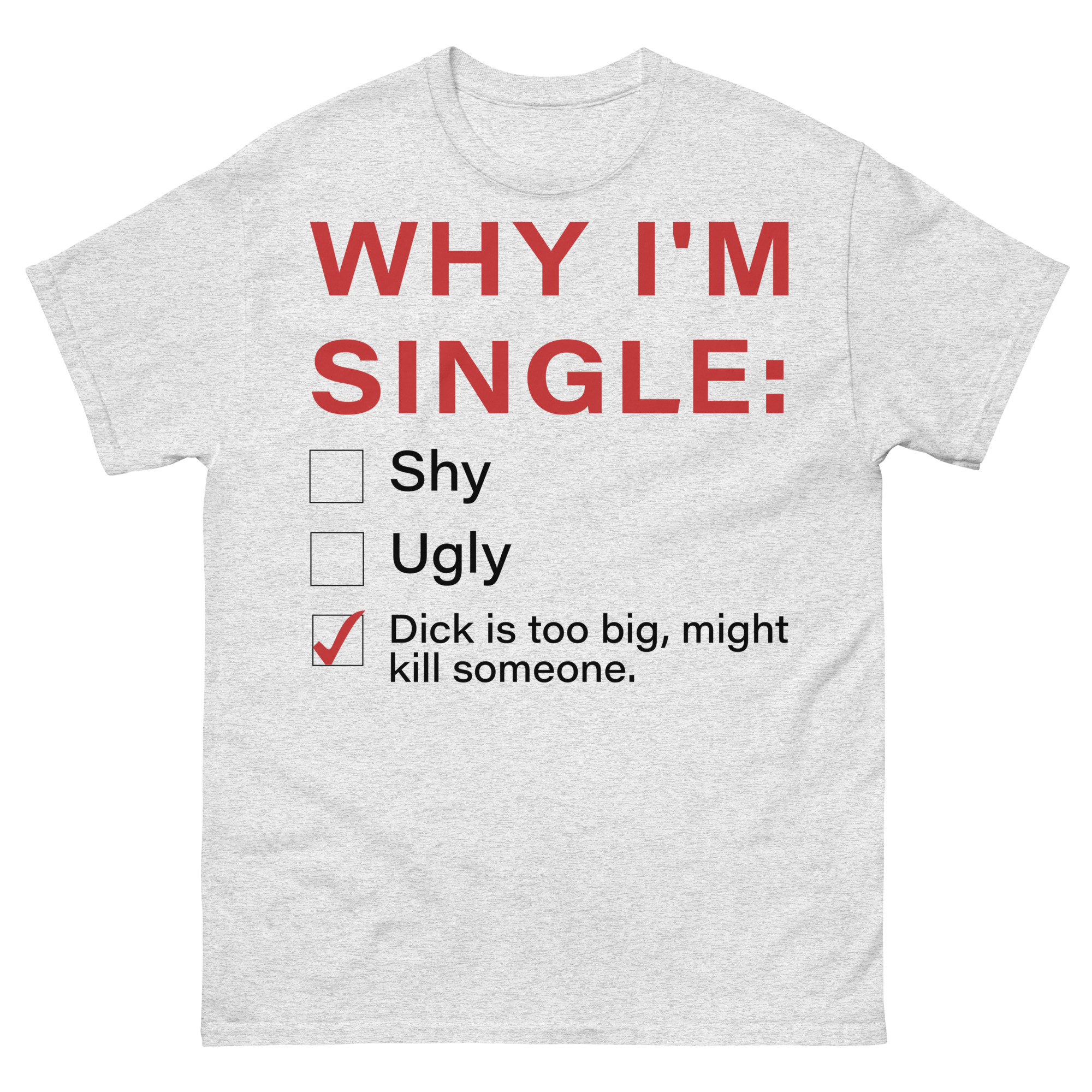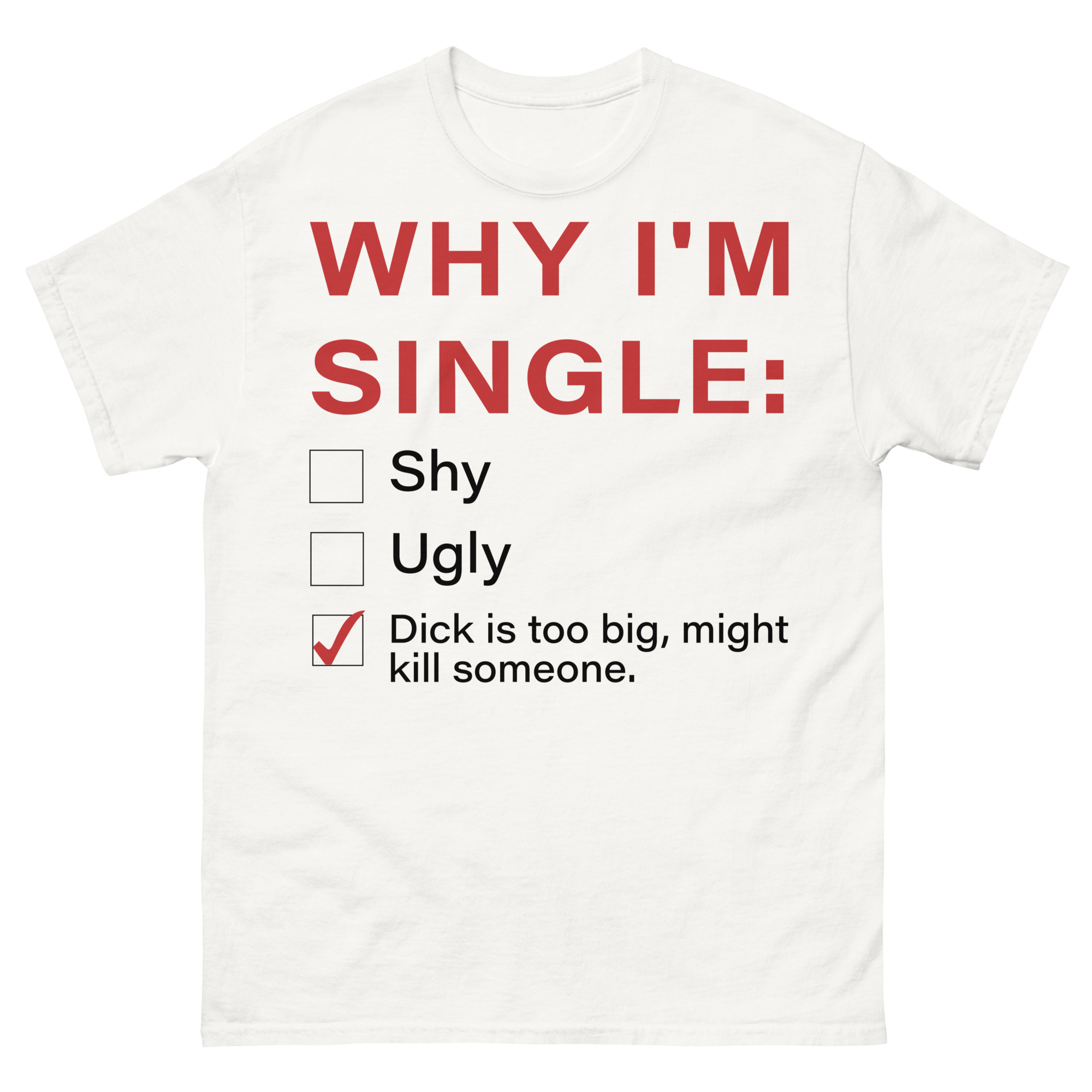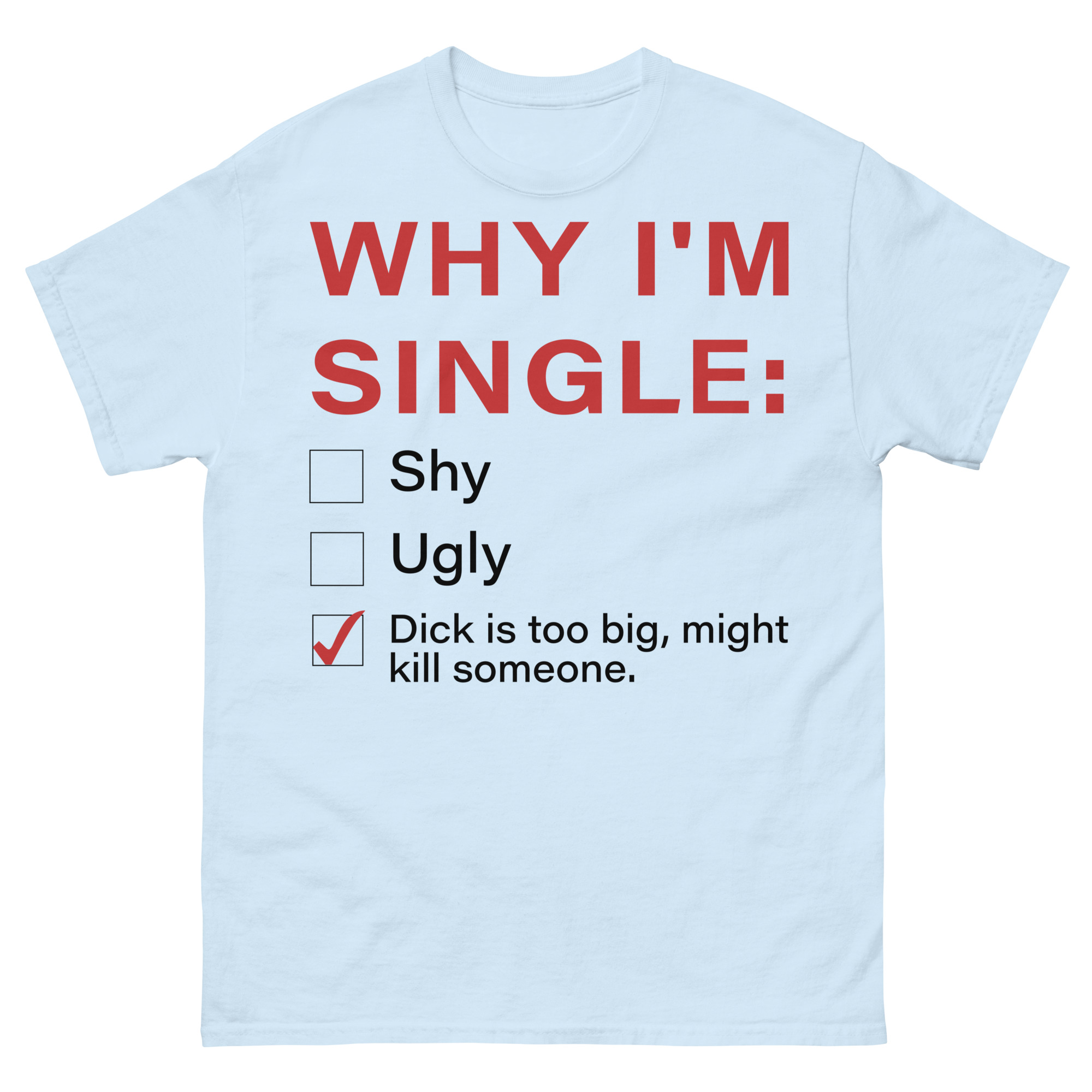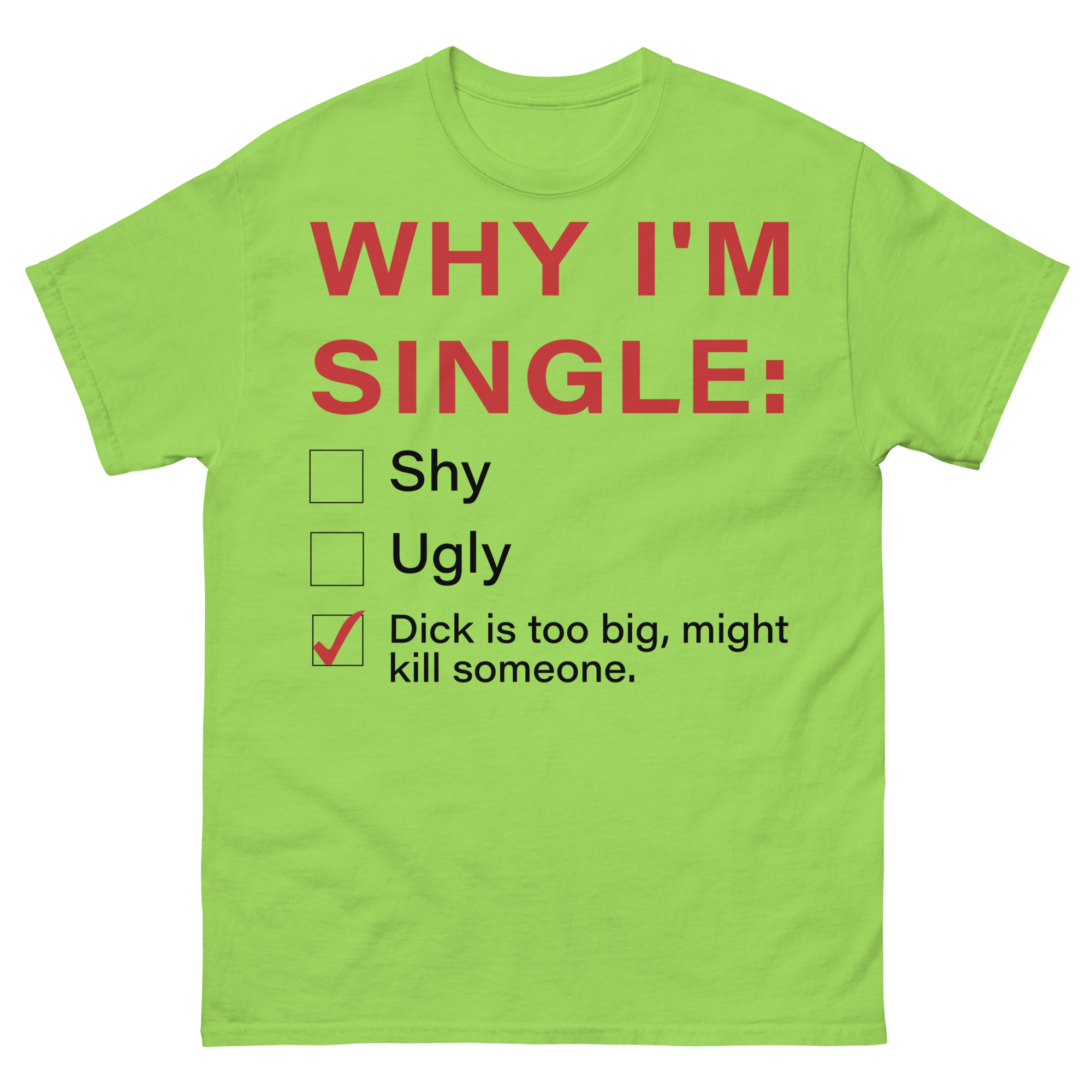Snygg t-shirt fylld med humor med frågan ’Why I’m single’ och svarsalternativen ’Shy, ugly eller dick is too big, might kill someone’ på framsidan. Passar alla män med stor kuk. Välj mellan åtta olika färger.