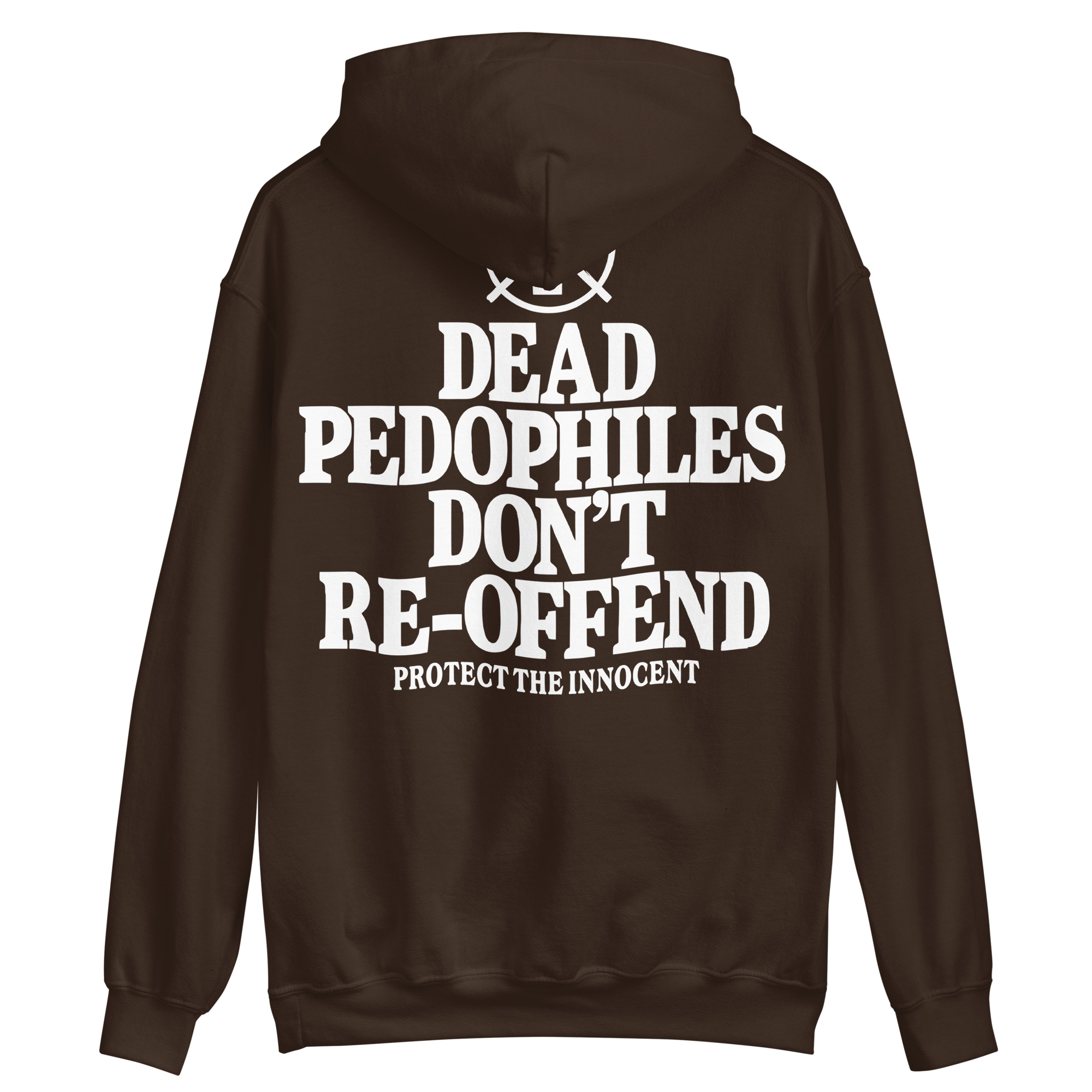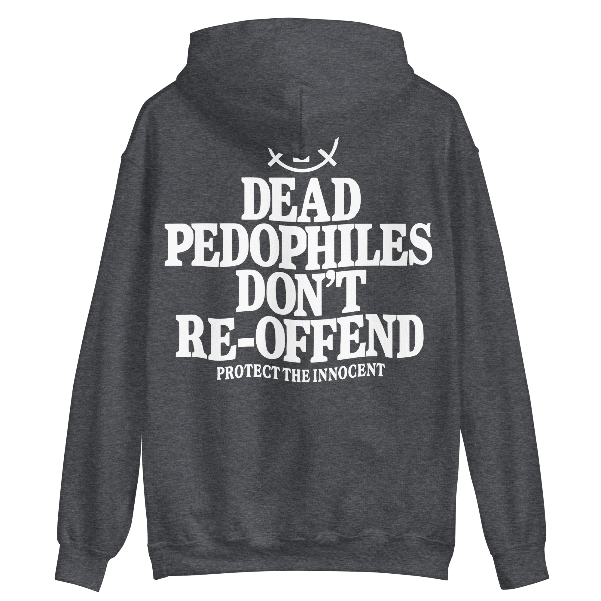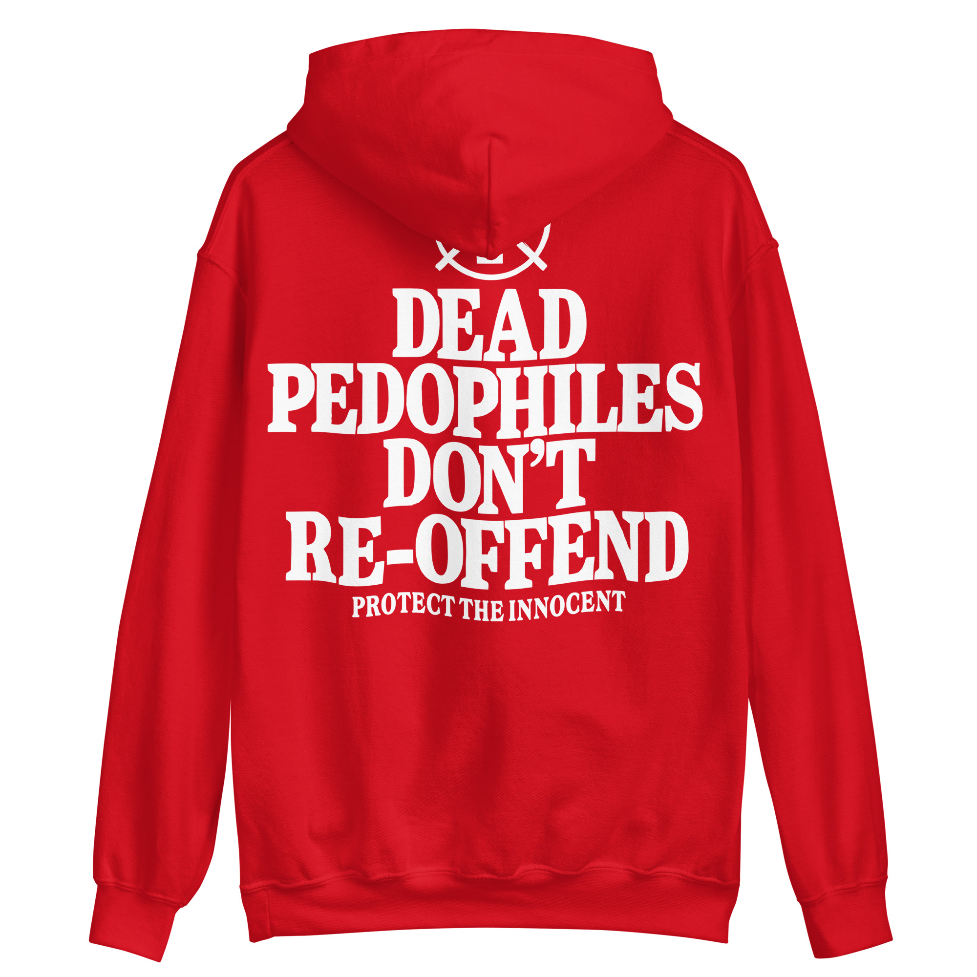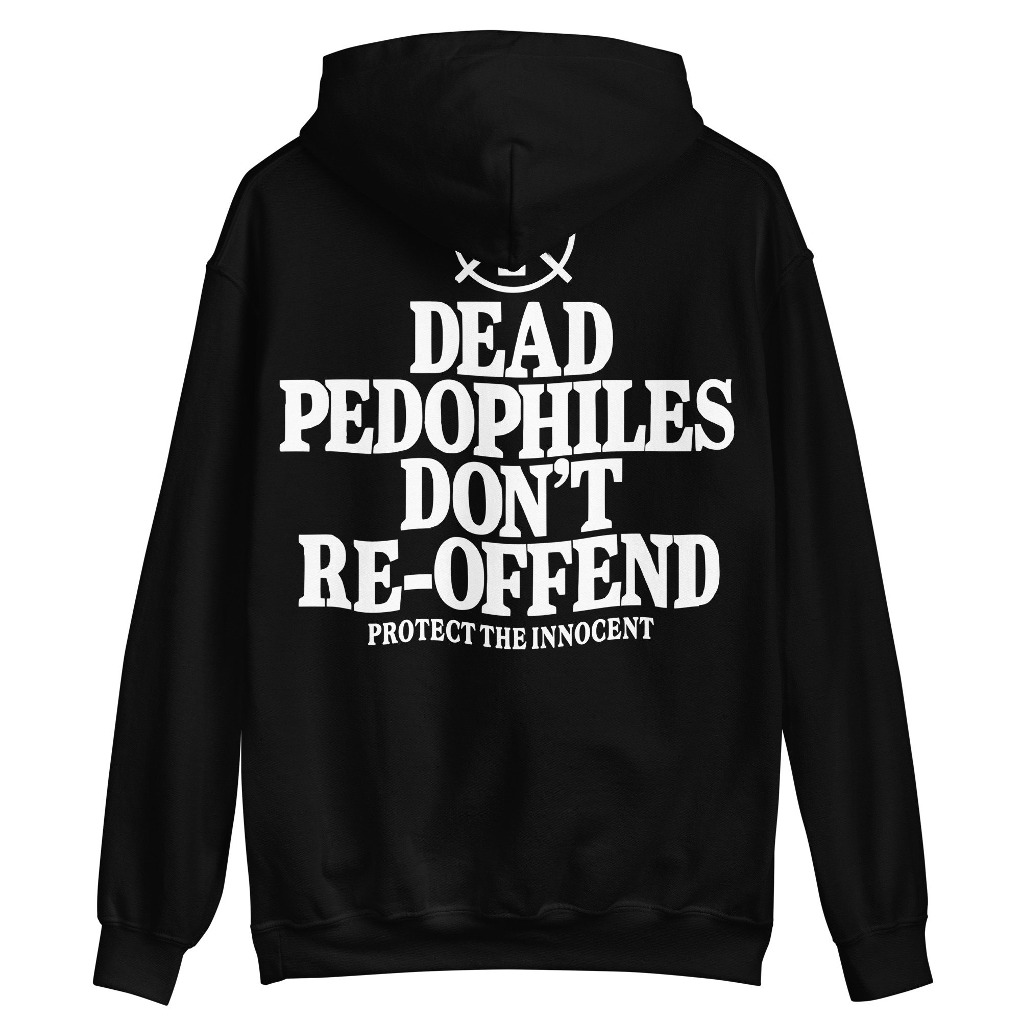 Hoodie dekorerad med ett stort tryck med texten ’Dead pedophiles don’t re-offend’ på baksidan. Tröjan finns i åtta olika färger och passar perfekt till alla som hatar pedofiler.