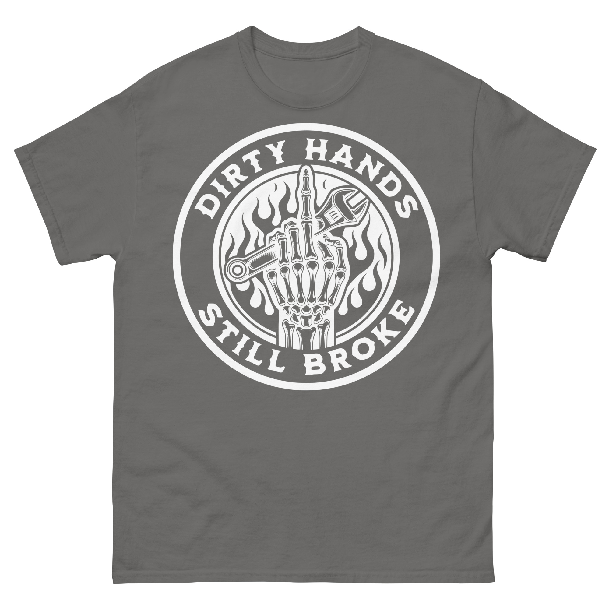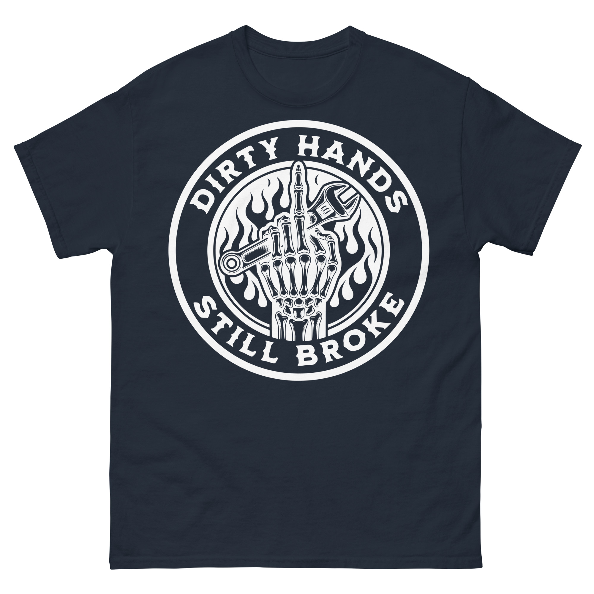 T-shirt dekorerad med en skeletthand som visar långfingret och håller i en skiftnyckel och texten ’Dirty hands, still broke’ som dekoration på framsidan. Passar alla som arbetar hårt, men ändå är fattiga. Du kan välja mellan sju olika färger.
