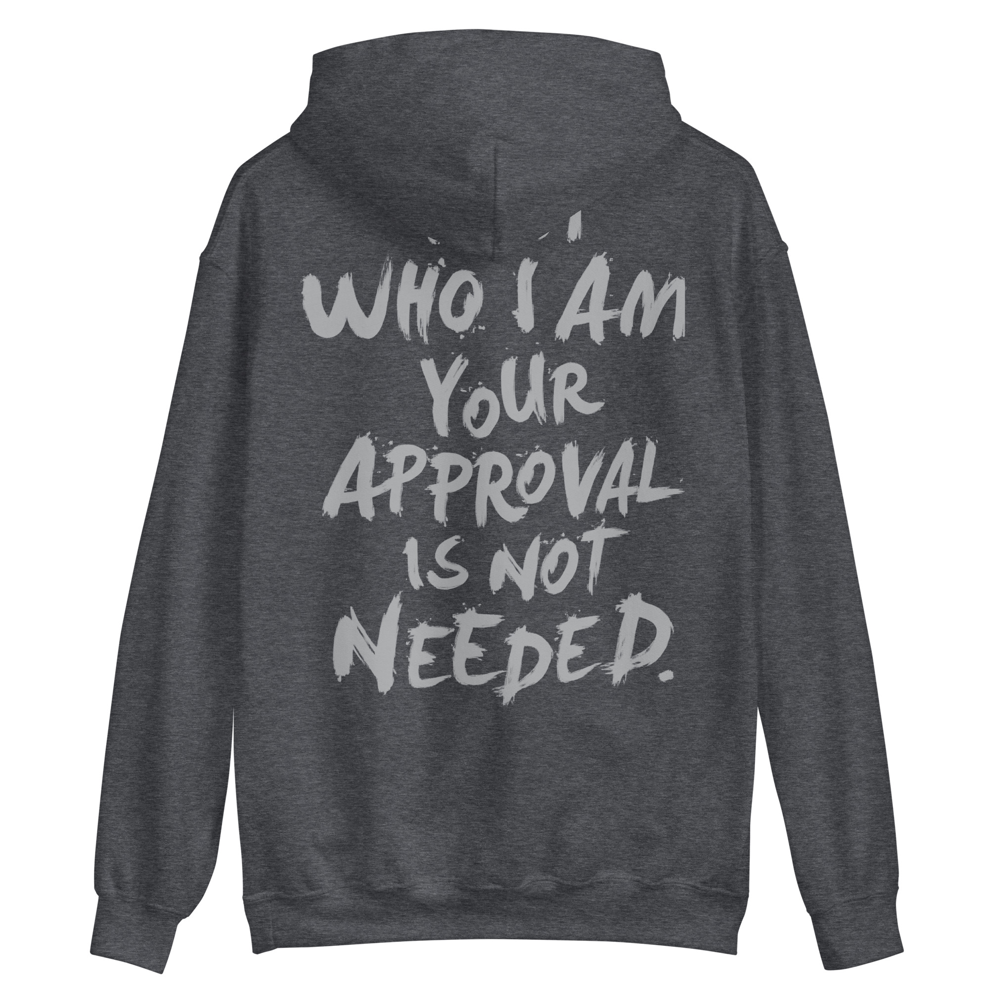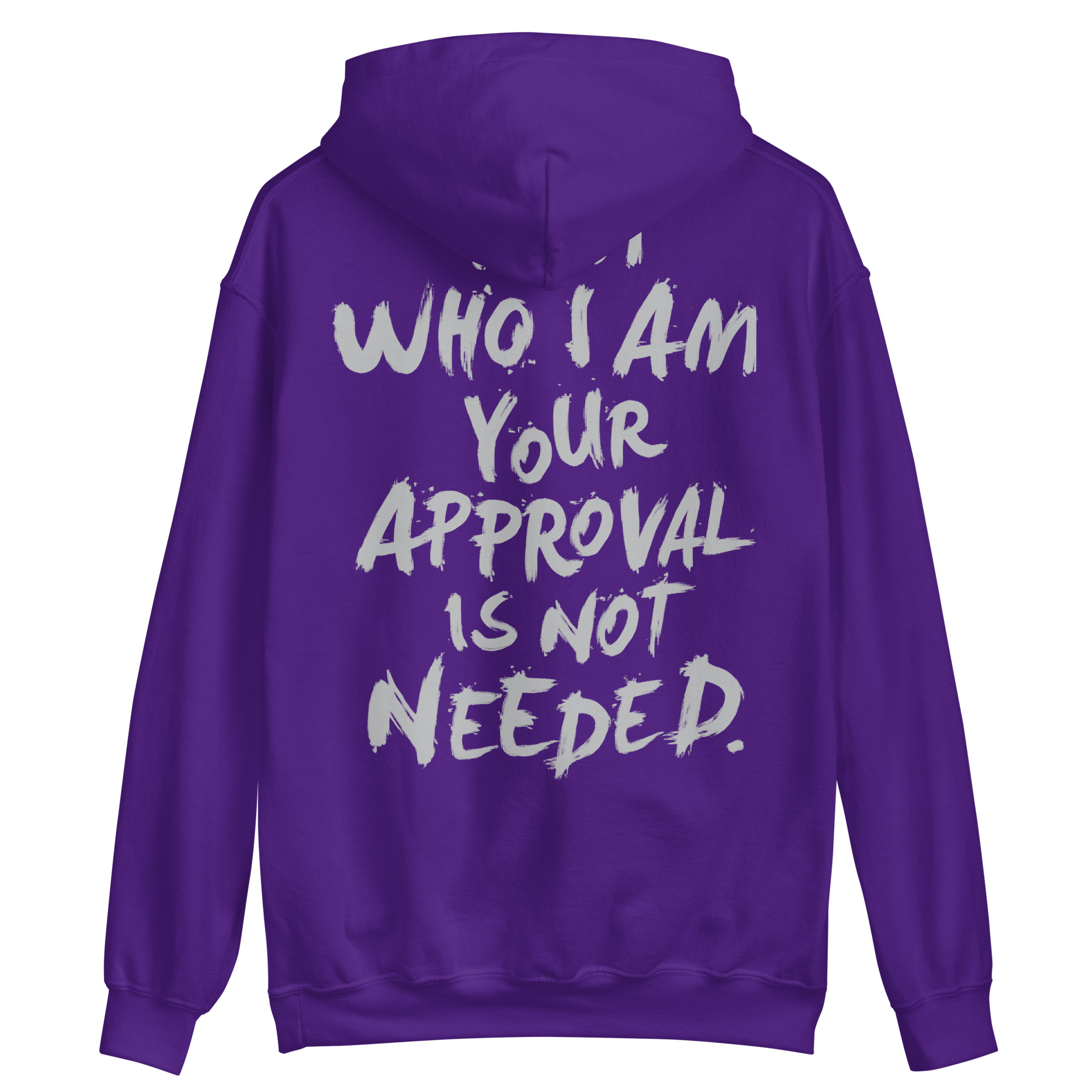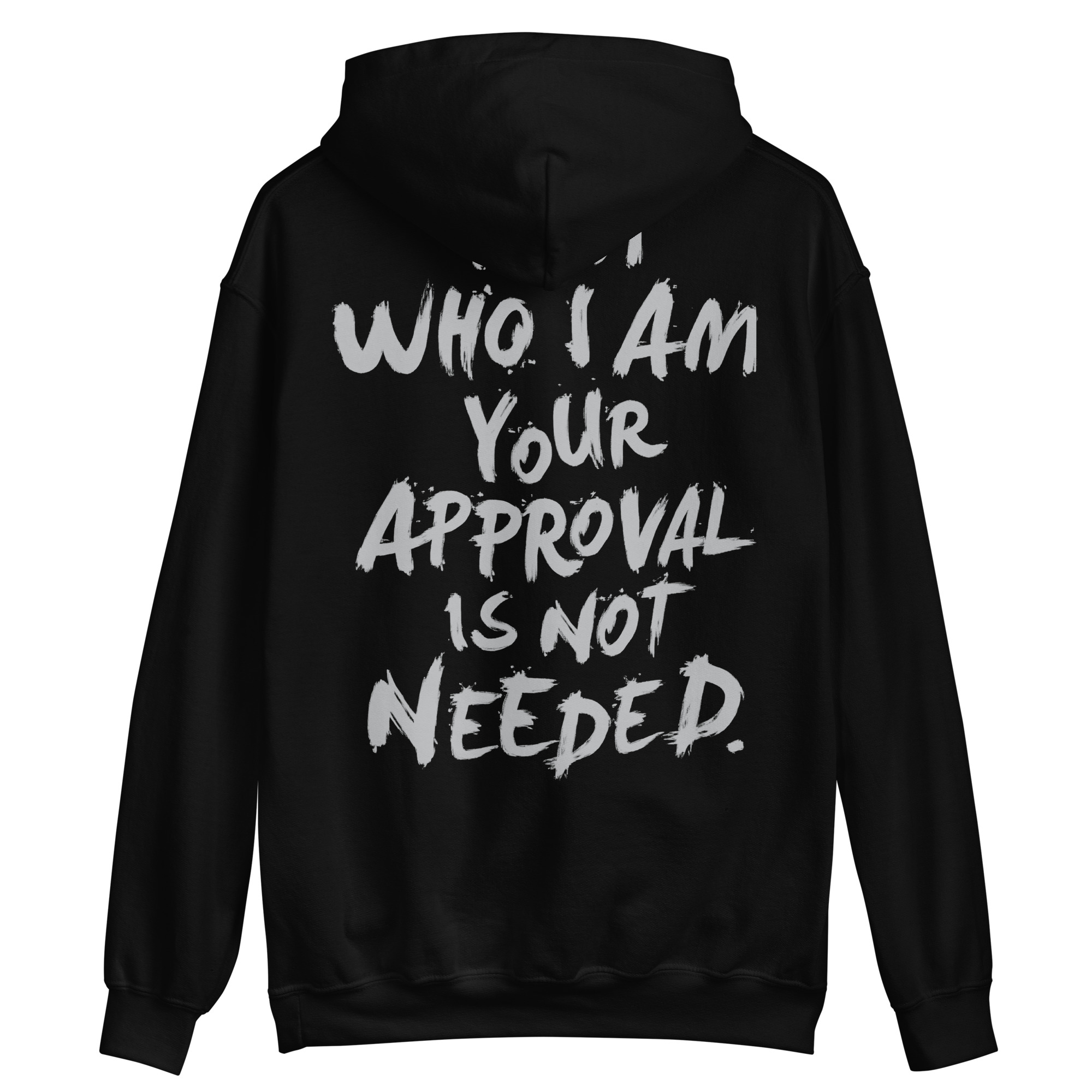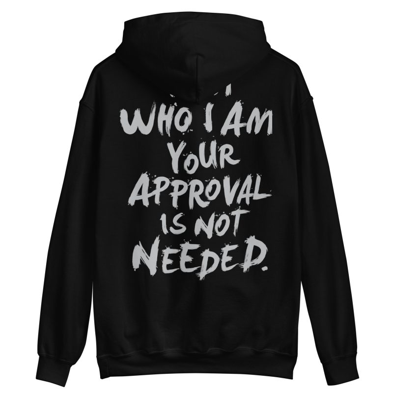 Hoodie med ett stort ryggtryck med texten ’I am who I am, your approval is not needed’. Välj mellan fem olika färger som passar lika bra till män som kvinnor.
