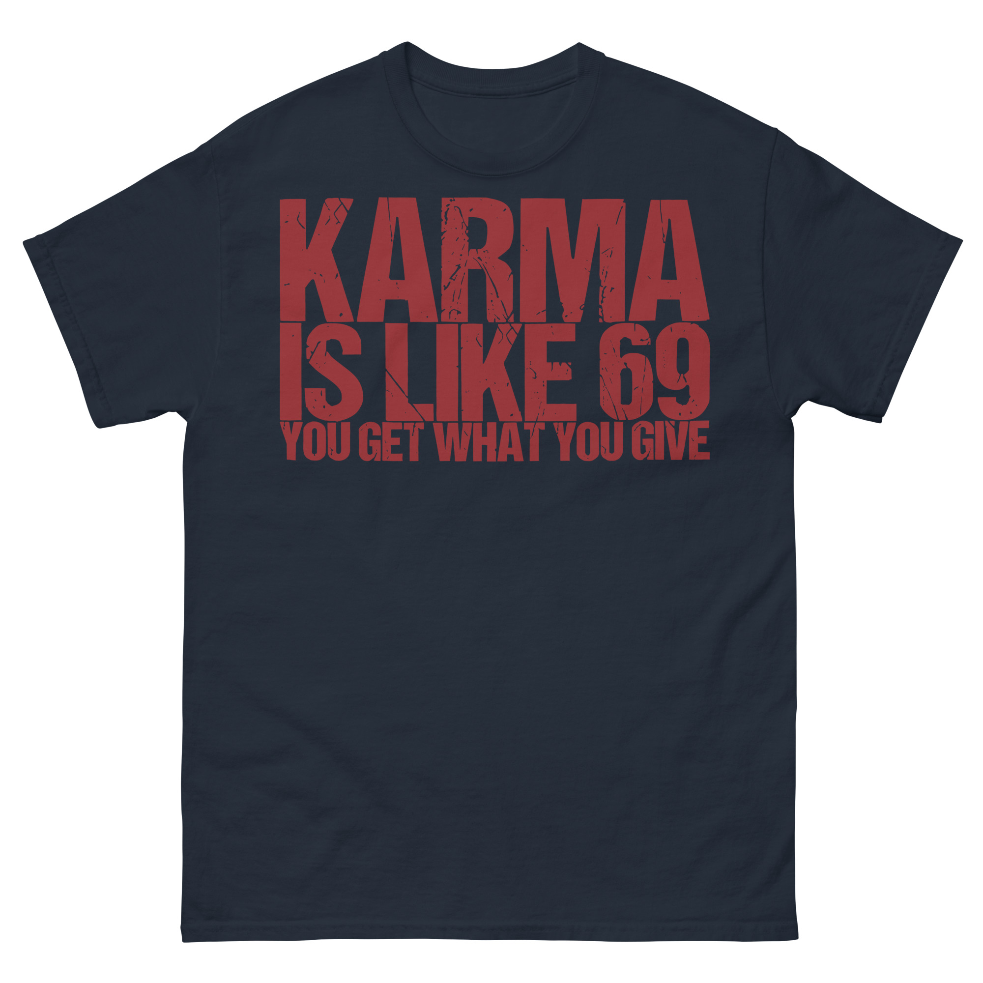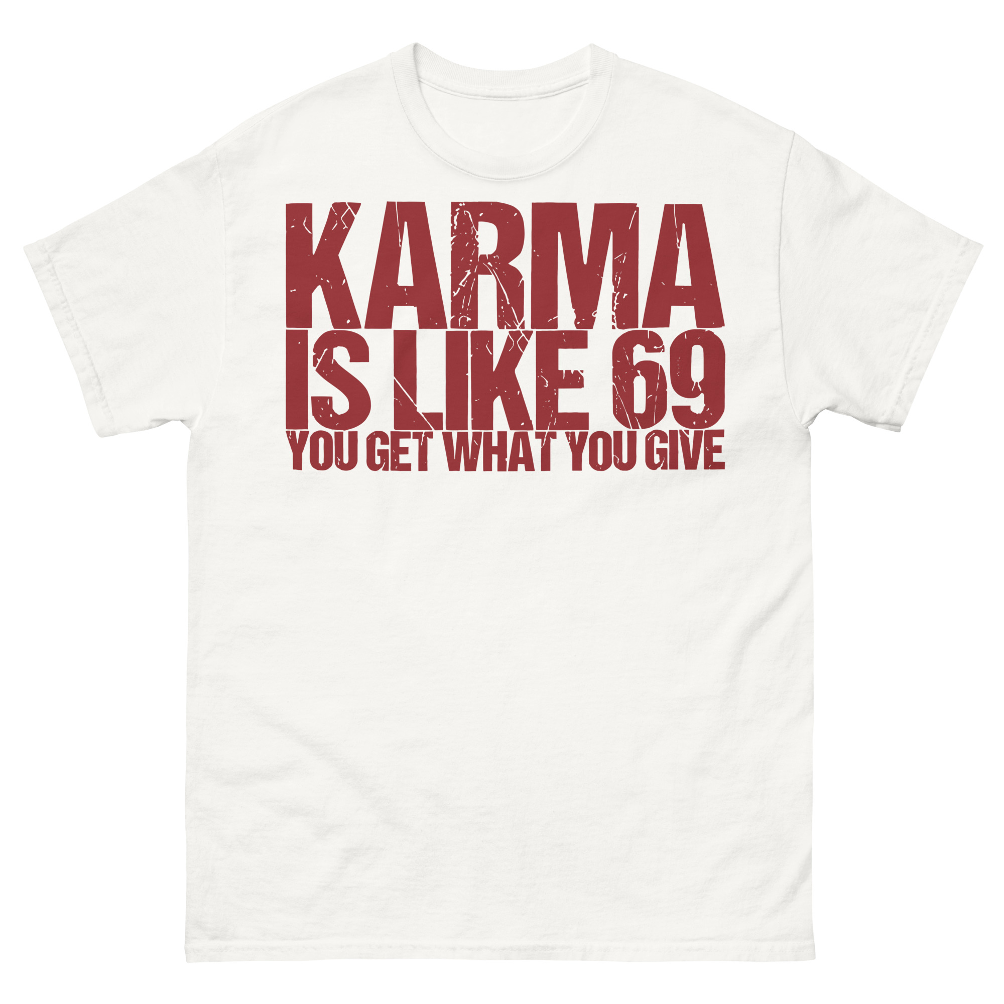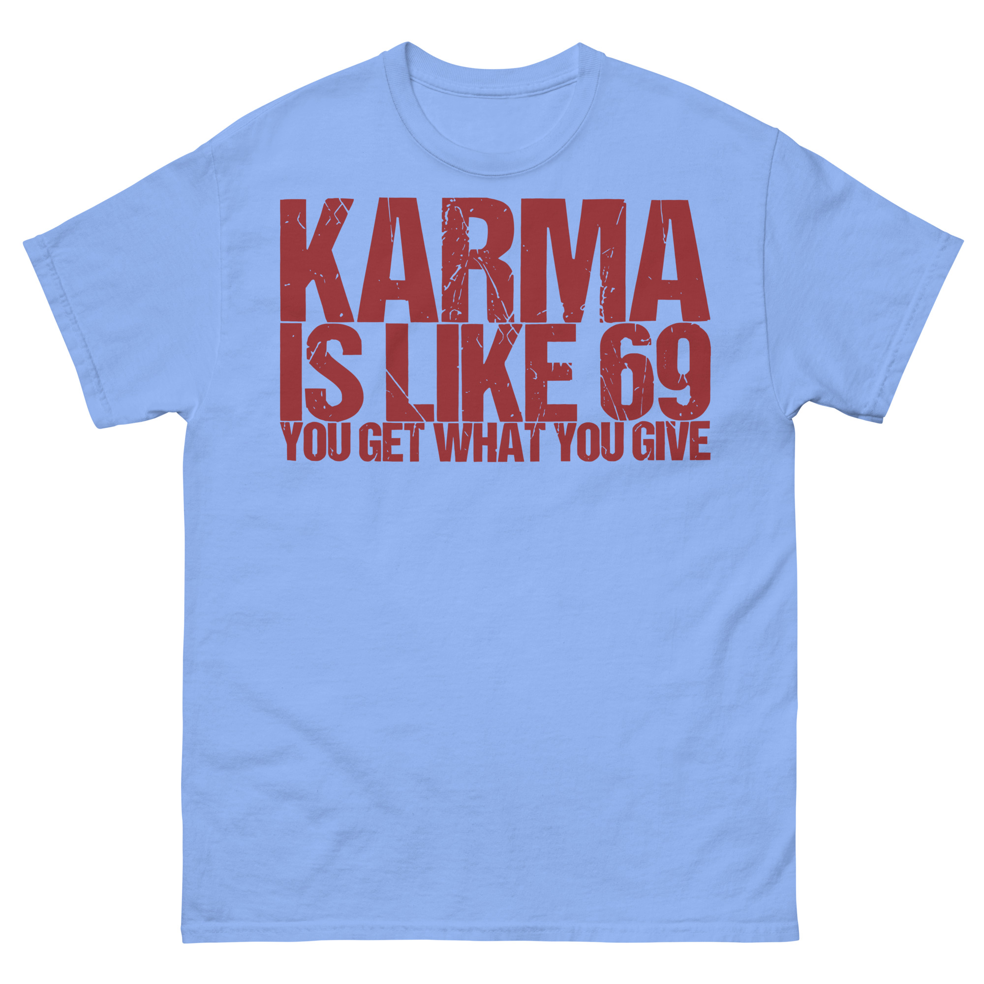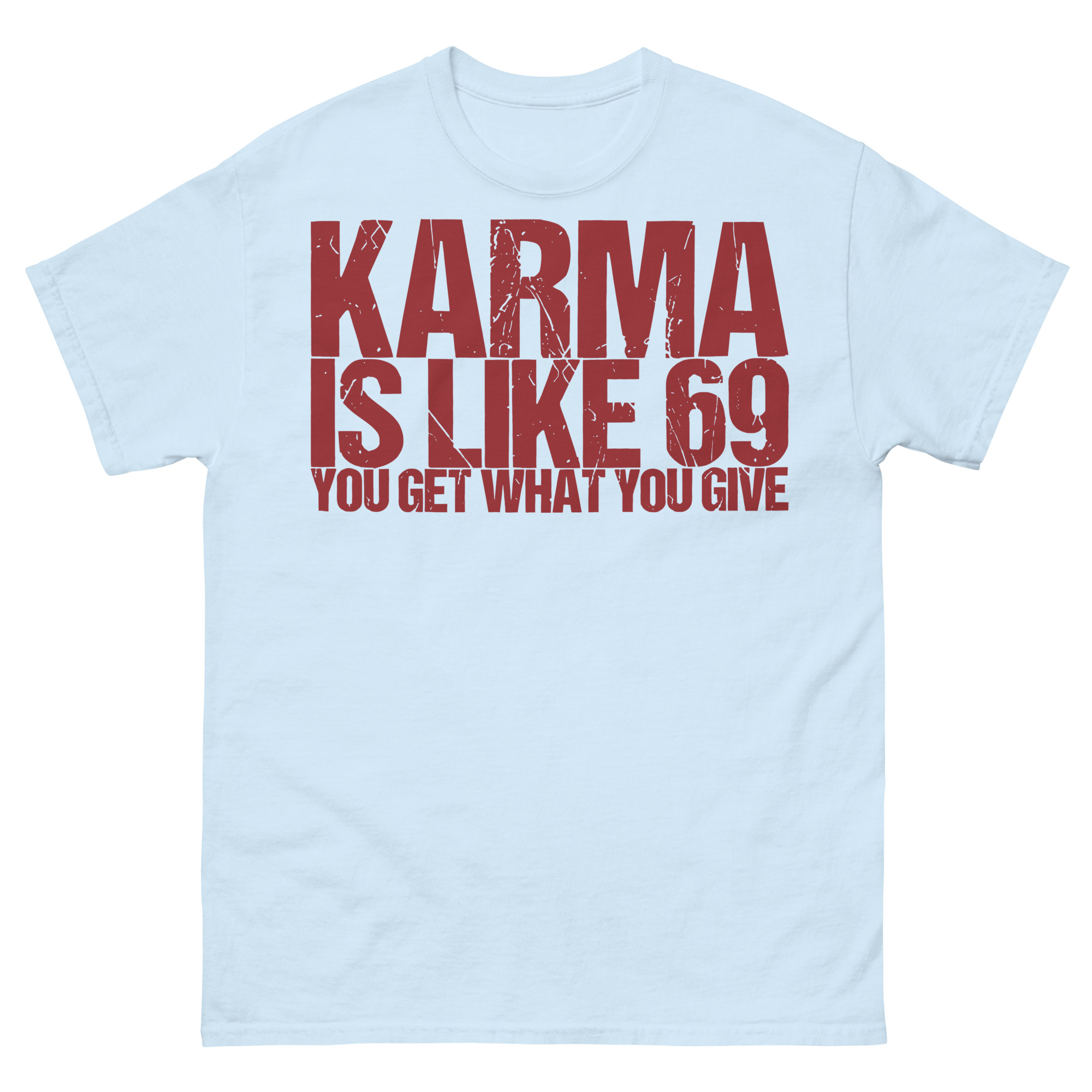 T-shirt dekorerad med texten ’Karma is like 69, you get what you give’ som tryck på framsidan. Passar perfekt till både kvinnor och män som älskar humor. Välj mellan 14 olika färger.