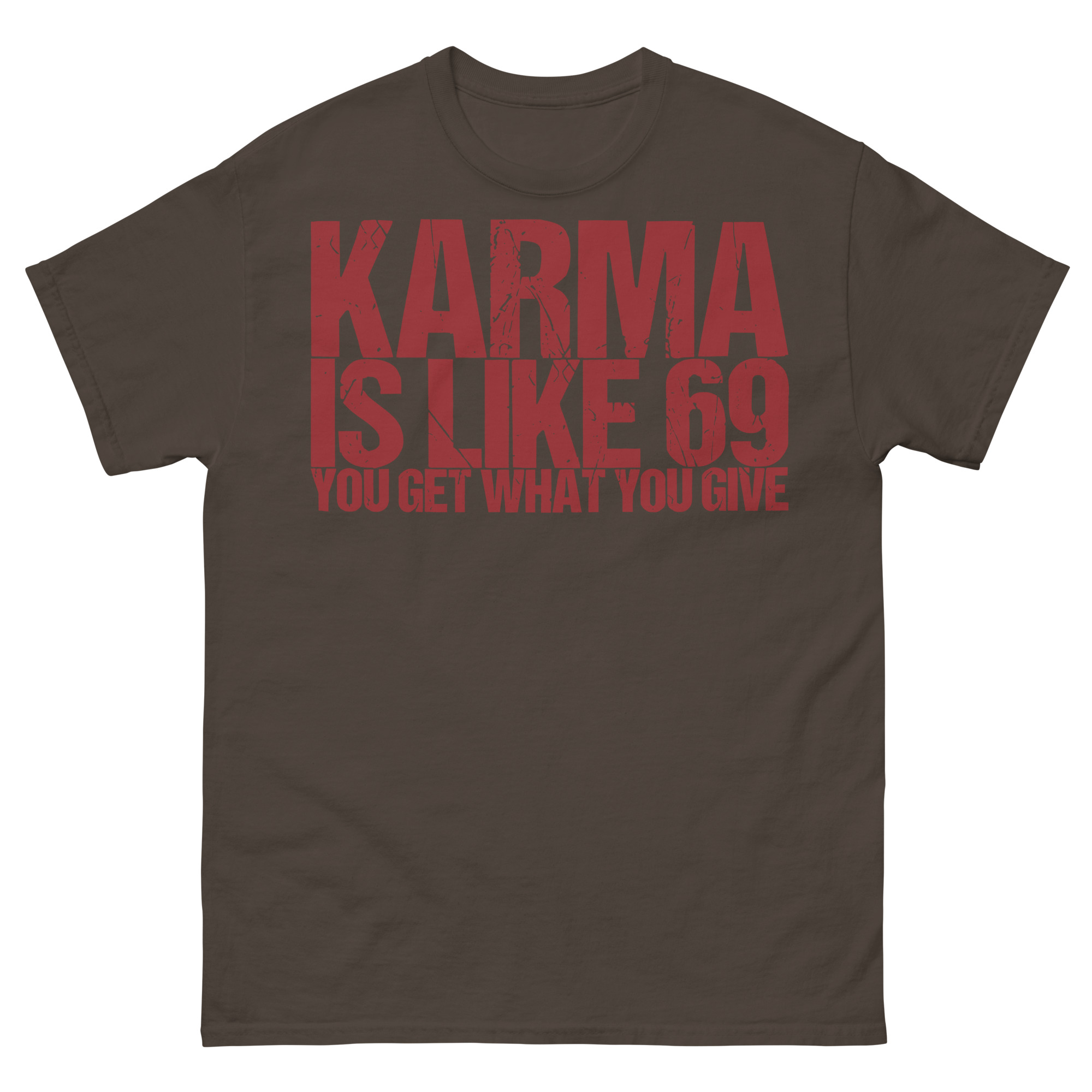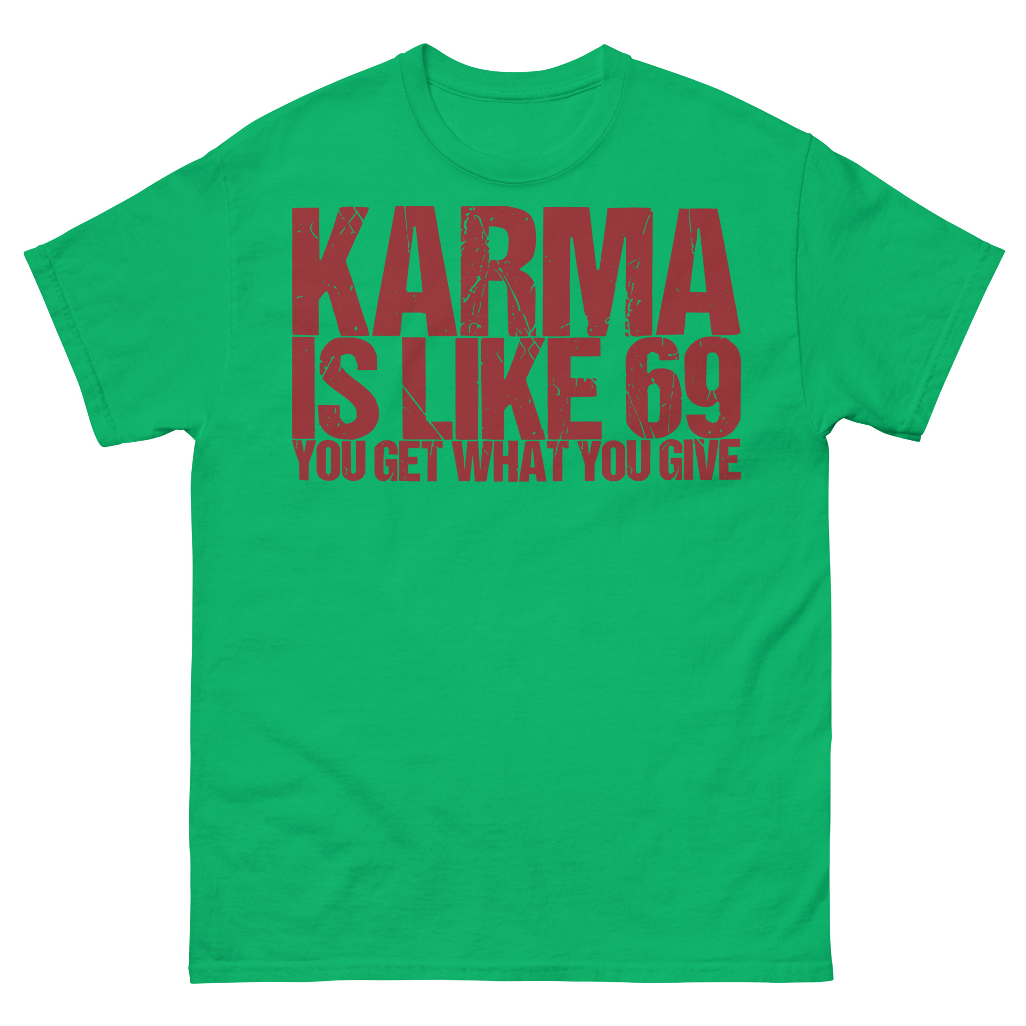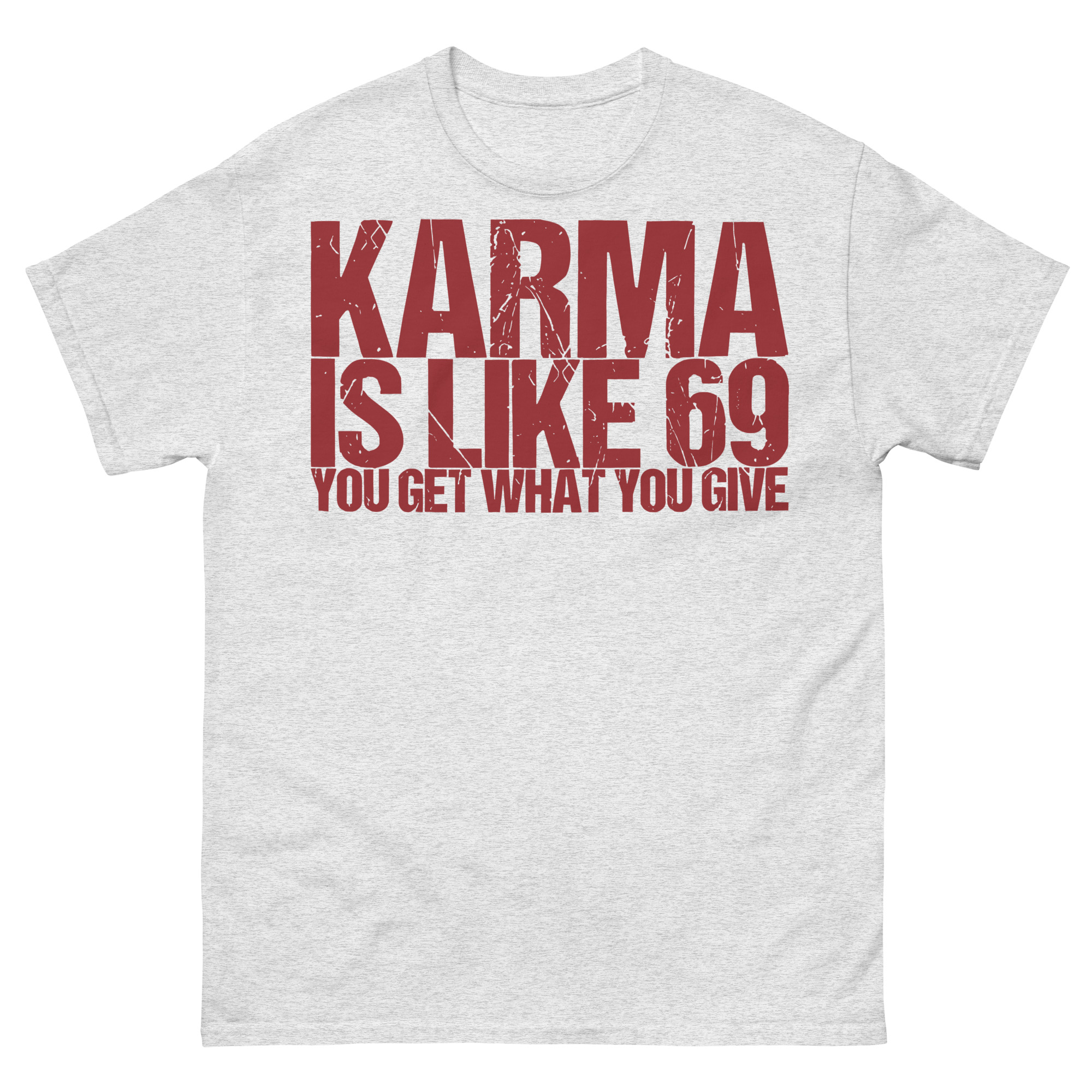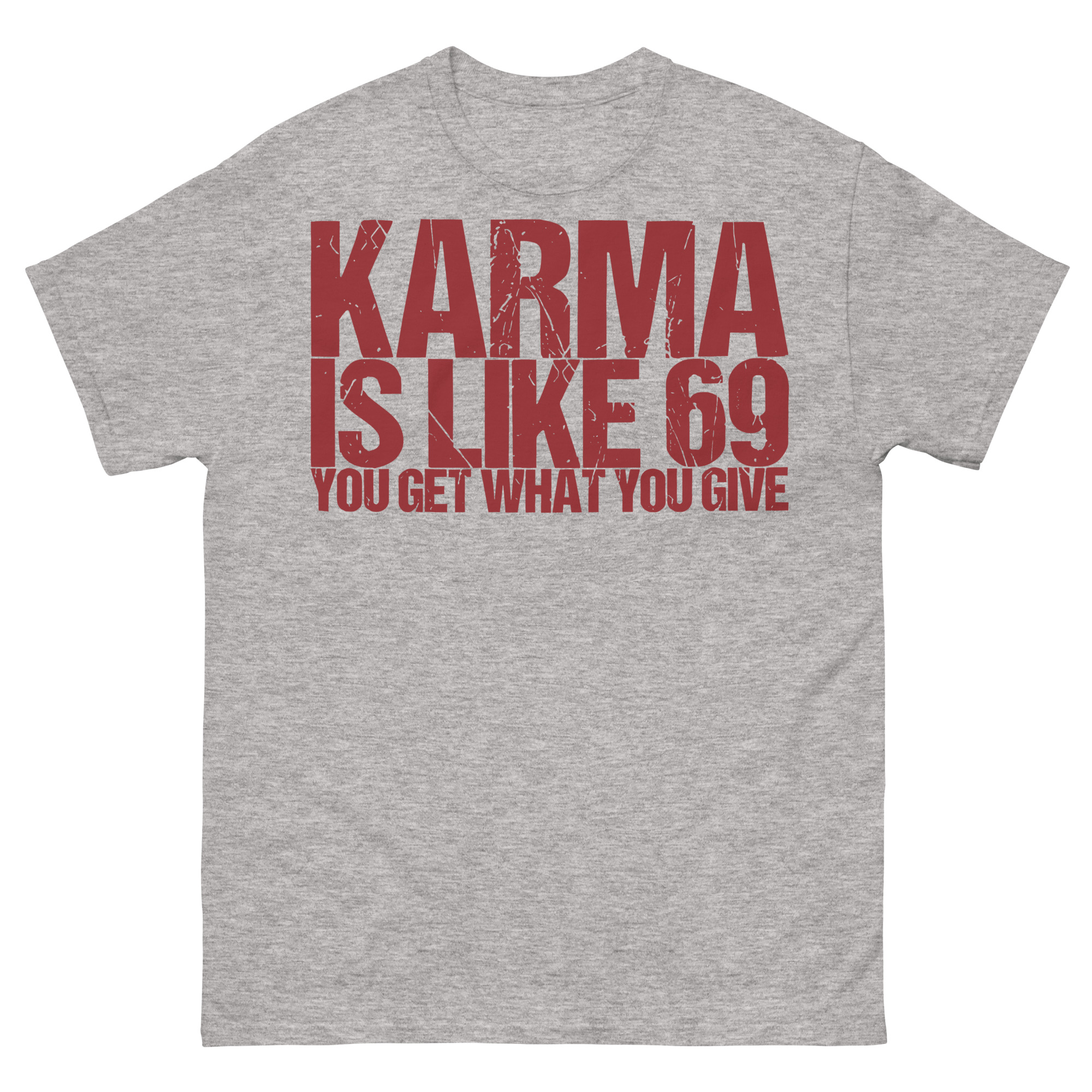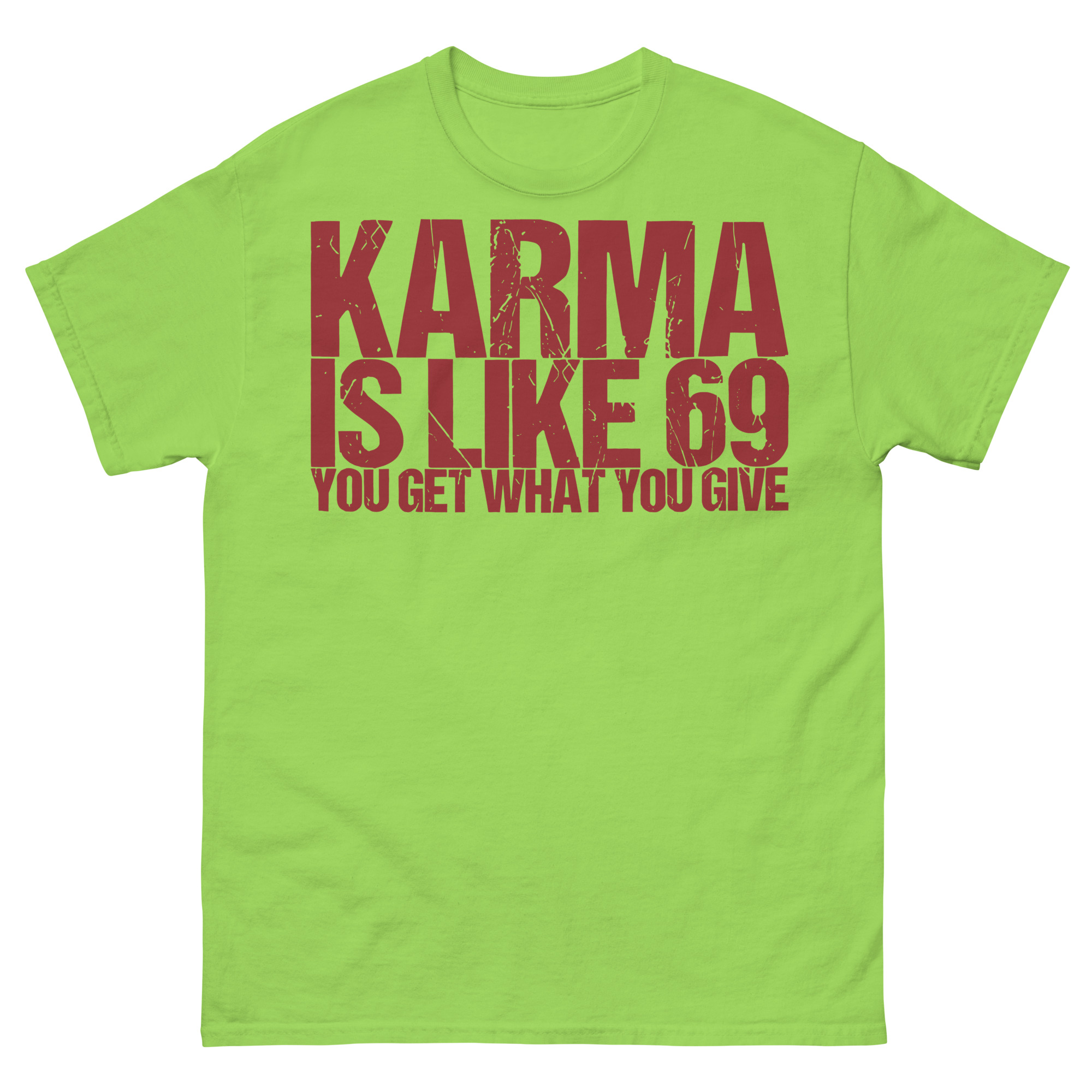 T-shirt dekorerad med texten ’Karma is like 69, you get what you give’ som tryck på framsidan. Passar perfekt till både kvinnor och män som älskar humor. Välj mellan 14 olika färger.