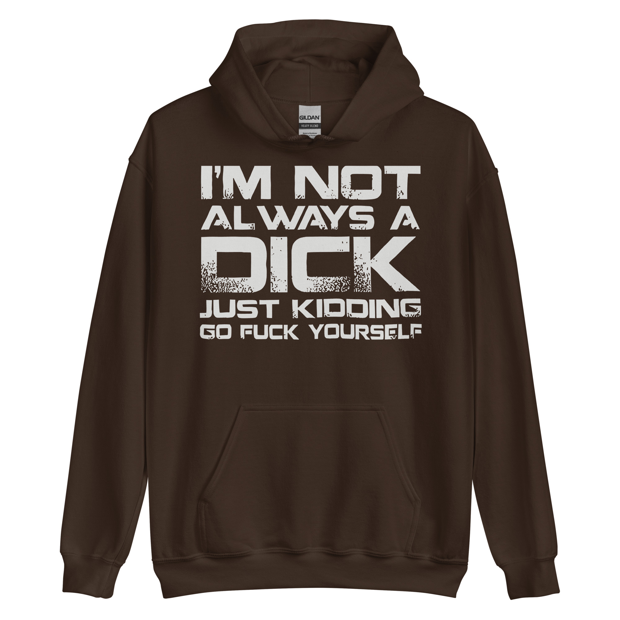 Hoodie dekorerad med texten ’I’m not always a dick, just kidding, go fuck yourself’ på framsidan. Välj mellan fem olika färger som passar alla som älskar attityd.