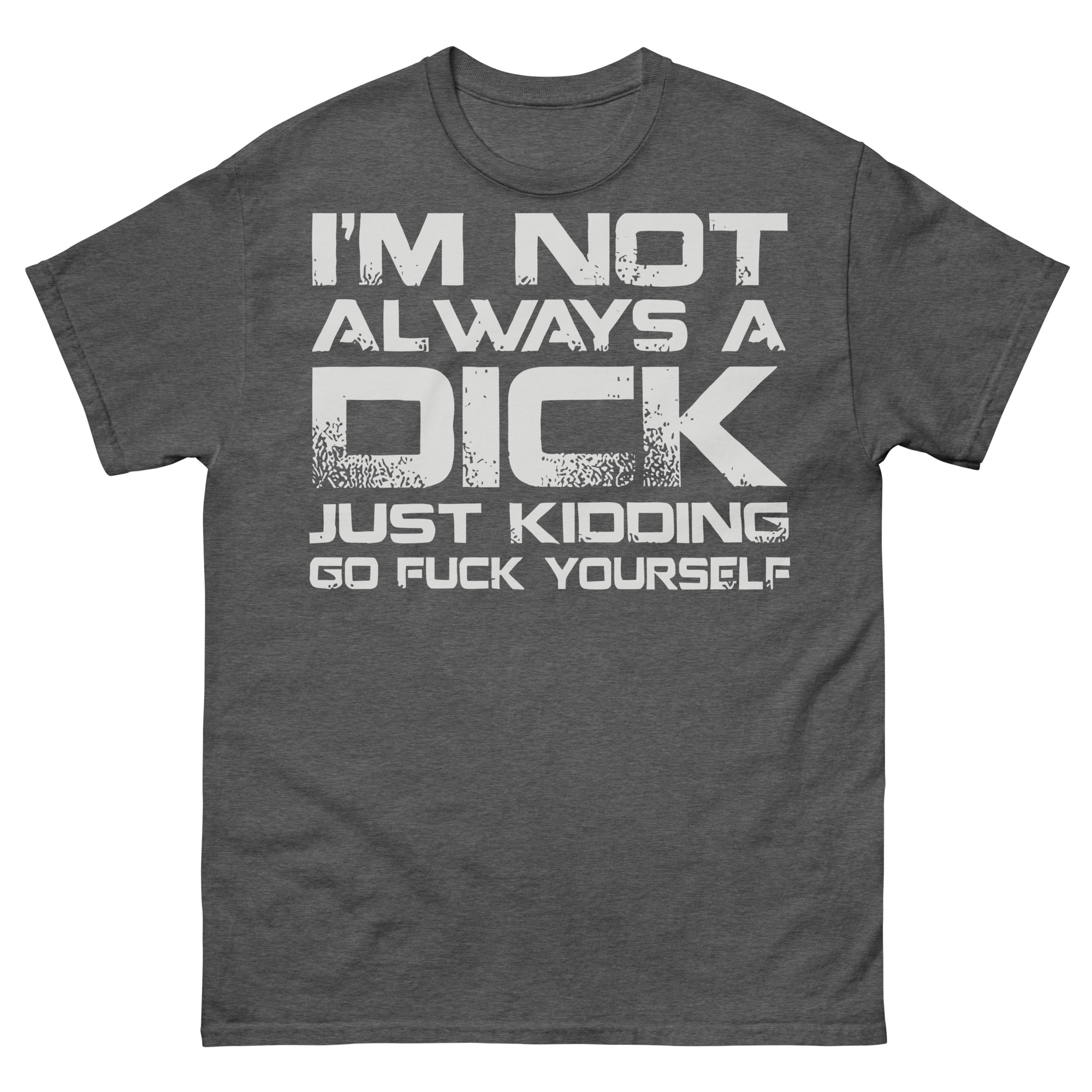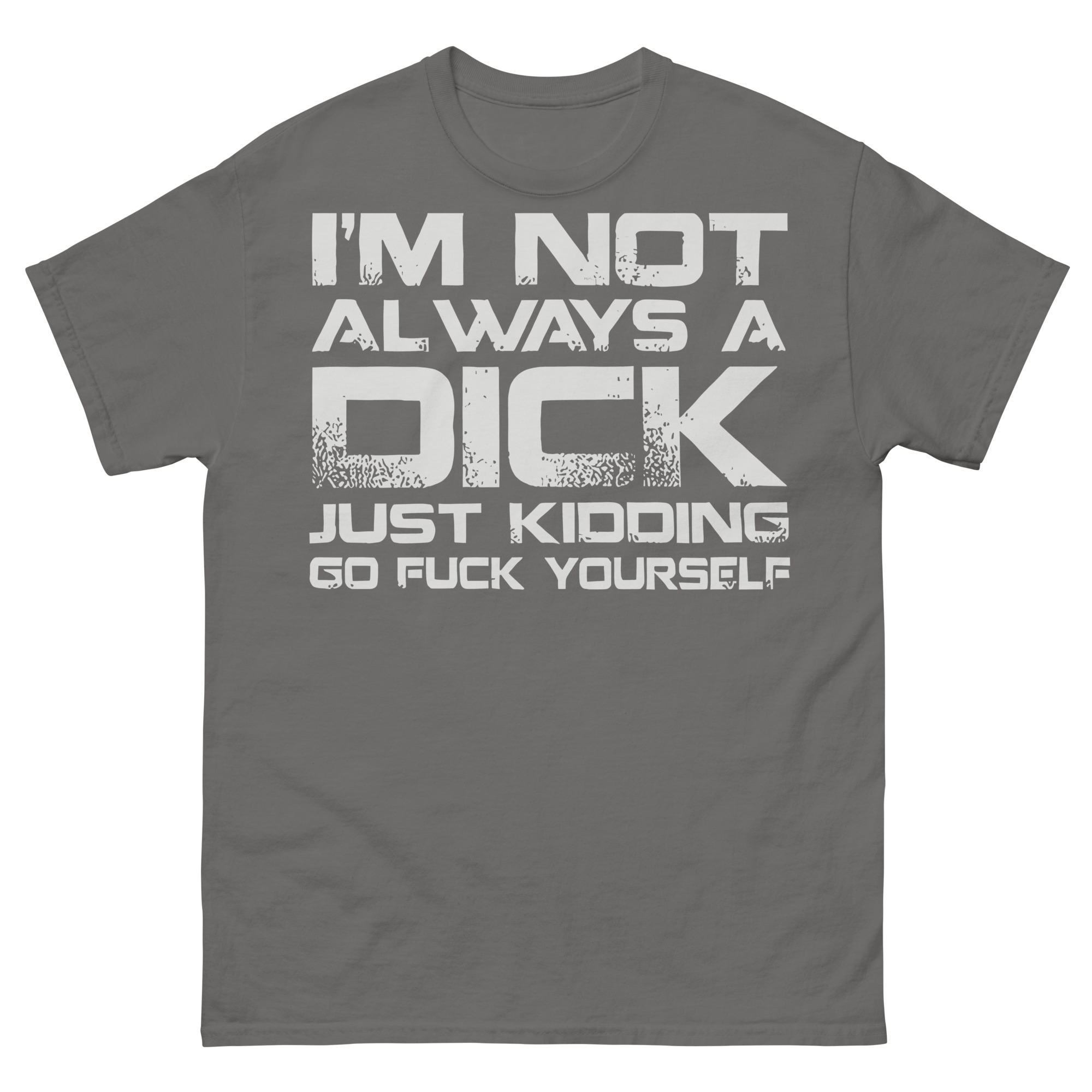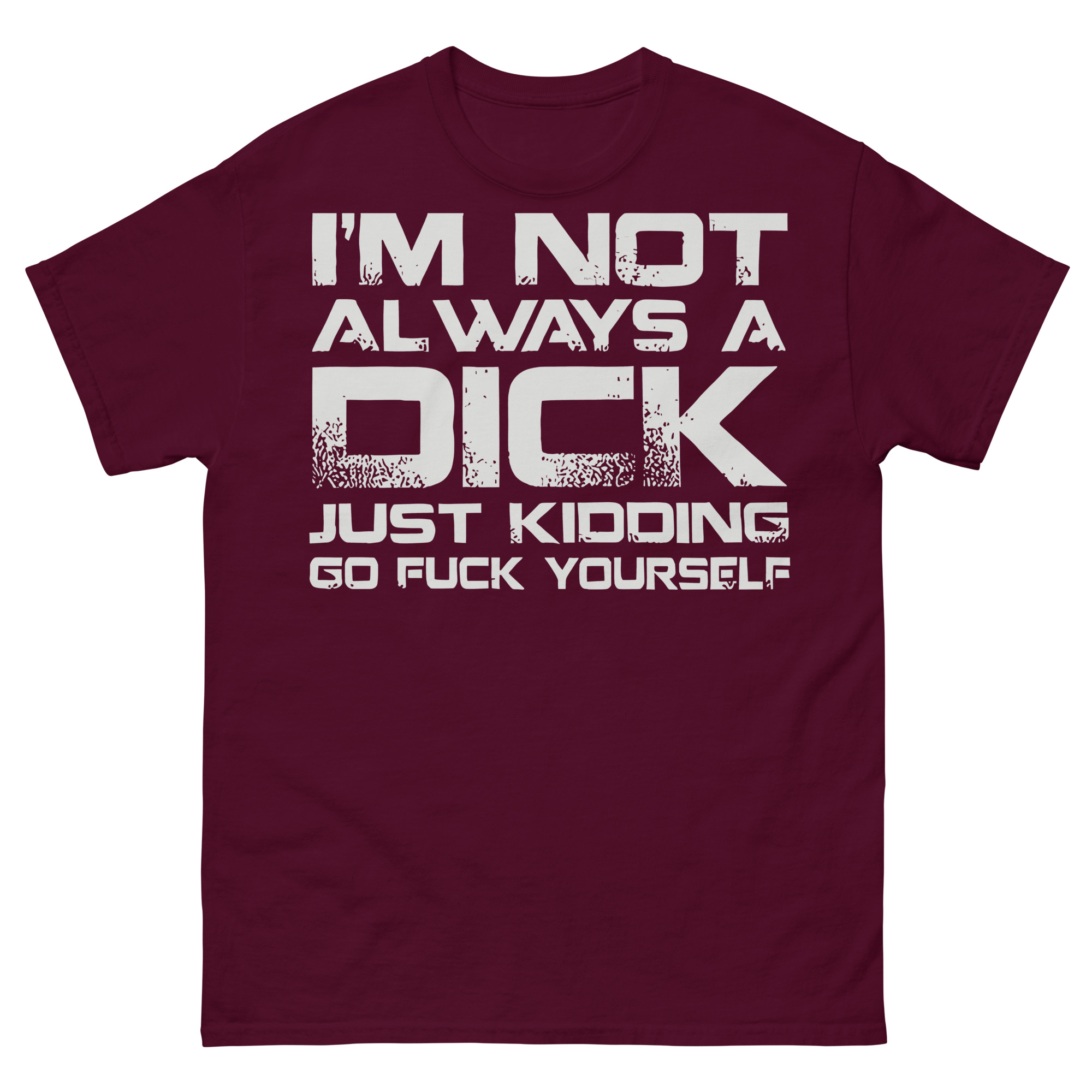 Snygg t-shirt med texten ’I’m not always a dick, just kidding, go fuck yourself’ som tryck på framsidan. Tröjan passar alla som älskar humor och attityd. Välj mellan sex olika färger.