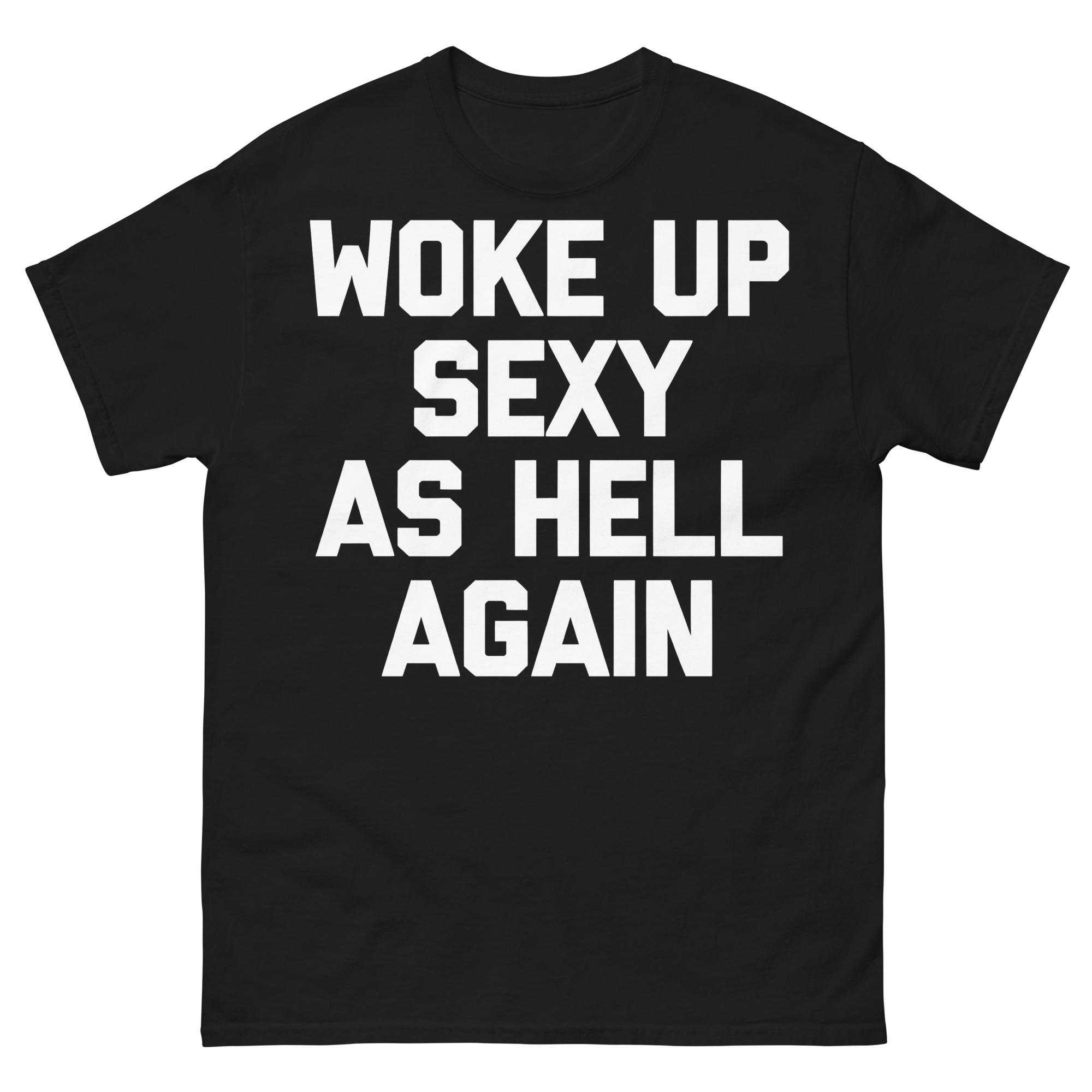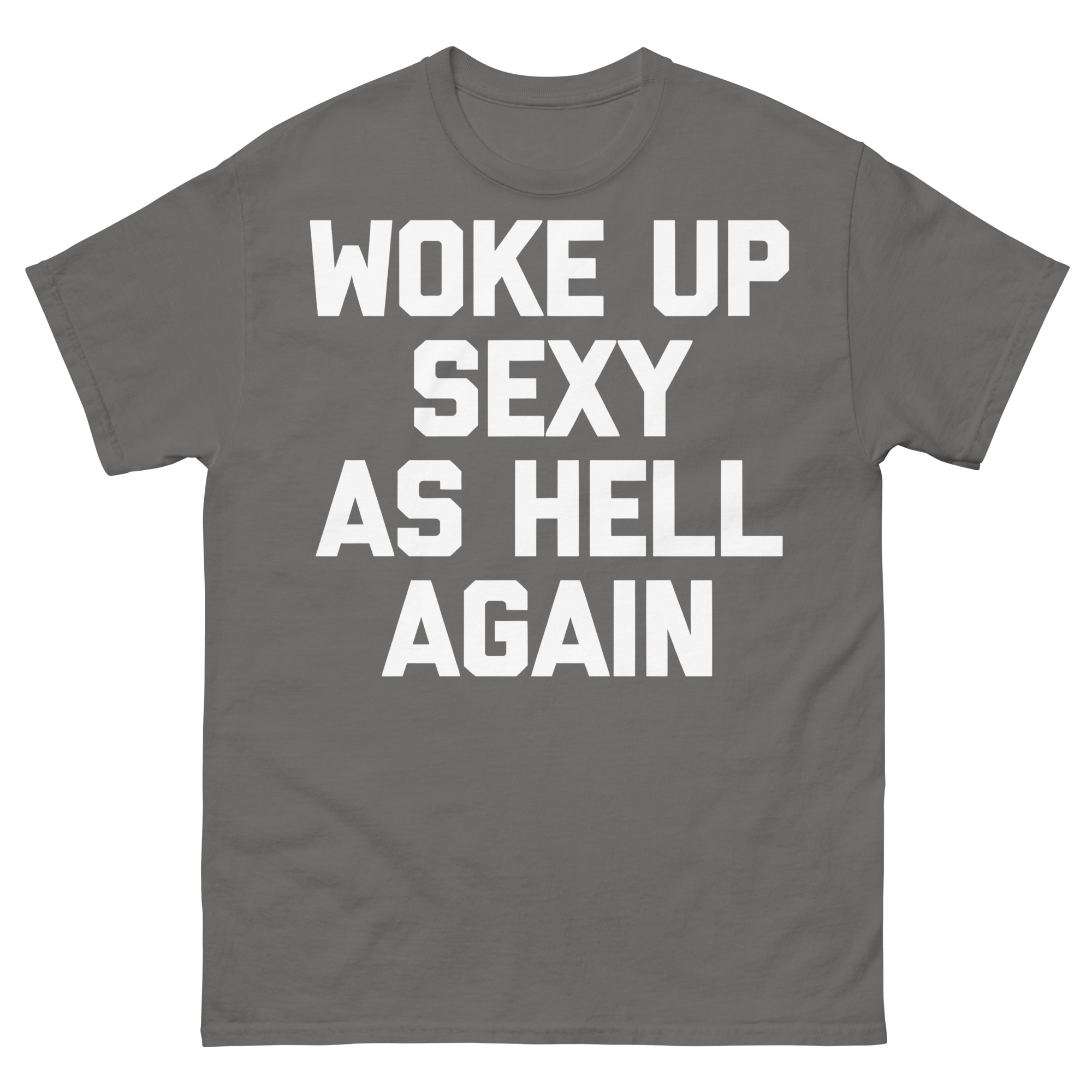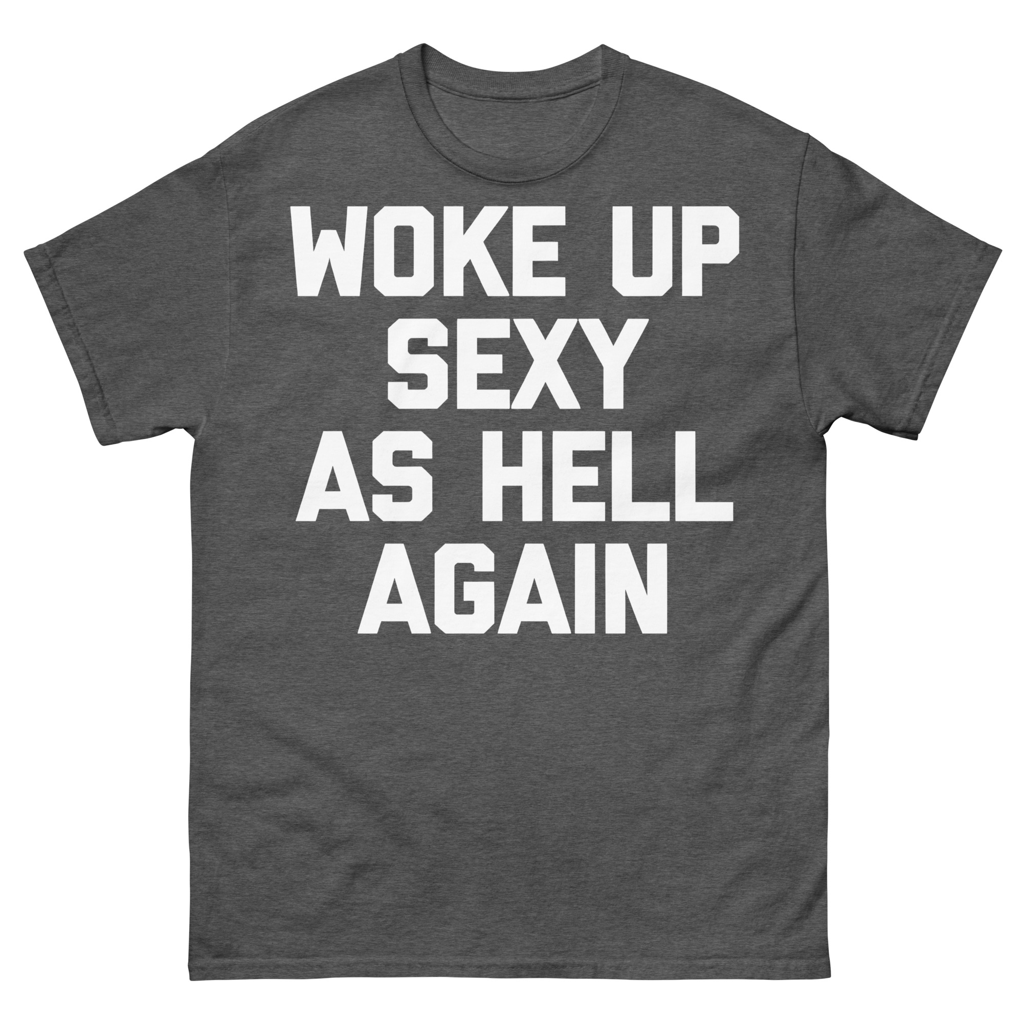 T-shirt dekorerad med texten ’Woke up sexy as hell again’ som tryck på framsidan. Passar perfekt till både kvinnor och män som vaknar upp sexiga som helvete. Välj mellan sex olika färger.