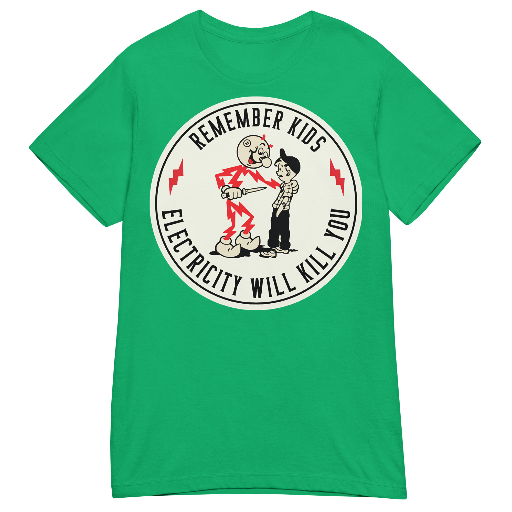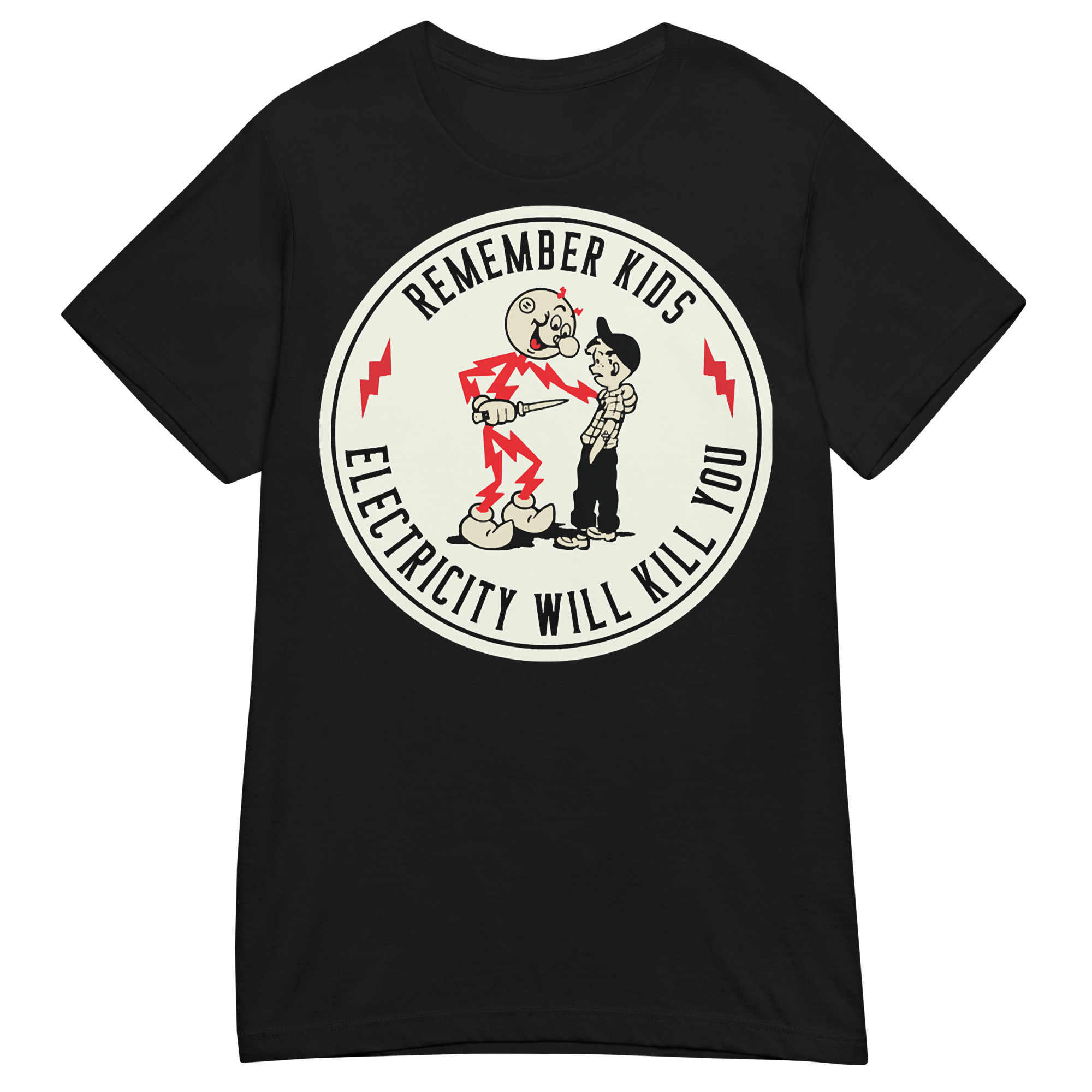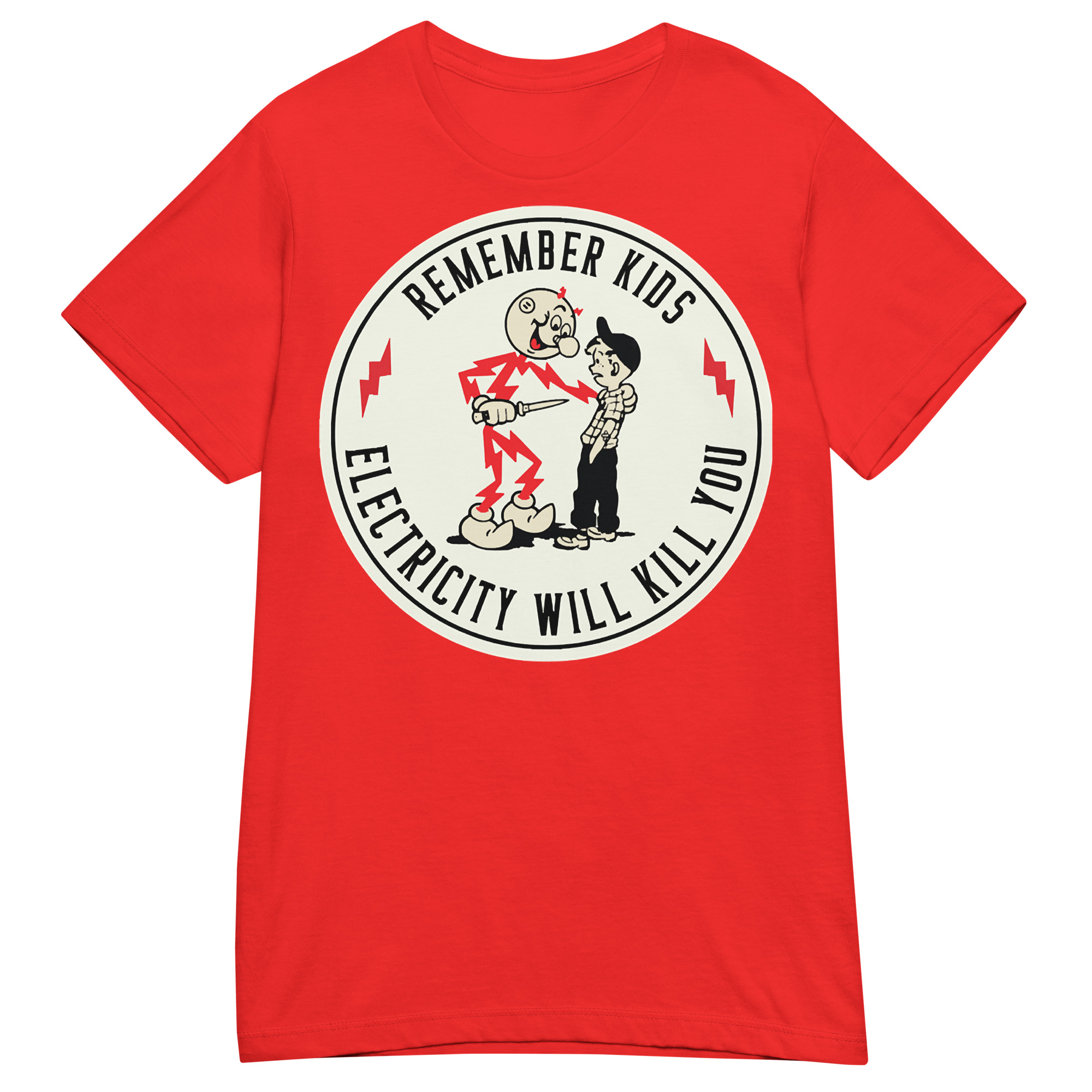 Semi-fitted t-shirt med ett stort retroinspirerat tryck med texten ’Remember kids, electricity will kill you’ på framsidan. Skön t-shirt som passar kvinnor och finns i hela elva olika färger.