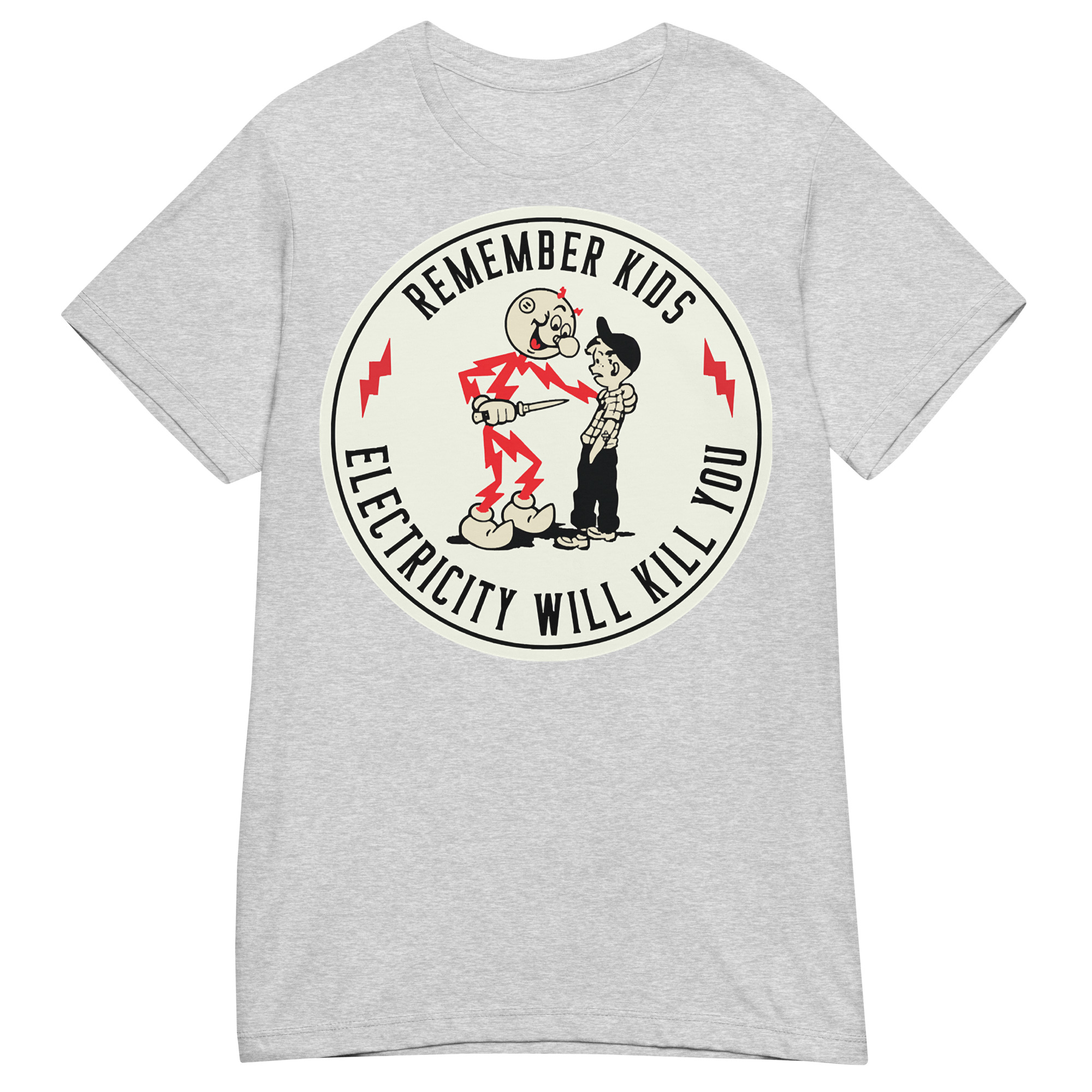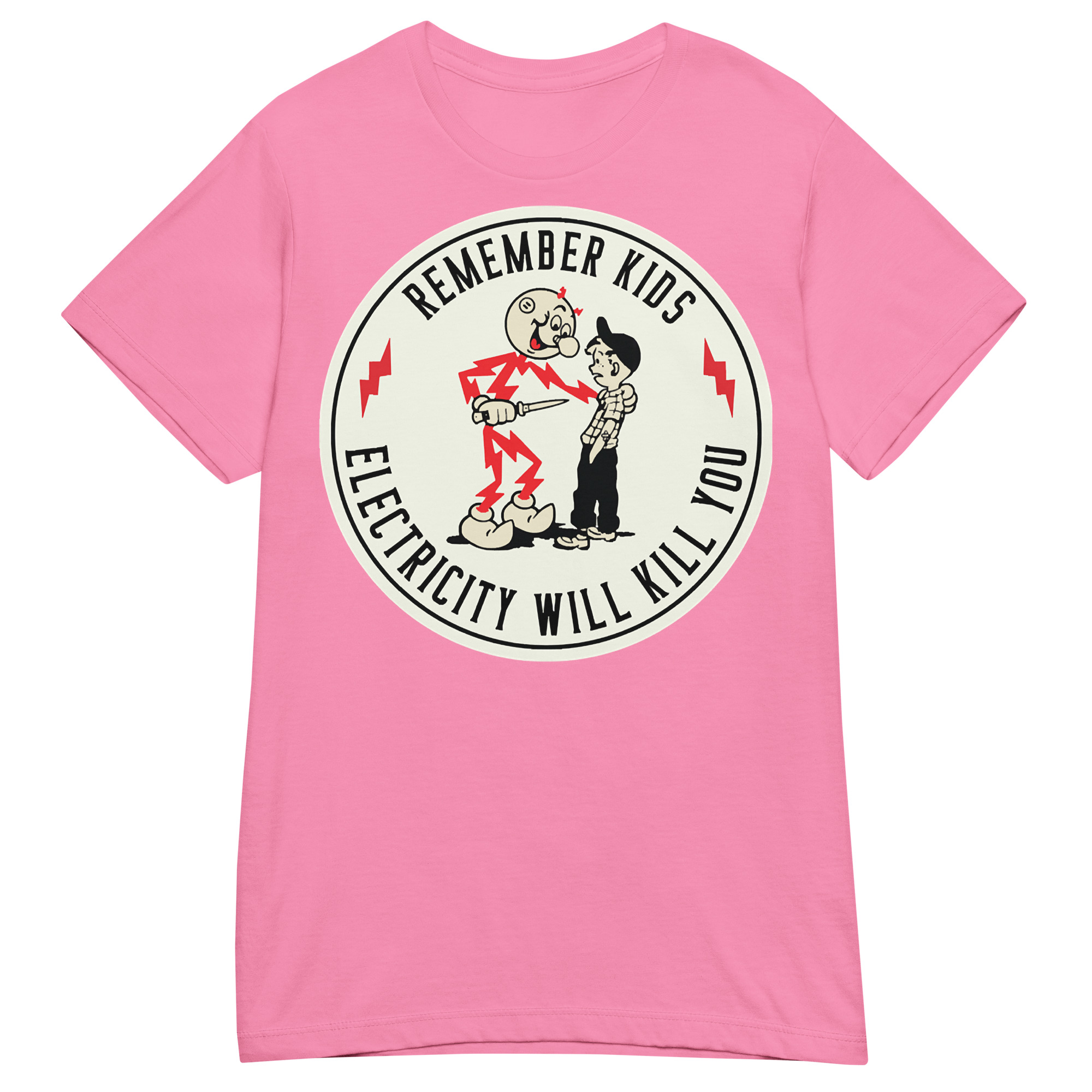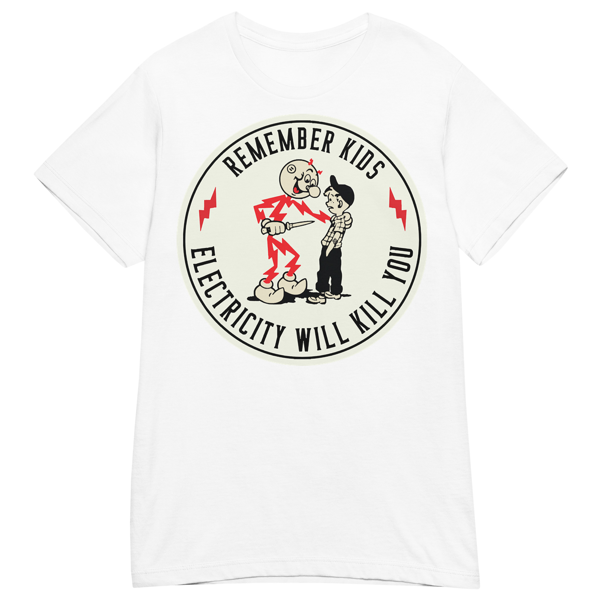Semi-fitted t-shirt med ett stort retroinspirerat tryck med texten ’Remember kids, electricity will kill you’ på framsidan. Skön t-shirt som passar kvinnor och finns i hela elva olika färger.