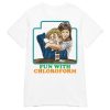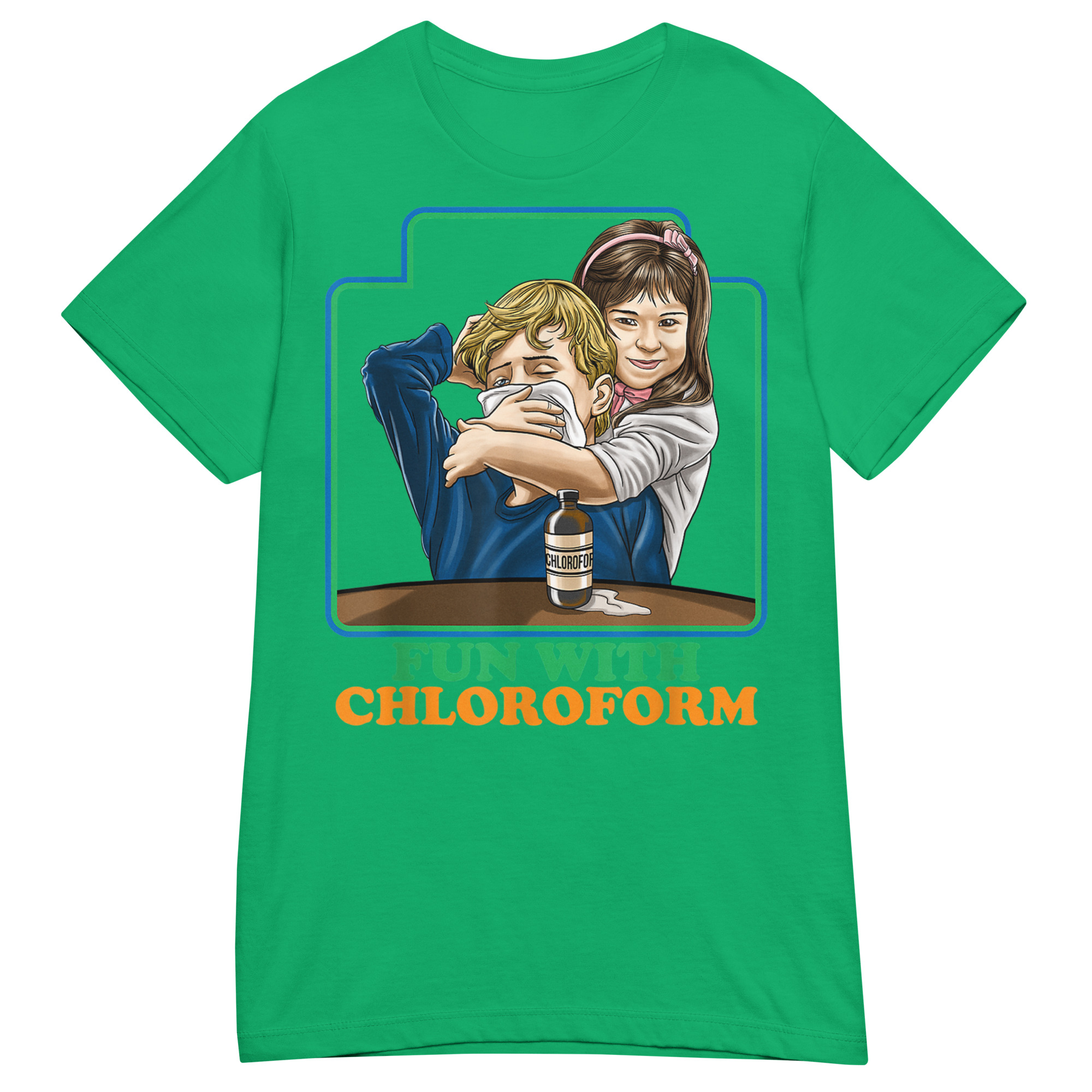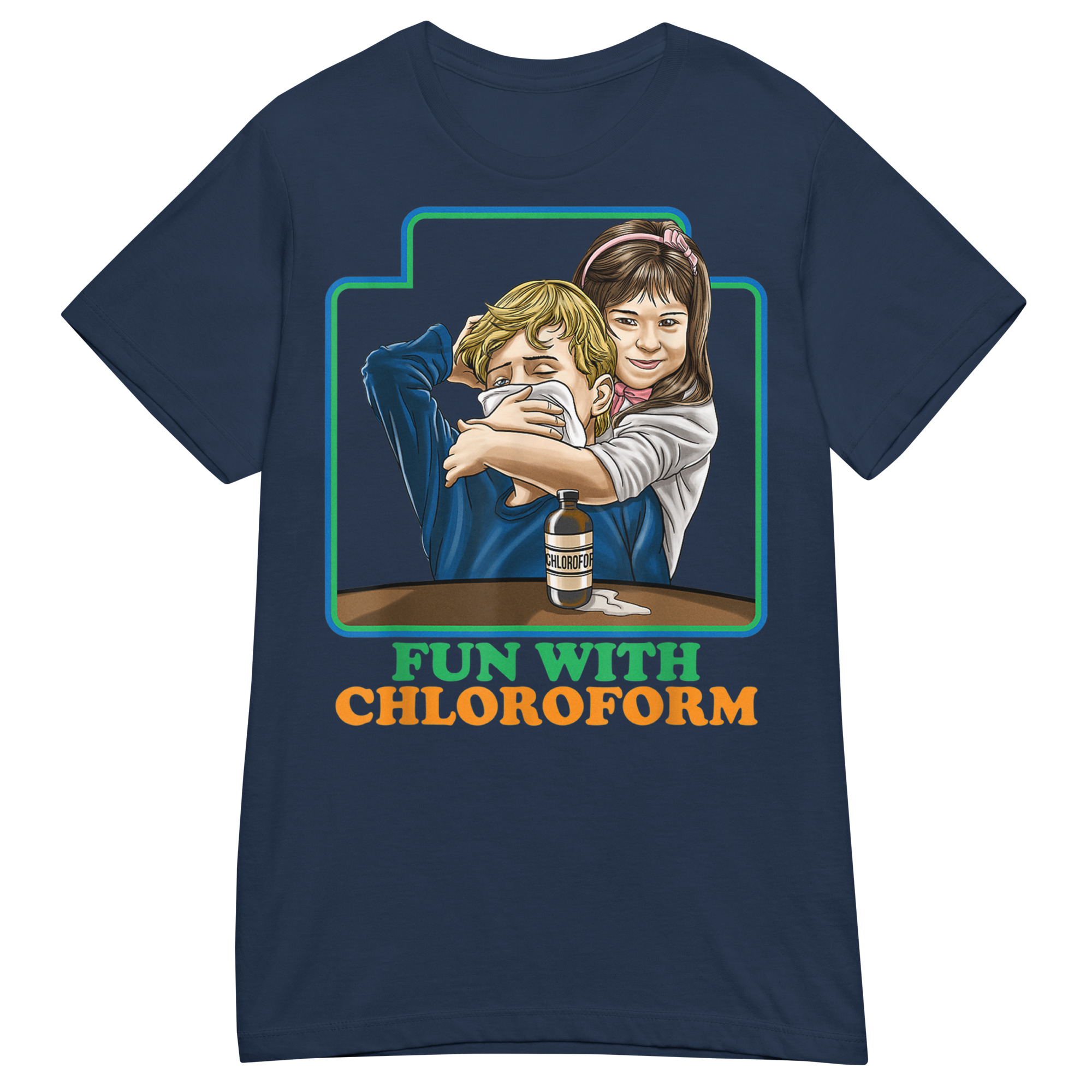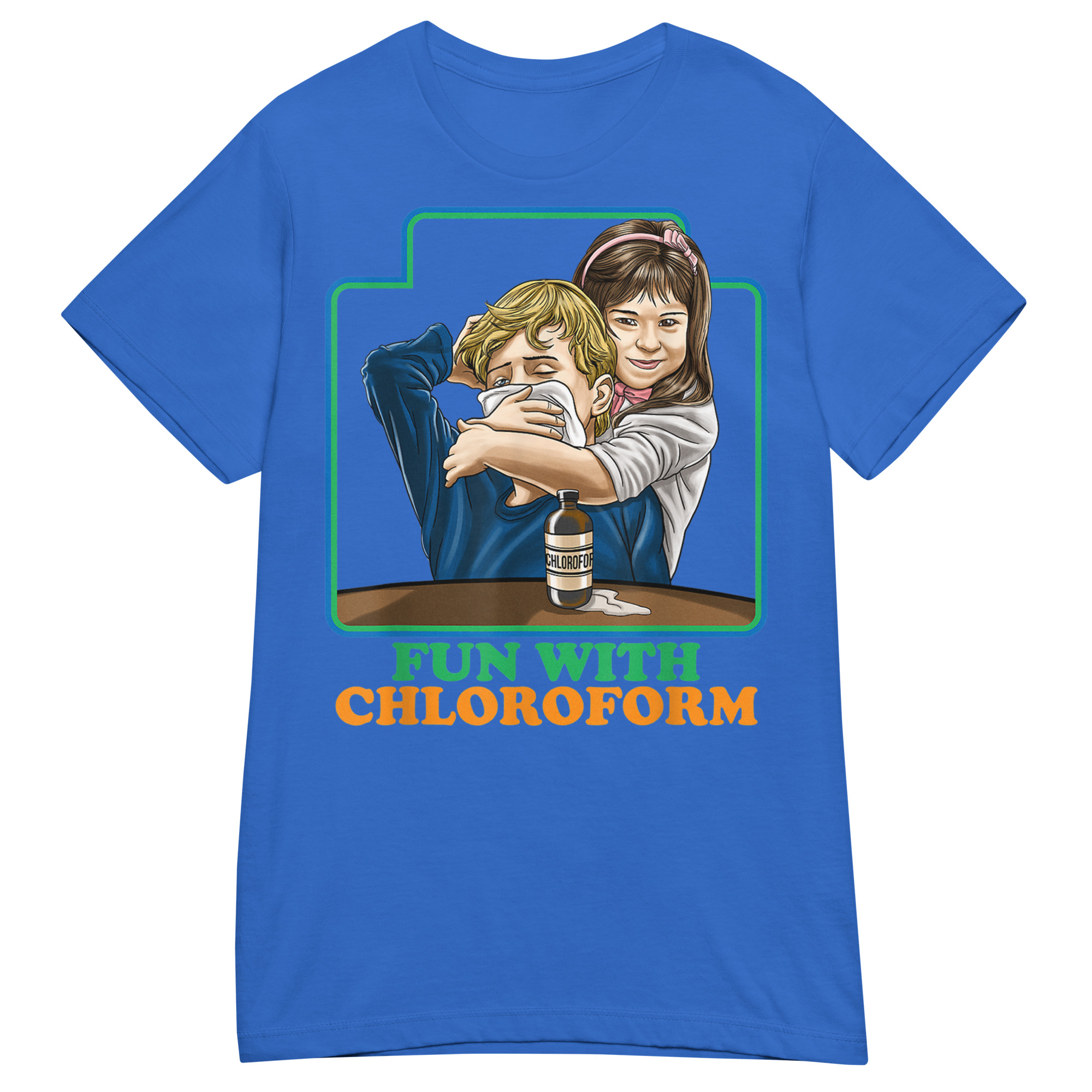 Annorlunda semi-fitted t-shirt med ett stort retroinspirerat tryck med två barn som leker med kloroform och texten ’Fun with chloroform’. Finns i elva snygga färger och passar perfekt till kvinnor som älskar humoristiska tryck.