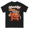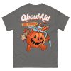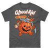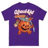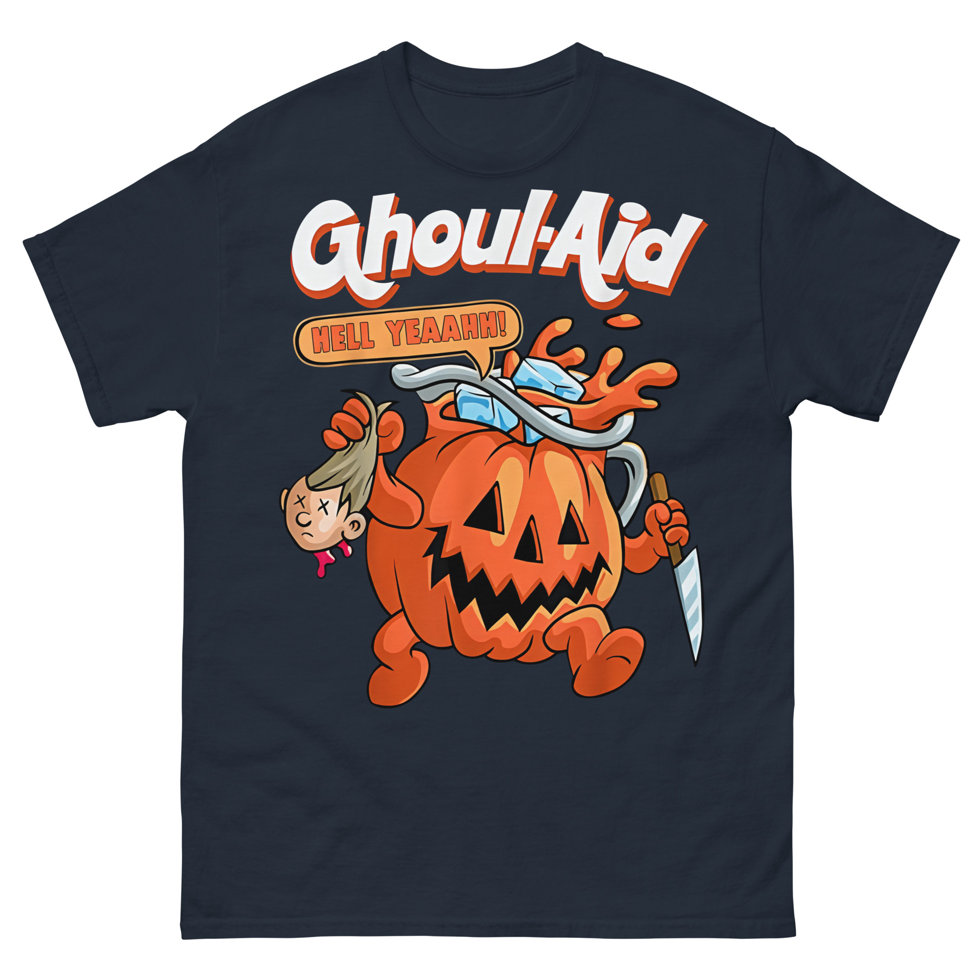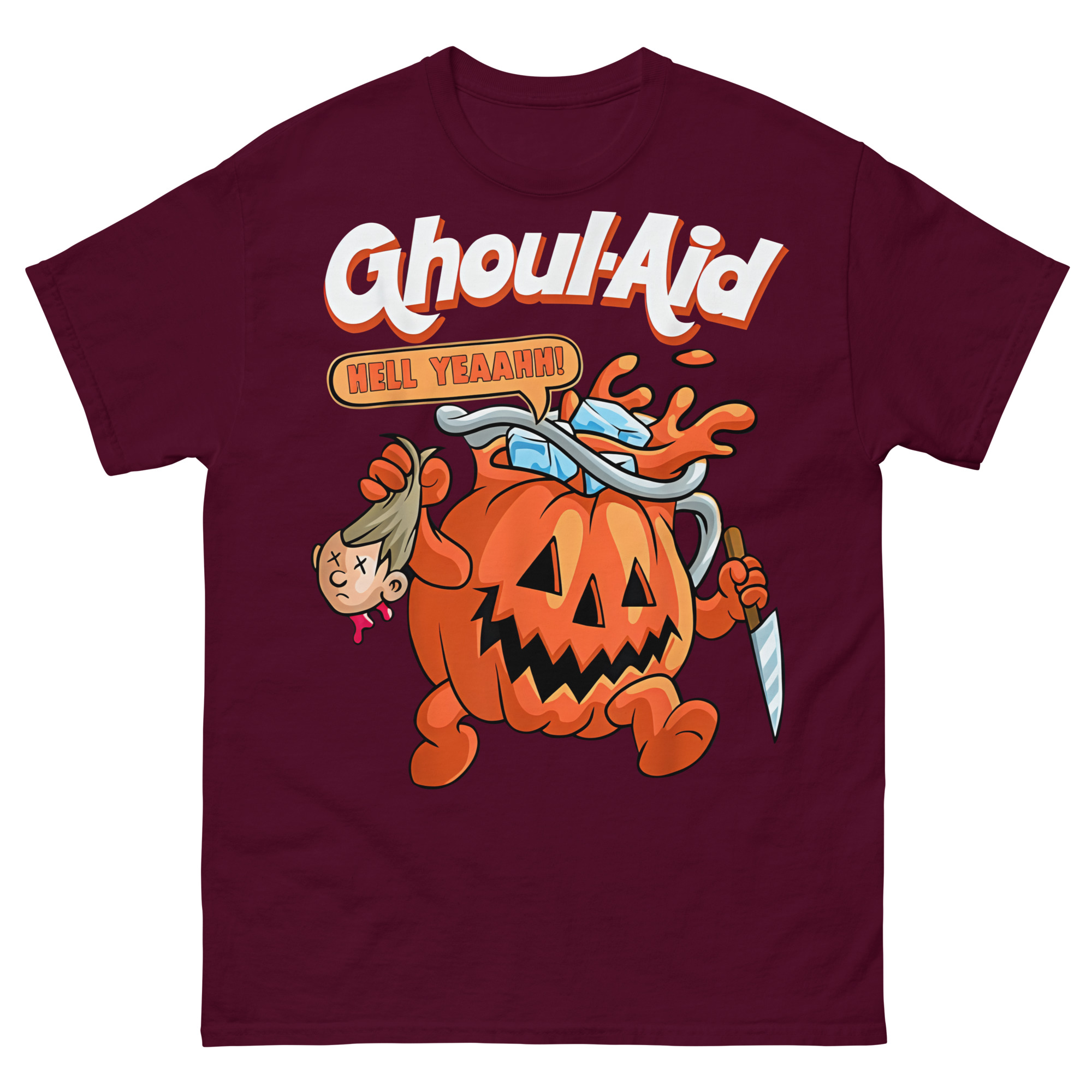 T-shirt dekorerad med en stor pumpa som håller i ett avhugget huvud och texten ’Ghoul-Aid’ som dekoration på framsidan. Passar alla män och kvinnor som älskar halloween. Du kan välja mellan sex olika färger.