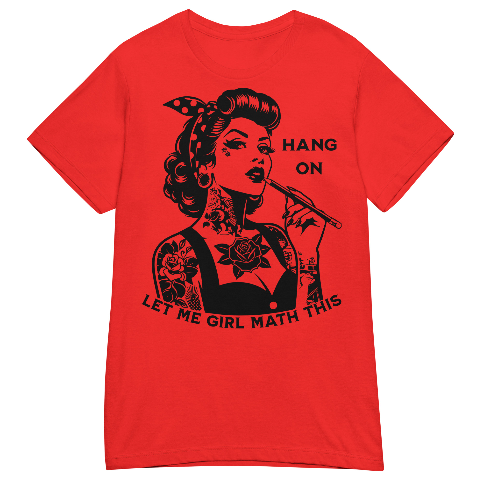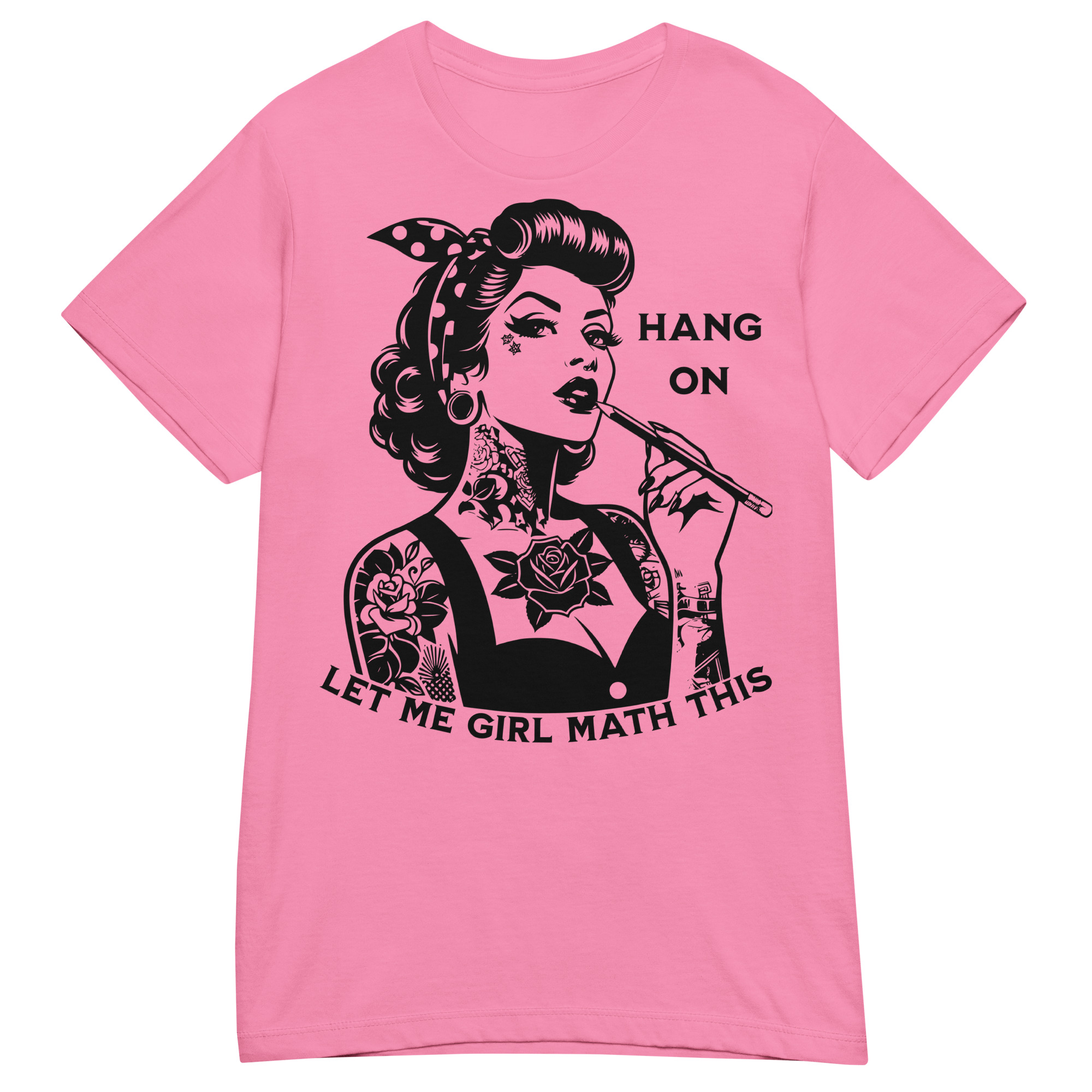 T-shirt dekorerad med en tatuerad kvinna med attityd och texten ’Hang on, let me girl math this’ som dekoration på framsidan. Passar alla kvinnor som älskar attityd. Du kan välja mellan åtta olika färger.