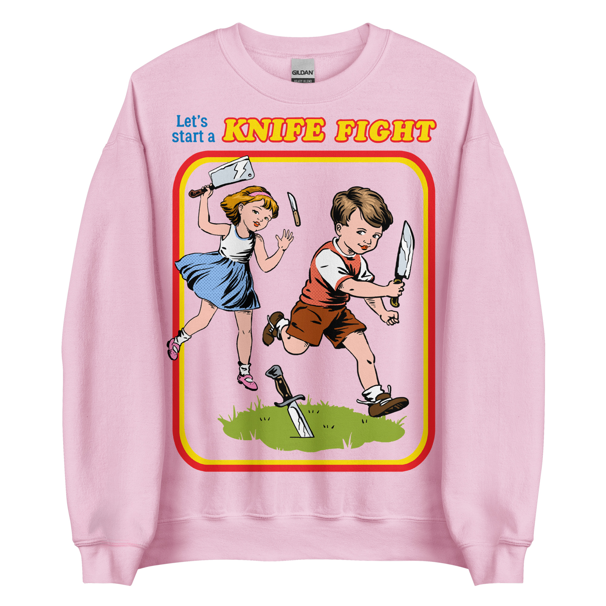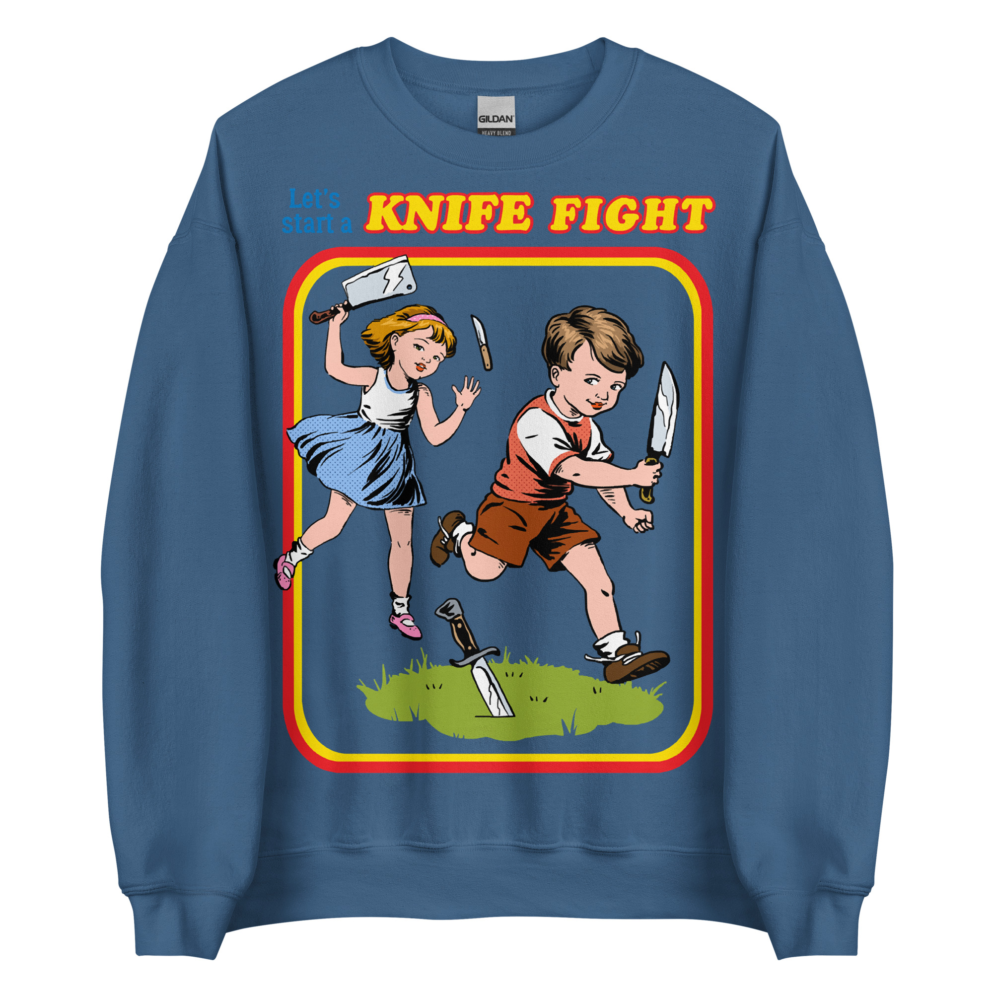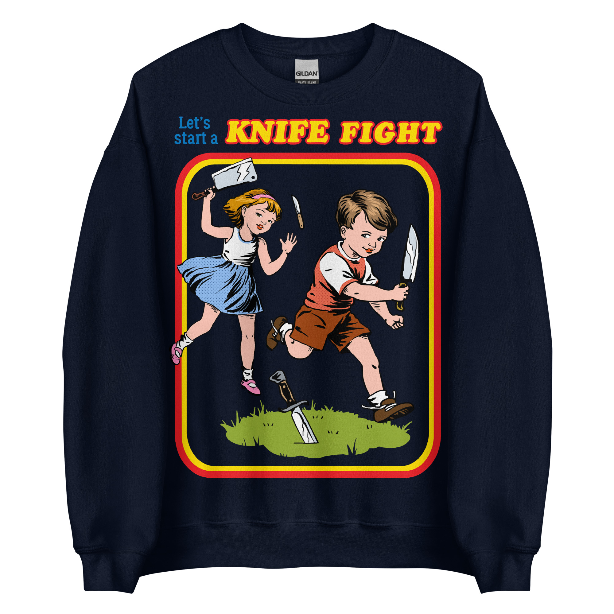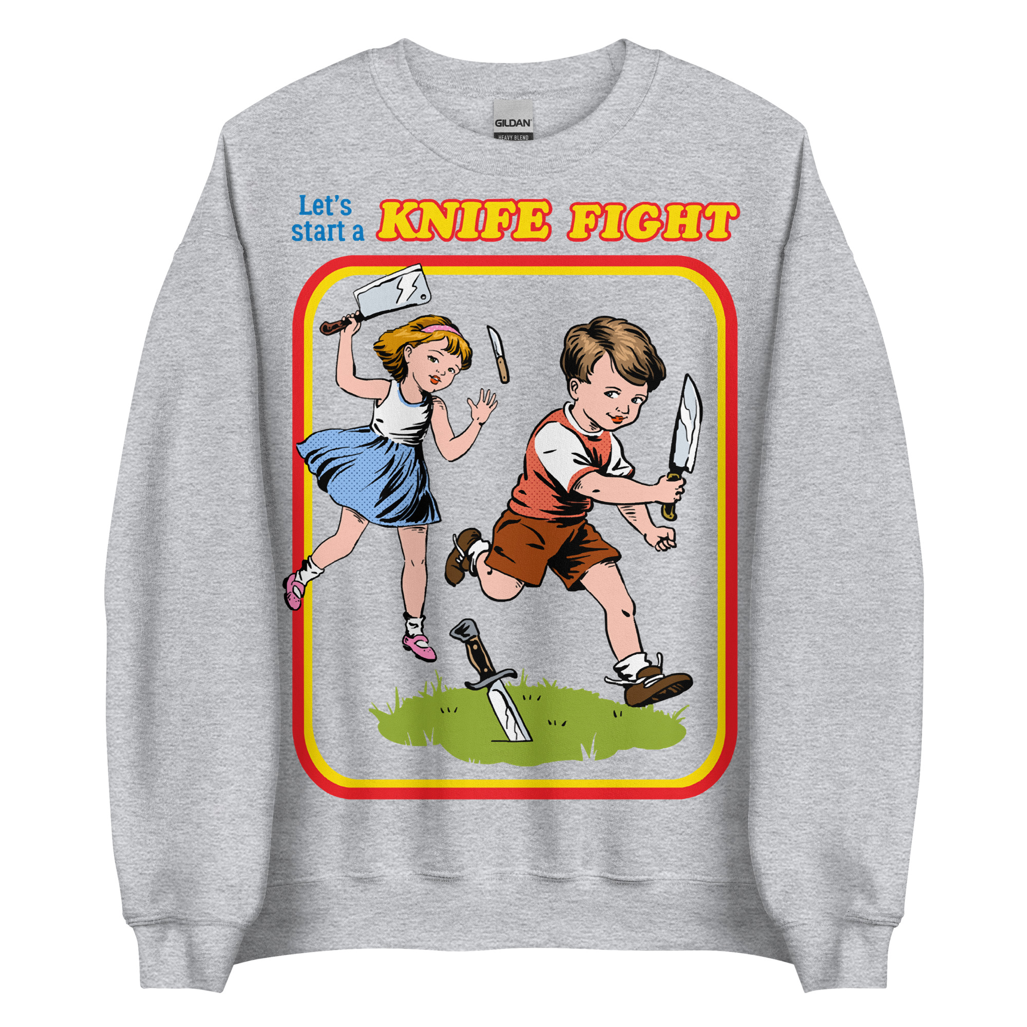 Sweatshirt dekorerad med ett retroinspirerat tryck med texten ’Let’s start a knife fight’ på framsidan. Passar perfekt till både kvinnor och män. Tillverkad i blandad bomull och polyester i en fin kvalitet. Välj mellan tio olika färger.