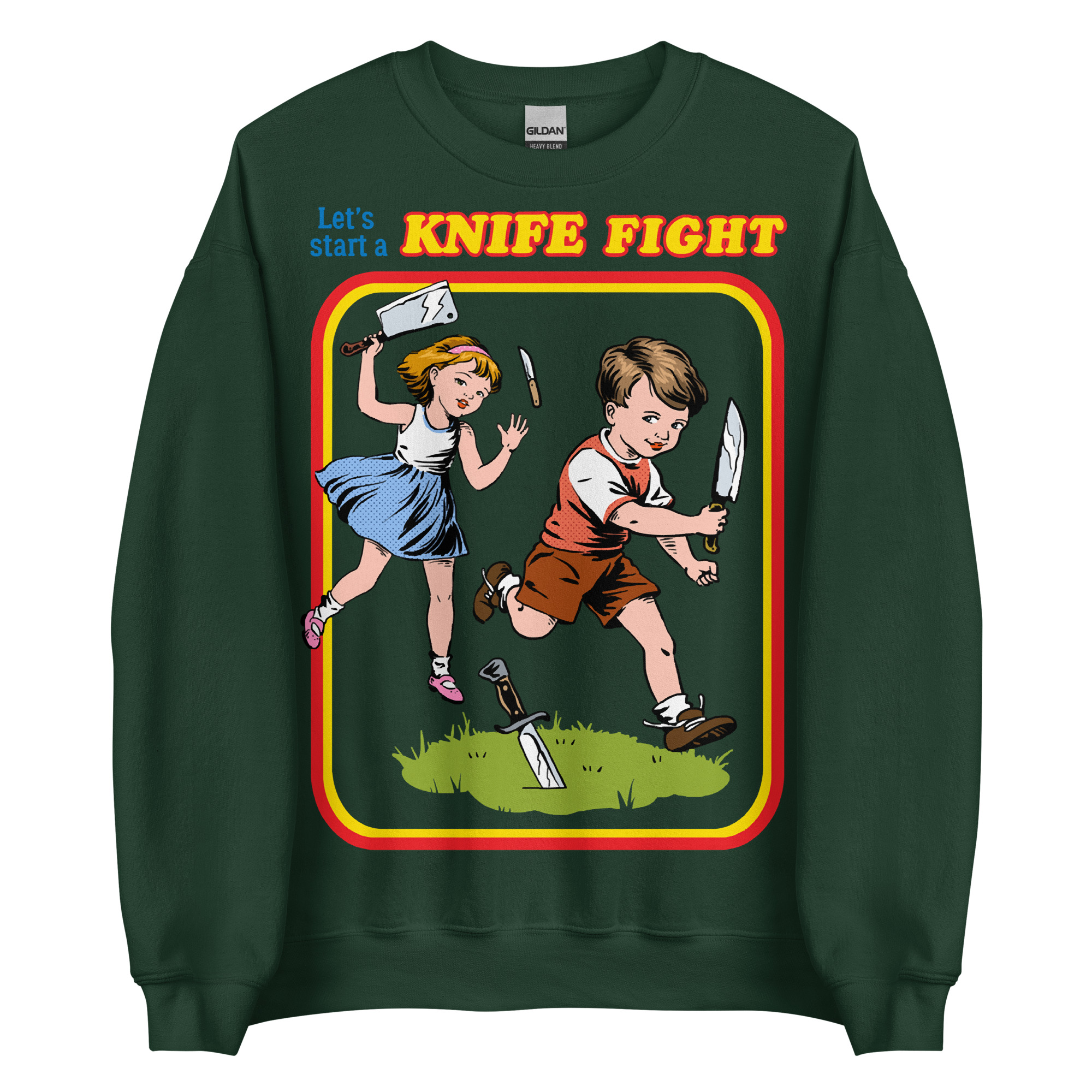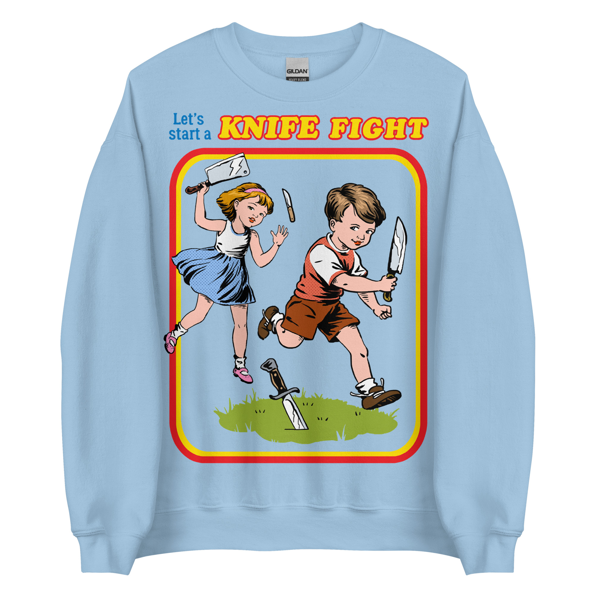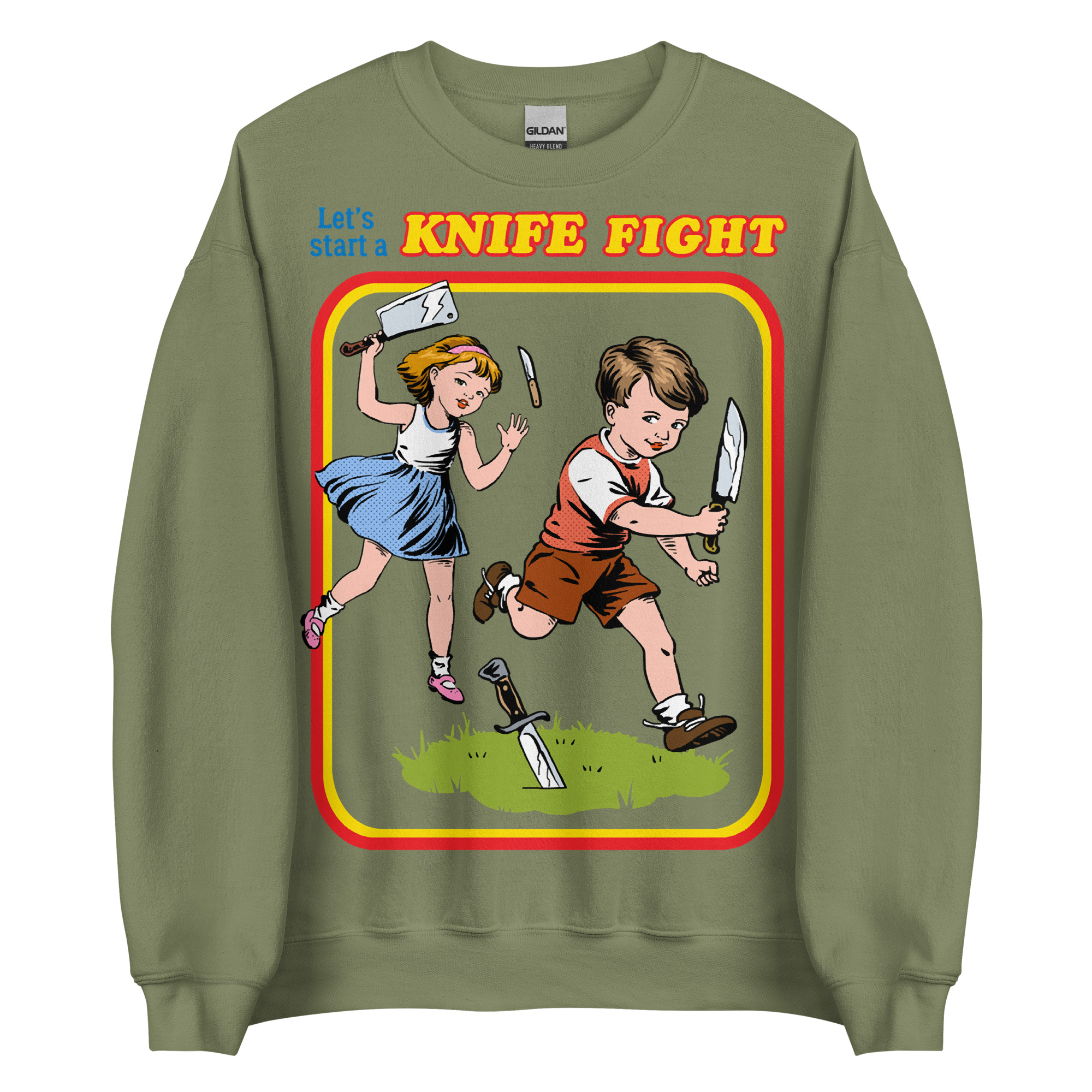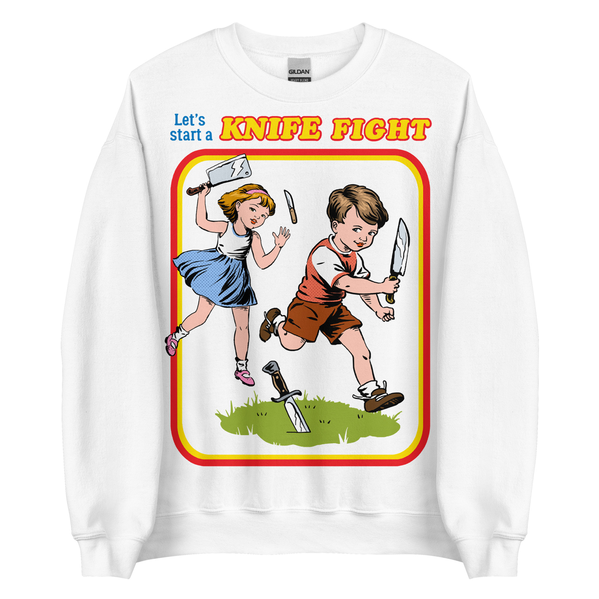 Sweatshirt dekorerad med ett retroinspirerat tryck med texten ’Let’s start a knife fight’ på framsidan. Passar perfekt till både kvinnor och män. Tillverkad i blandad bomull och polyester i en fin kvalitet. Välj mellan tio olika färger.