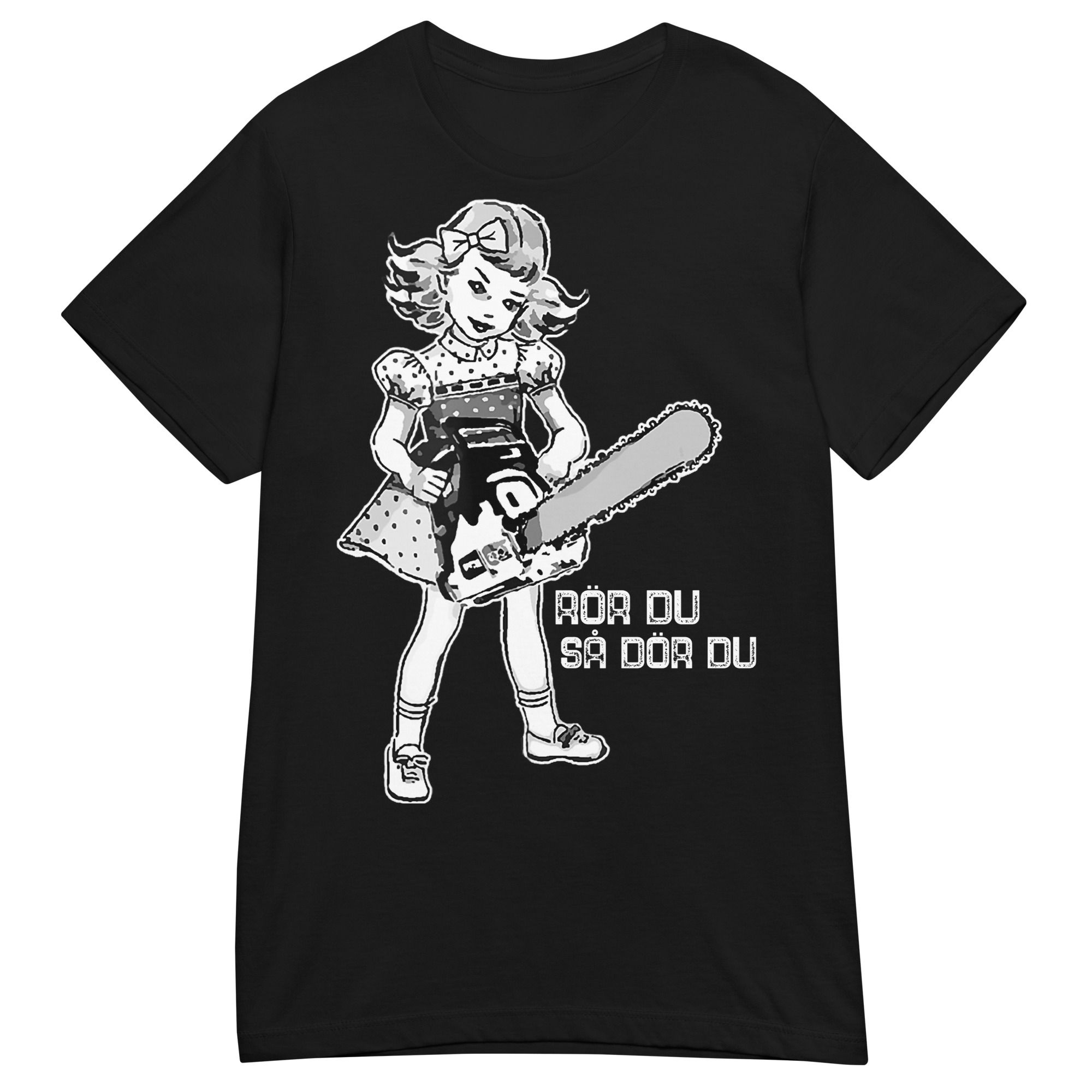 Snygg semi-fitted t-shirt med en flicka med en motorsåg och texten ’Rör du så dör du’ som tryck på framsidan. Tröjan passar perfekt till kvinnor – välj mellan fyra olika färger.