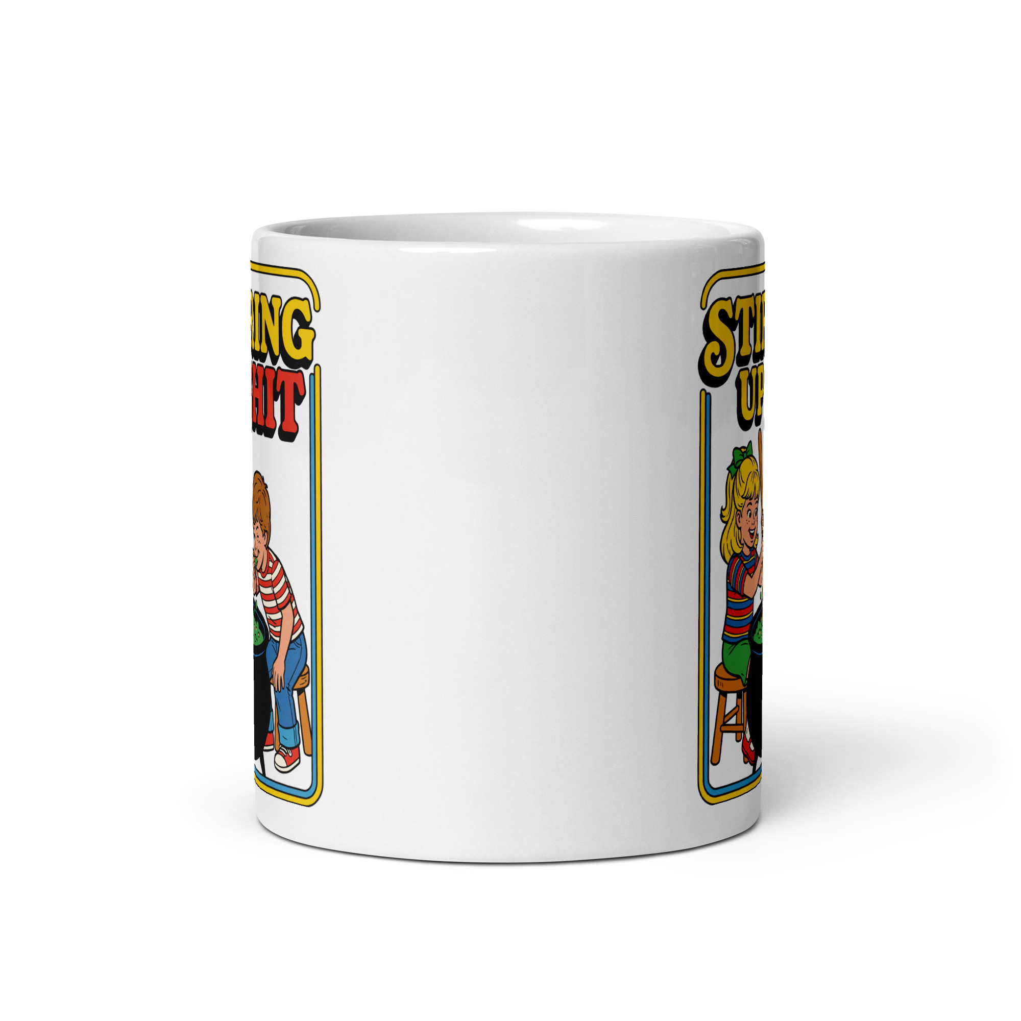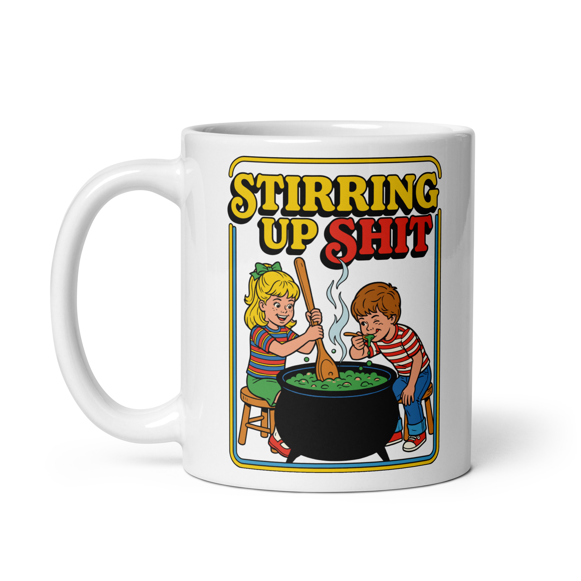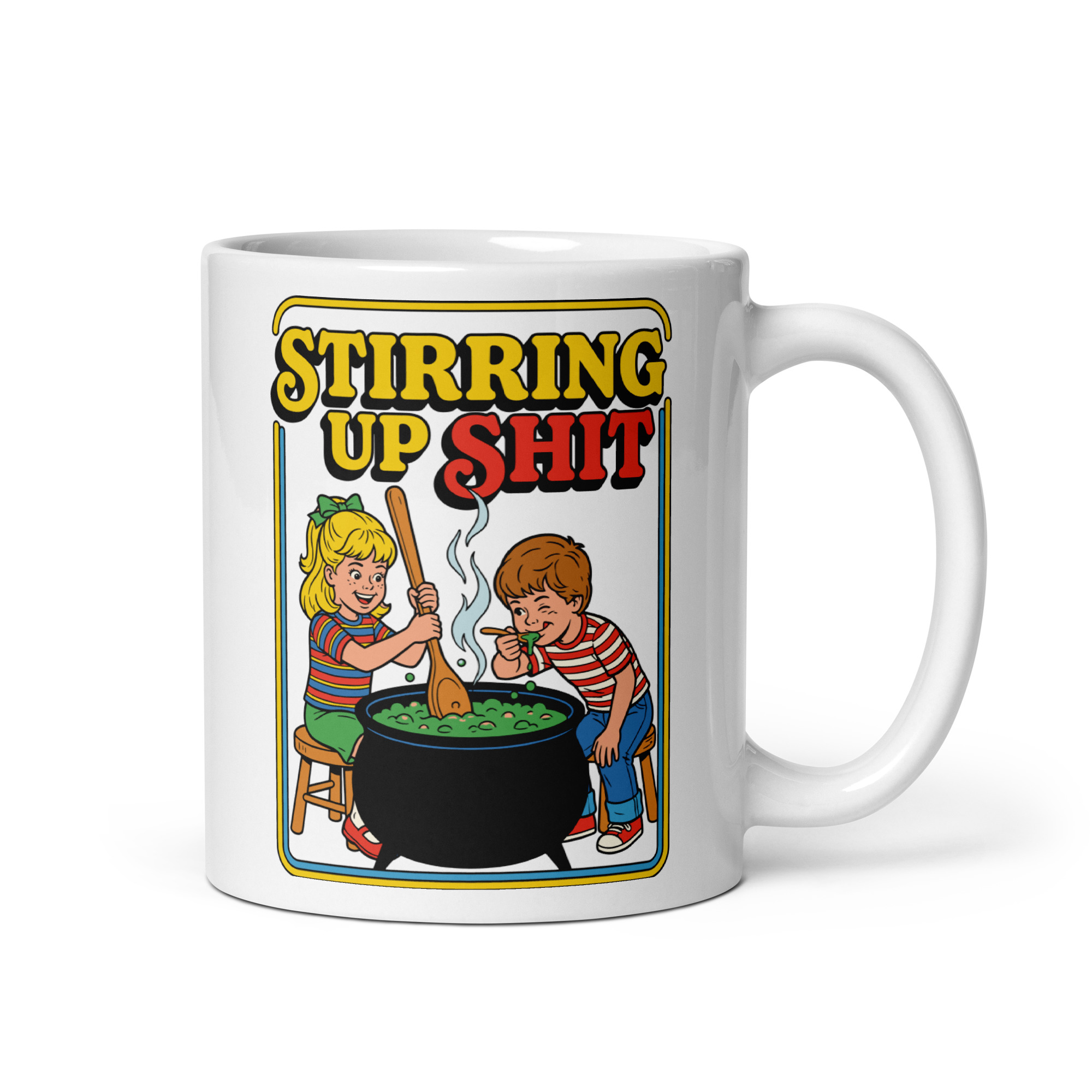 Vit mugg med ett retroinspirerat tryck med två barn som kokar ihop något i sin kittel och texten ’Stirring up shit’ som dekoration på båda sidorna. Passar perfekt till dig som älskar mörk humor.