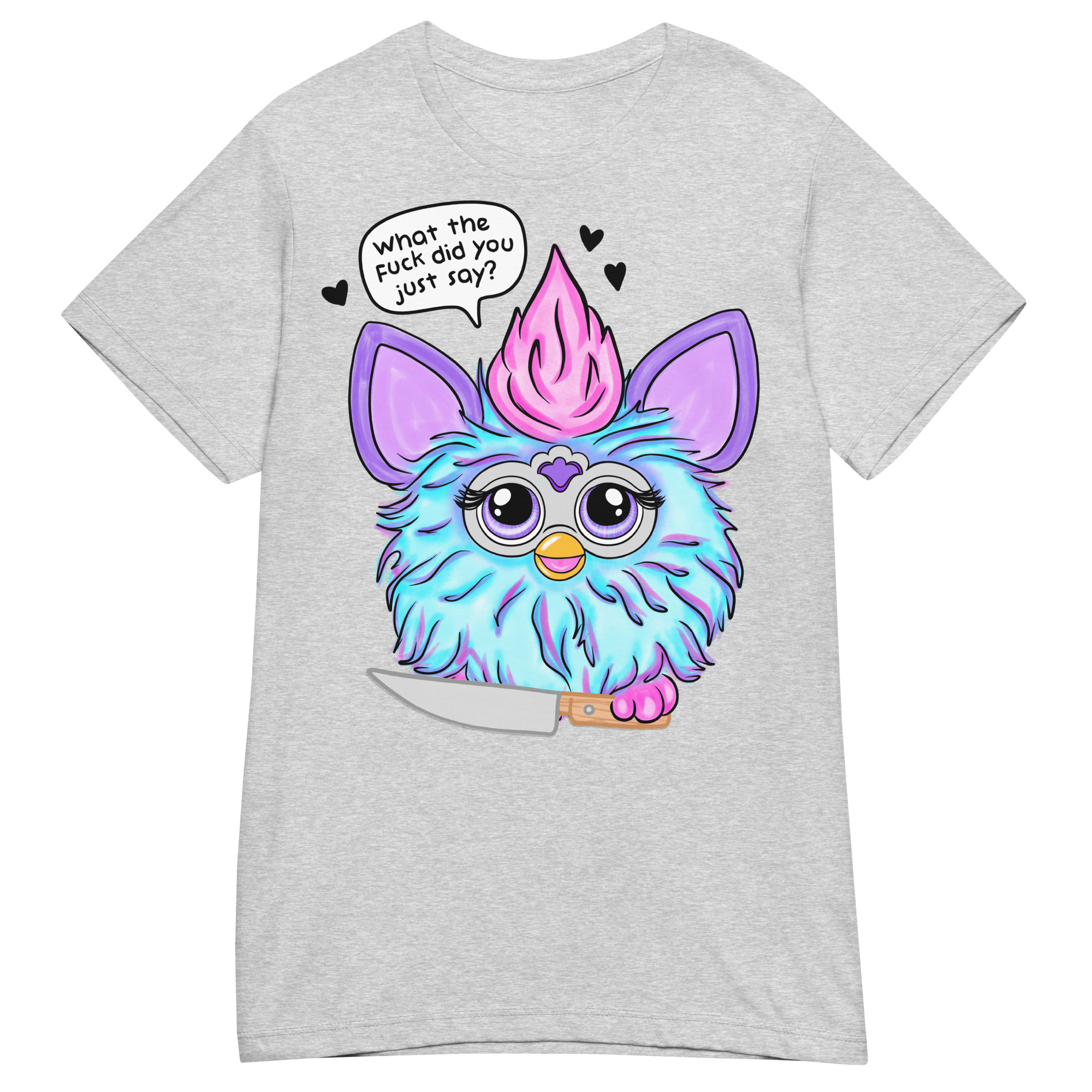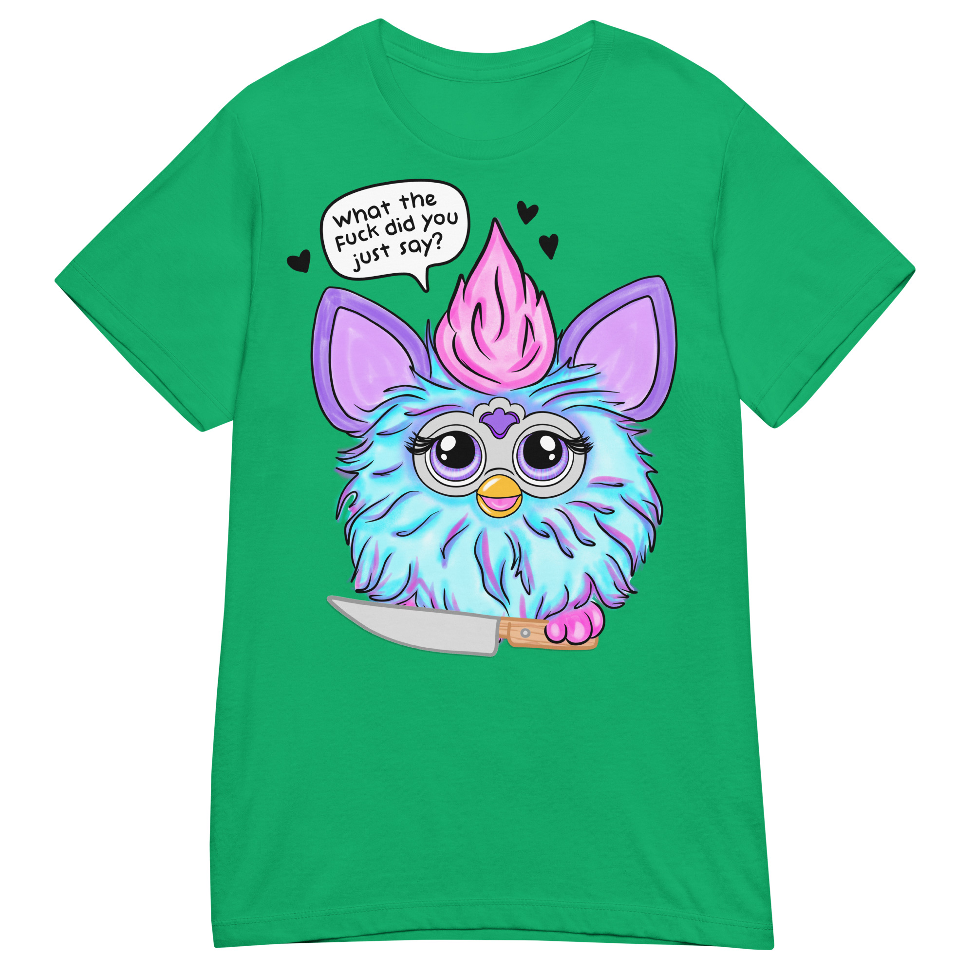 Snygg semi-fitted t-shirt med en söt och färgglad Furby med en kniv och texten ’What the fuck did you just say?’ som tryck på framsidan. Passar alla kvinnor som älskar söta Furbys och attityd. Du kan välja mellan hela nio olika färger.