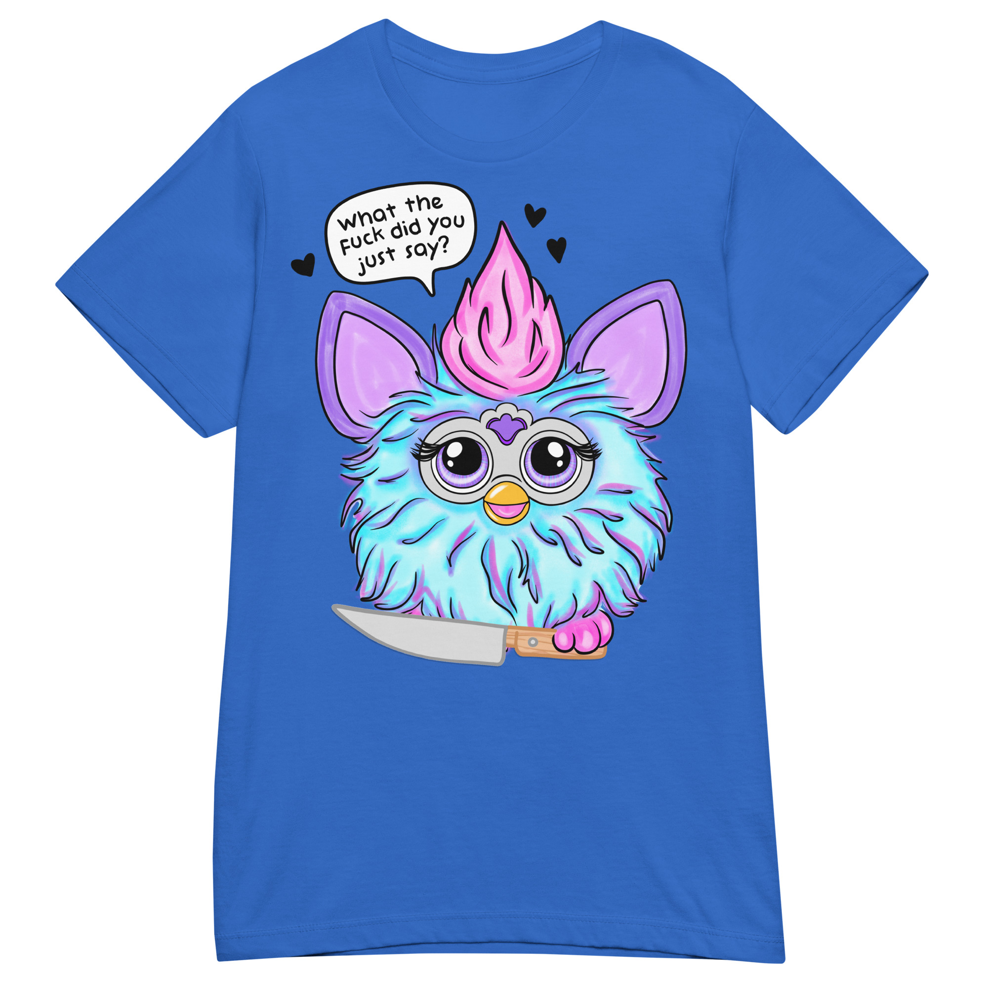 Semi-fitted t-shirt dekorerad med en färgglad Furby med en kniv och texten ’What the fuck did you just say?’ på framsidan. Passar perfekt till kvinnor som älskar attityd. Välj mellan nio olika färger.