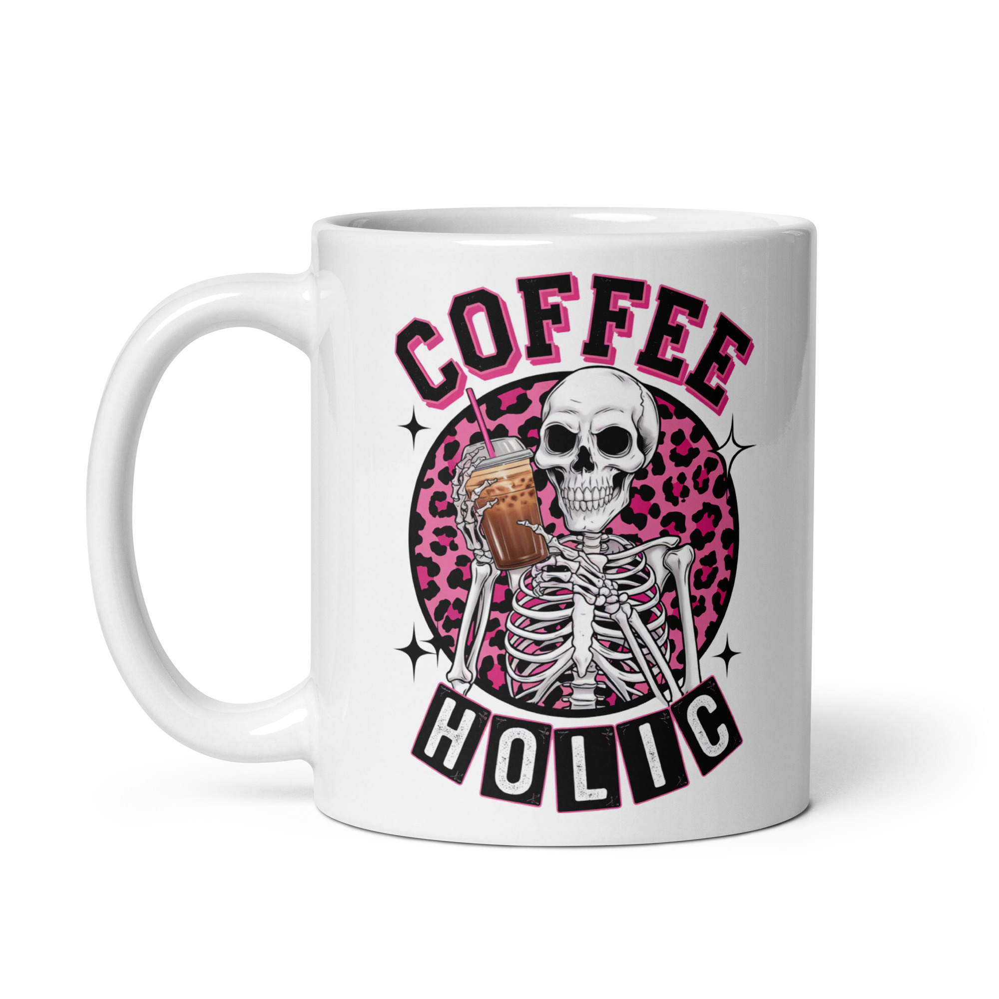 Mugg dekorerad med ett skelett som dricker kaffe och texten ’Coffeeholic’ som tryck på båda sidorna. Muggen passar alla oss som inte överlever utan kaffe.