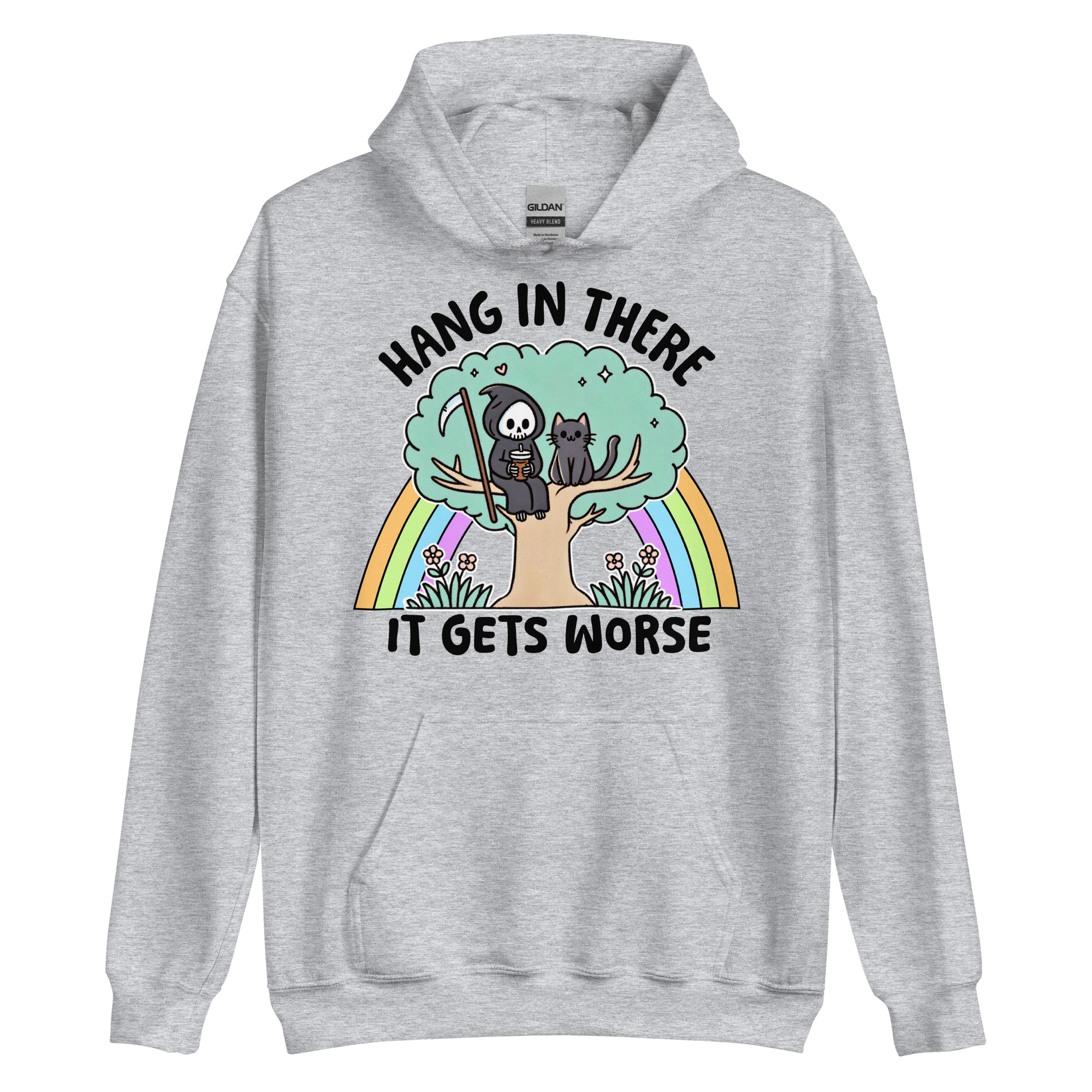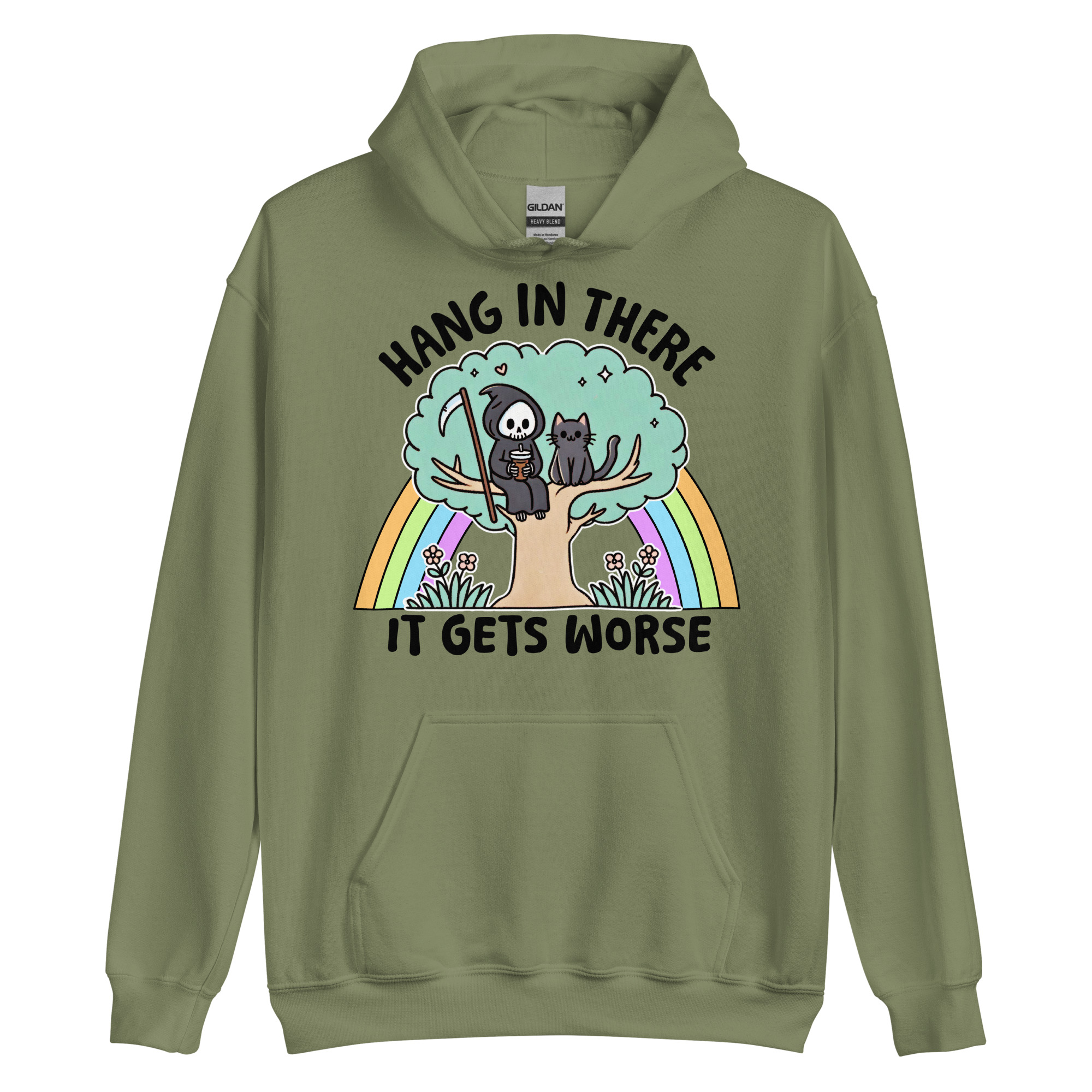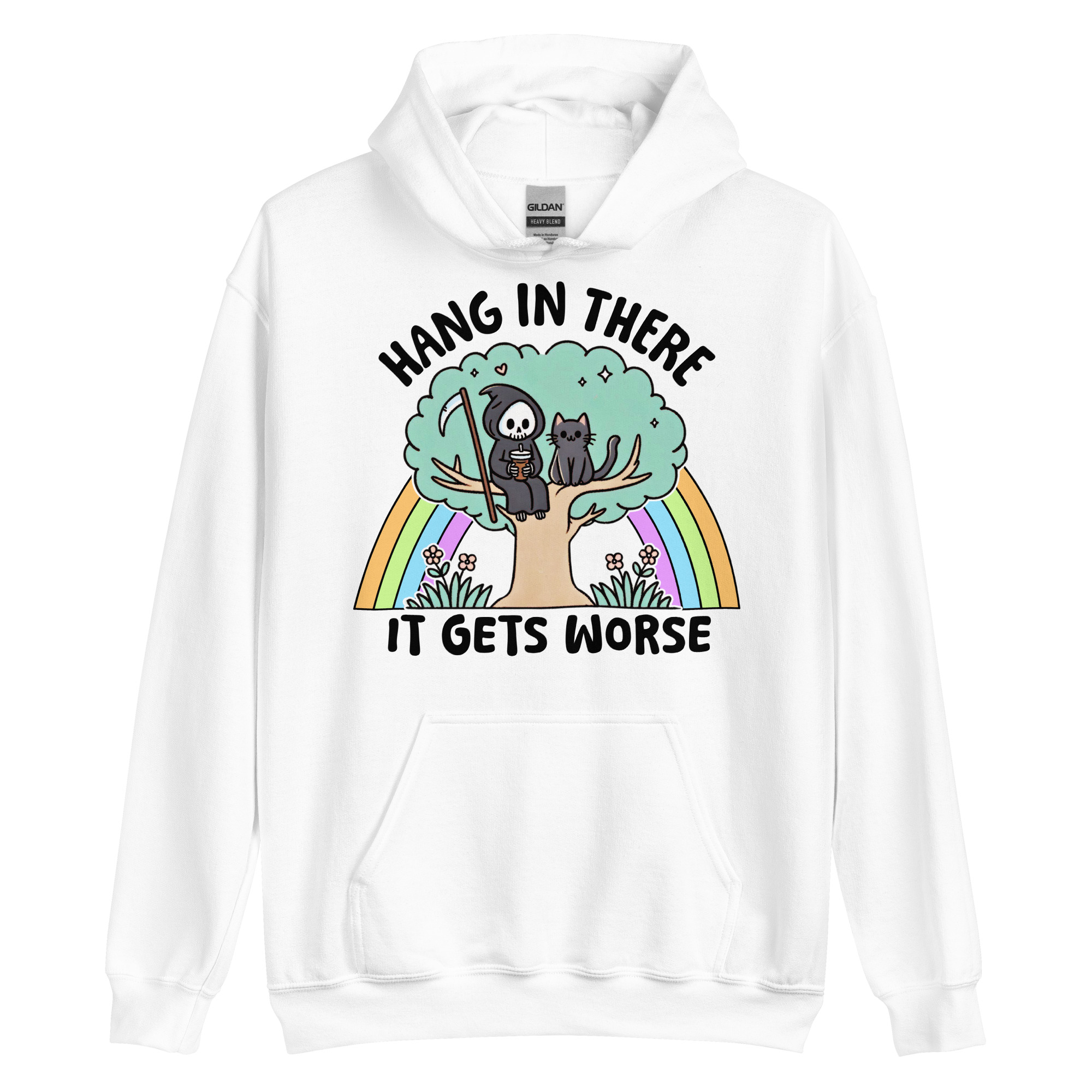 Skön hoodie med en lieman med sin katt och texten ’Hang in there, it gets worse’ som tryck på framsidan. Tröjan passar alla oss som älskar mörk humor. Unisex-modell som finns i 15 olika färger.