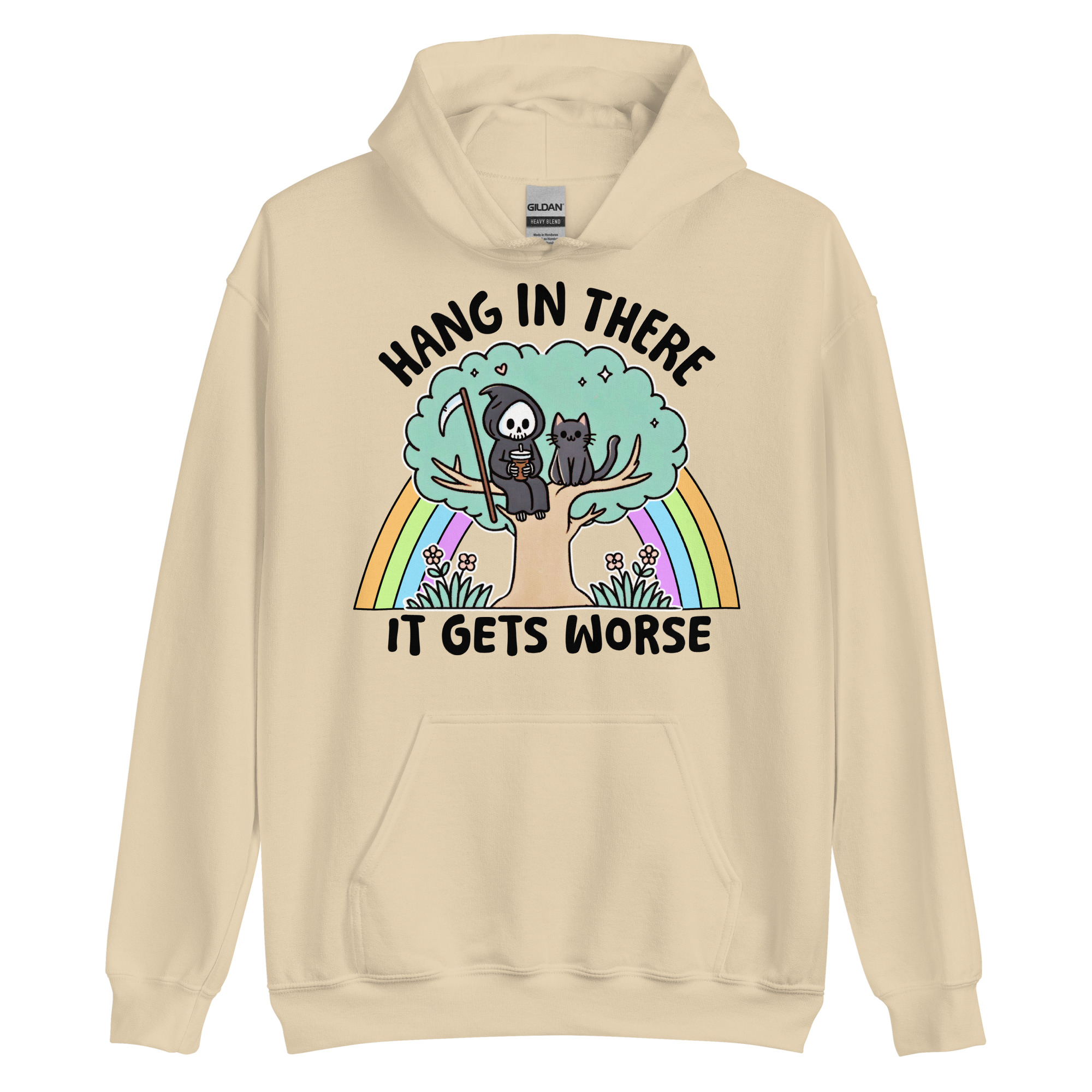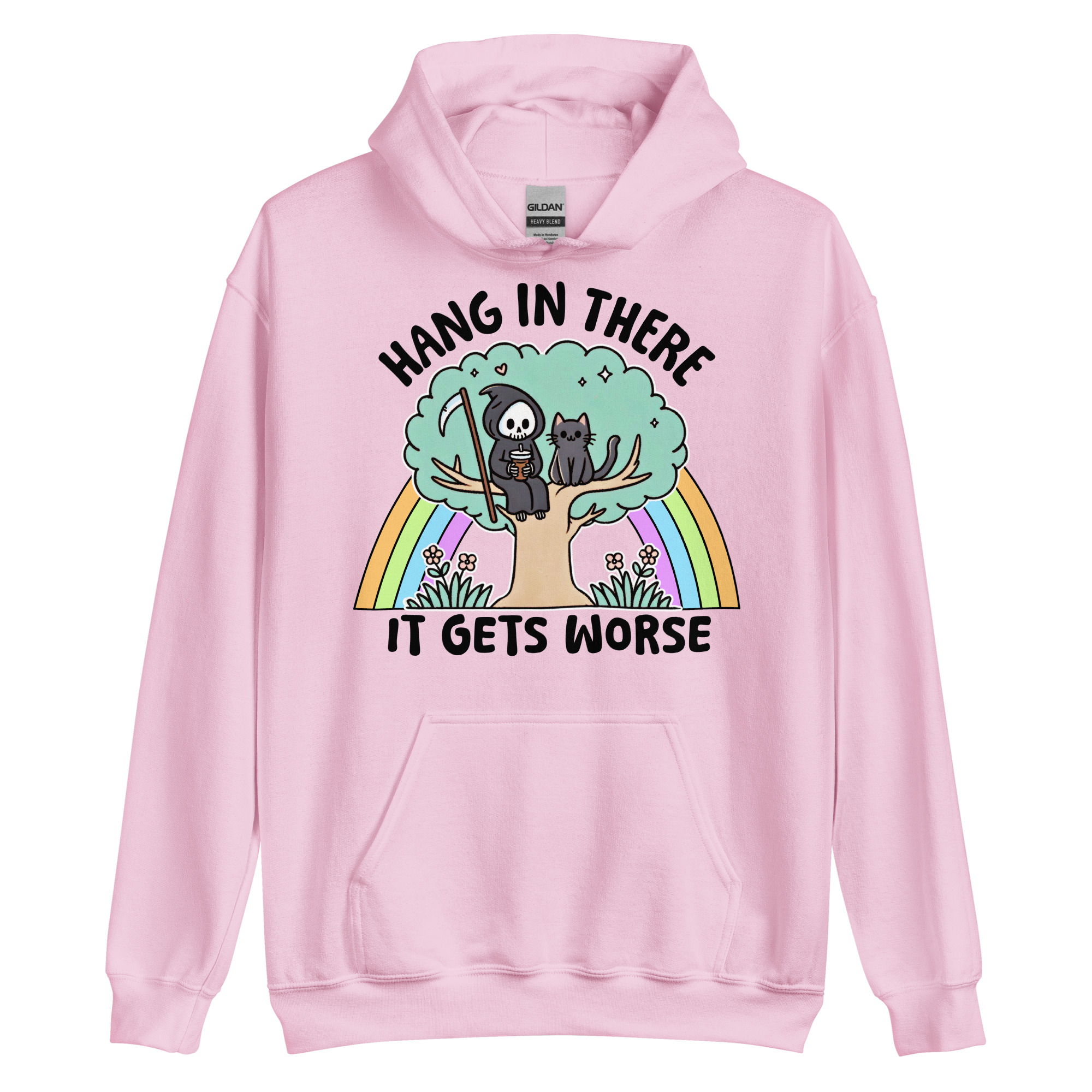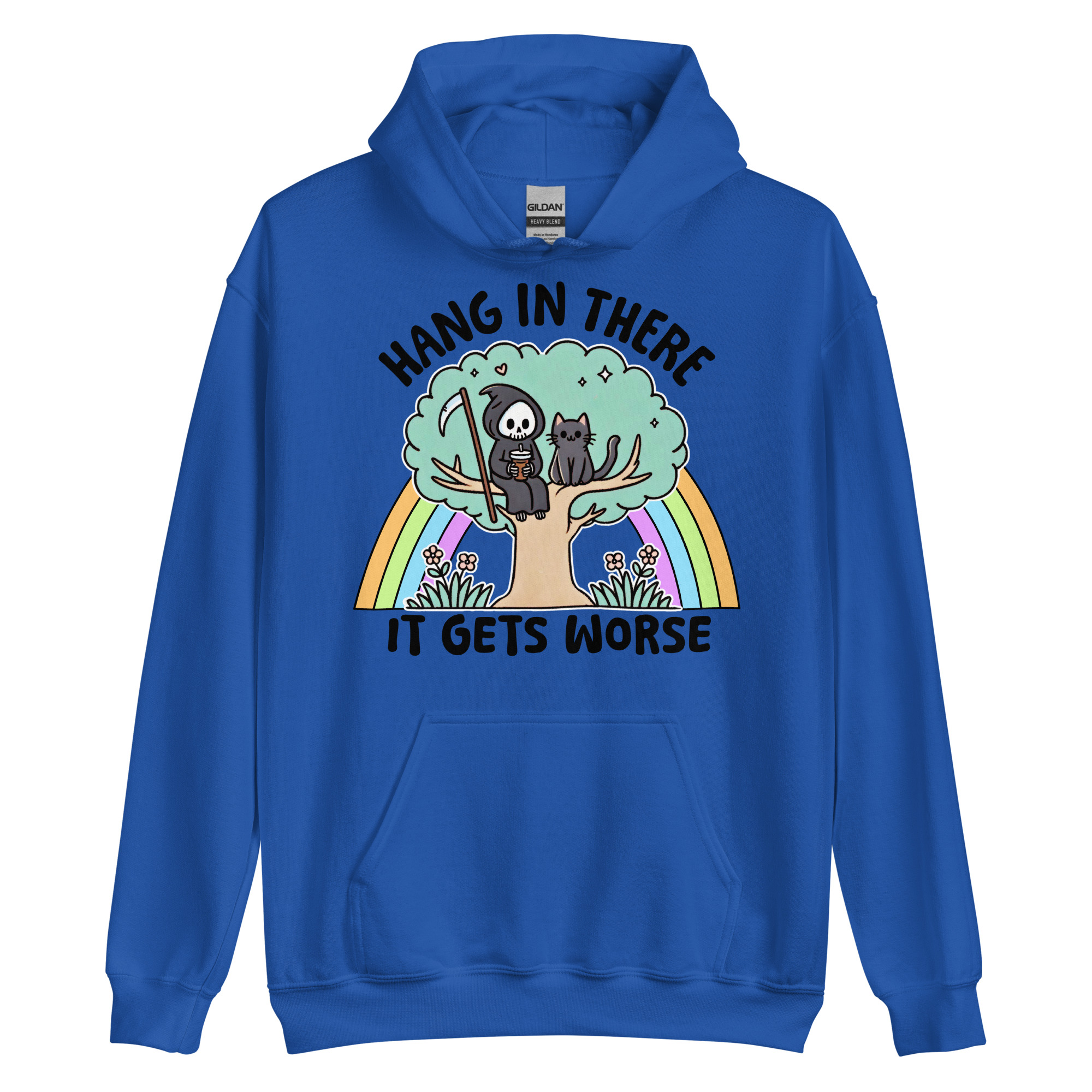 Skön hoodie med en lieman med sin katt och texten ’Hang in there, it gets worse’ som tryck på framsidan. Tröjan passar alla oss som älskar mörk humor. Unisex-modell som finns i 15 olika färger.